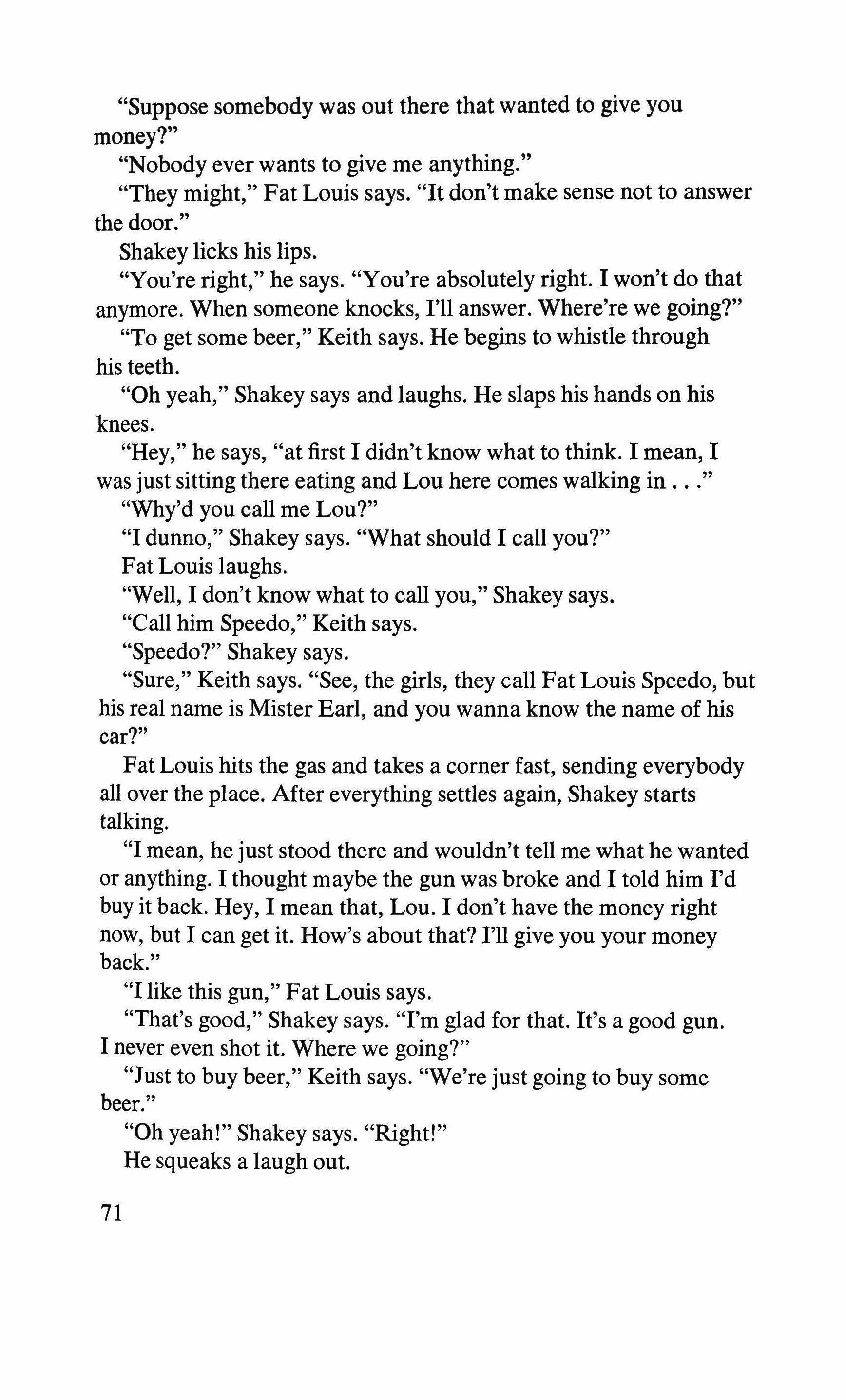 "What's the matter, mud pie? Were you having a bad dream?" said Craze real soft and slow through his hard breathing, like he was trying to calm him down and himself too. The guy wasn't looking at Craze; instead he was gazing straight up in a daze, catching his breath. Then his face beaded up all of a sudden, and his eyes turned red, wide open, and jerking around wild and fearful. Then he started to beg, and Craze just kept looking at him with his funny, conceited grin, like he was amazed and still enjoying it.