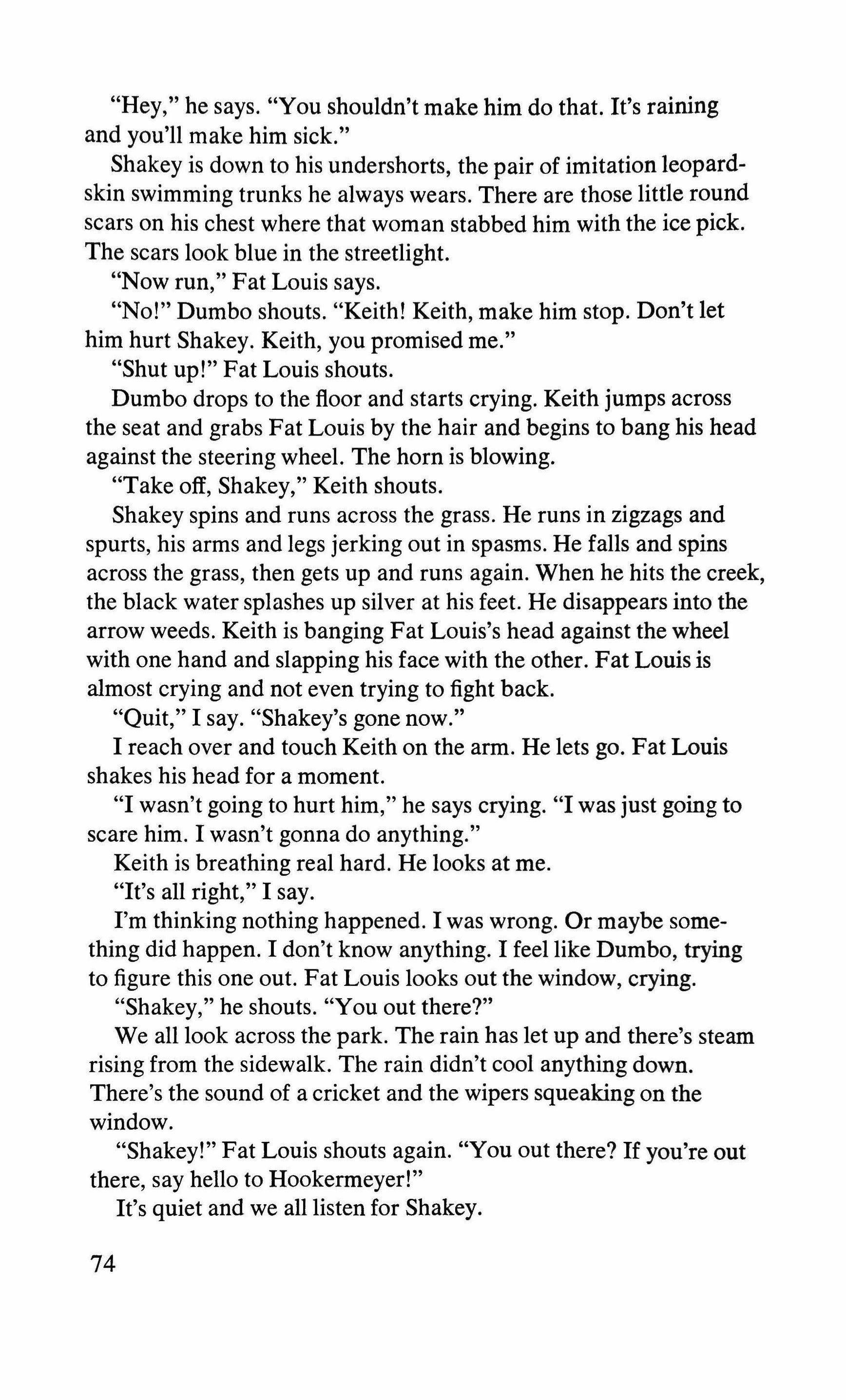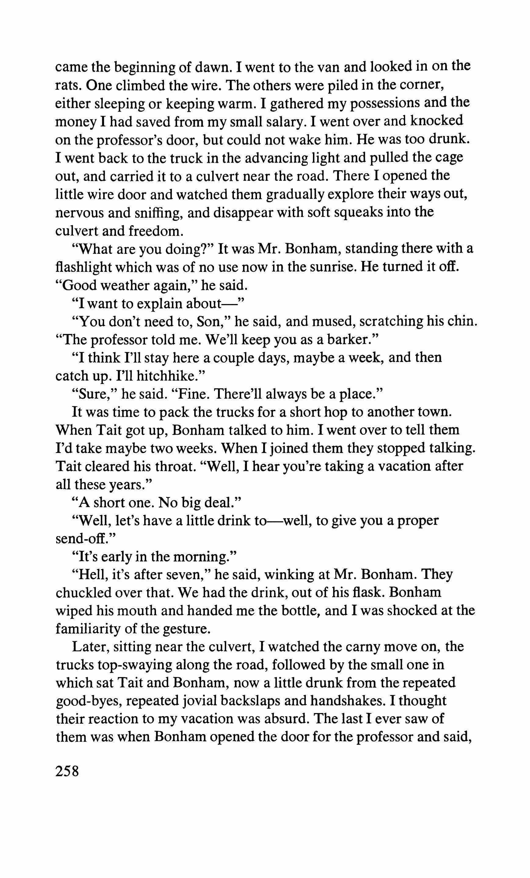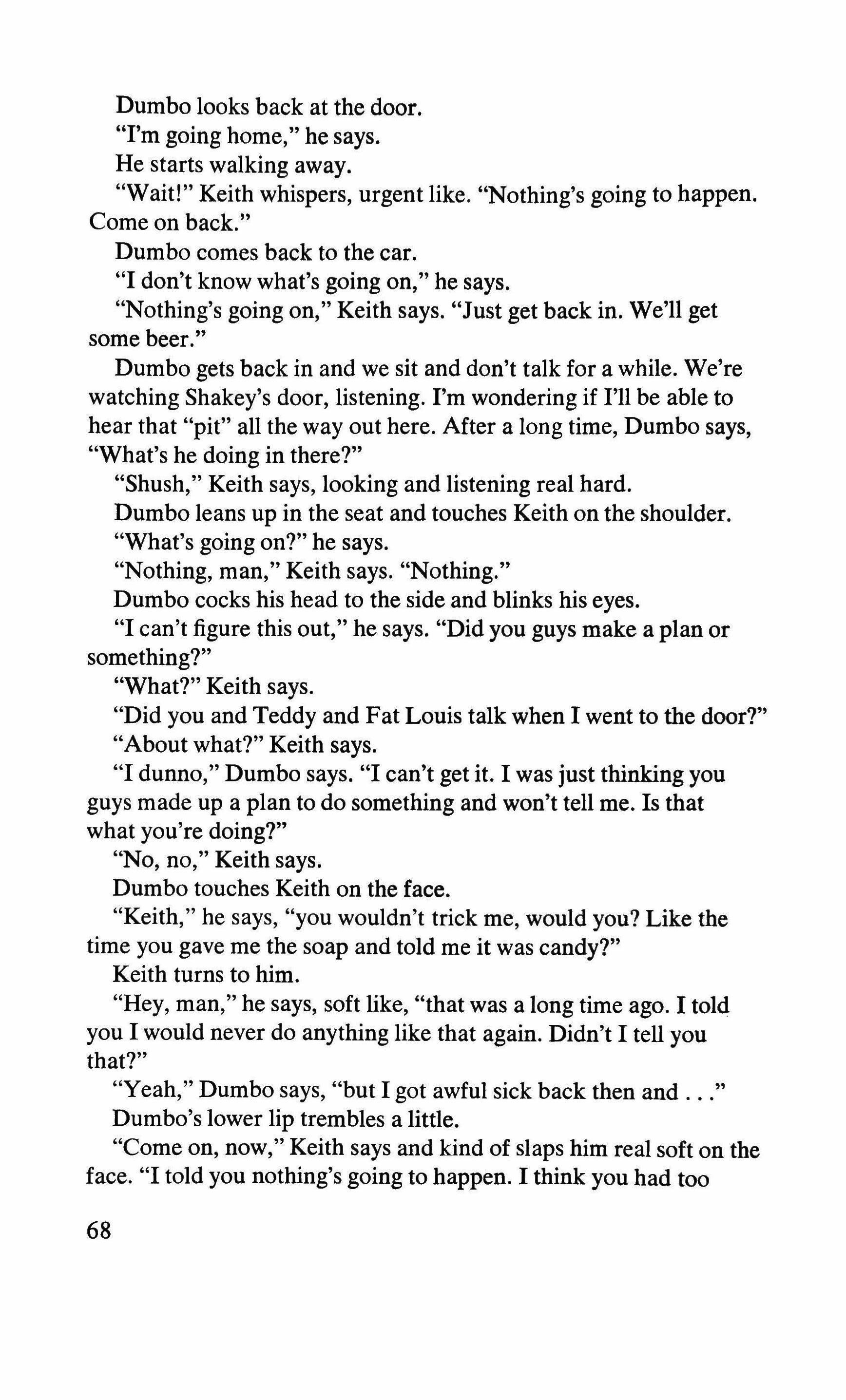 He almost looked like Charlie too, except for his curly blond hair. It was almost white, real blond, and his skin was real white too. The kind of white skin that some people have that scales off, only his doesn't. But he was short, around five feet, and wiry thin, and when he talked his voice was sharp and a little high pitched like Charlie's.