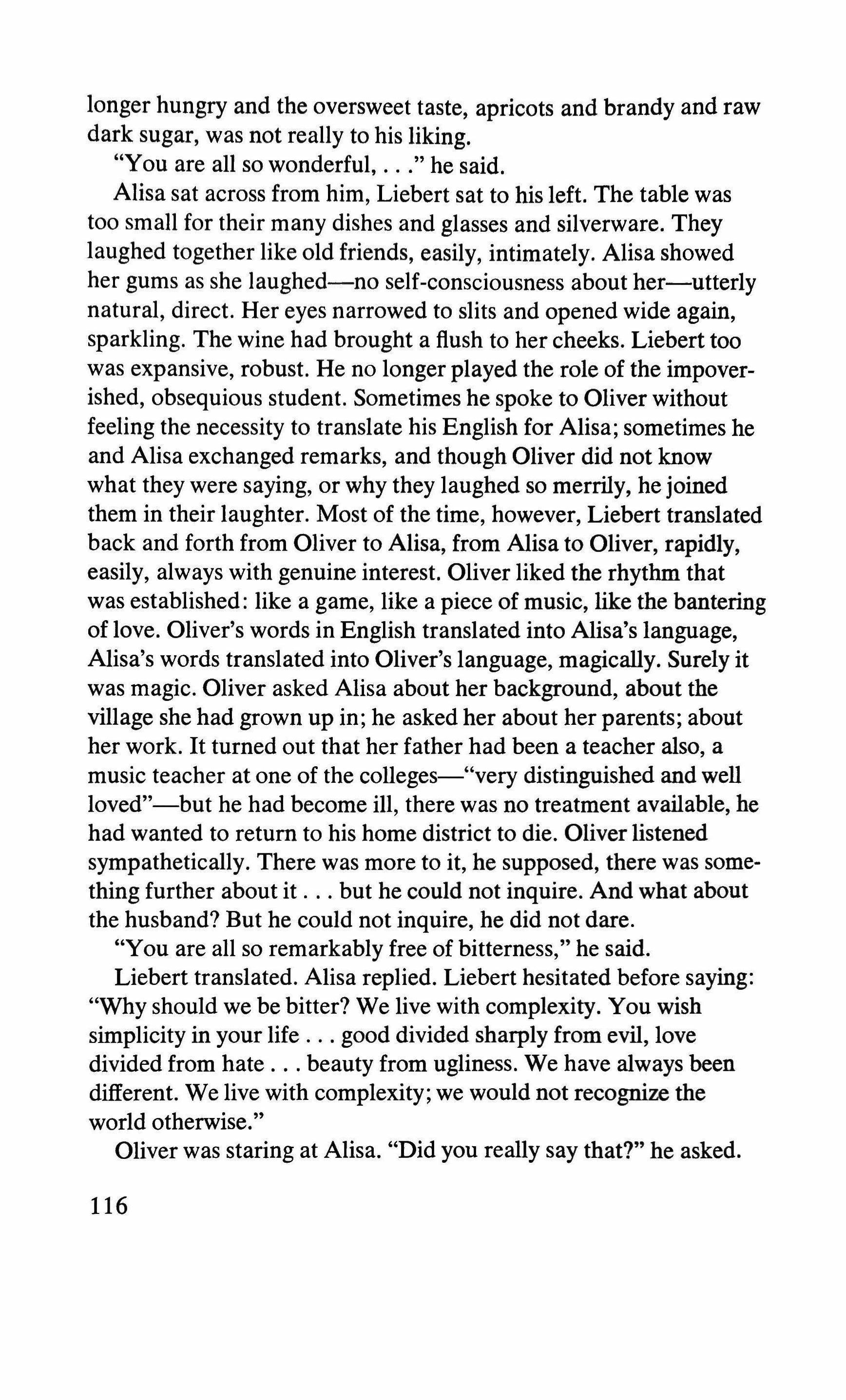 When they tired of games, they feasted on the supply of dainties the queen had filched from the royal table during the week. She spread a picnic on a drum, and they sat like barbarians cross-legged on the floor, gorging without the convenience of cutlery or plate, and swilling the king's vin de Beaune from a long-dead trumpeter's hom. After the feast they made love-sometimes brusquely beside the picked bones and twisted parings of their meal, sometimes lingeringly on the couch under the steel canopy, and sometimes, almost ceremonially, debout at the swordsman's glass.