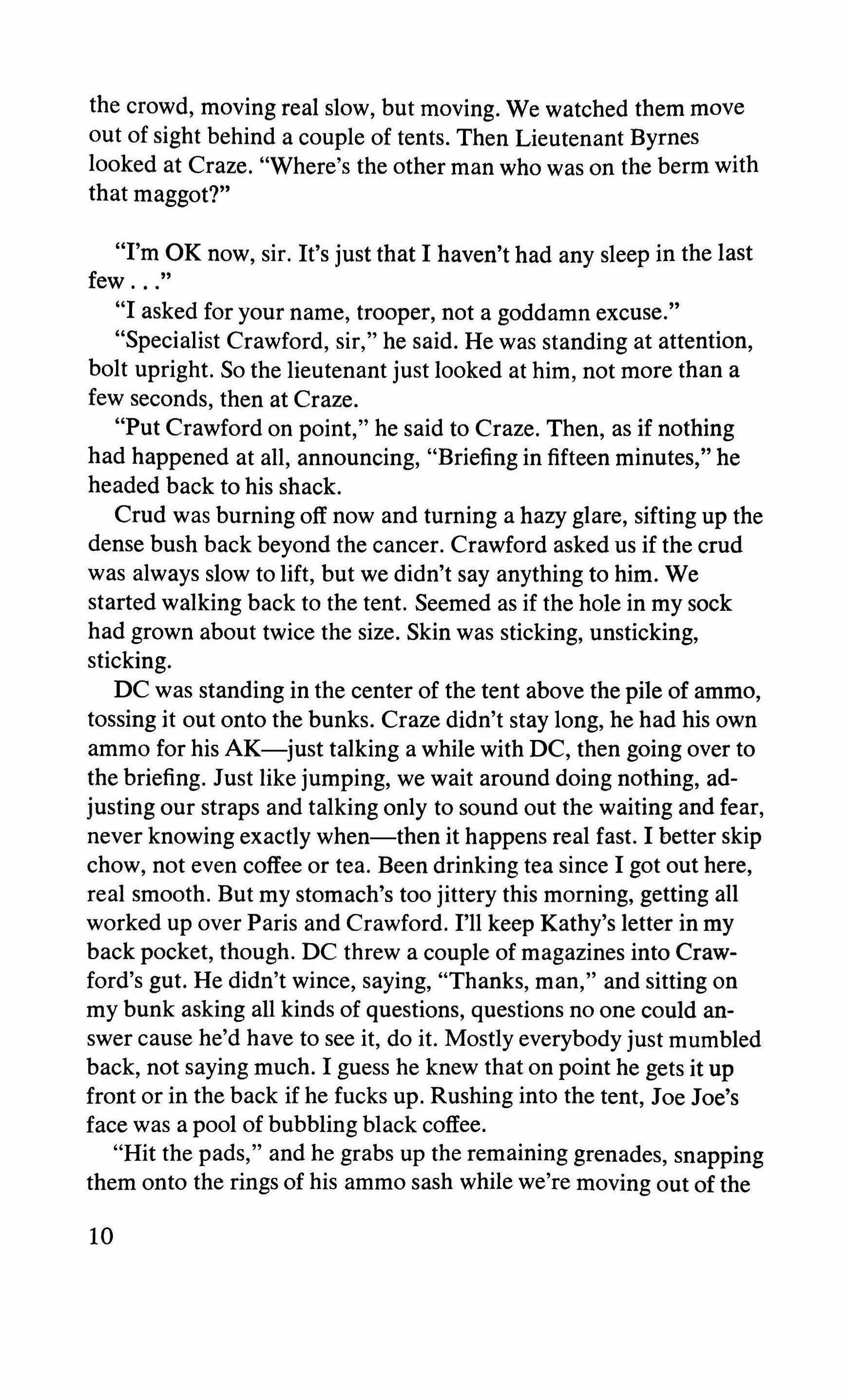 DC was standing in the center of the tent above the pile of ammo, tossing it out onto the bunks. Craze didn't stay long, he had his own ammo for his AK-just talking a while with DC, then going over to the briefing. Just like jumping, we wait around doing nothing, adjusting our straps and talking only to sound out the waiting and fear, never knowing exactly when-then it happens real fast. I better skip chow, not even coffee or tea. Been drinking tea since I got out here, real smooth. But my stomach's too jittery this morning, getting all worked up over Paris and Crawford. I'll keep Kathy's letter in my back pocket, though. DC threw a couple of magazines into Crawford's gut. He didn't wince, saying, "Thanks, man," and sitting on my bunk asking all kinds of questions, questions no one could answer cause he'd have to see it, do it. Mostly everybody just mumbled back, not saying much. I guess he knew that on point he gets it up front or in the back if he fucks up. Rushing into the tent, Joe Joe's face was a pool of bubbling black coffee.