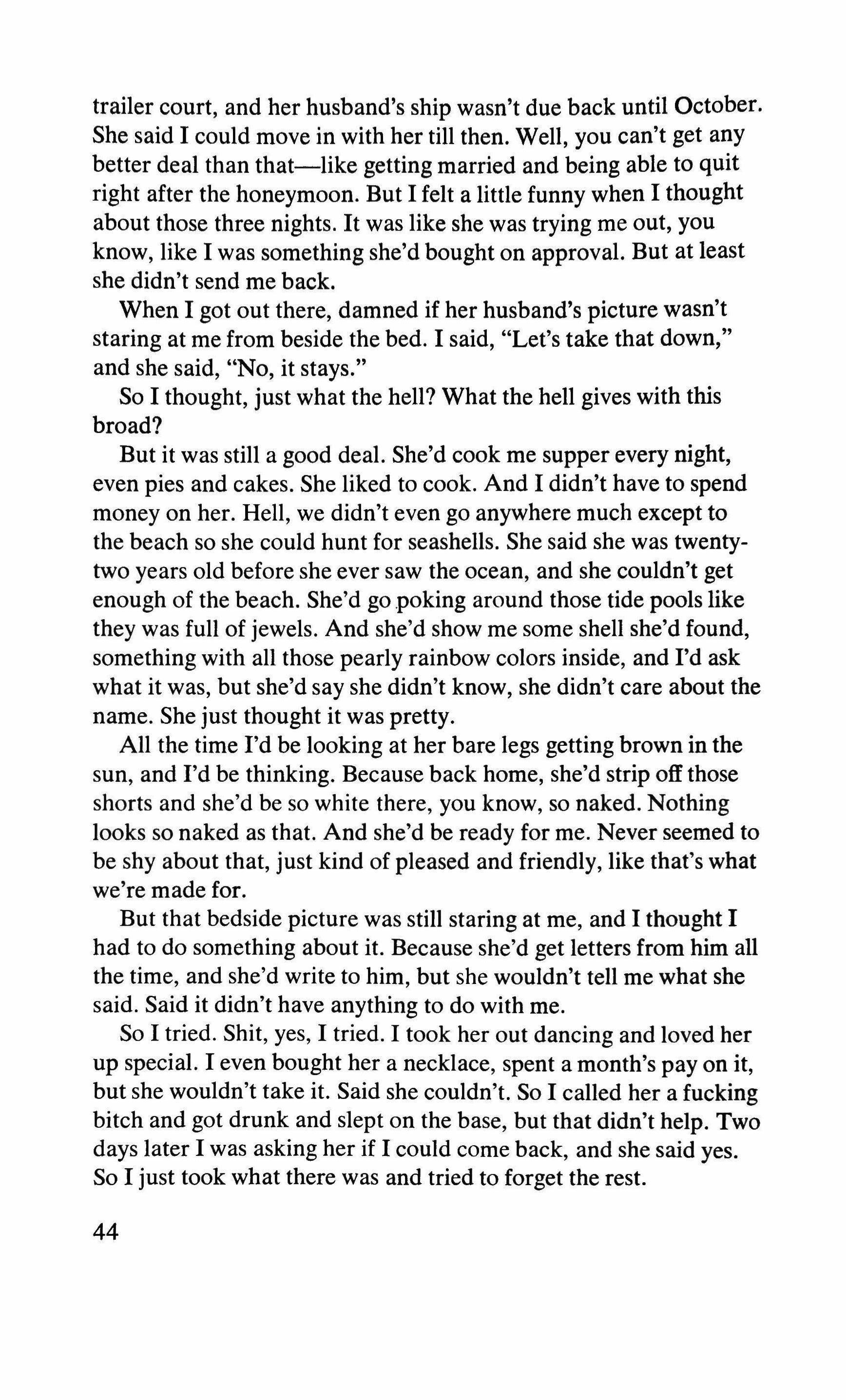 I folded up Kathy's letter and slid it in my right back pocket. Mostly everybody was up now, but Craze was still in his bunk leaning up on his elbow. He put two fingers up to his lips when he noticed that I had finished reading Kathy's letter. He swung his feet on the ground, saying, "Make it a straight, Stew," and I tossed him my pack of cigarettes.