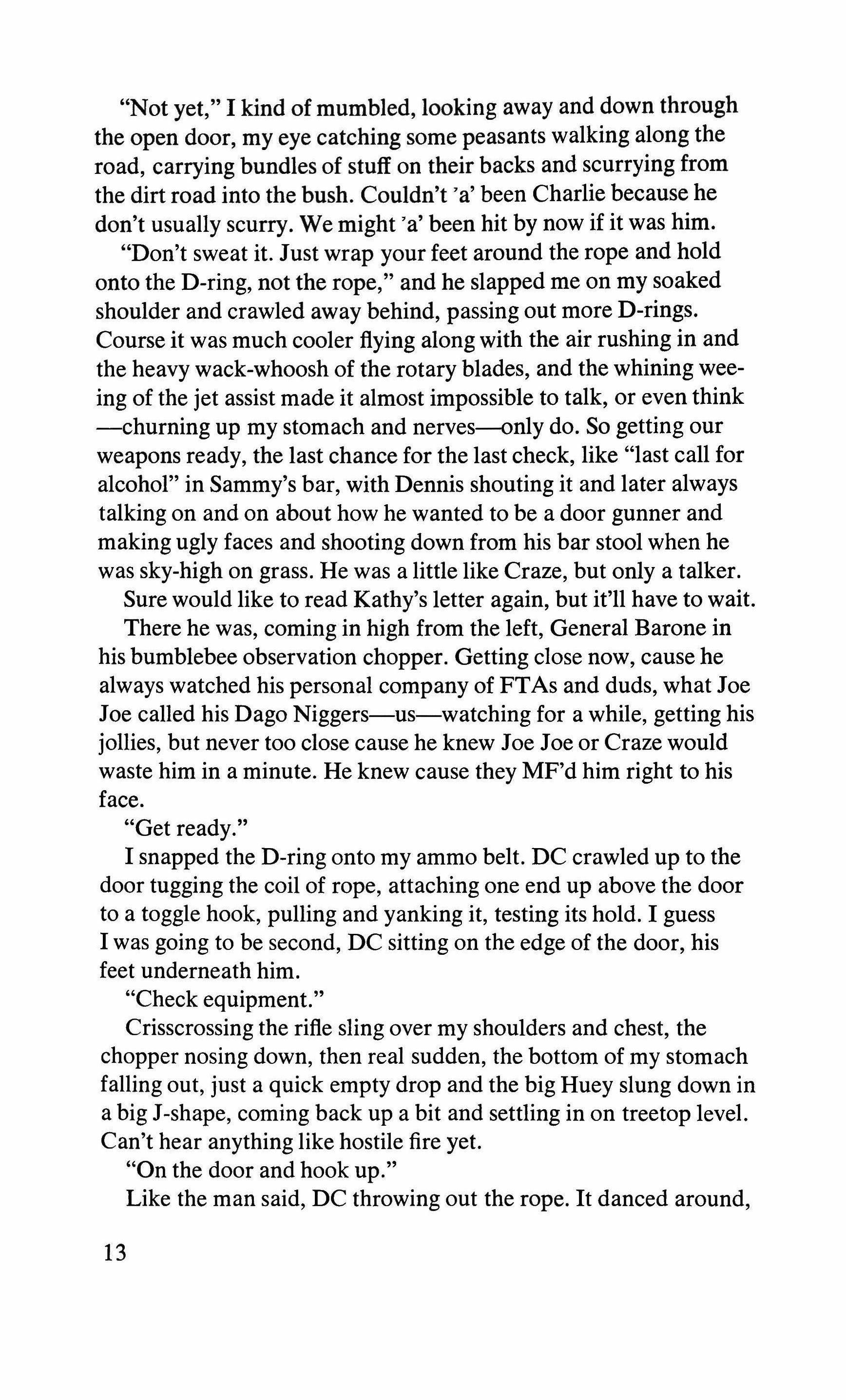 "Don't sweat it. Just wrap your feet around the rope and hold onto the D-ring, not the rope," and he slapped me on my soaked shoulder and crawled away behind, passing out more D-rings. Course it was much cooler flying along with the air rushing in and the heavy wack-whoosh of the rotary blades, and the whining weeing of the jet assist made it almost impossible to talk, or even think -churning up my stomach and nerves-only do. So getting our weapons ready, the last chance for the last check, like "last call for alcohol" in Sammy's bar, with Dennis shouting it and later always talking on and on about how he wanted to be a door gunner and making ugly faces and shooting down from his bar stool when he was sky-high on grass. He was a little like Craze, but only a talker.