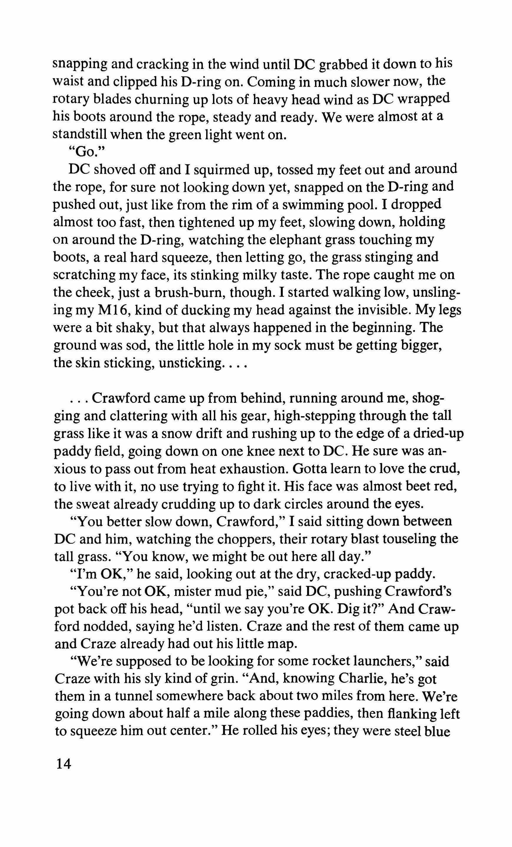 DC shoved off and I squirmed up, tossed my feet out and around the rope, for sure not looking down yet, snapped on the D-ring and pushed out, just like from the rim of a swimming pool. I dropped almost too fast, then tightened up my feet, slowing down, holding on around the D-ring, watching the elephant grass touching my boots, a real hard squeeze, then letting go, the grass stinging and scratching my face, its stinking milky taste. The rope caught me on the cheek, just a brush-burn, though. I started walking low, unslinging my M16, kind of ducking my head against the invisible. My legs were a bit shaky, but that always happened in the beginning. The ground was sad, the little hole in my sock must be getting bigger, the skin sticking, unsticking