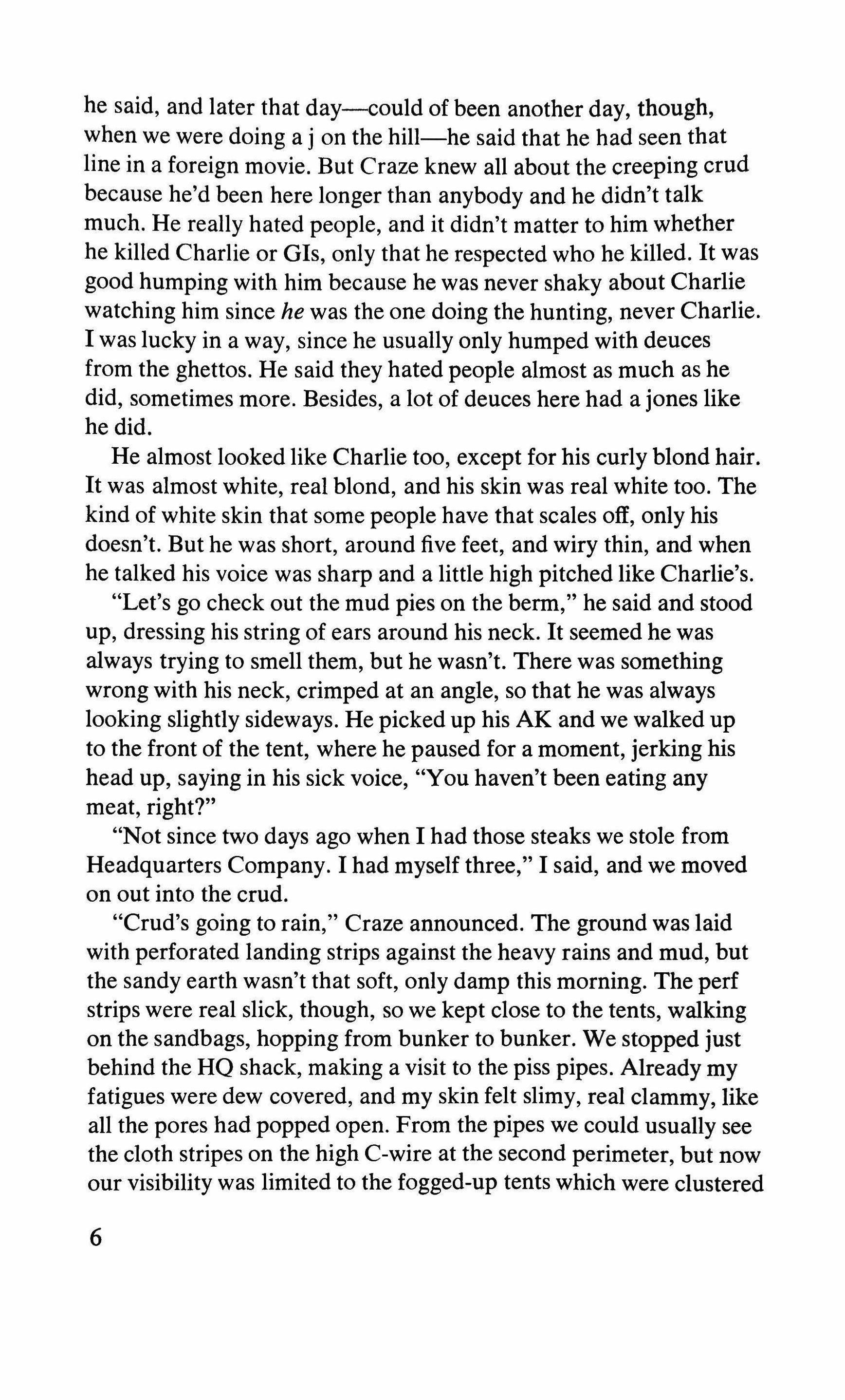"Crud's going to rain," Craze announced. The ground was laid with perforated landing strips against the heavy rains and mud, but the sandy earth wasn't that soft, only damp this morning. The perf strips were real slick, though, so we kept close to the tents, walking on the sandbags, hopping from bunker to bunker. We stopped just behind the HQ shack, making a visit to the piss pipes. Already my fatigues were dew covered, and my skin felt slimy, real clammy, like all the pores had popped open. From the pipes we could usually see the cloth stripes on the high C-wire at the second perimeter, but now our visibility was limited to the fogged-up tents which were clustered