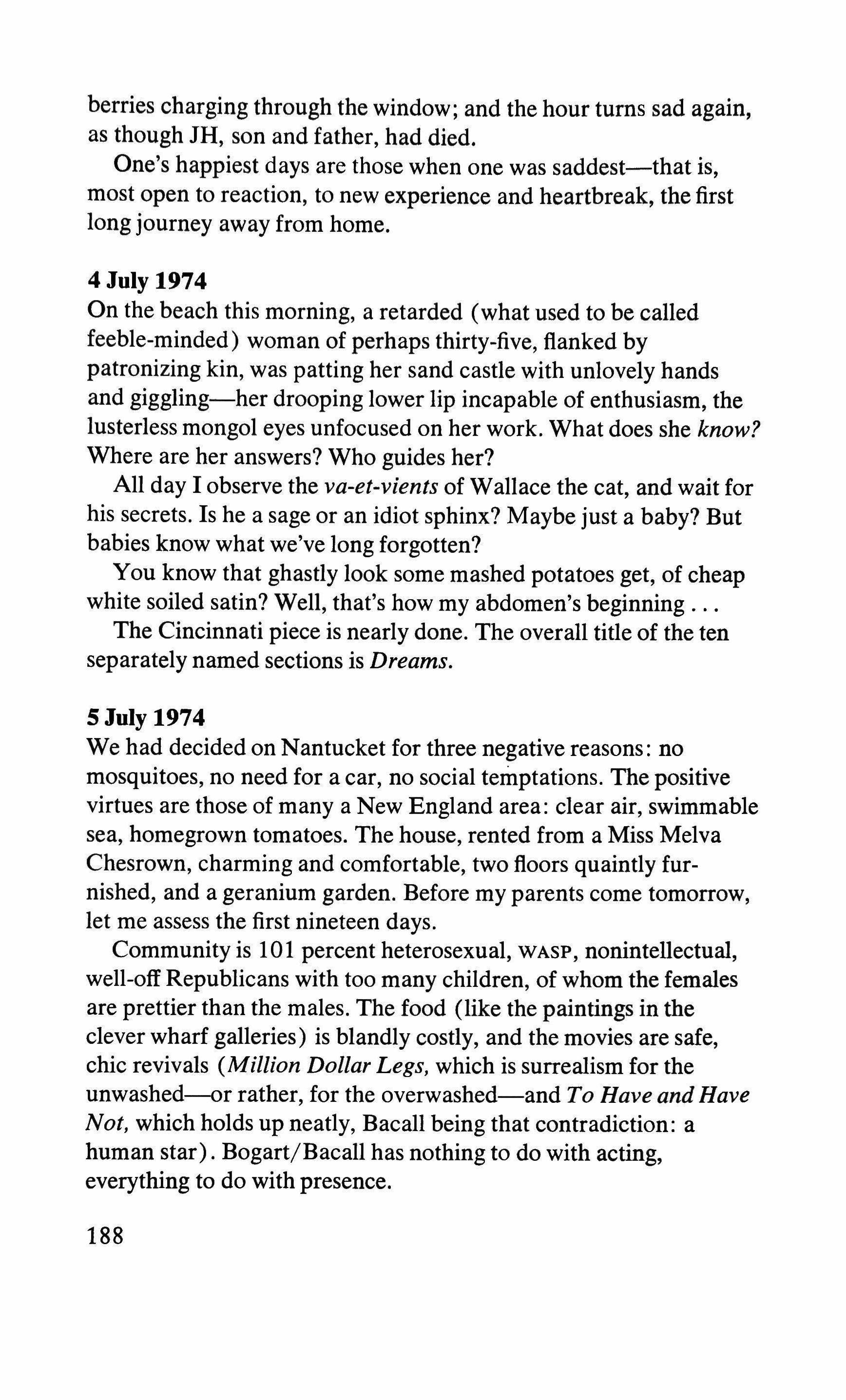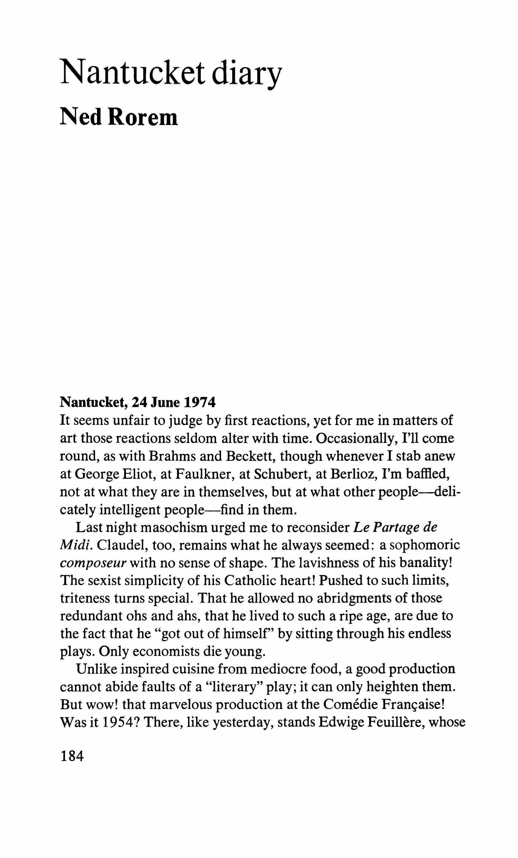 178 About the late Zimma (Penny) Cate: selections from her loving husband's memory hoard Russell Banks 184 Nantucket diary Ned Rorem