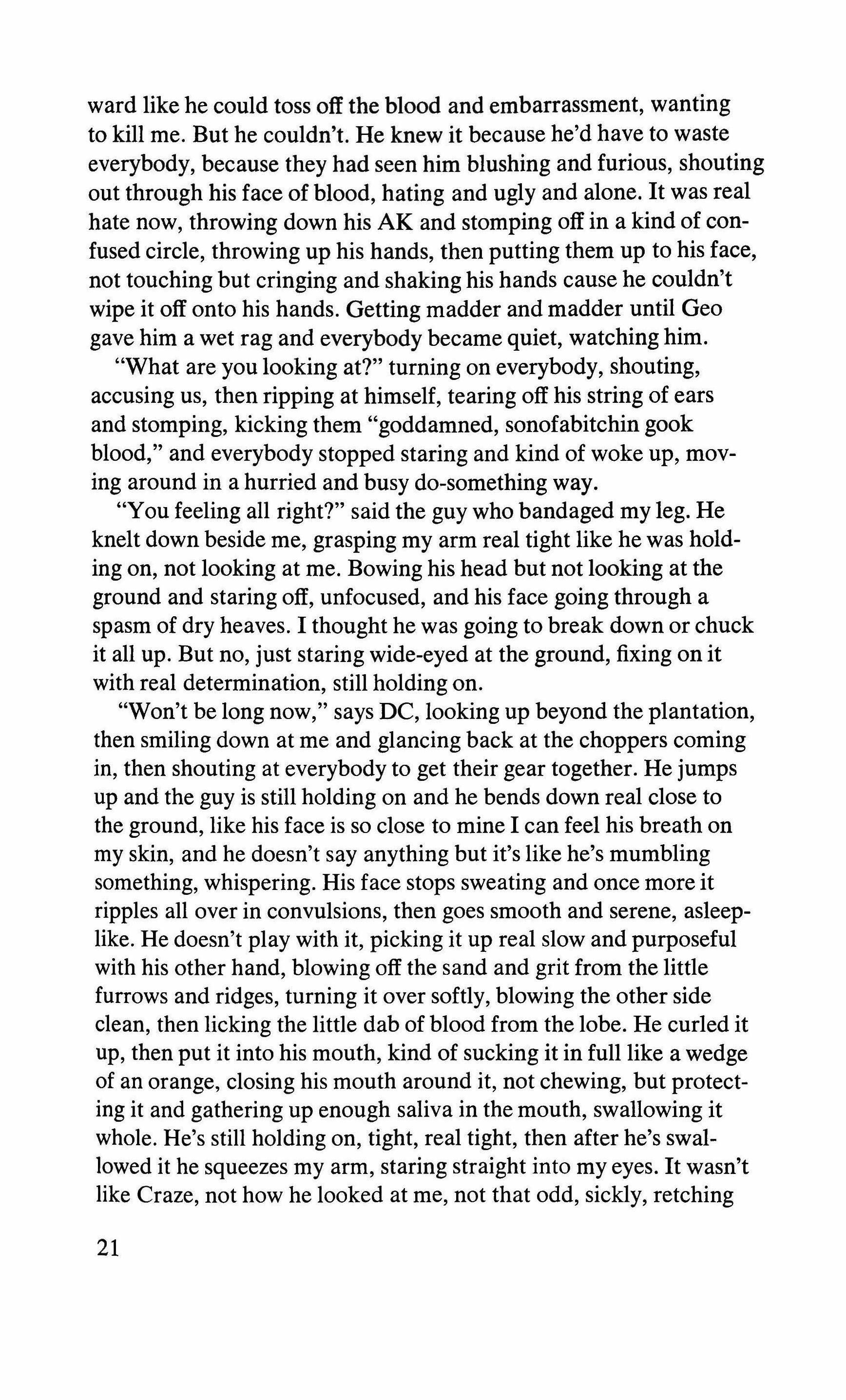"Let's go check out the mud pies on the berm," he said and stood up, dressing his string of ears around his neck. It seemed he was always trying to smell them, but he wasn't. There was something wrong with his neck, crimped at an angle, so that he was always looking slightly sideways. He picked up his AK and we walked up to the front of the tent, where he paused for a moment, jerking his head up, saying in his sick voice, "You haven't been eating any meat, right?"