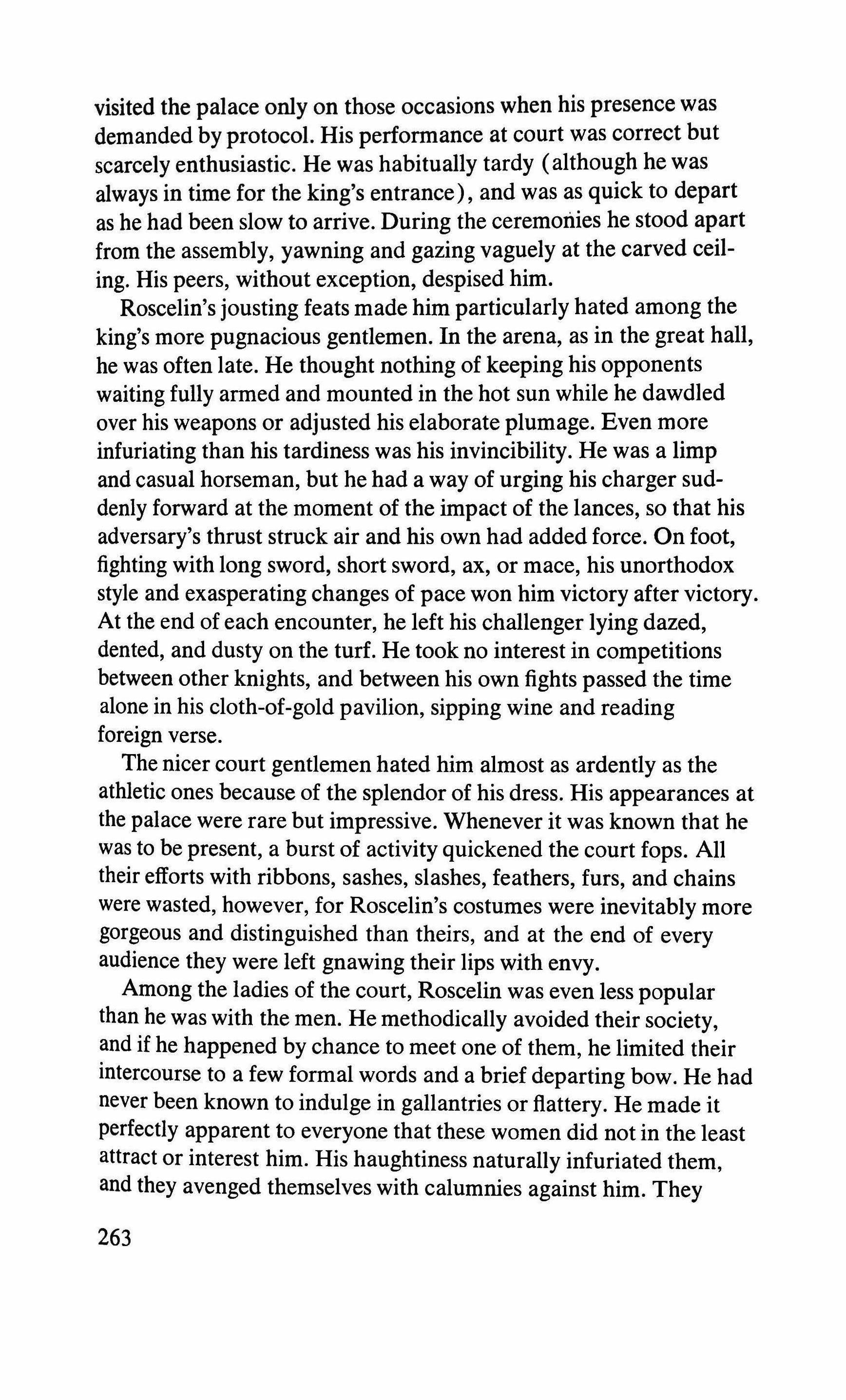 This air of superiority made Roscelin the one member of the court who was above, or perhaps beneath, suspicion of adultery with the queen. The courtiers were unanimously of the opinion that he was far too self-obsessed to devote his time and energy to a love affair, particularly to one so demanding as this must necessarily be. But the courtiers were mistaken; they were misled by the exaggeration of Roscelin's manner and the poverty of their own imaginations. What they interpreted as ridiculous vanity was in fact an artful pose. Behind the mask of egotism Roscelin concealed the depth of his feeling and the complete seriousness of his intentions.