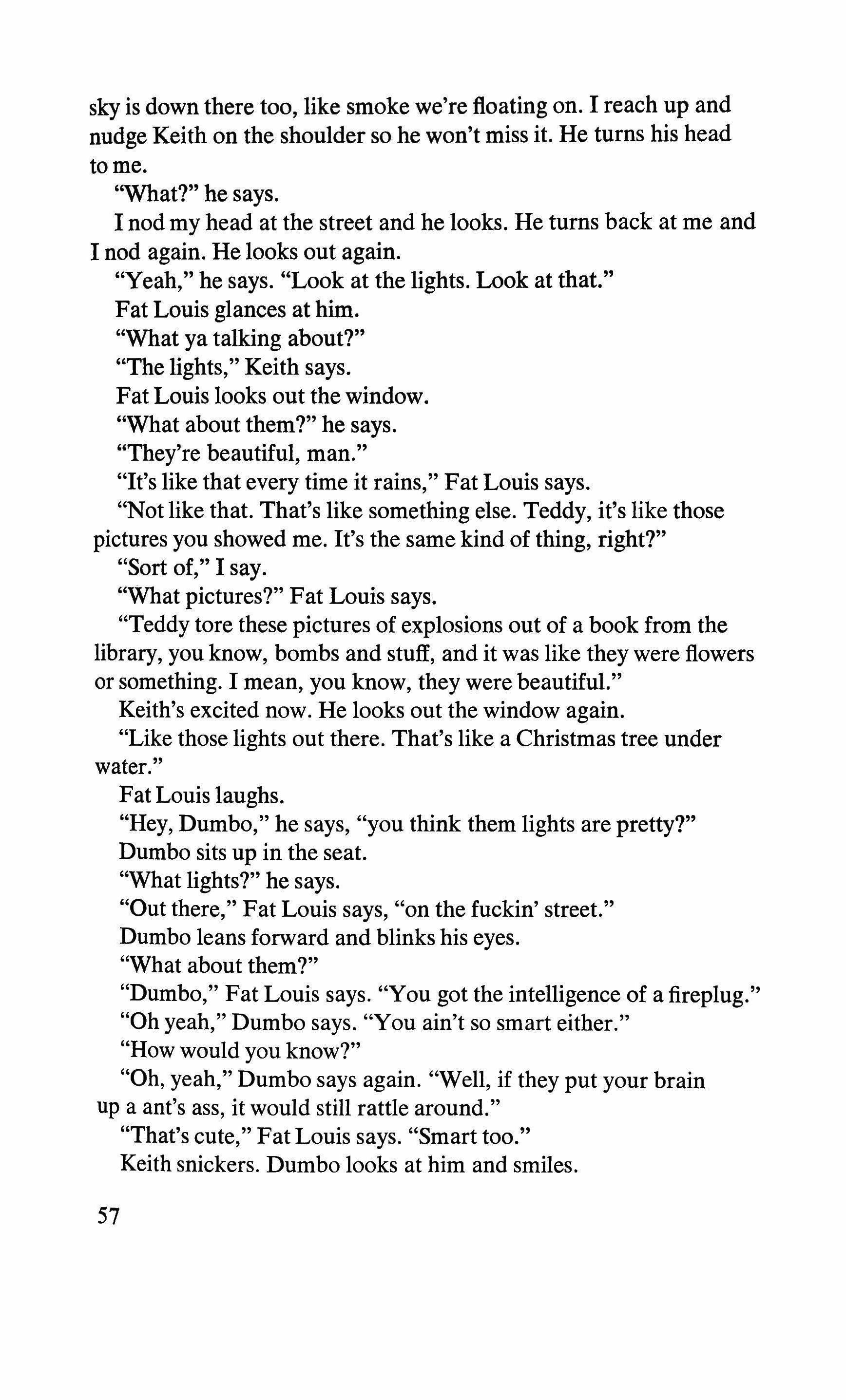 "Sorry 'bout that," said the door gunner. I heard him say it and I knew he was watching, talking about Paris, but I couldn't look. We were too far up, beyond the reach of his cries or the sound of the explosions and caught up in the wack-whoosh of the rotary blades, but still it was like how he said it, kind of "Oh well, it's just one of those things"; not sad, not angry at Charlie, just an average ordinary fact in a stupid fact book.