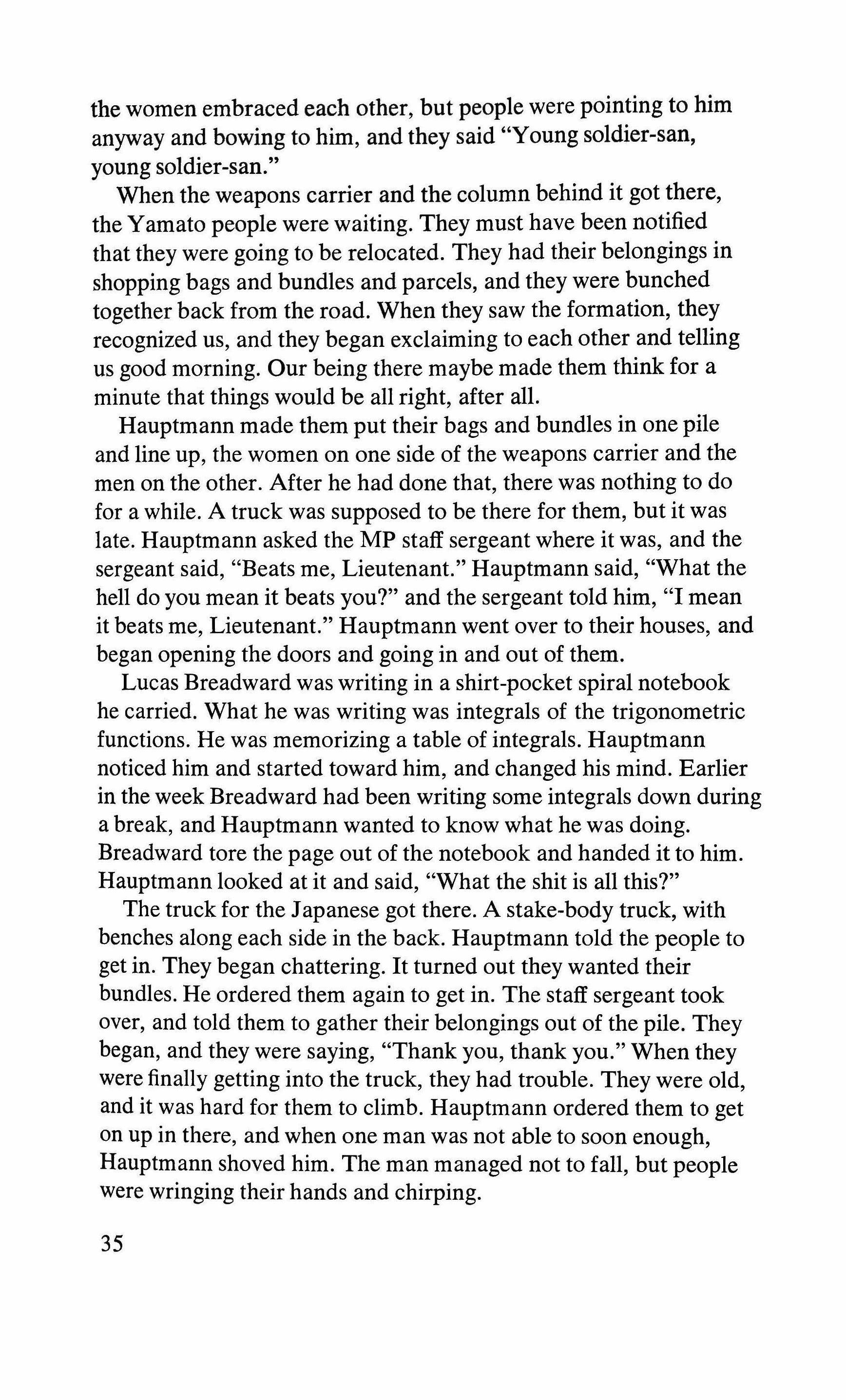 And then, "Come on now, Paris. You haven't forgotten your military courtesy. You can tack a 'sir' on that sentence," he said, still like he was just talking with anybody. Paris lifted his head a bit and peered up at the lieutenant. "Pick yourself up, Paris, and get to the position of attention," he said, a little crisp, walking a few steps away. Paris got up real slow, stumbling, real wobbly on his feet. His face was already swollen up, the eyes almost closed. "Paris, I think you've had enough for one day. Besides, you're not going to be much help with shiners like these," touching his eyes and opening them up wider. "Tell you what. You rest up today and I'll be talking with you tomorrow." Finally he said, "Put Paris in the tin can," which was a huge corrugated metal box with just a few air holes. Could get mighty hot in there. Paris was led out through
