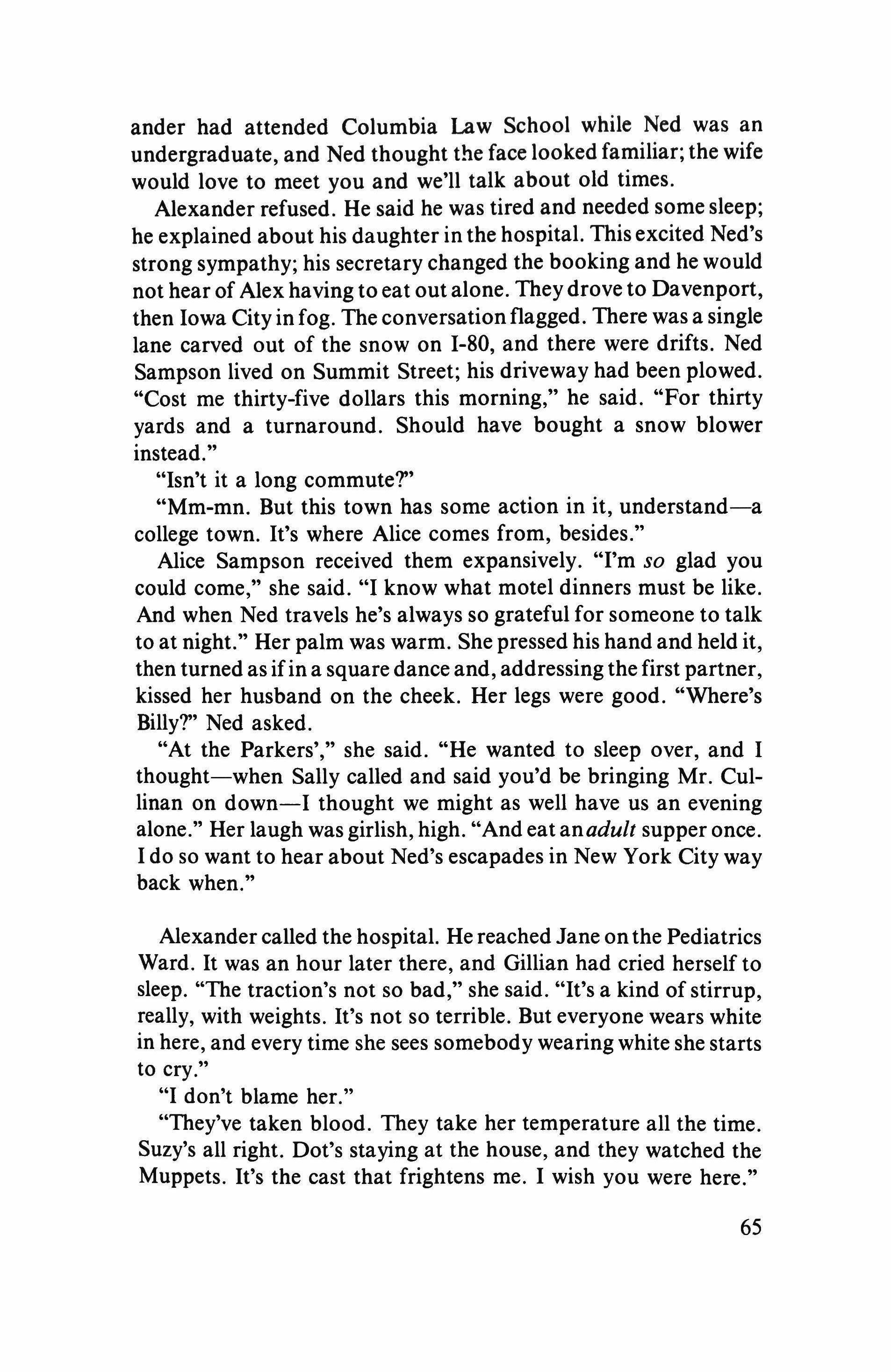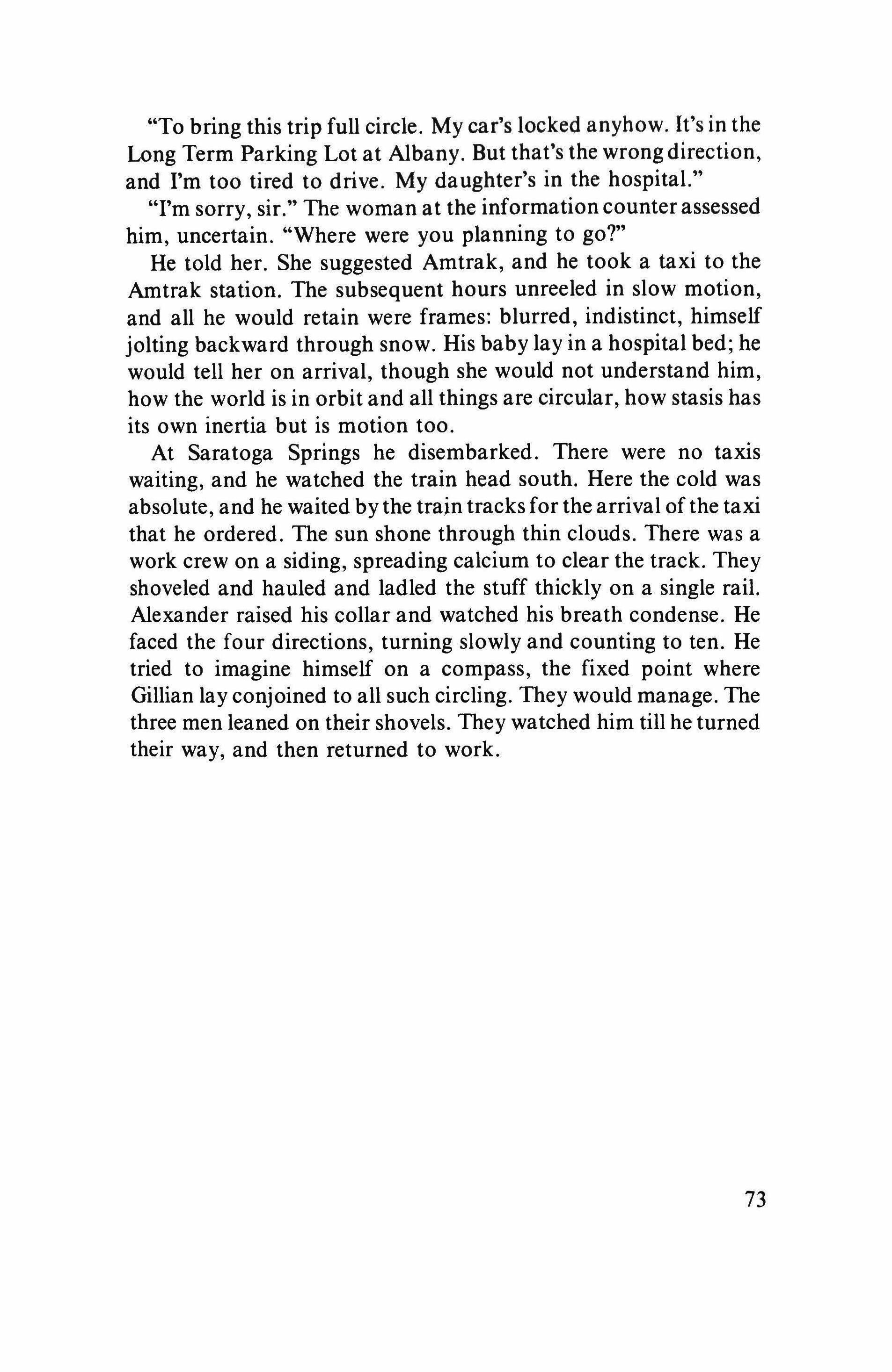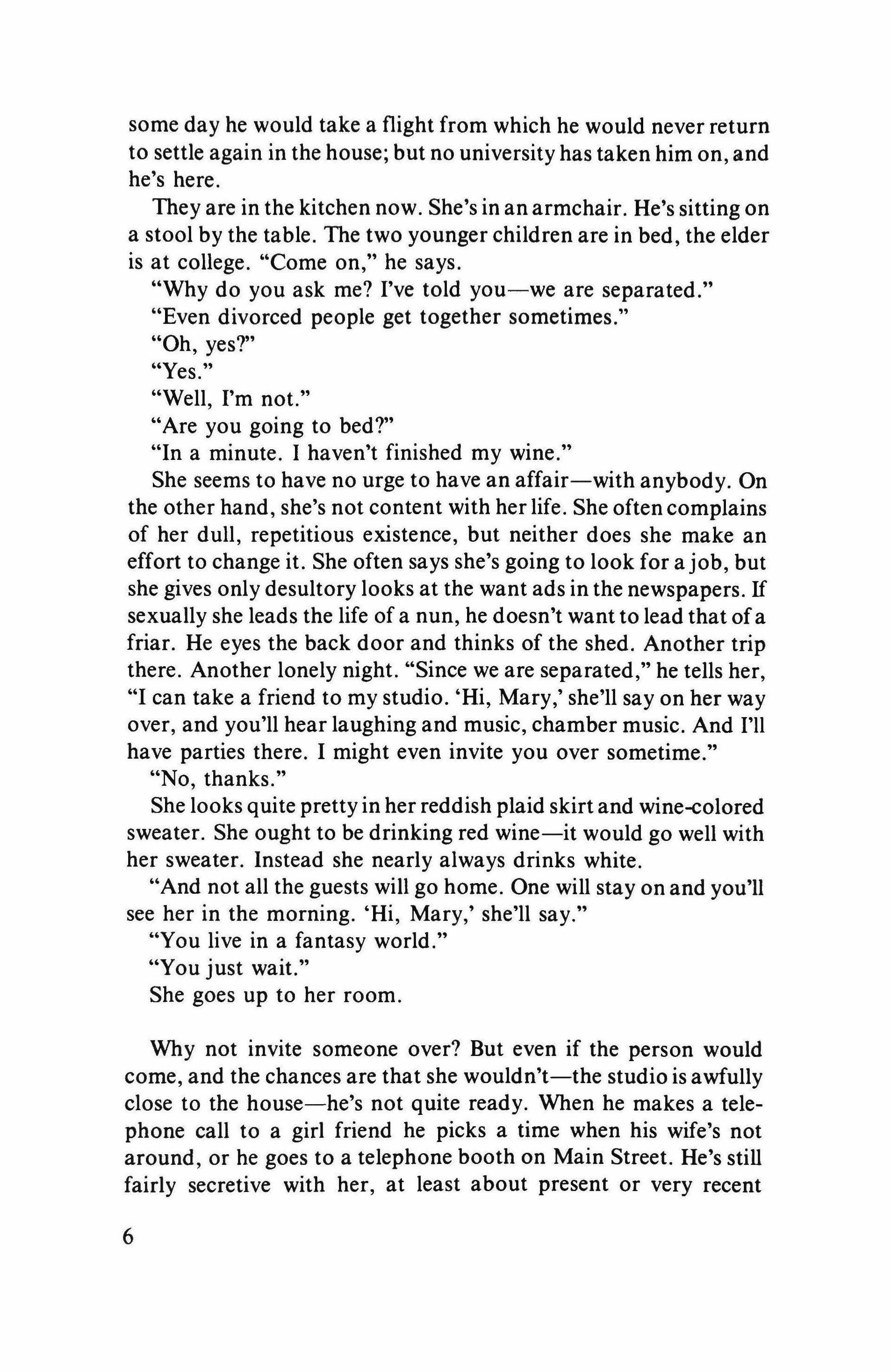 "We are separated"-he doesn't know quite how serious she is, and that's why every once in a while he dares make an advance. It might be just a tilt of his head toward her bedroom or an invitation to the shed while she is hanging clothes on the line between it and the house. But she must be quite serious. They haven't slept together since May, when after months apart they spent one night in the same bed in a hotel suite on the sea, in Italy, where they had gone for a month with their children. It's September now. For the past ten years of the twenty they've been married they have been sleeping together more and more rarely. Even during the first ten they slept in separate rooms most of the time. During the last five years he has been away for long periods as artist in residence at universities here and there, every year farther away, the past year in the westernmost part of Texas. This year he applied forjobs even farther-in California, Idaho, Washington-and thought that