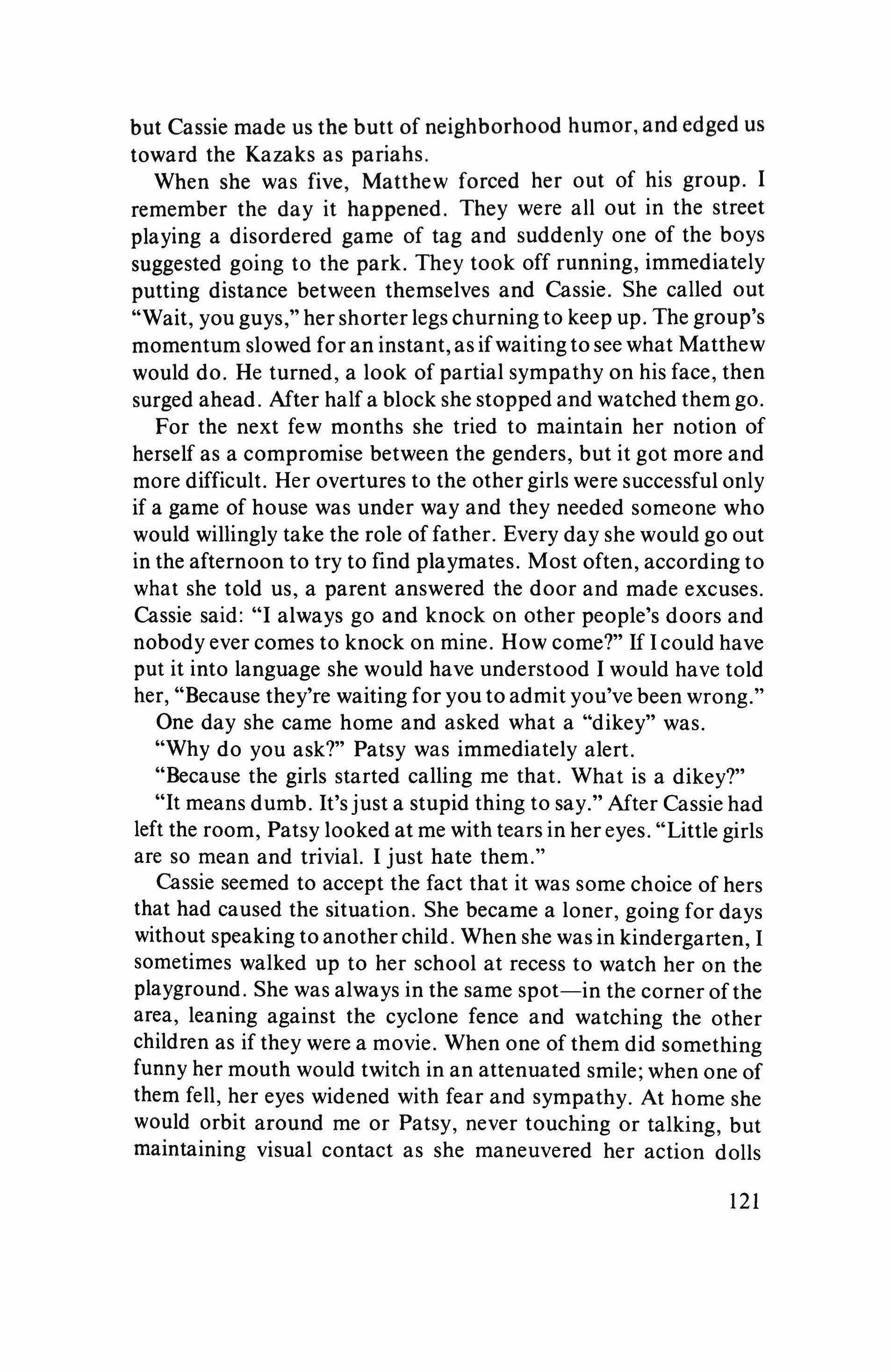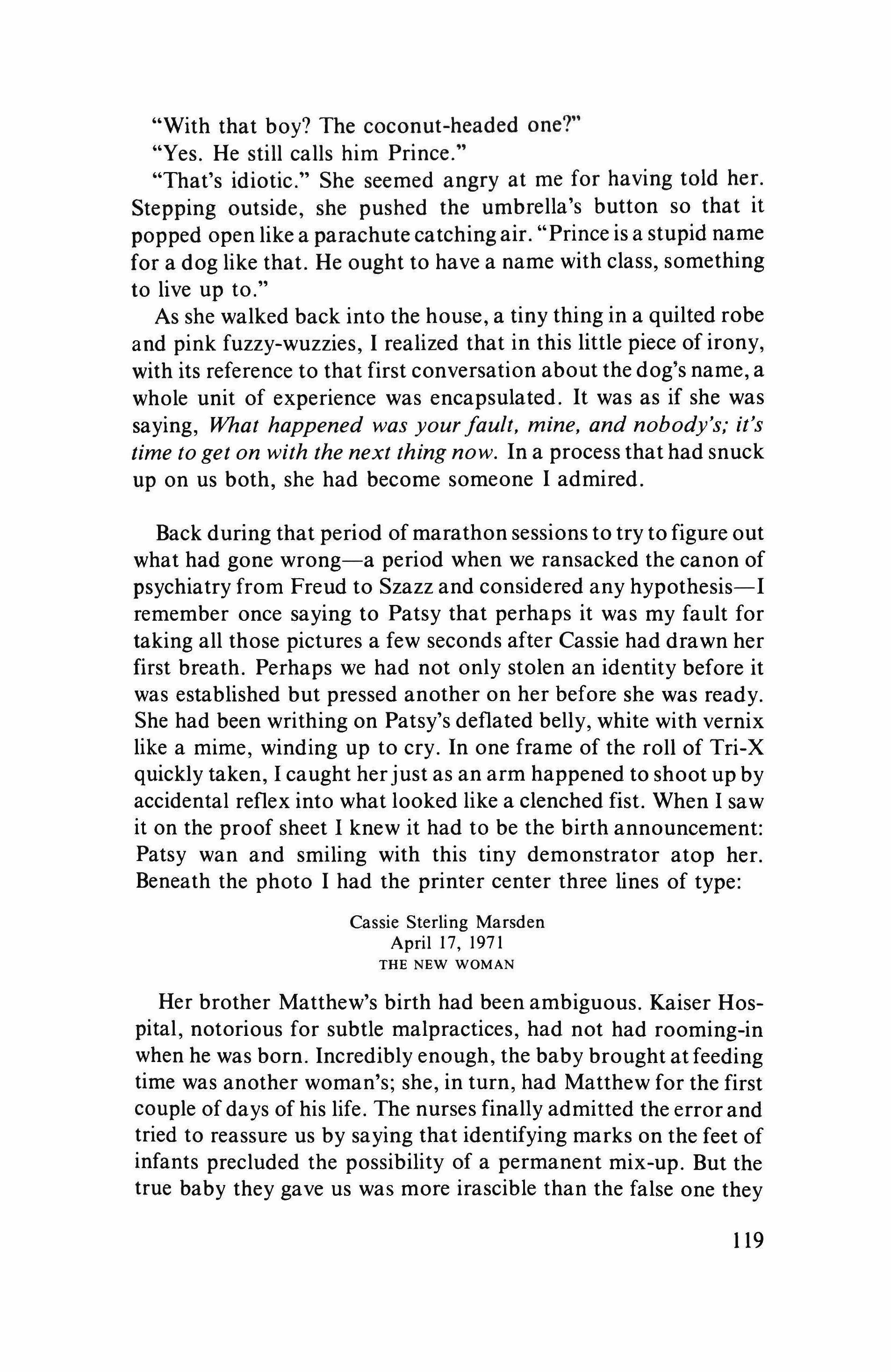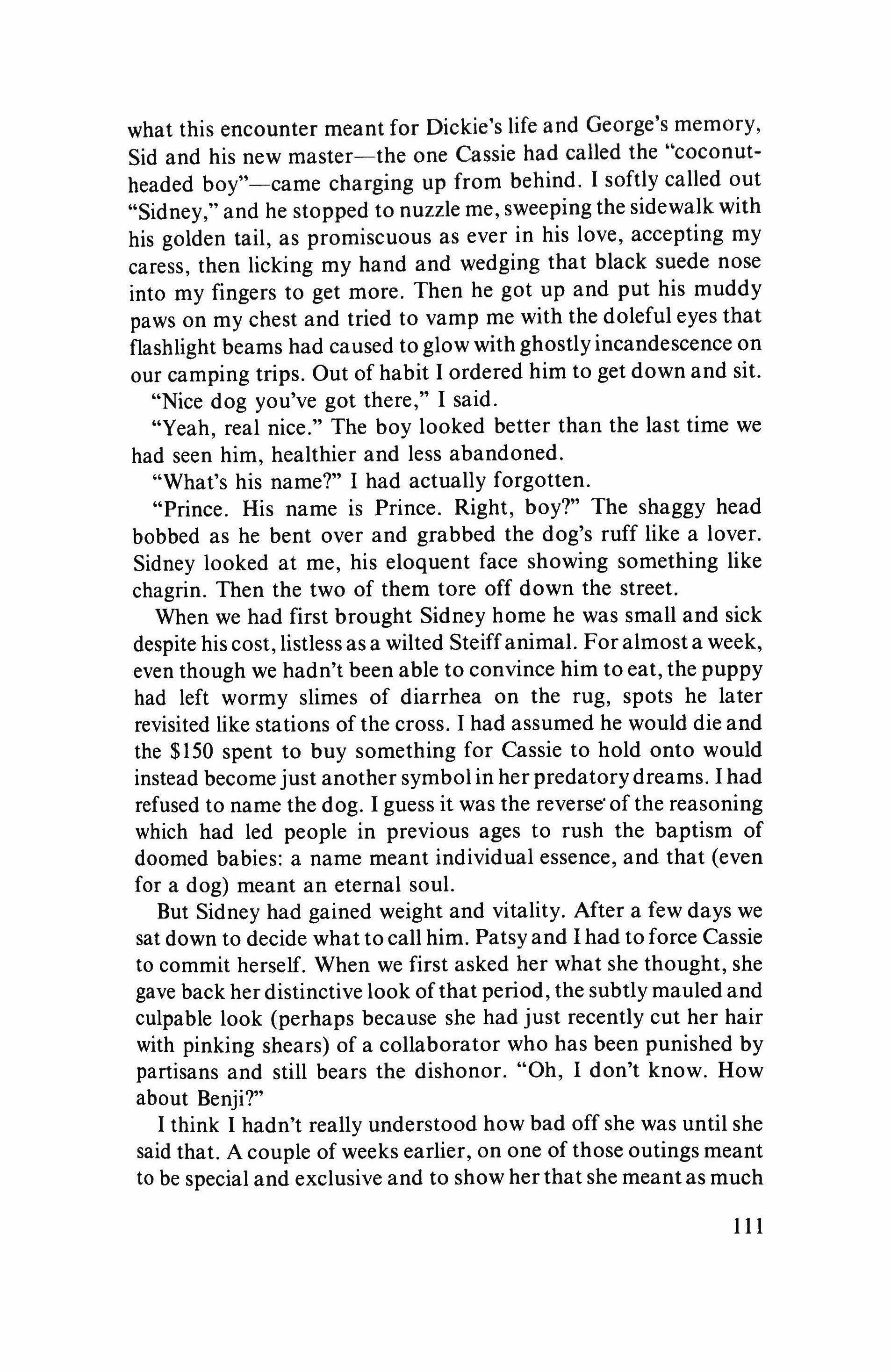 "We are separated"-he doesn't know quite how serious she is, and that's why every once in a while he dares make an advance. It might be just a tilt of his head toward her bedroom or an invitation to the shed while she is hanging clothes on the line between it and the house. But she must be quite serious. They haven't slept together since May, when after months apart they spent one night in the same bed in a hotel suite on the sea, in Italy, where they had gone for a month with their children. It's September now. For the past ten years of the twenty they've been married they have been sleeping together more and more rarely. Even during the first ten they slept in separate rooms most of the time. During the last five years he has been away for long periods as artist in residence at universities here and there, every year farther away, the past year in the westernmost part of Texas. This year he applied forjobs even farther-in California, Idaho, Washington-and thought that