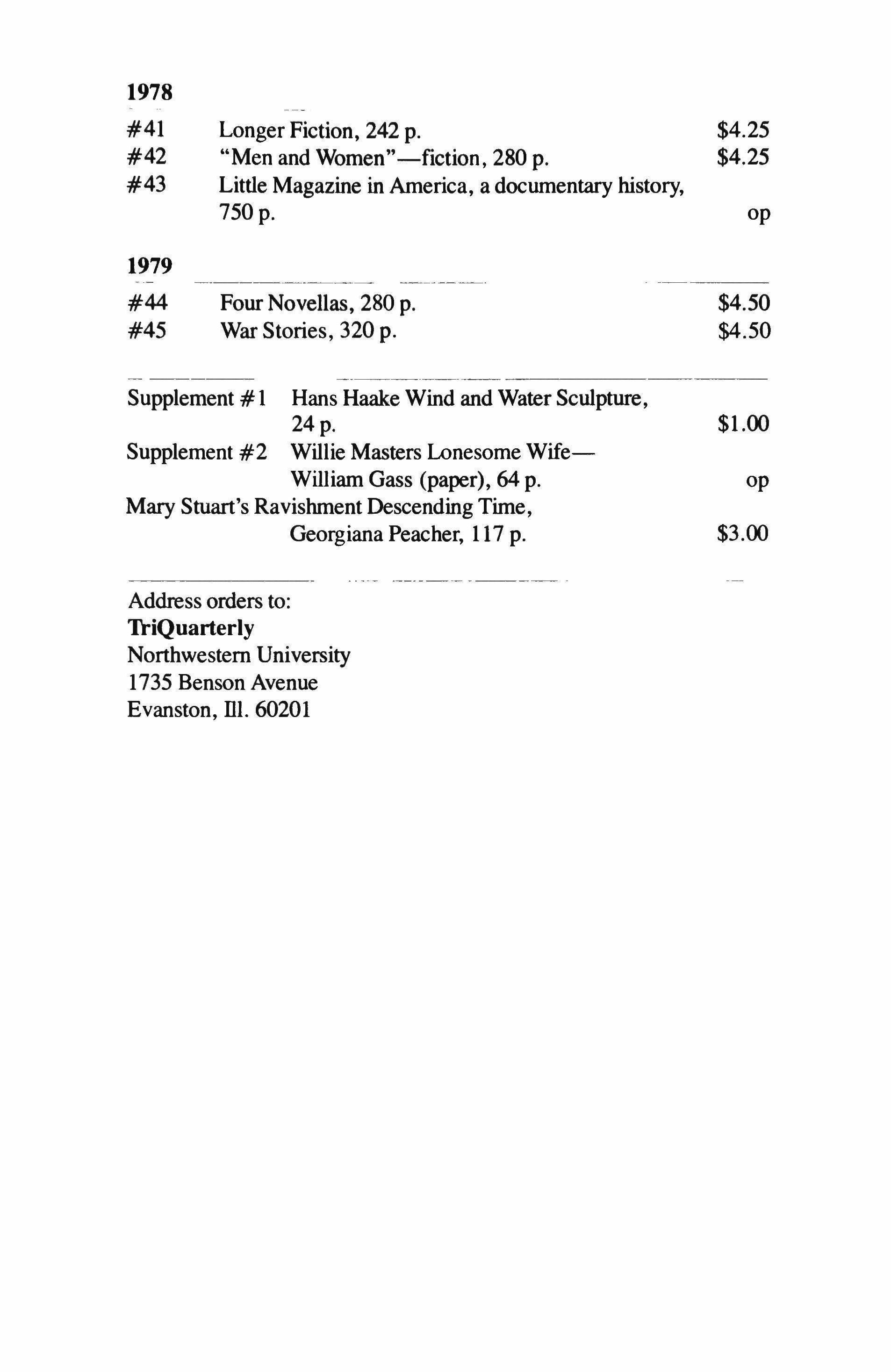 Subscription rates: One year $12.00; two years $20.00; three years $30.00. Foreign subscriptions $1.00 per year additional. Single copies usually $5.95. Back issue prices on request. Contributions, correspondence, and subscriptions should be addressed to TriQuarteriy. 1735 Benson Avenue, Northwestern University, Evanston, Illinois 60201. The editors invite submissions, but queries are strongly suggested. No manuscripts will be returned unless accompanied by a stamped, self-addressed envelope. All manuscripts accepted for publication become the property of TriQuarterly, unless otherwise indicated. Copyright© 1979 byTriQuarterly. All rights reserved. The views expressed in this magazine are to be attributed to the writers, not the editors or sponsors. Printed in the United States of America. Claims for missing numbers will be honored only within the four-month period after month of issue.