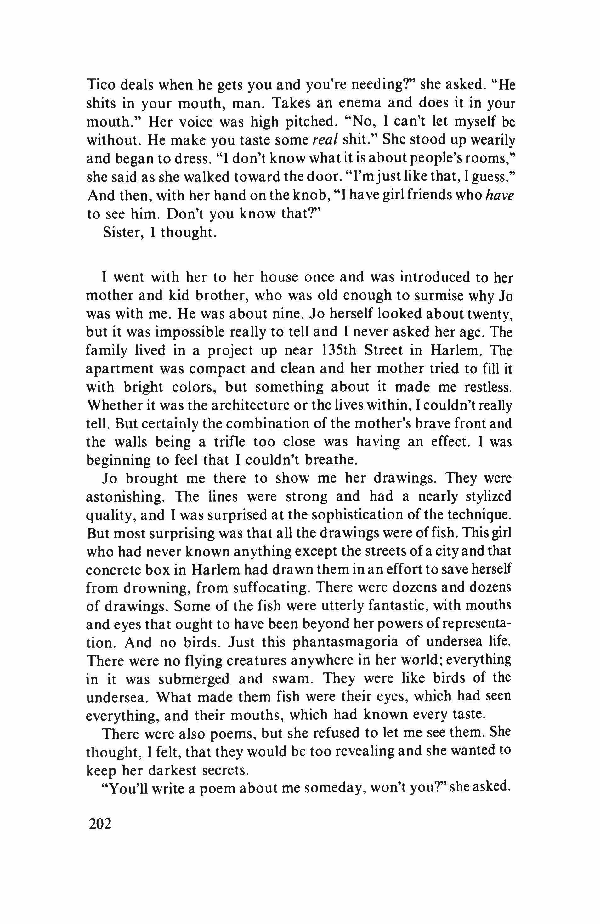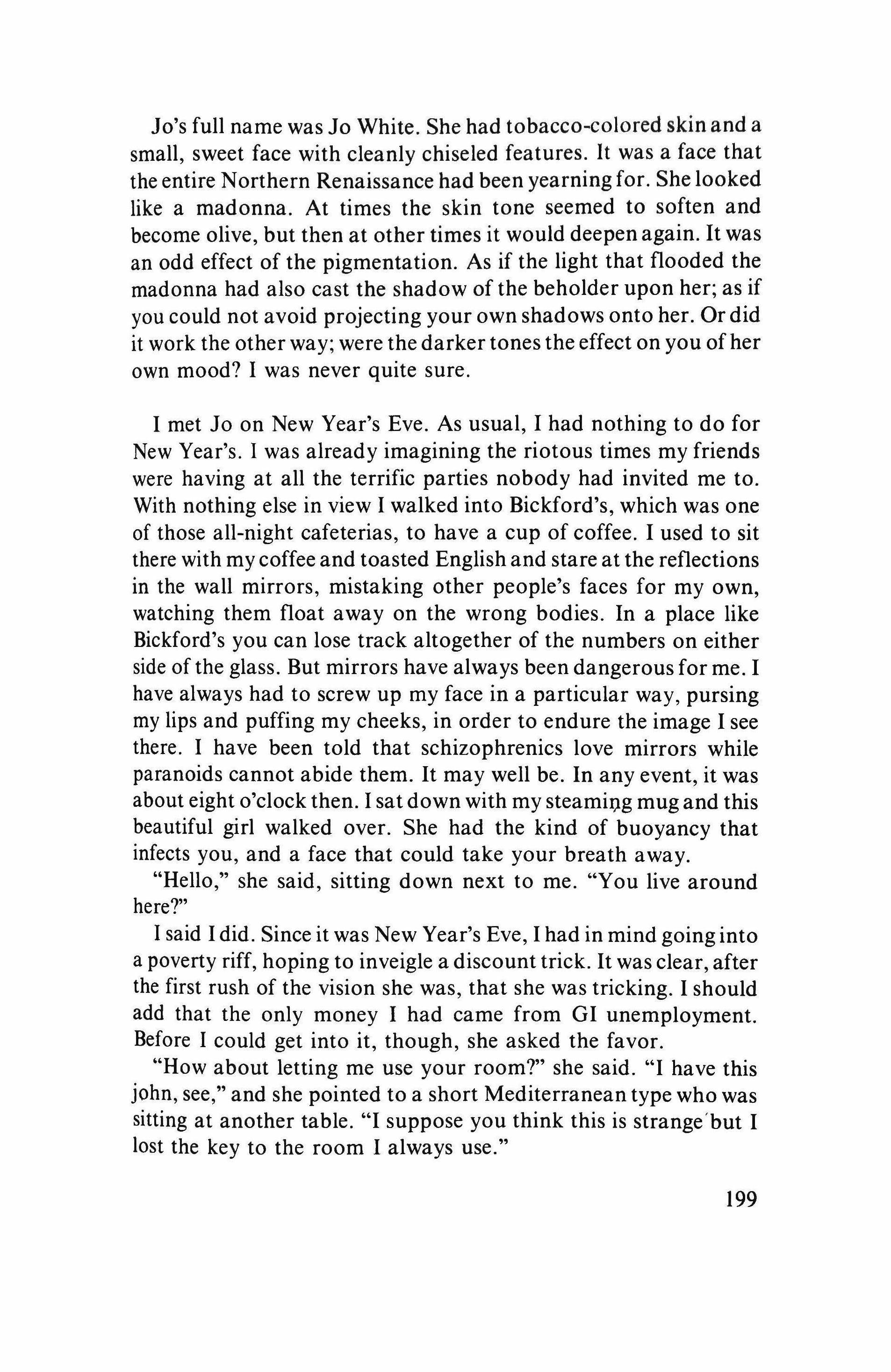 danced with her again and again, forgetting the other. What did it matter? The other, too, was dancing, with someone she seemed to like better than him. The music got madder and madder. They danced to one side of the room and, screened by a pillar, they kissed. Later he said something nice about the man she lived with. "It works," she said, "because weekends he lets me do what I like." Still later, she said, "Can you give me a ride home?"