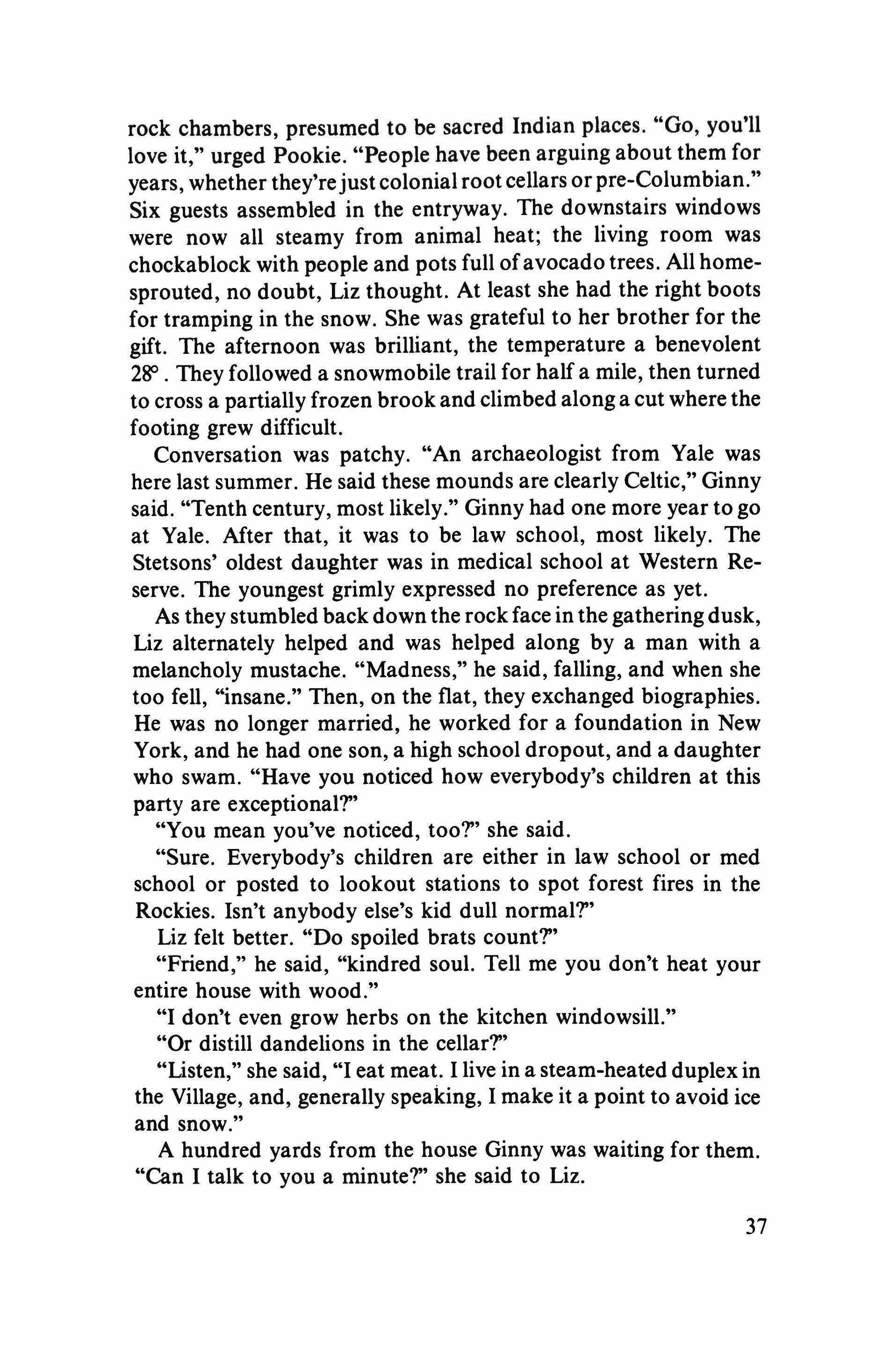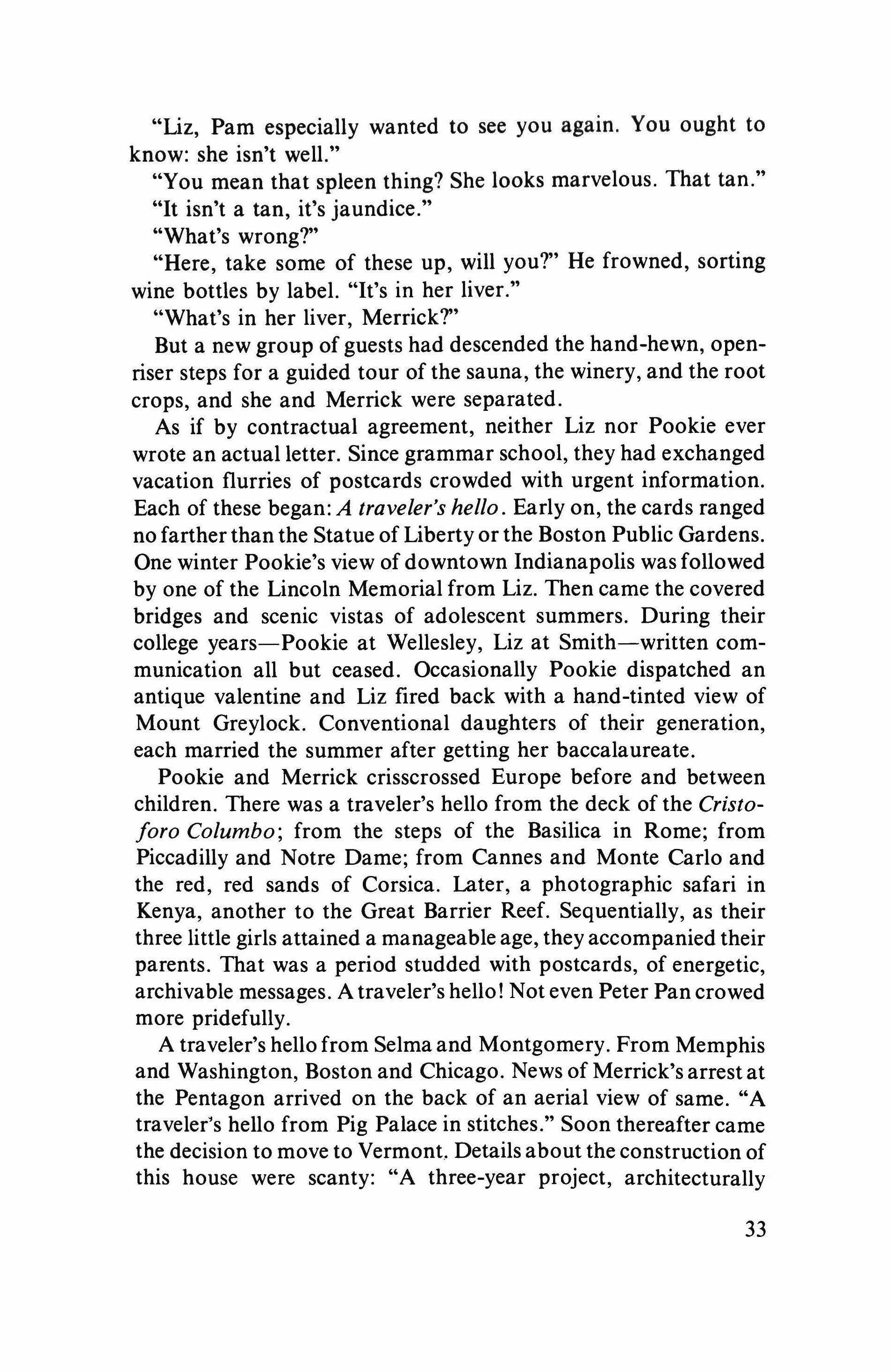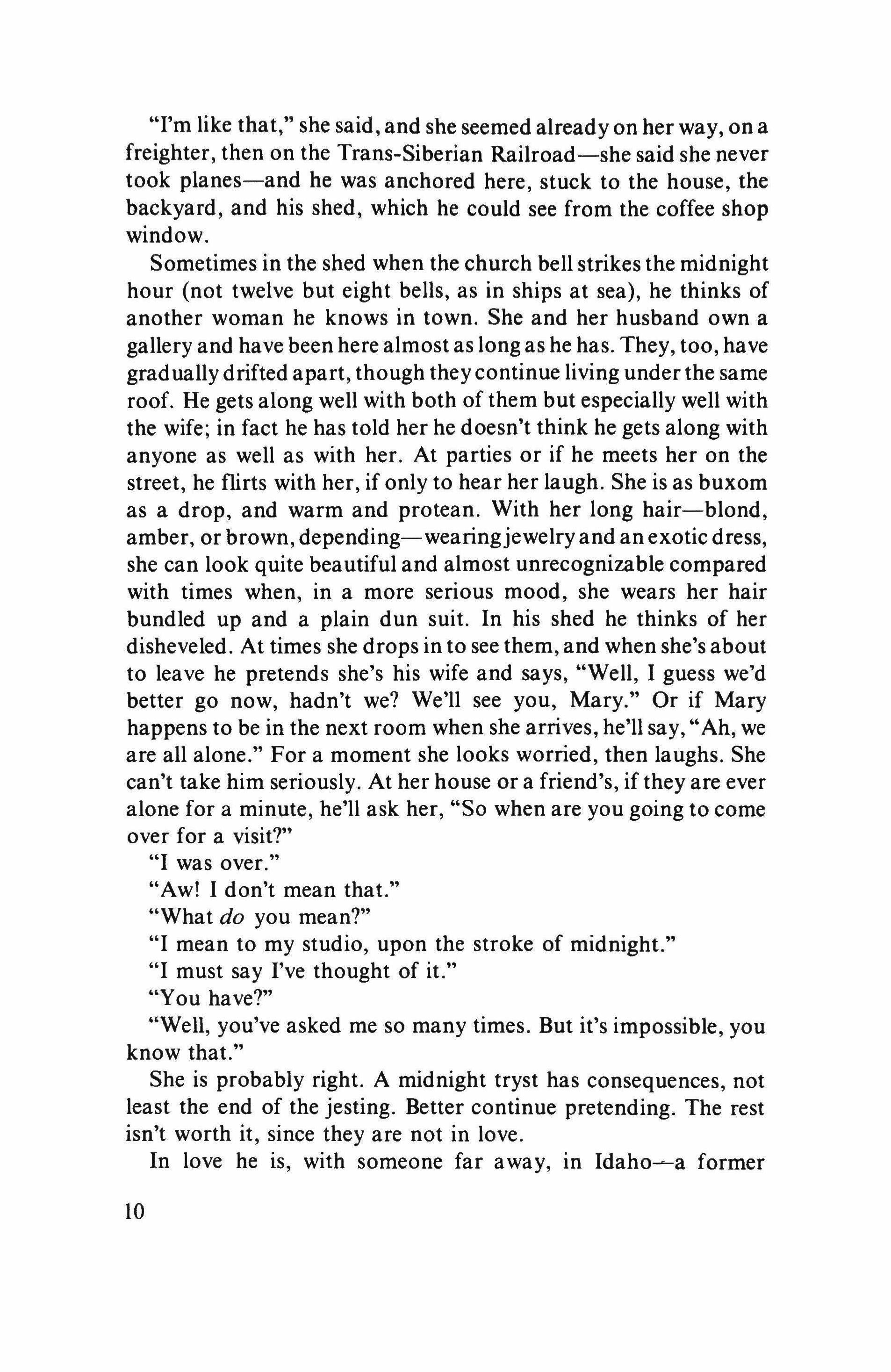 Sometimes in the shed when the church bell strikes the midnight hour (not twelve but eight bells, as in ships at sea), he thinks of another woman he knows in town. She and her husband own a gallery and have been here almost as long as he has. They, too, have gradually drifted apart, though they continue living under the same roof. He gets along well with both of them but especially well with the wife; in fact he has told her he doesn't think he gets along with anyone as well as with her. At parties or if he meets her on the street, he flirts with her, if only to hear her laugh. She is as buxom as a drop, and warm and protean. With her long hair-blond, amber, or brown, depending-wearingjewelry and an exotic dress, she can look quite beautiful and almost unrecognizable compared with times when, in a more serious mood, she wears her hair bundled up and a plain dun suit. In his shed he thinks of her disheveled. At times she drops in to see them, and when she's about to leave he pretends she's his wife and says, "Well, I guess we'd better go now, hadn't we? We'll see you, Mary." Or if Mary happens to be in the next room when she arrives, he'll say, "Ah, we are all alone." For a moment she looks worried, then laughs. She can't take him seriously. At her house or a friend's, if they are ever alone for a minute, he'll ask her, "So when are you going to come over for a visit?"
