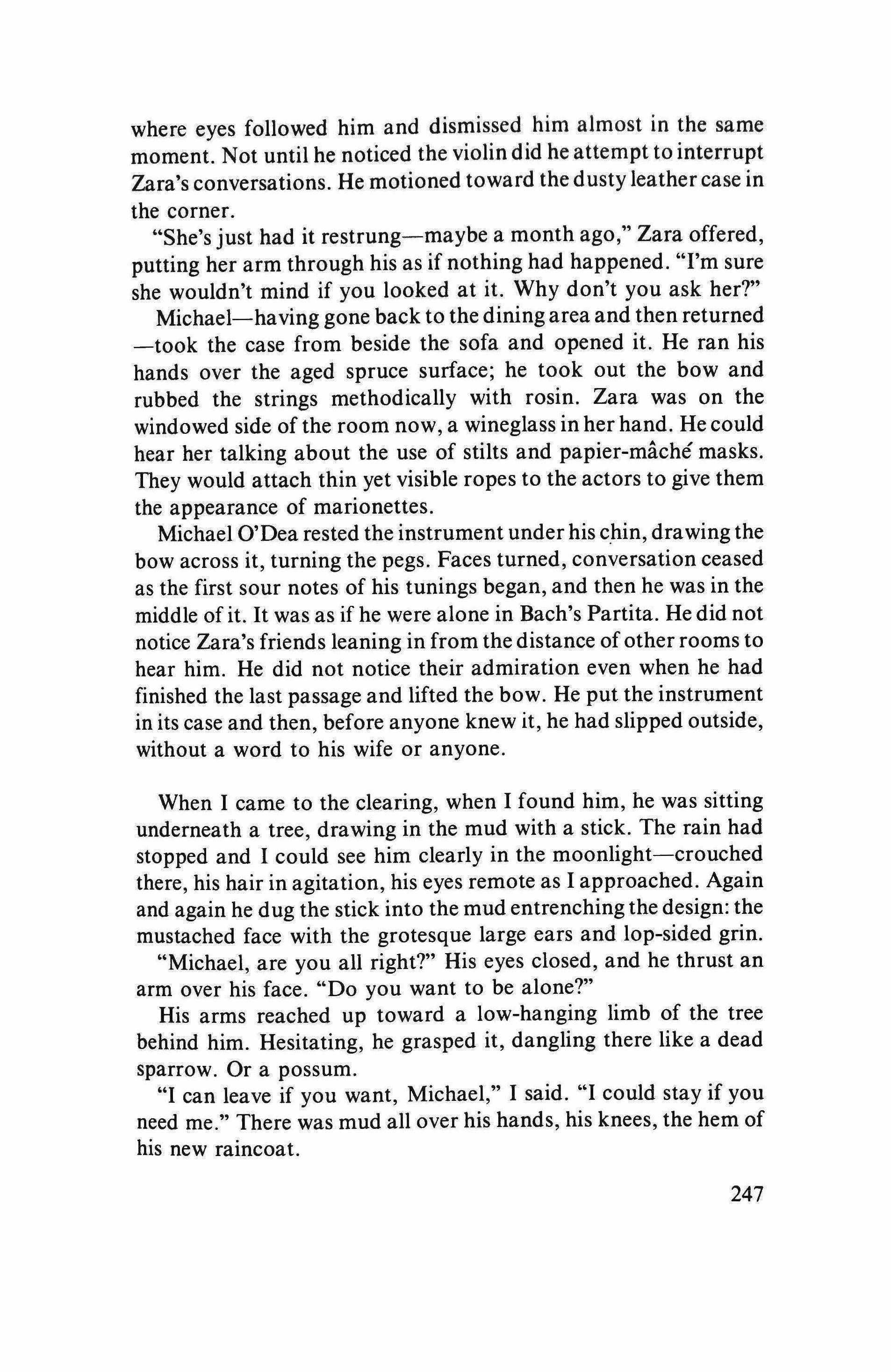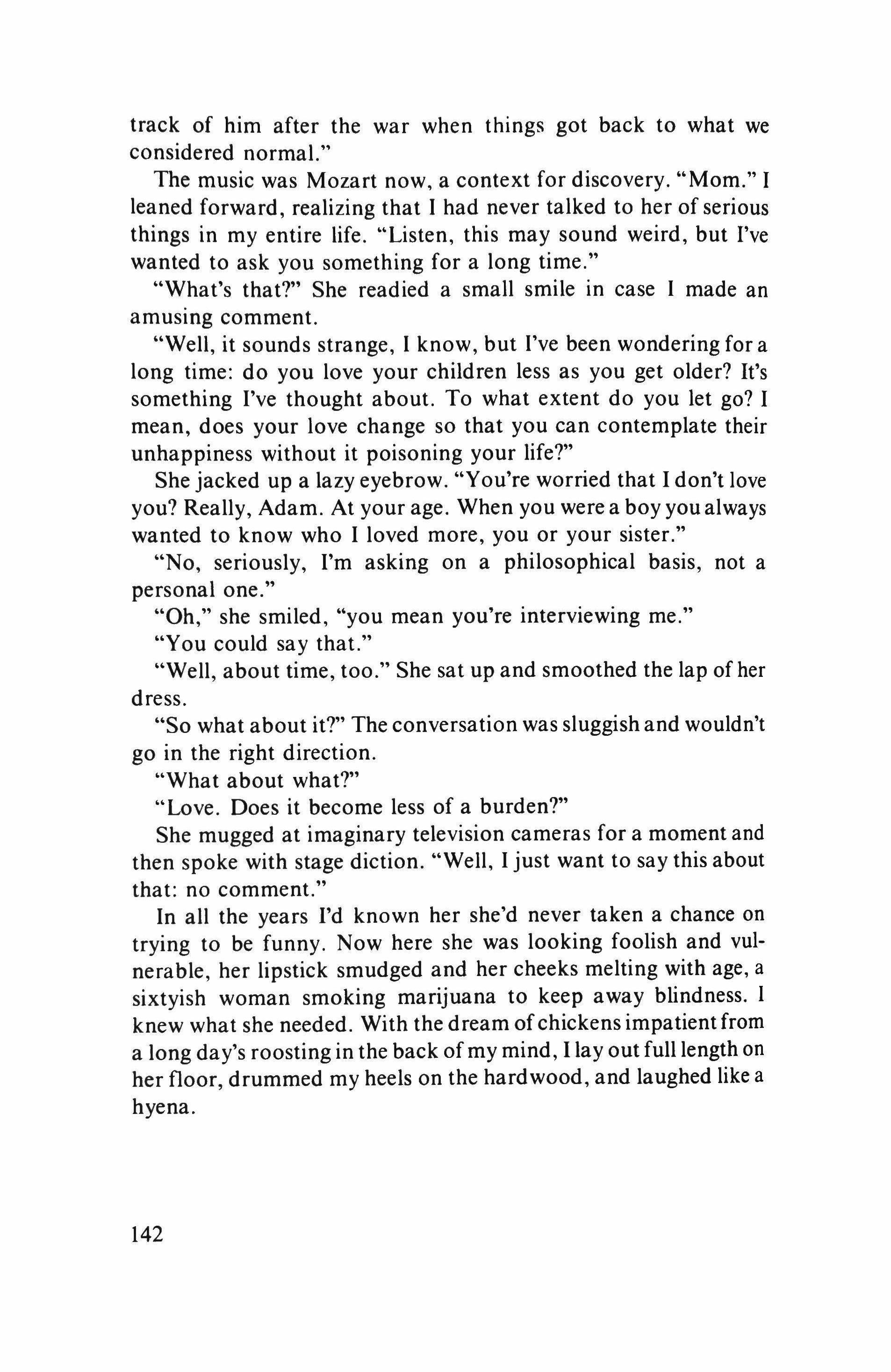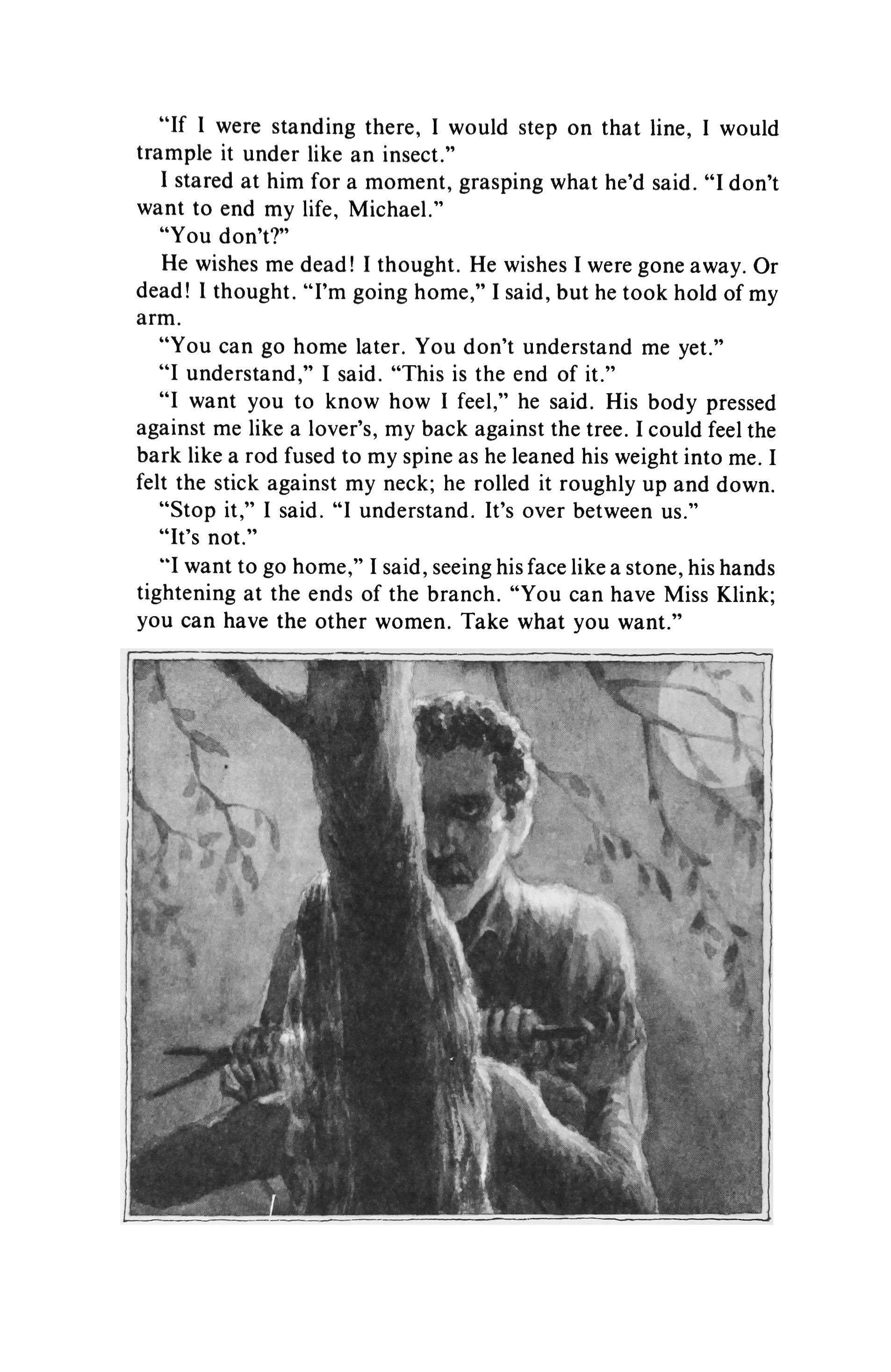 Sometimes in the shed when the church bell strikes the midnight hour (not twelve but eight bells, as in ships at sea), he thinks of another woman he knows in town. She and her husband own a gallery and have been here almost as long as he has. They, too, have gradually drifted apart, though they continue living under the same roof. He gets along well with both of them but especially well with the wife; in fact he has told her he doesn't think he gets along with anyone as well as with her. At parties or if he meets her on the street, he flirts with her, if only to hear her laugh. She is as buxom as a drop, and warm and protean. With her long hair-blond, amber, or brown, depending-wearingjewelry and an exotic dress, she can look quite beautiful and almost unrecognizable compared with times when, in a more serious mood, she wears her hair bundled up and a plain dun suit. In his shed he thinks of her disheveled. At times she drops in to see them, and when she's about to leave he pretends she's his wife and says, "Well, I guess we'd better go now, hadn't we? We'll see you, Mary." Or if Mary happens to be in the next room when she arrives, he'll say, "Ah, we are all alone." For a moment she looks worried, then laughs. She can't take him seriously. At her house or a friend's, if they are ever alone for a minute, he'll ask her, "So when are you going to come over for a visit?"