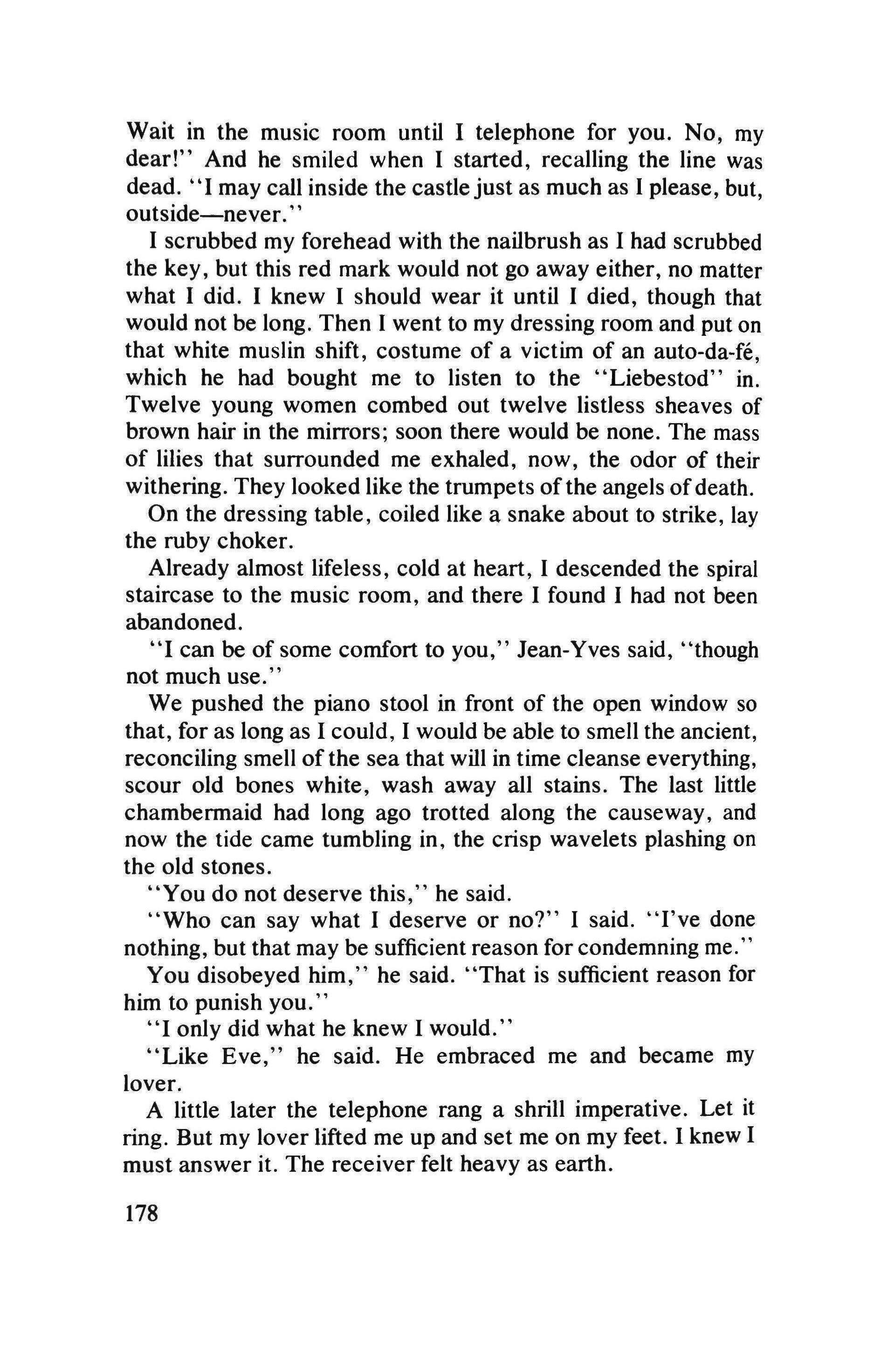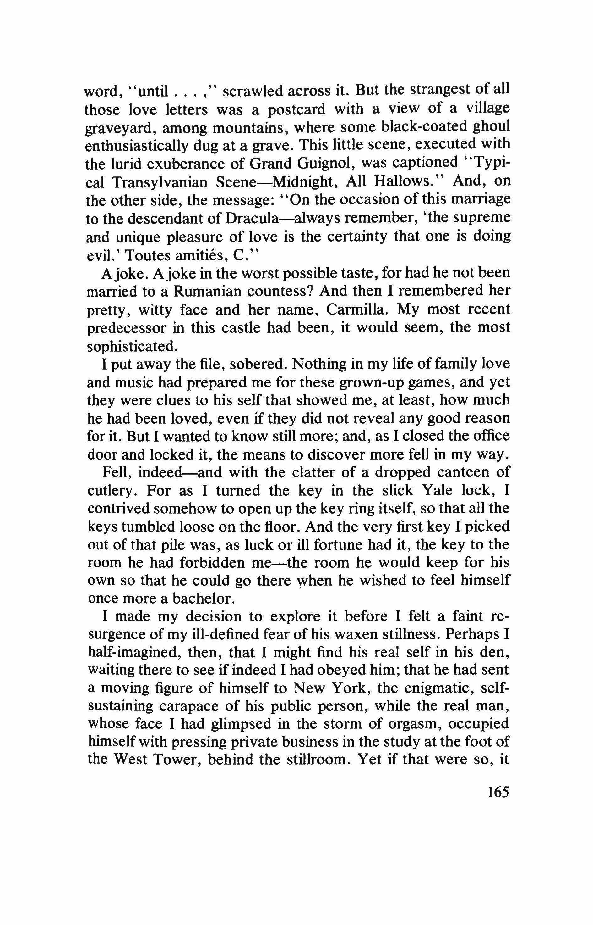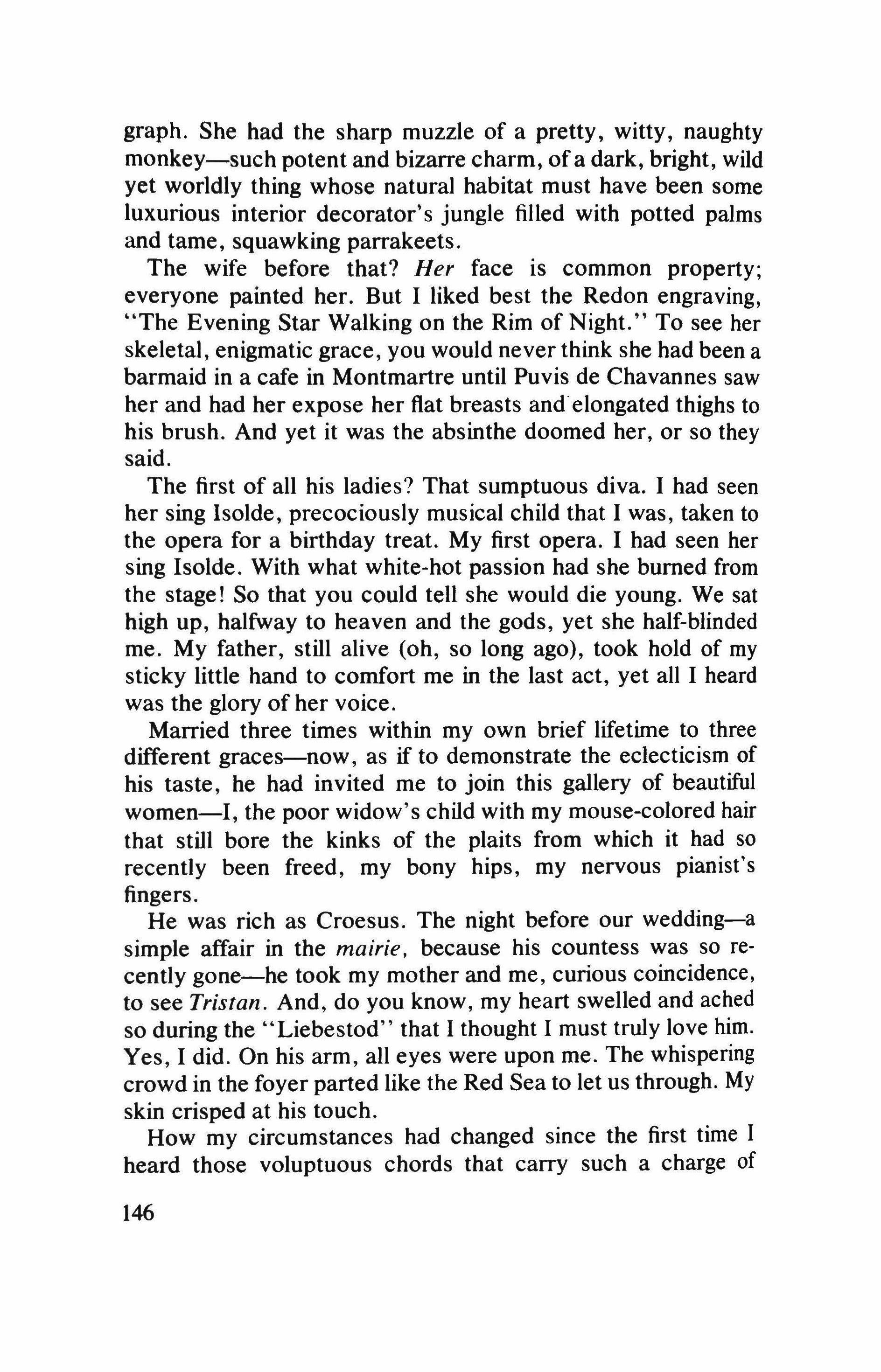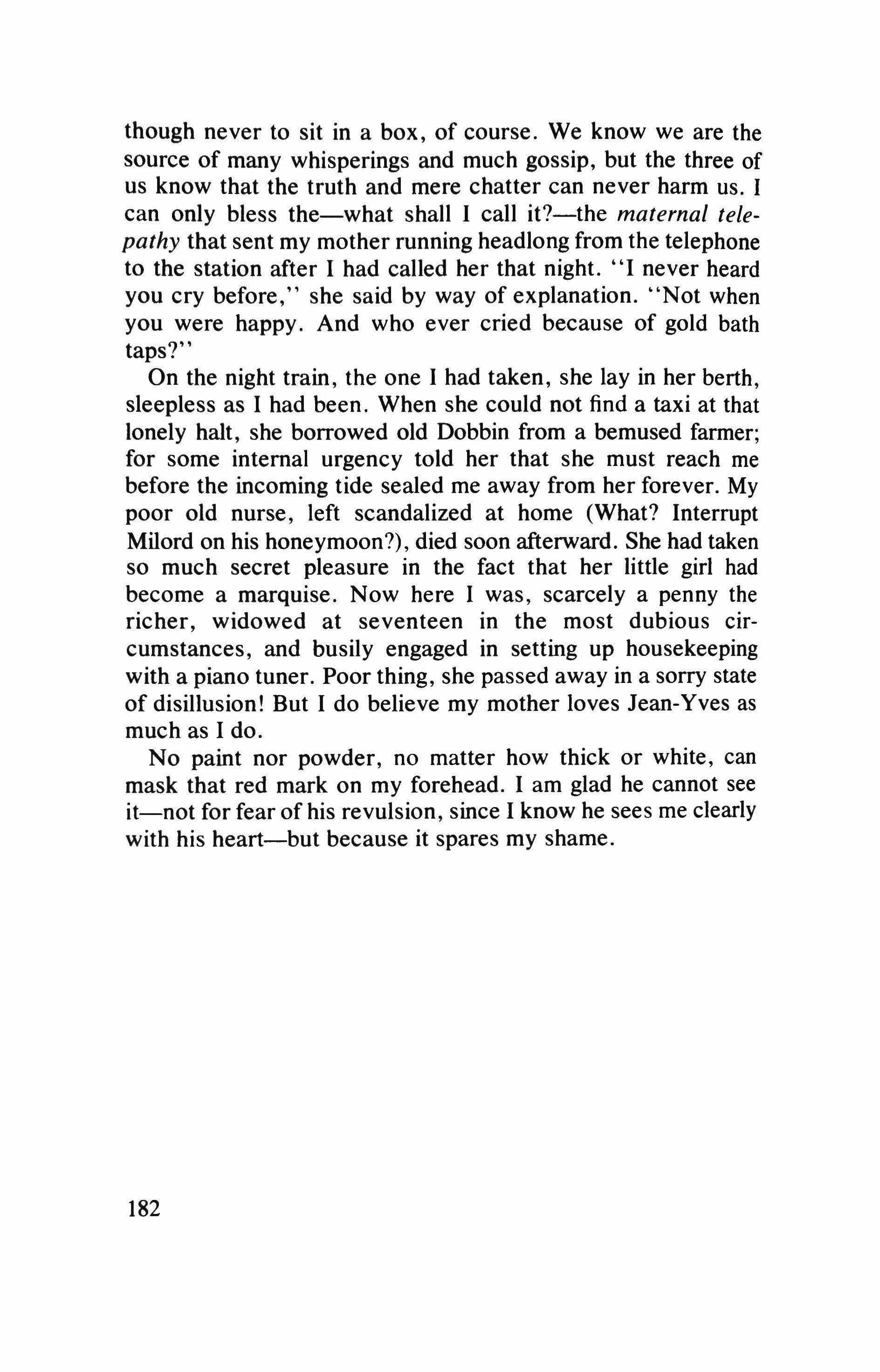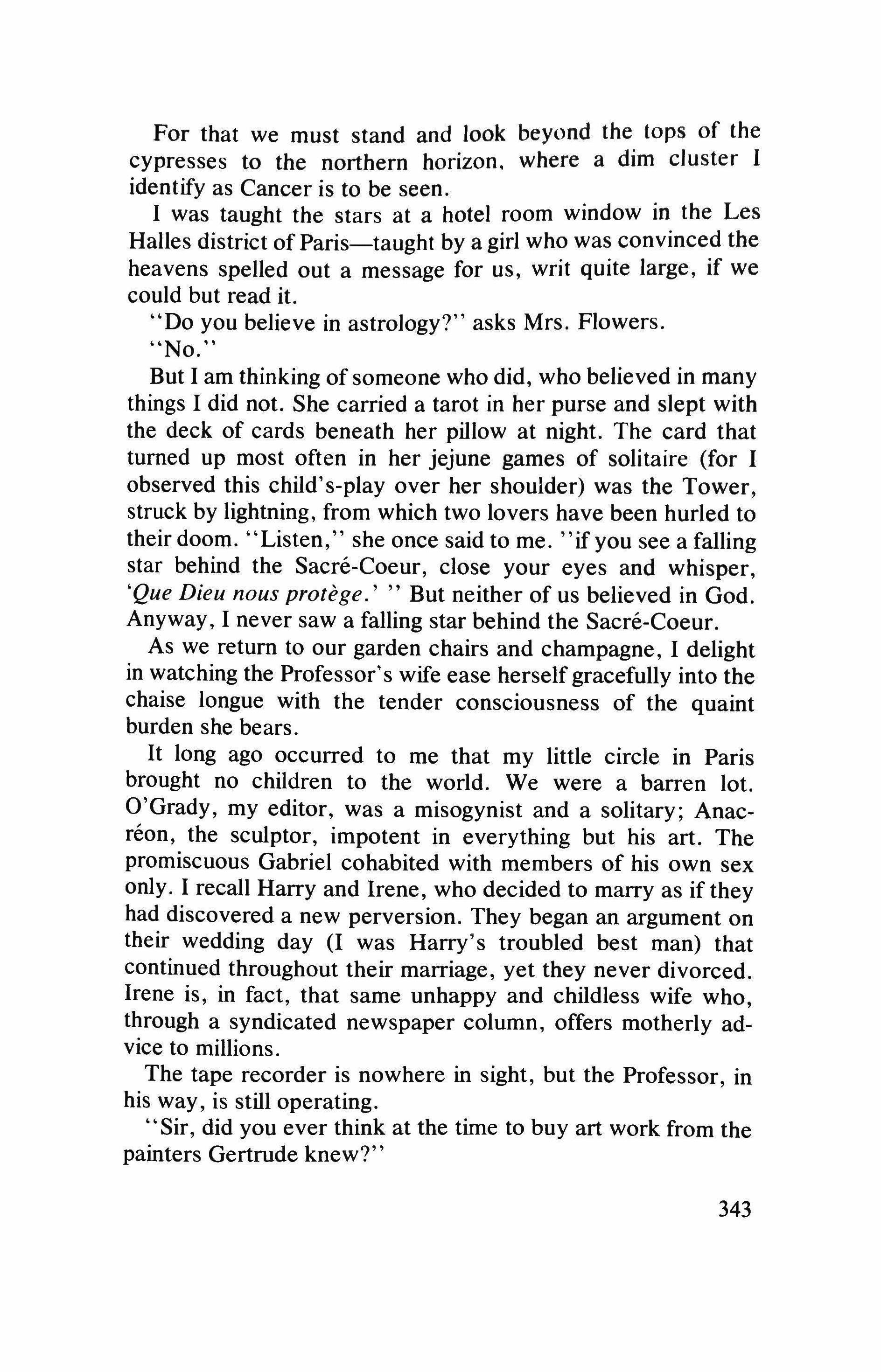 But 1 am thinking of someone who did, who believed in many things 1 did not. She carried a tarot in her purse and slept with the deck of cards beneath her pillow at night. The card that turned up most often in her jejune games of solitaire (for I observed this child's-play over her shoulder) was the Tower, struck by lightning, from which two lovers have been hurled to their doom. "Listen," she once said to me. "if you see a falling star behind the Sacre-Coeur, close your eyes and Whisper, 'Que Dieu nous protege.' But neither of us believed in God. Anyway, 1 never saw a falling star behind the Sacre-Coeur.