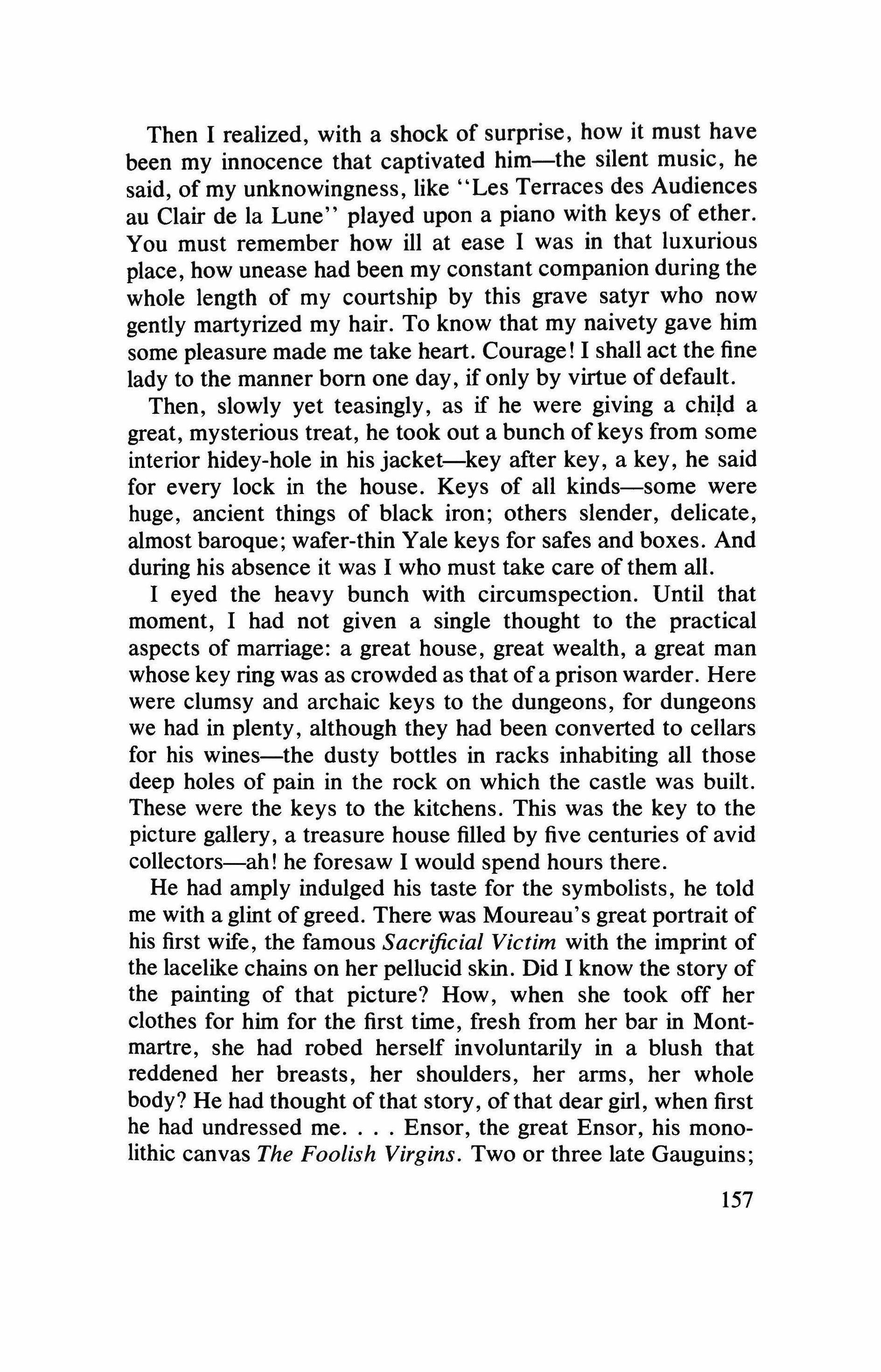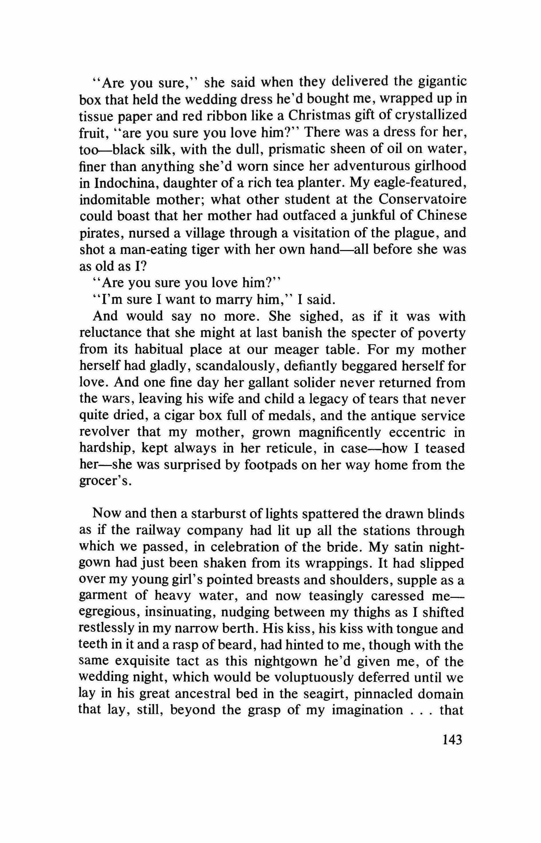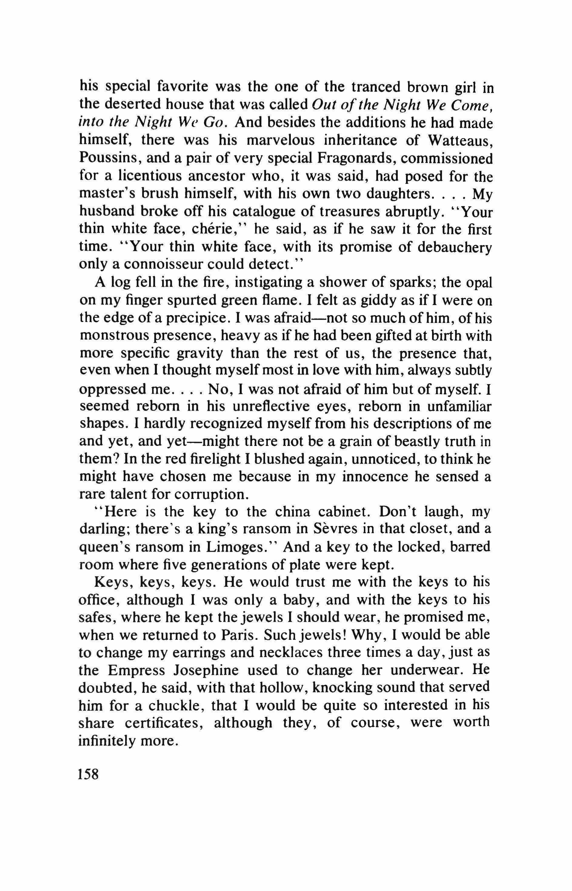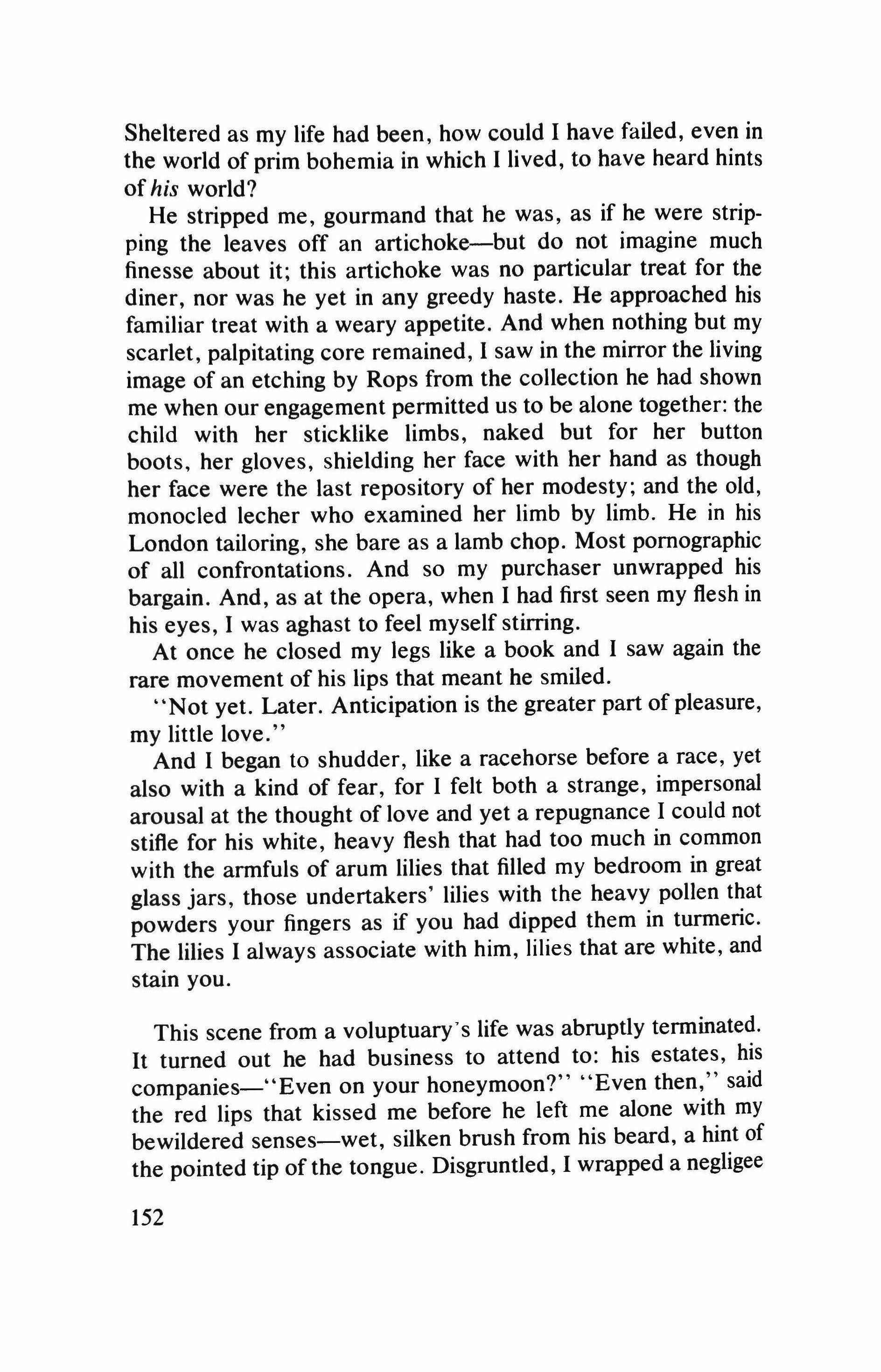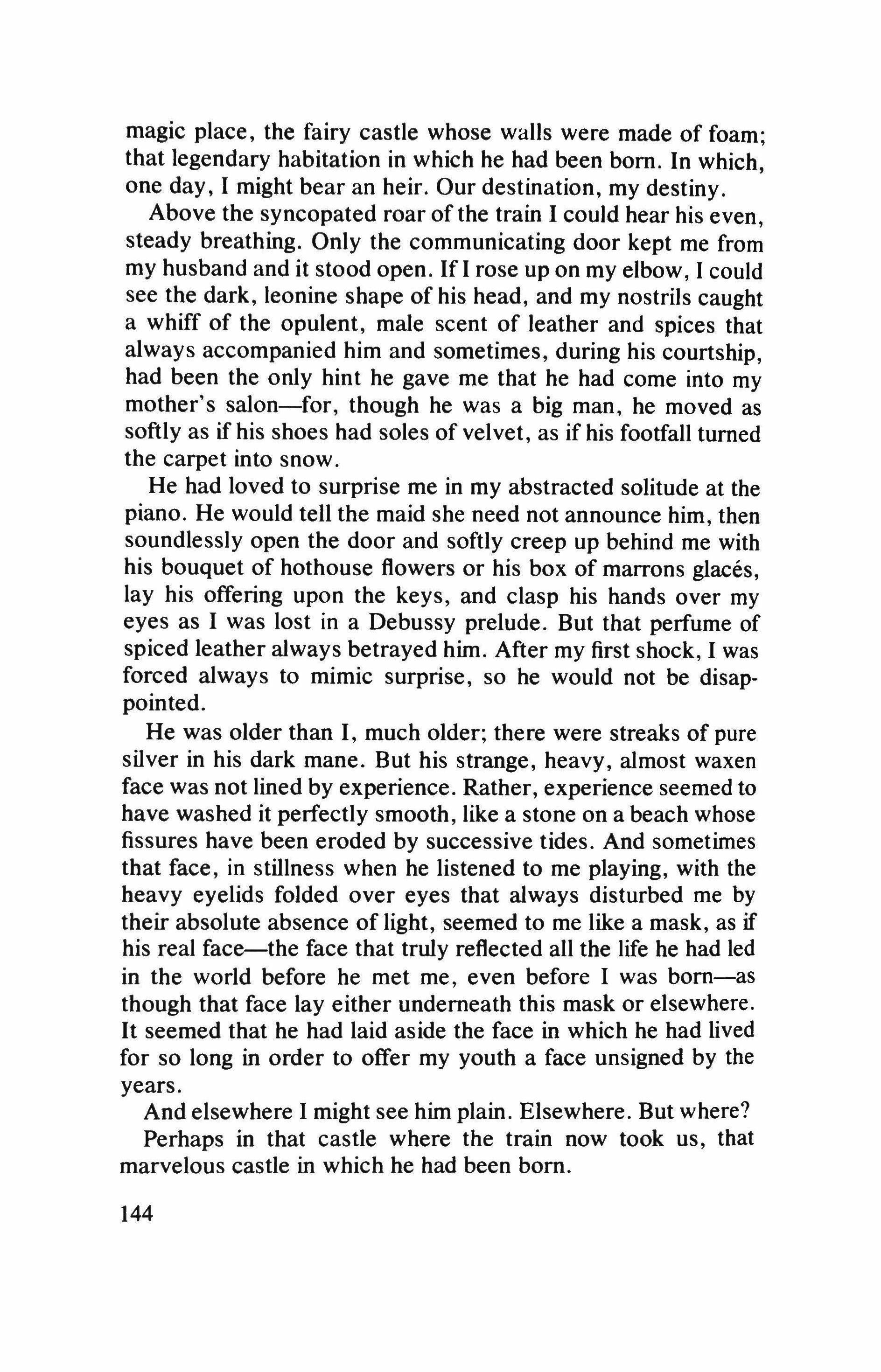 But 1 am thinking of someone who did, who believed in many things 1 did not. She carried a tarot in her purse and slept with the deck of cards beneath her pillow at night. The card that turned up most often in her jejune games of solitaire (for I observed this child's-play over her shoulder) was the Tower, struck by lightning, from which two lovers have been hurled to their doom. "Listen," she once said to me. "if you see a falling star behind the Sacre-Coeur, close your eyes and Whisper, 'Que Dieu nous protege.' But neither of us believed in God. Anyway, 1 never saw a falling star behind the Sacre-Coeur.