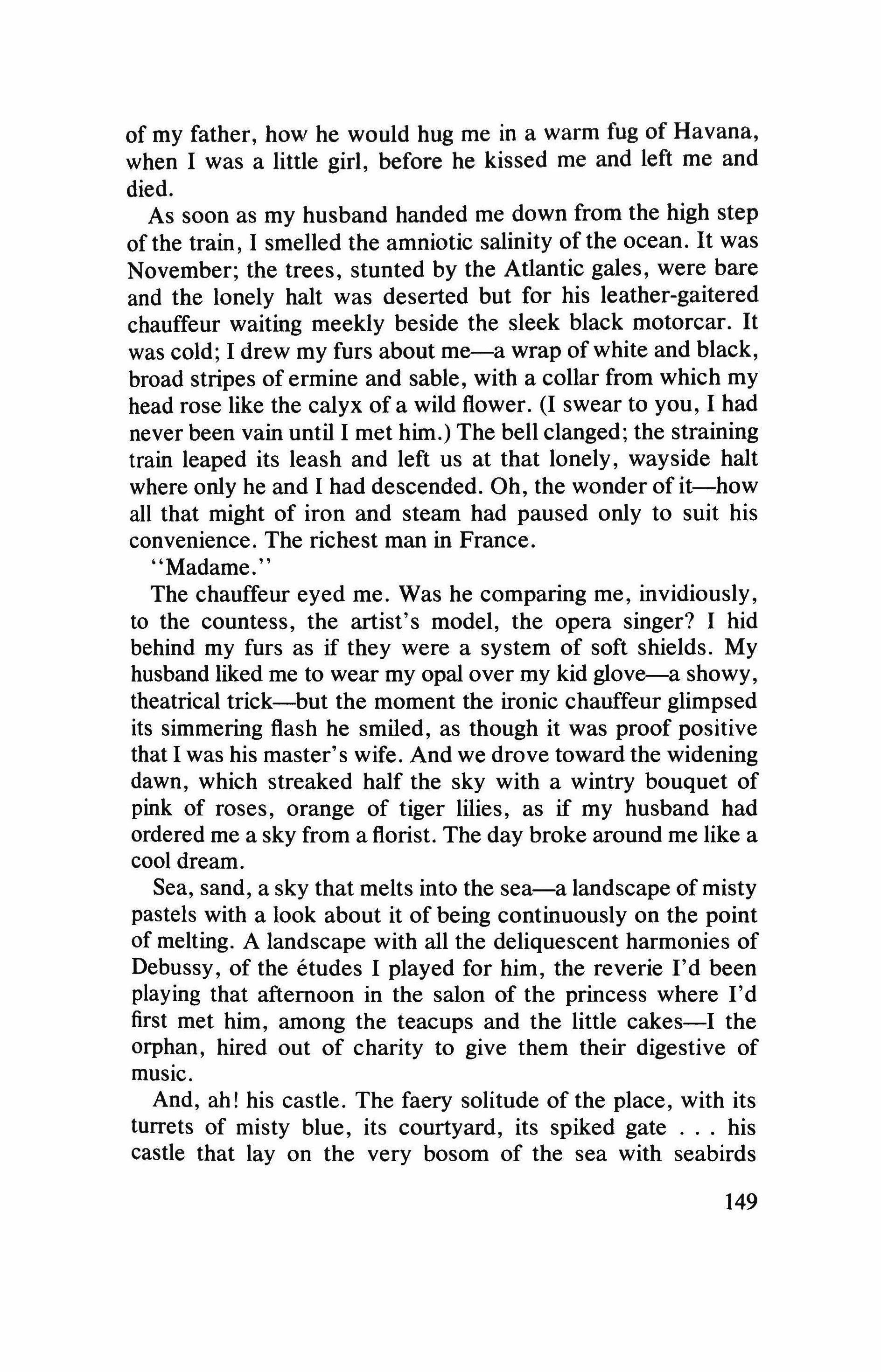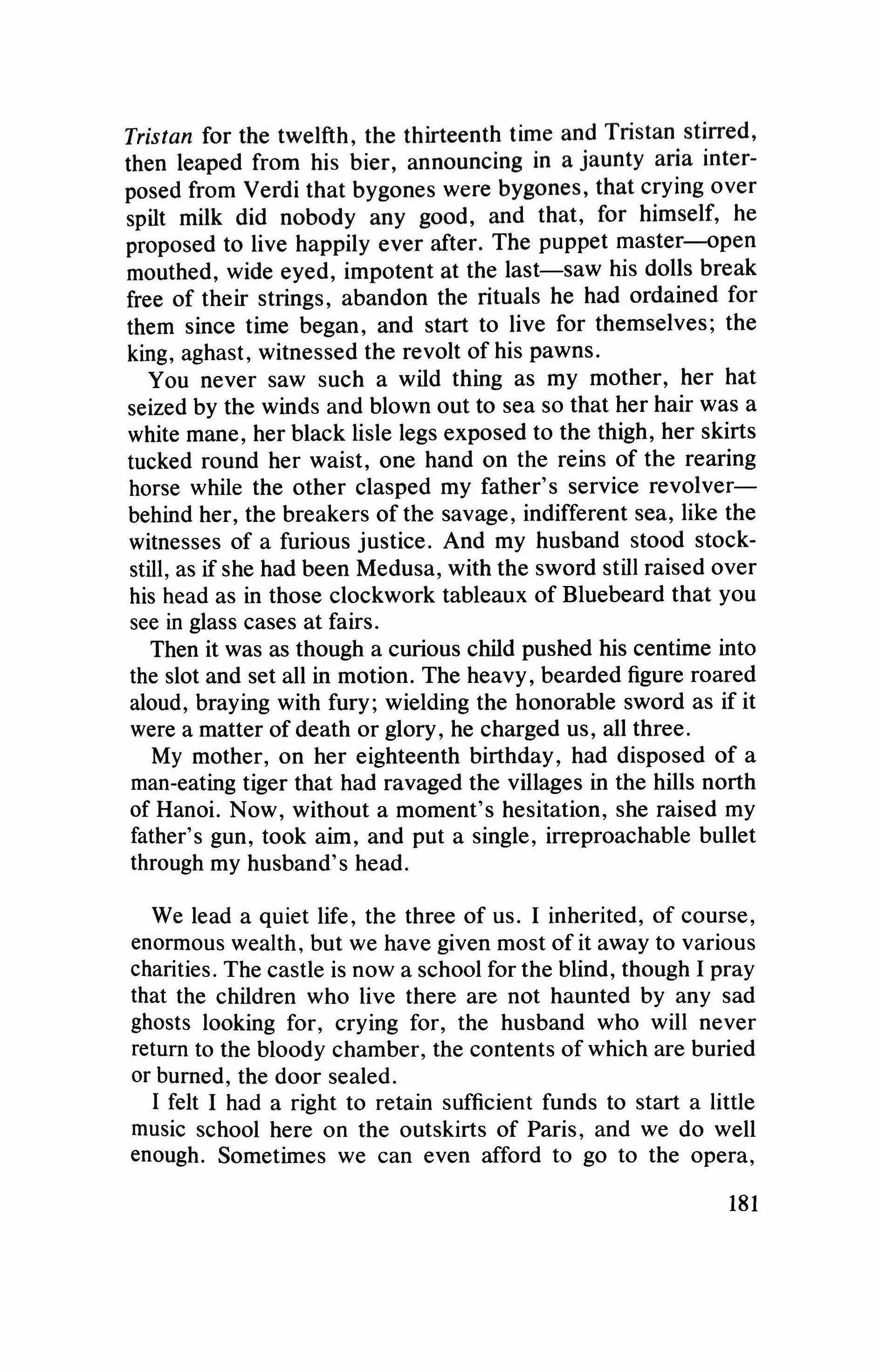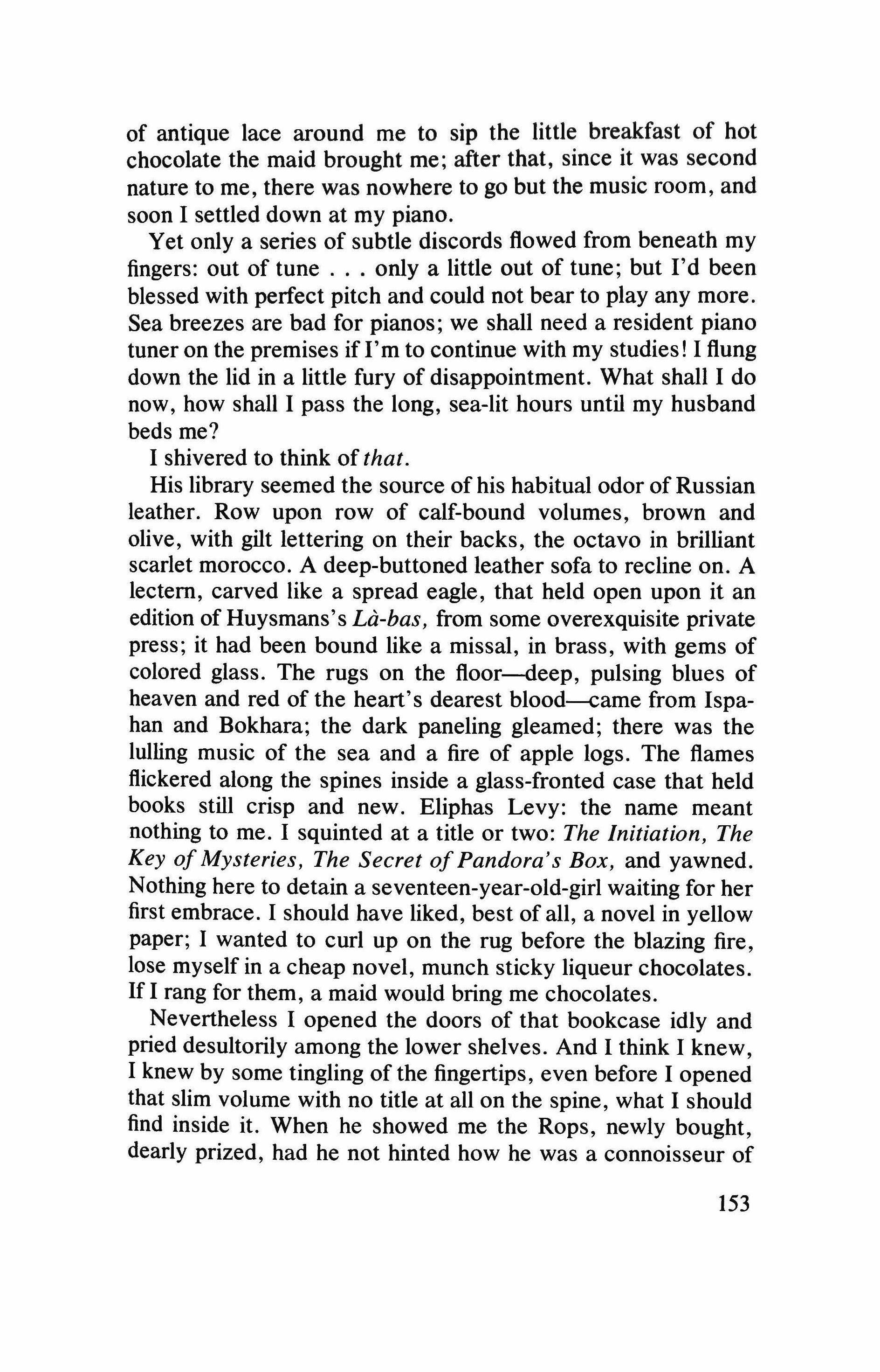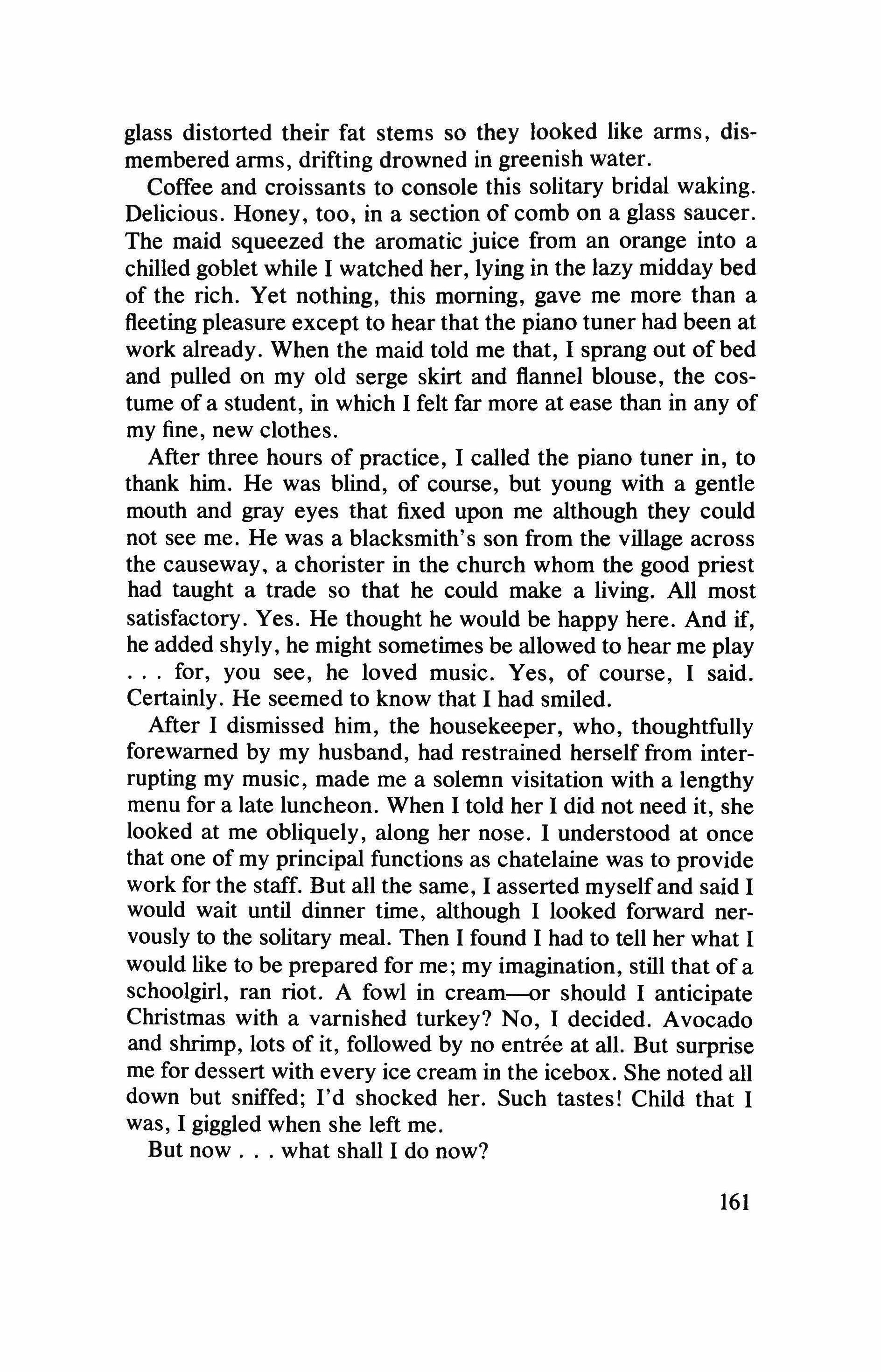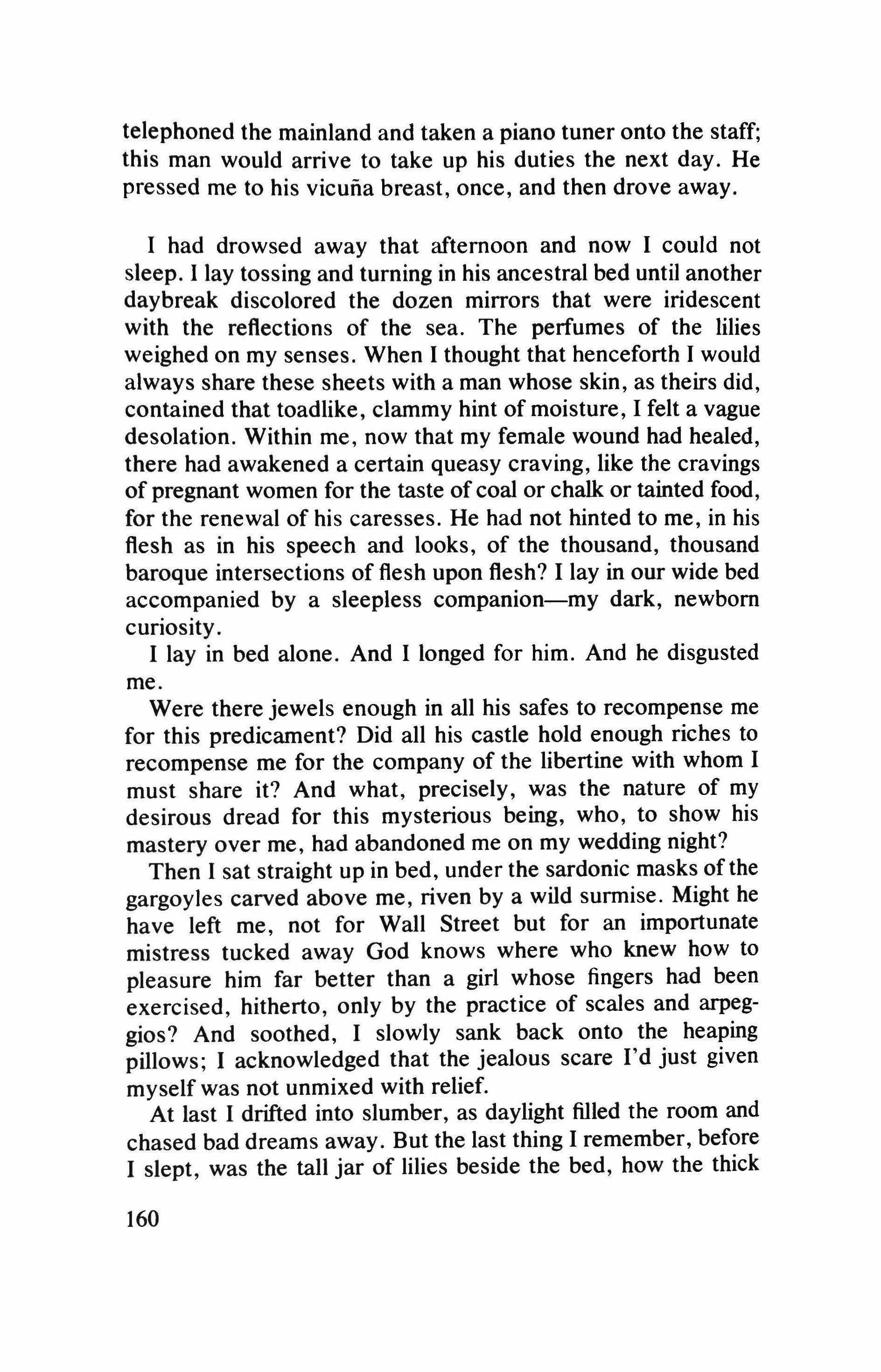 But 1 am thinking of someone who did, who believed in many things 1 did not. She carried a tarot in her purse and slept with the deck of cards beneath her pillow at night. The card that turned up most often in her jejune games of solitaire (for I observed this child's-play over her shoulder) was the Tower, struck by lightning, from which two lovers have been hurled to their doom. "Listen," she once said to me. "if you see a falling star behind the Sacre-Coeur, close your eyes and Whisper, 'Que Dieu nous protege.' But neither of us believed in God. Anyway, 1 never saw a falling star behind the Sacre-Coeur.