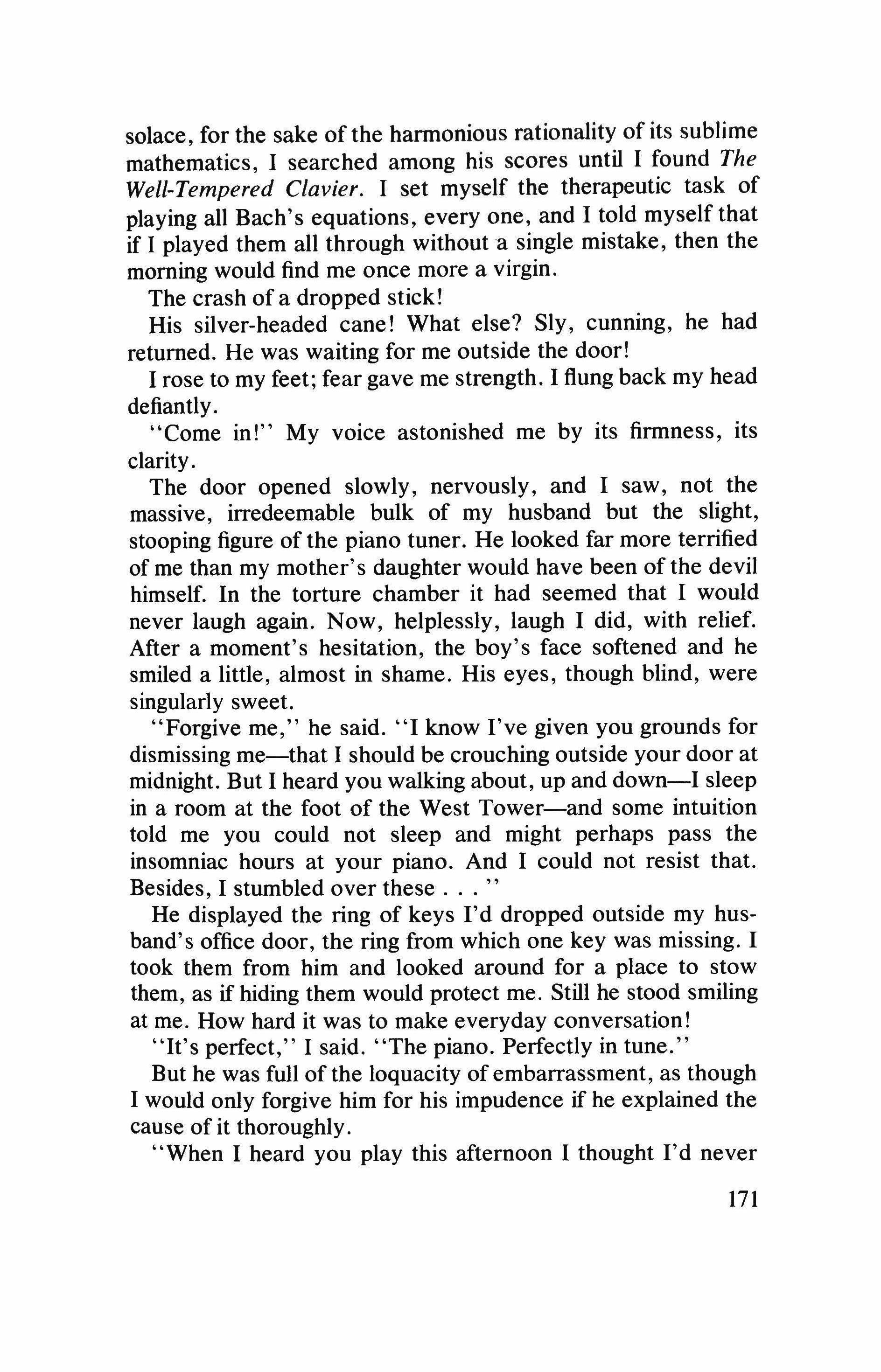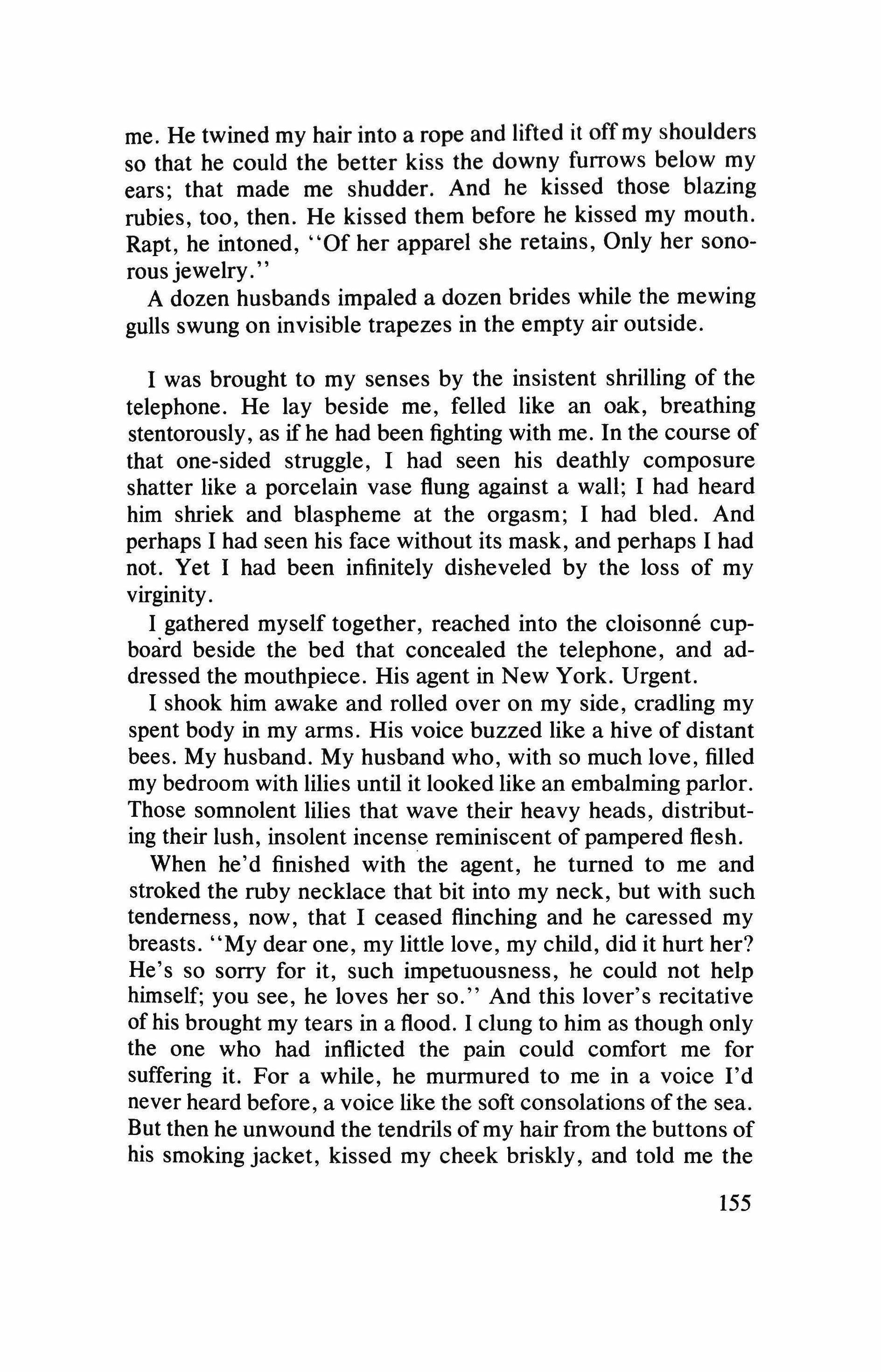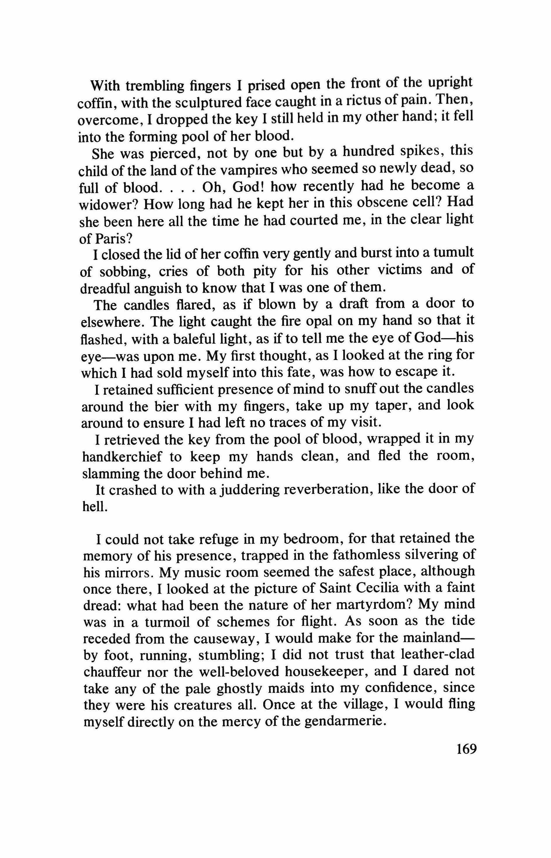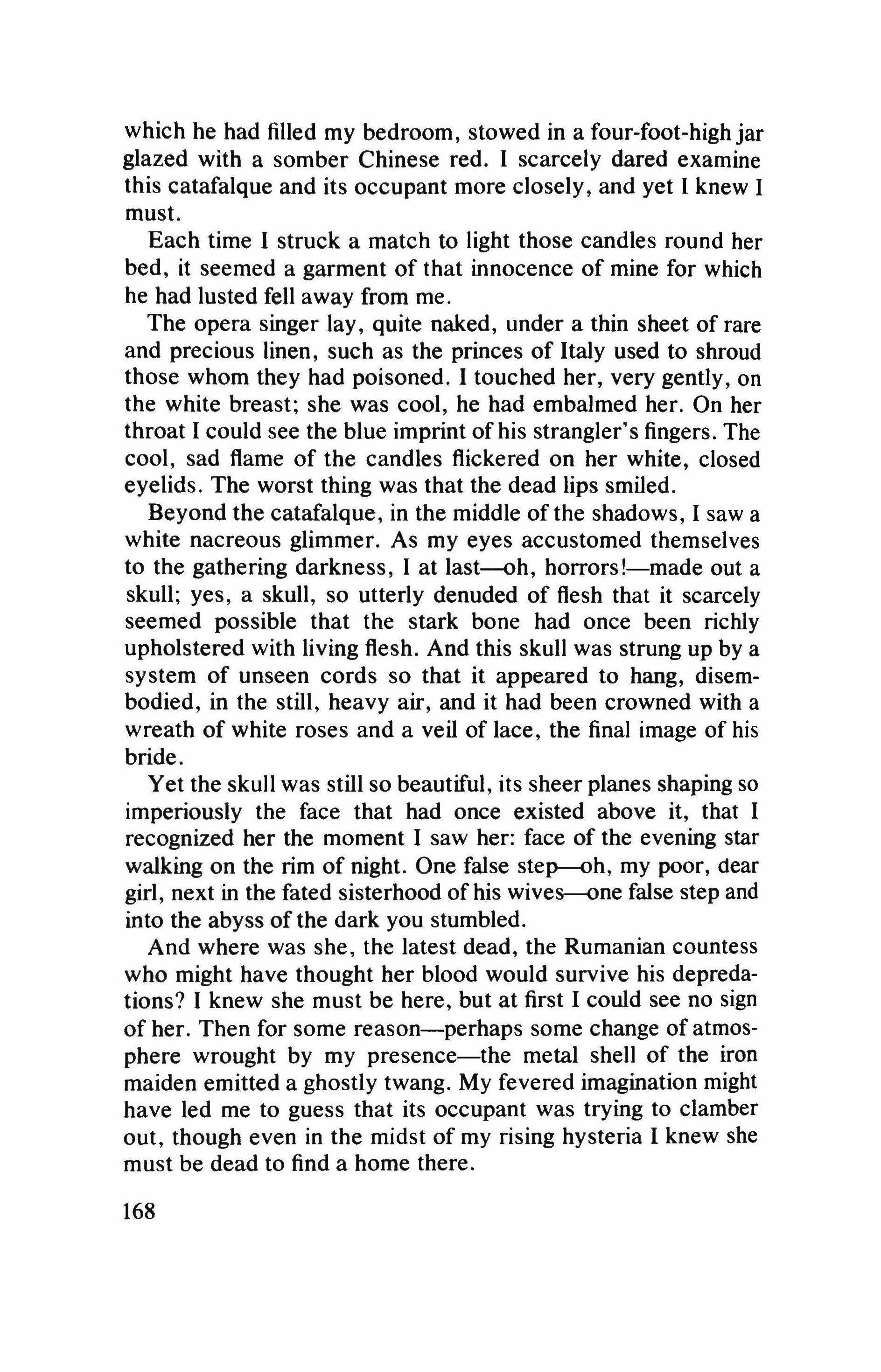 But 1 am thinking of someone who did, who believed in many things 1 did not. She carried a tarot in her purse and slept with the deck of cards beneath her pillow at night. The card that turned up most often in her jejune games of solitaire (for I observed this child's-play over her shoulder) was the Tower, struck by lightning, from which two lovers have been hurled to their doom. "Listen," she once said to me. "if you see a falling star behind the Sacre-Coeur, close your eyes and Whisper, 'Que Dieu nous protege.' But neither of us believed in God. Anyway, 1 never saw a falling star behind the Sacre-Coeur.