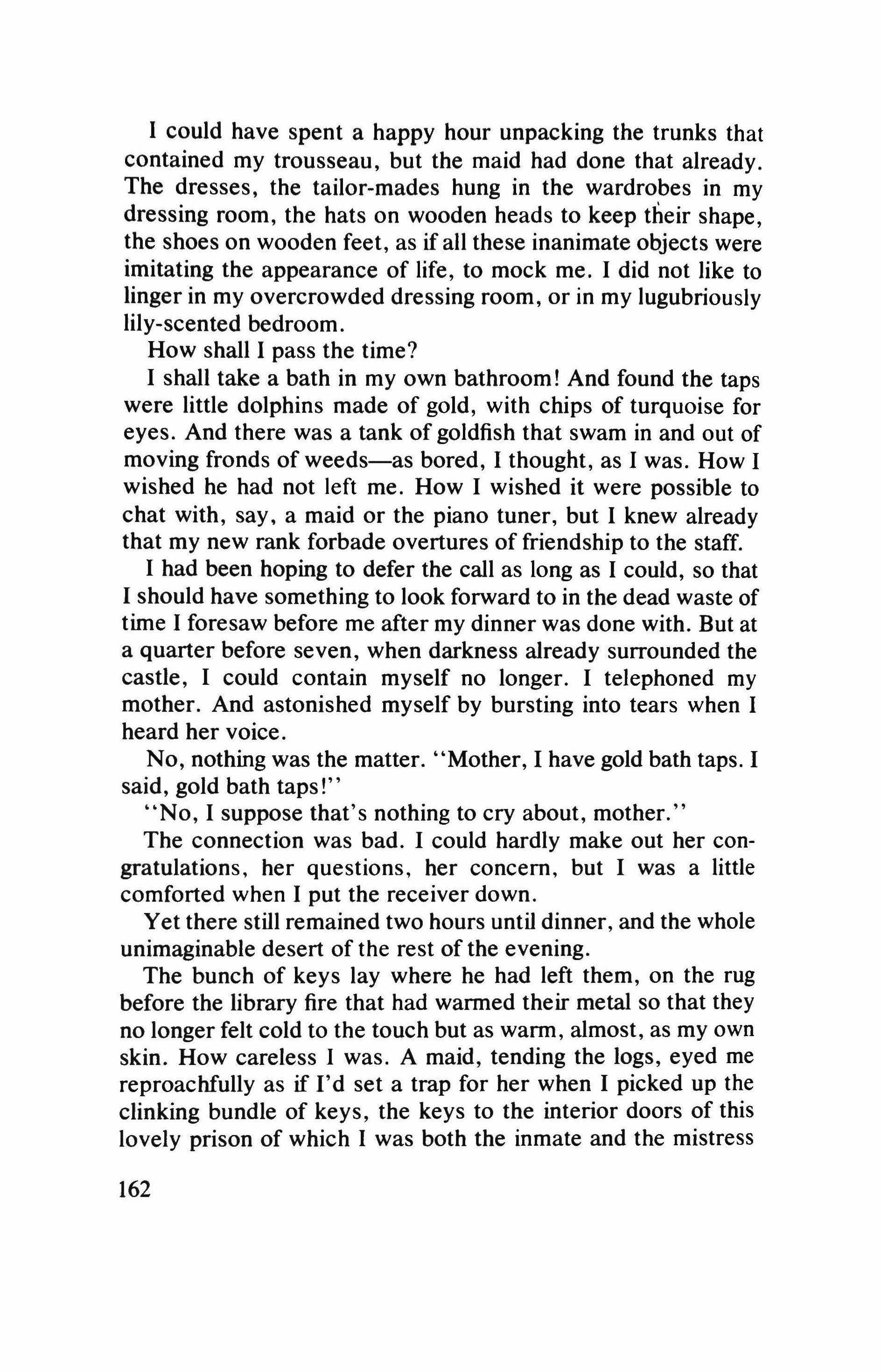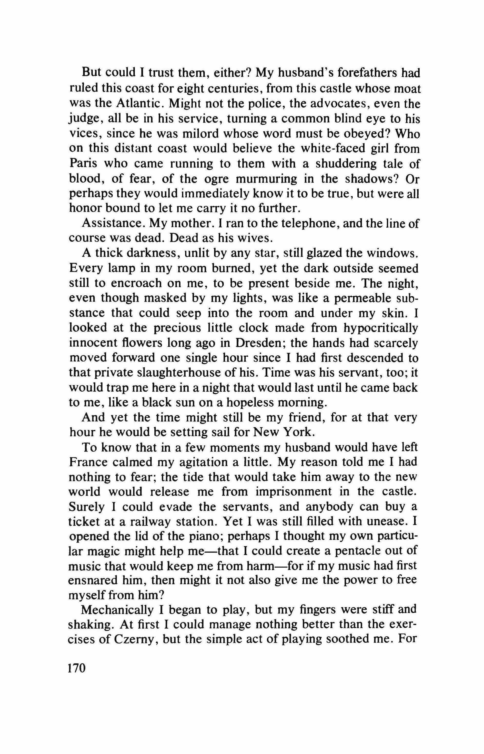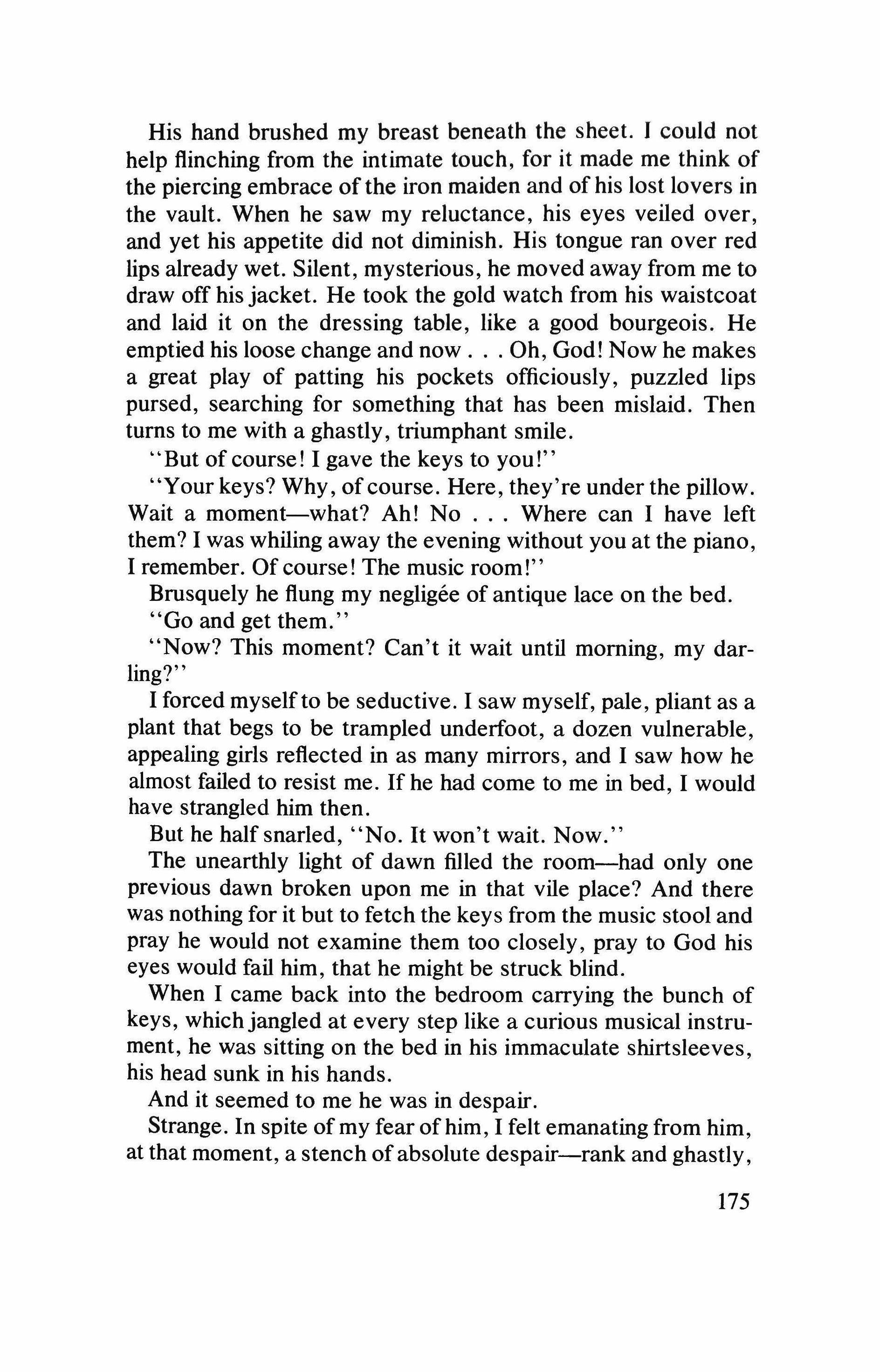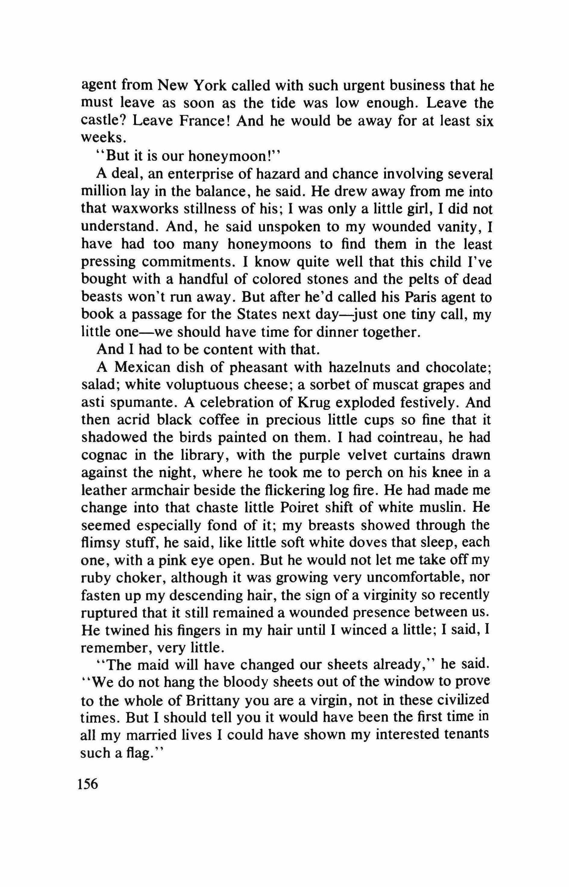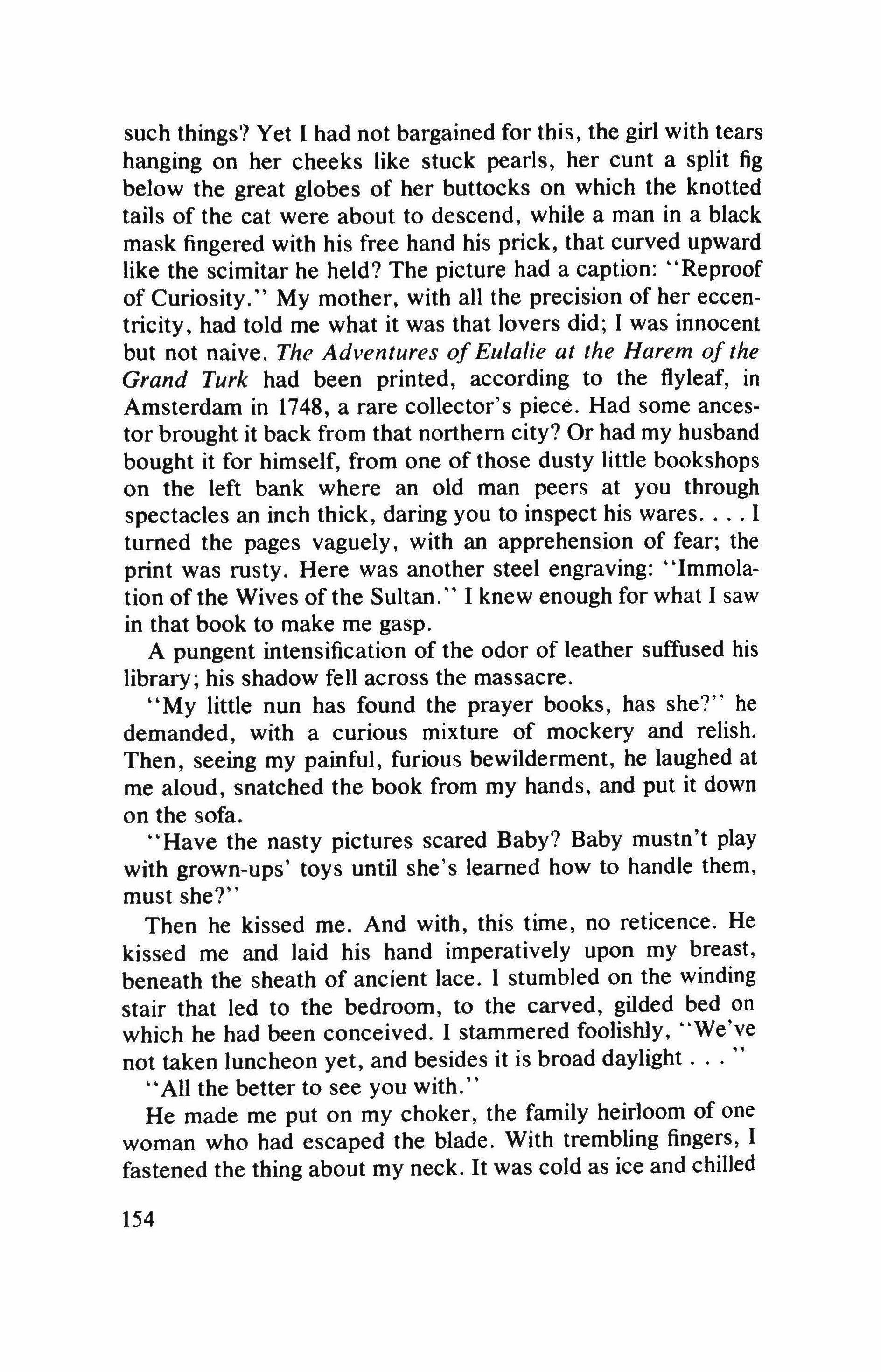But 1 am thinking of someone who did, who believed in many things 1 did not. She carried a tarot in her purse and slept with the deck of cards beneath her pillow at night. The card that turned up most often in her jejune games of solitaire (for I observed this child's-play over her shoulder) was the Tower, struck by lightning, from which two lovers have been hurled to their doom. "Listen," she once said to me. "if you see a falling star behind the Sacre-Coeur, close your eyes and Whisper, 'Que Dieu nous protege.' But neither of us believed in God. Anyway, 1 never saw a falling star behind the Sacre-Coeur.