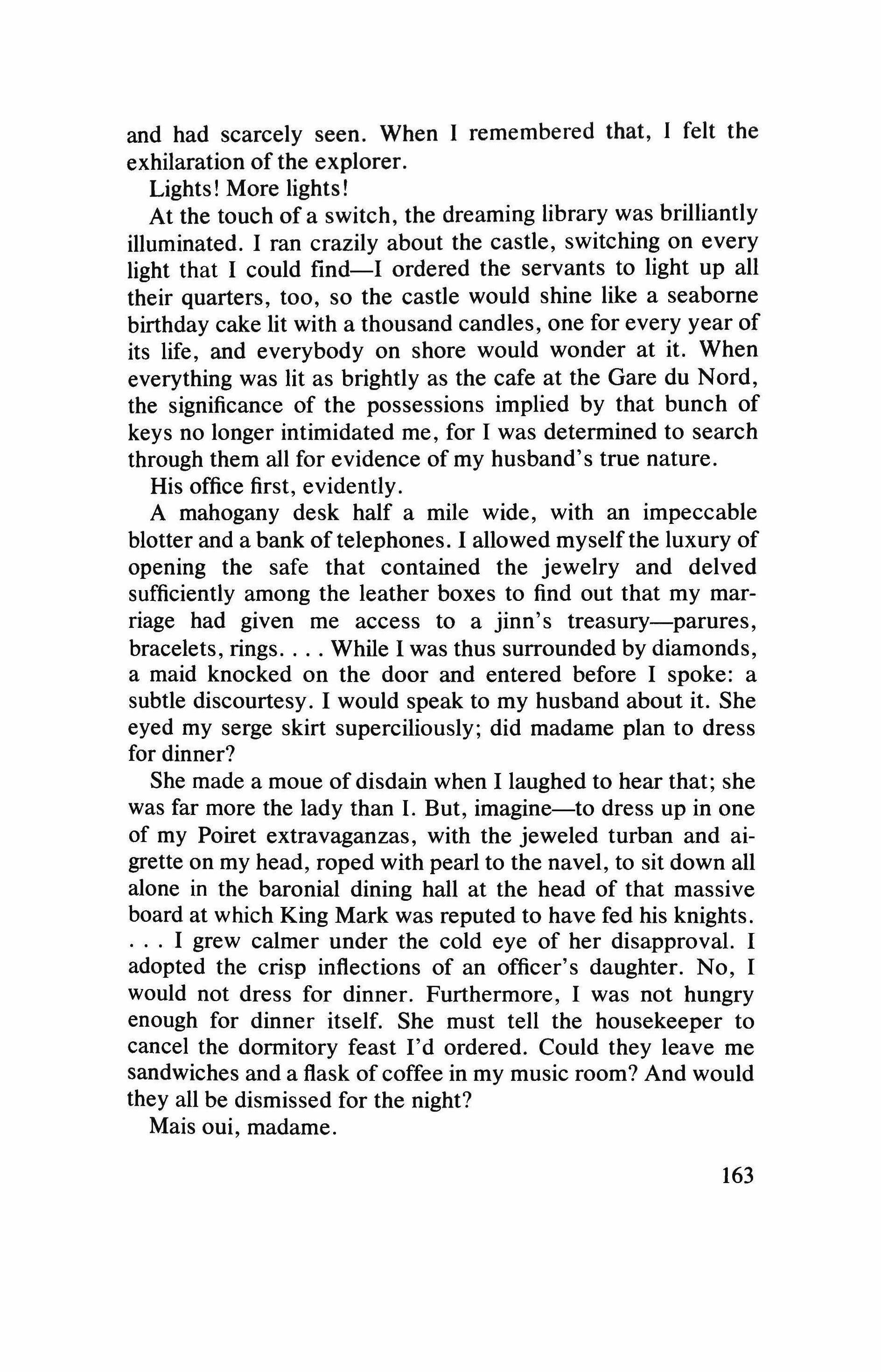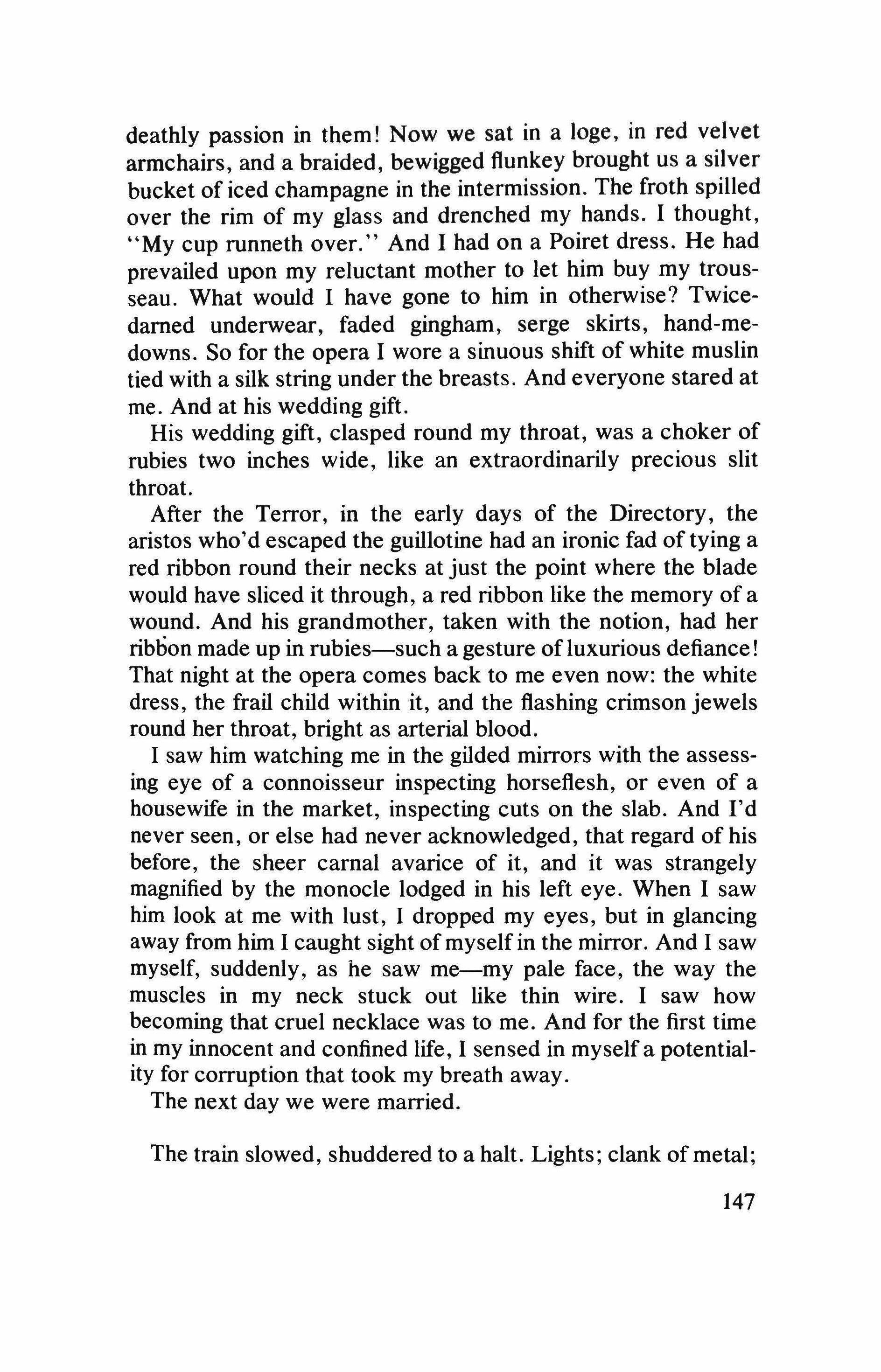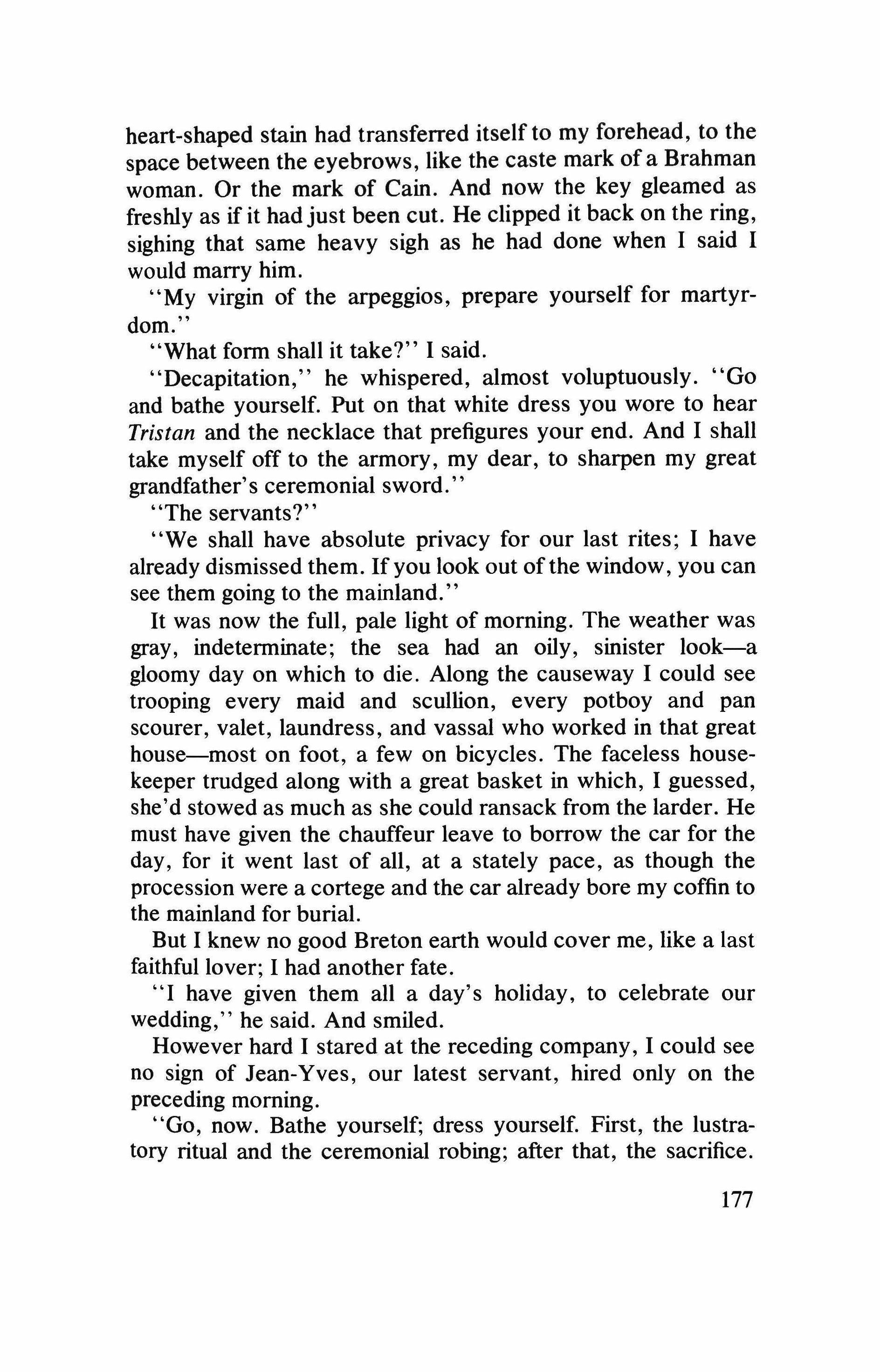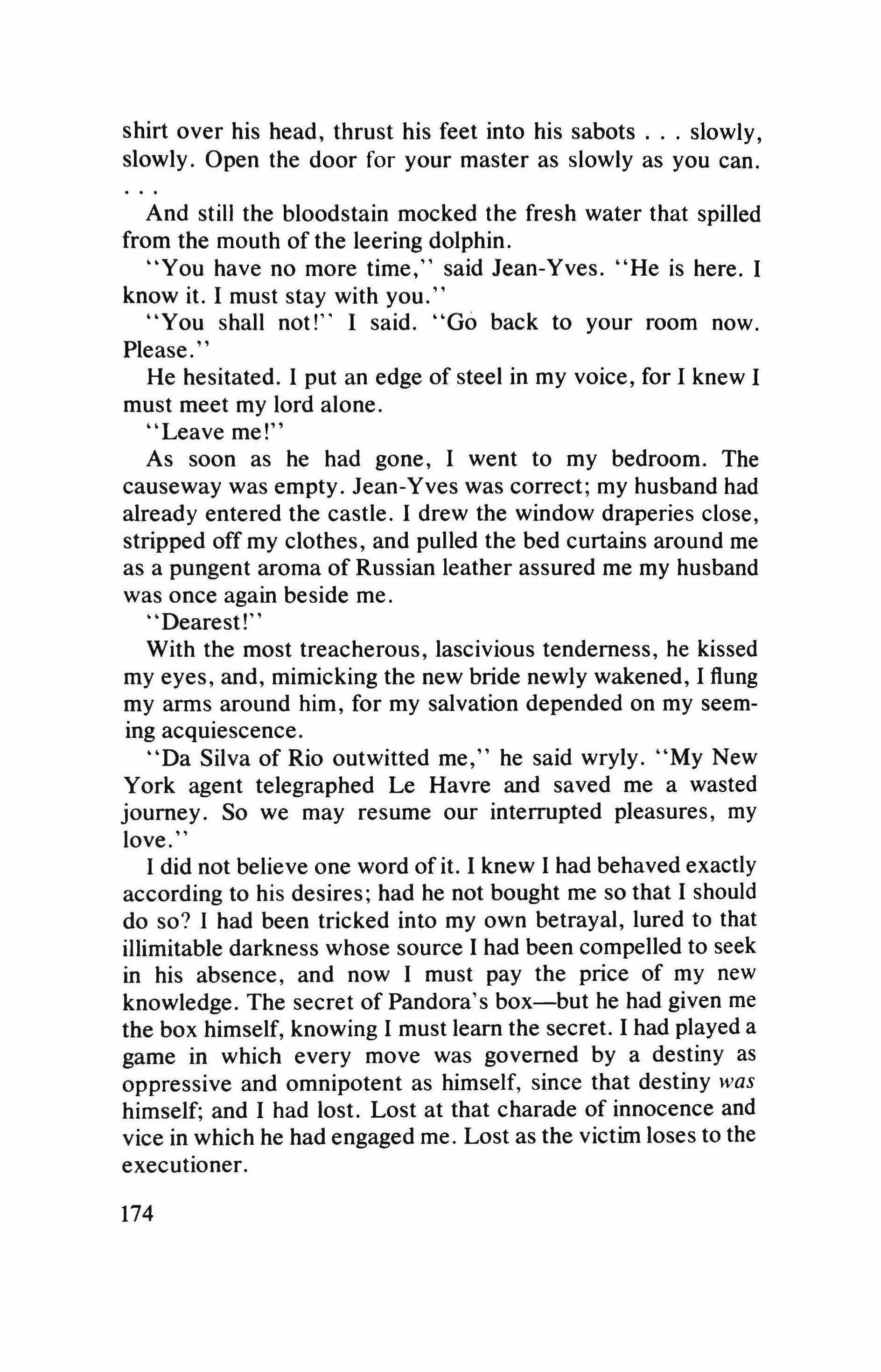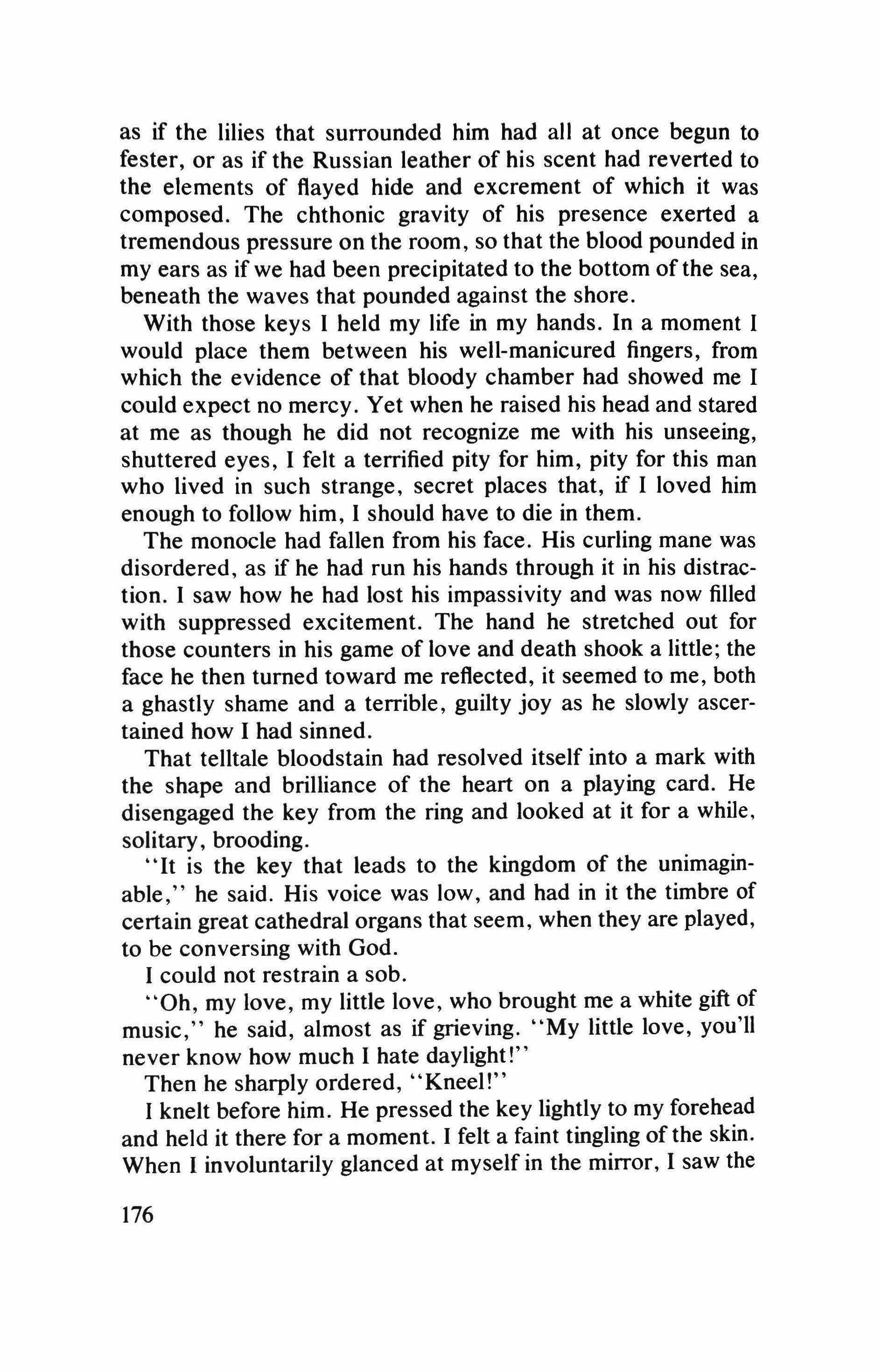 But 1 am thinking of someone who did, who believed in many things 1 did not. She carried a tarot in her purse and slept with the deck of cards beneath her pillow at night. The card that turned up most often in her jejune games of solitaire (for I observed this child's-play over her shoulder) was the Tower, struck by lightning, from which two lovers have been hurled to their doom. "Listen," she once said to me. "if you see a falling star behind the Sacre-Coeur, close your eyes and Whisper, 'Que Dieu nous protege.' But neither of us believed in God. Anyway, 1 never saw a falling star behind the Sacre-Coeur.
