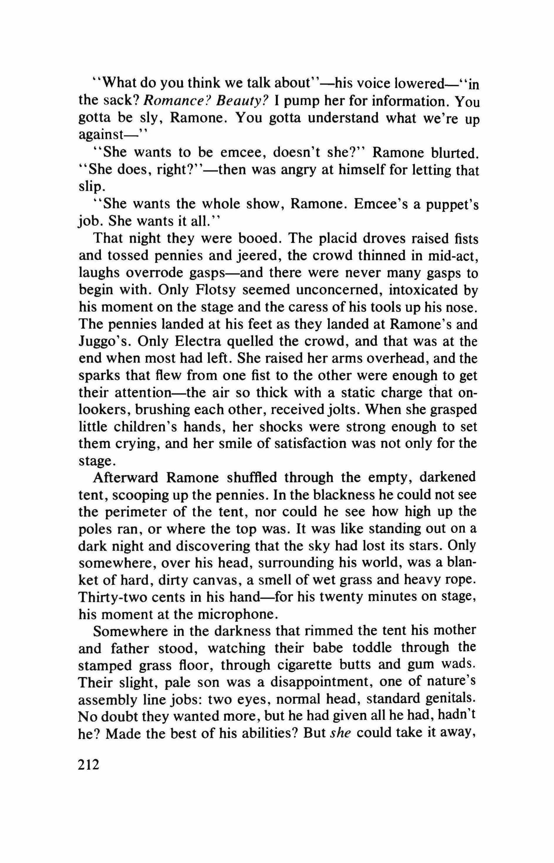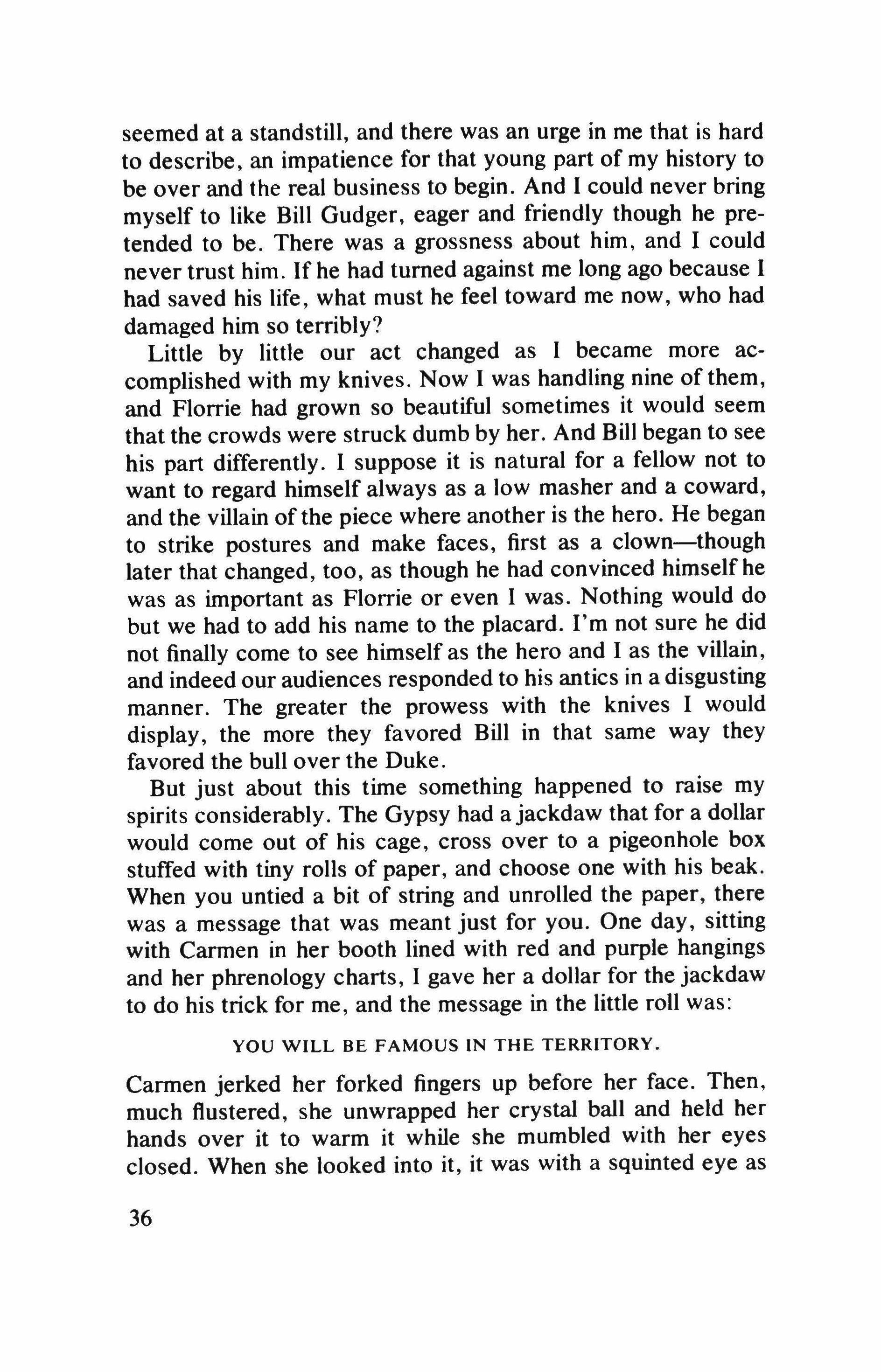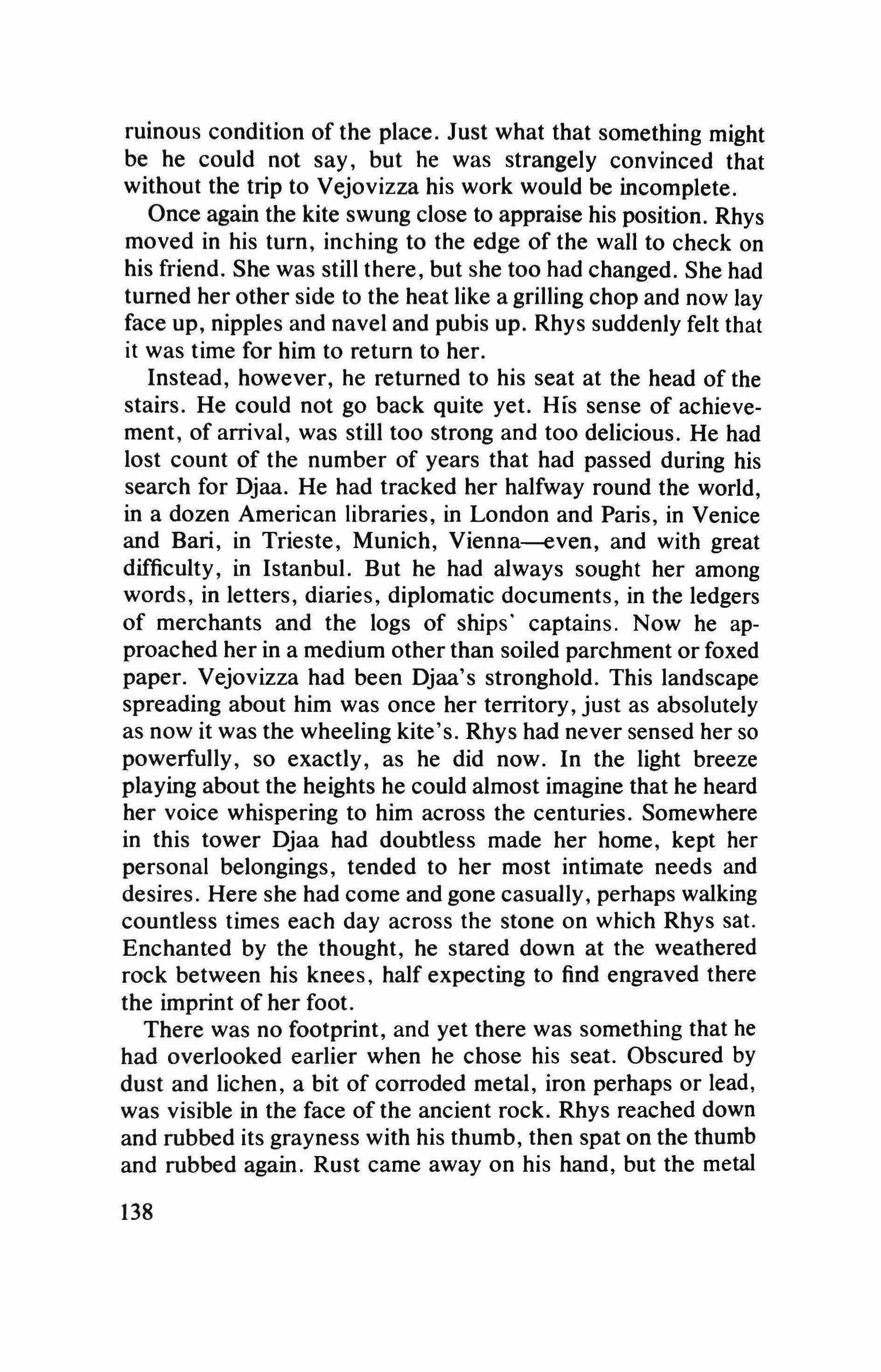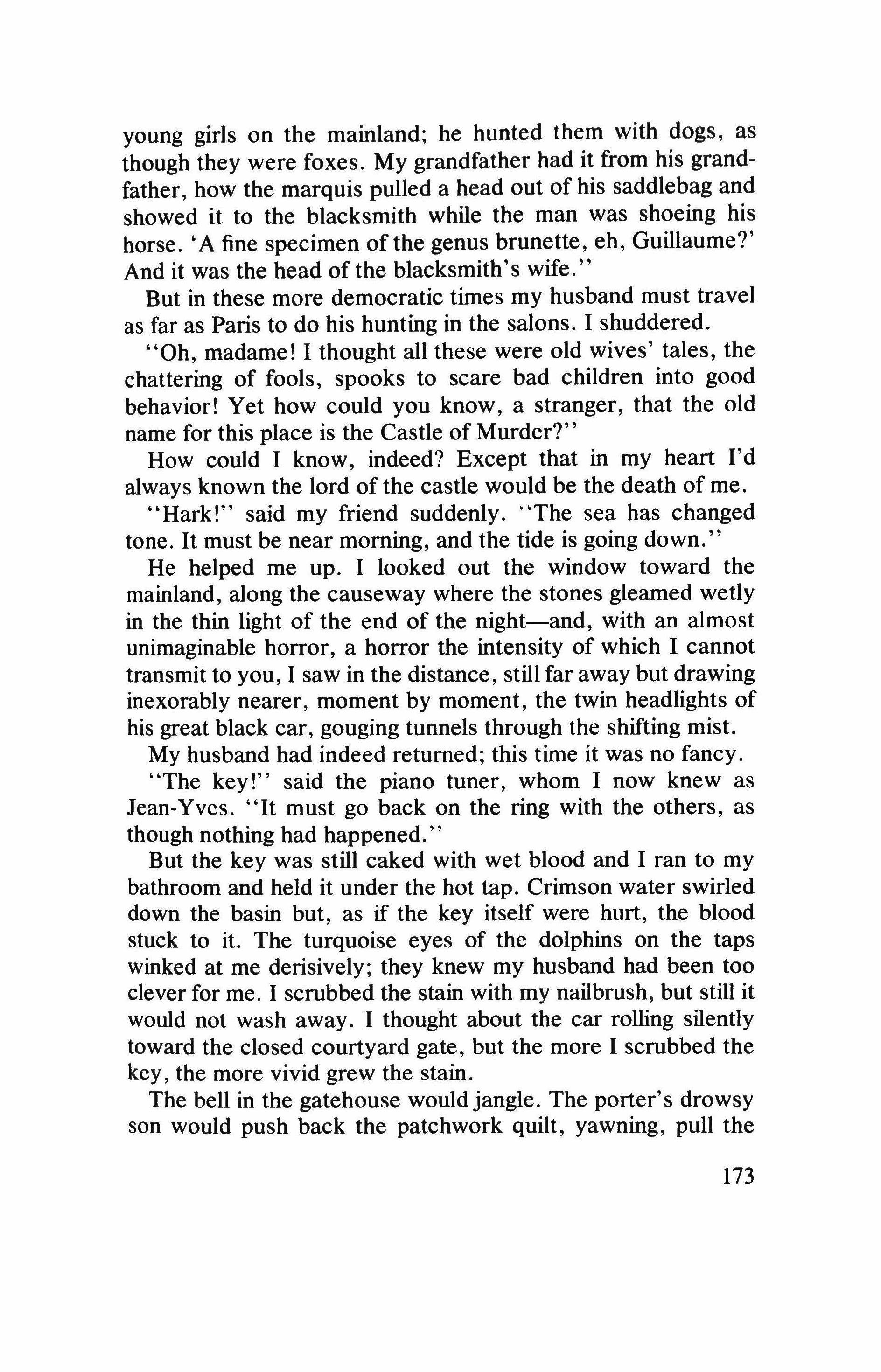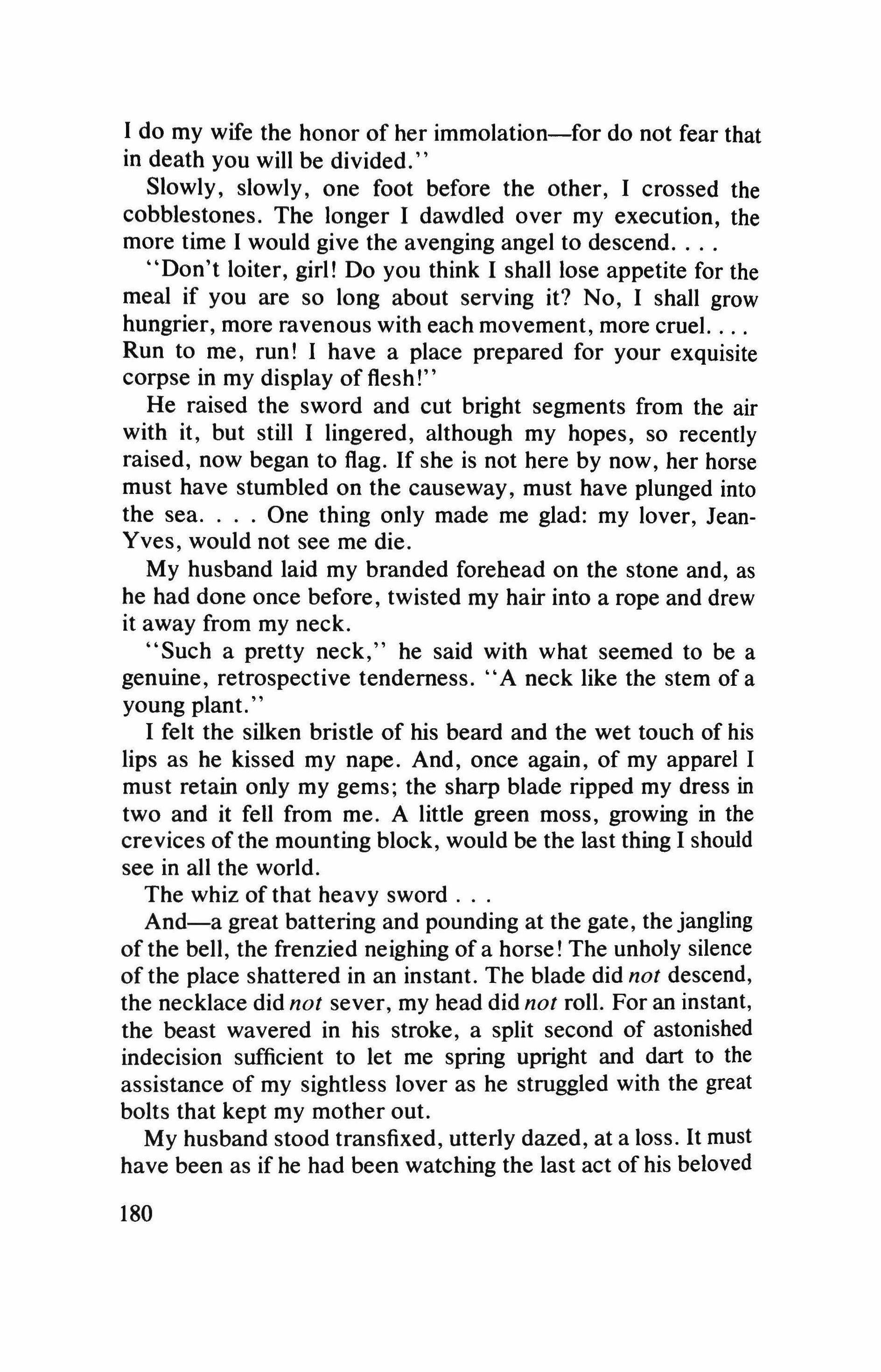 But 1 am thinking of someone who did, who believed in many things 1 did not. She carried a tarot in her purse and slept with the deck of cards beneath her pillow at night. The card that turned up most often in her jejune games of solitaire (for I observed this child's-play over her shoulder) was the Tower, struck by lightning, from which two lovers have been hurled to their doom. "Listen," she once said to me. "if you see a falling star behind the Sacre-Coeur, close your eyes and Whisper, 'Que Dieu nous protege.' But neither of us believed in God. Anyway, 1 never saw a falling star behind the Sacre-Coeur.