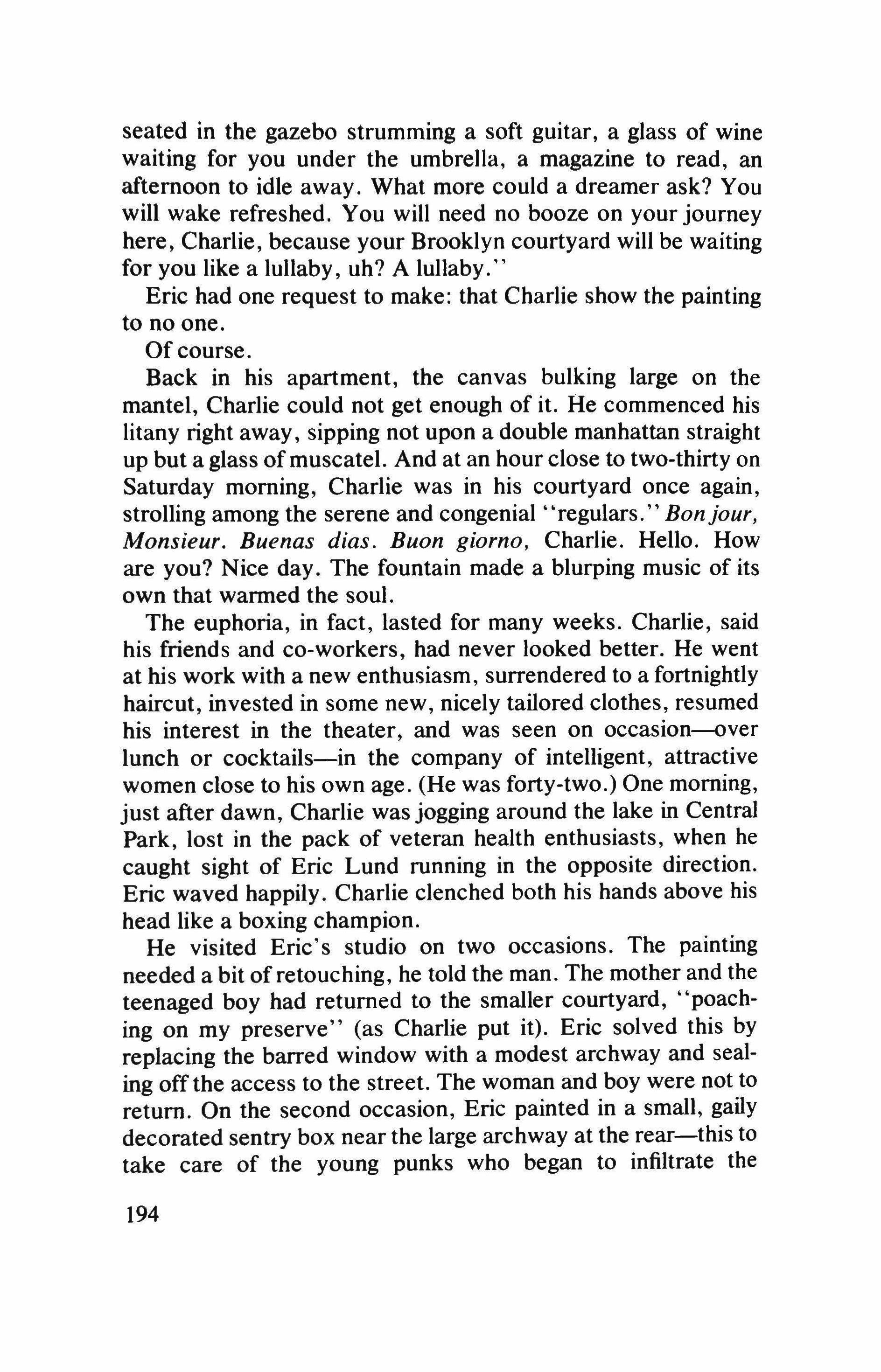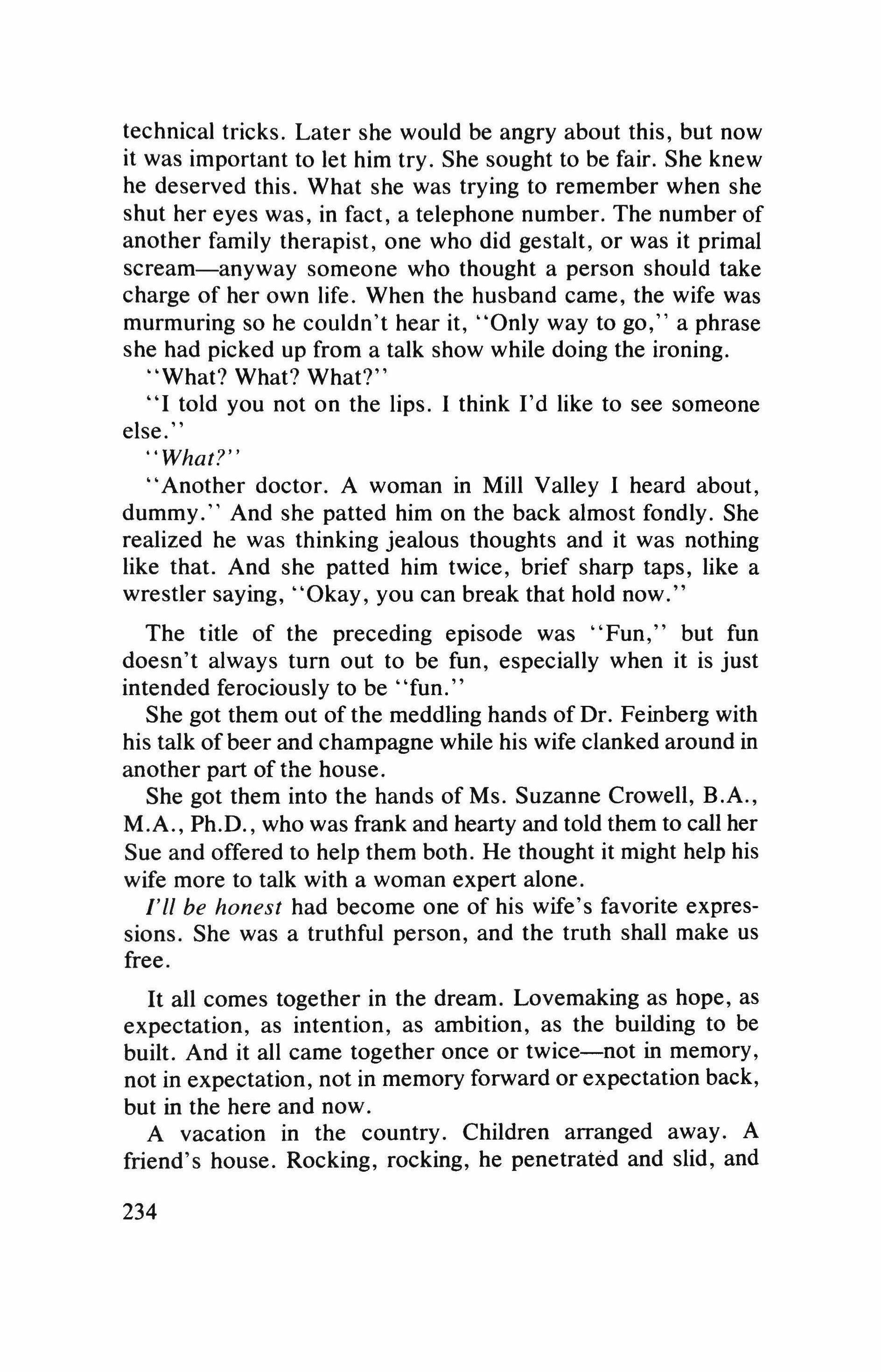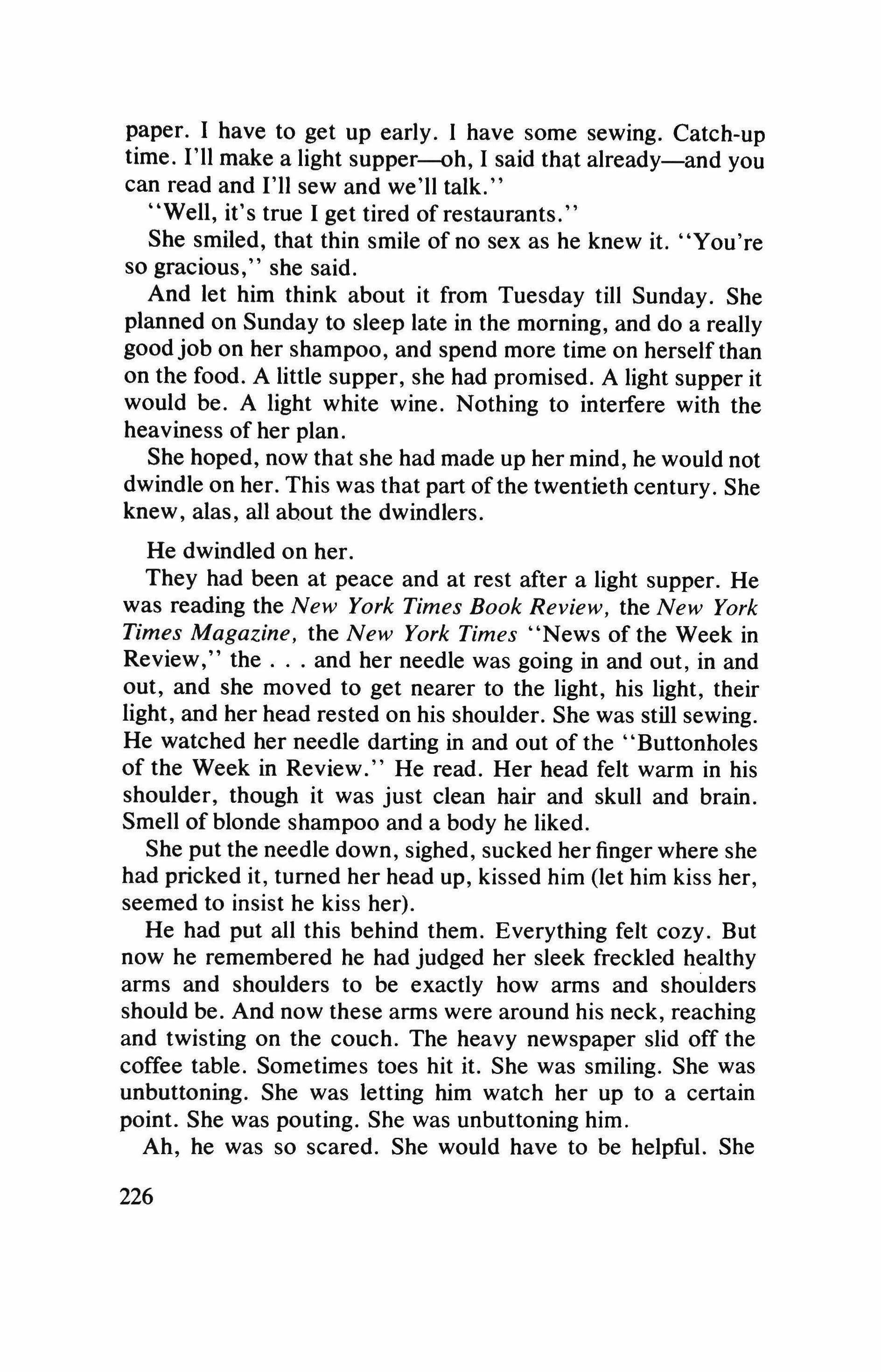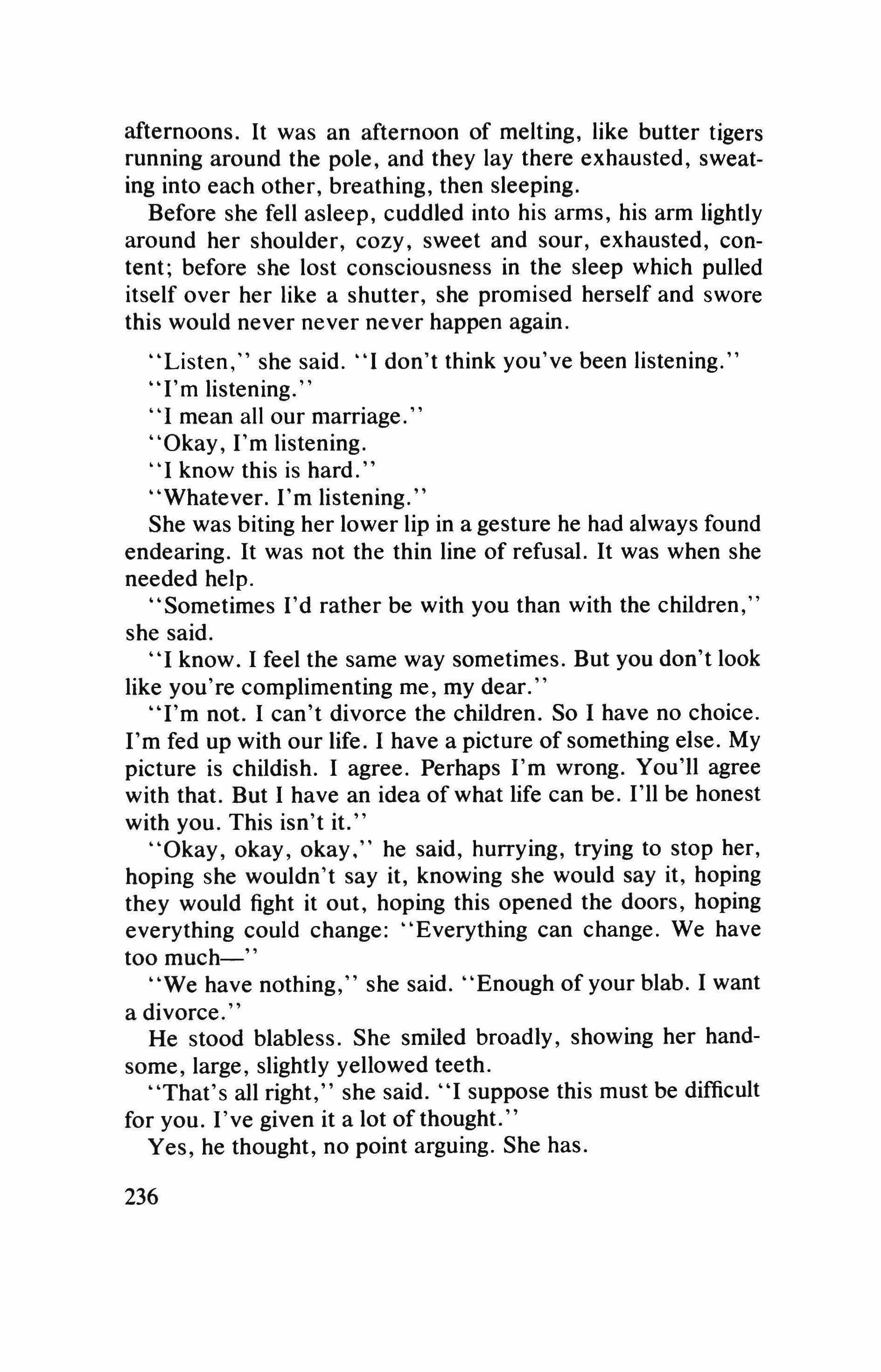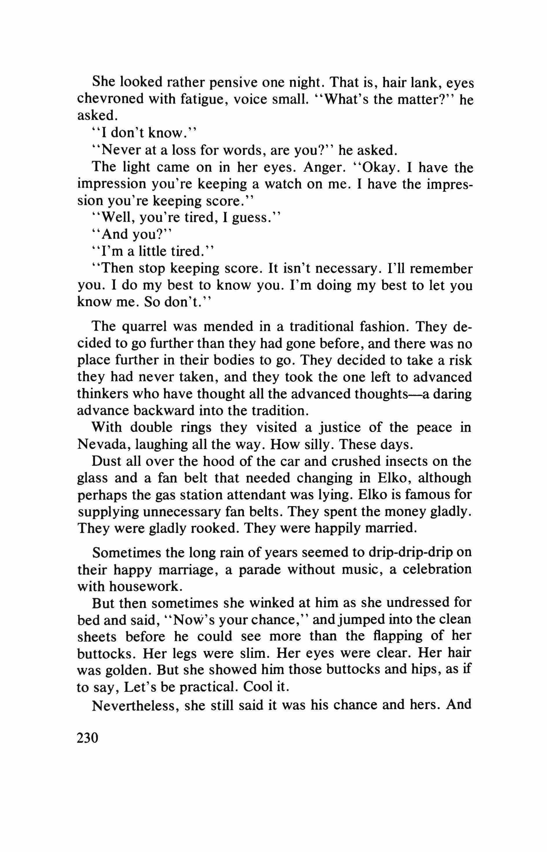 It long ago occurred to me that my little circle in Paris brought no children to the world. We were a barren lot. O'Grady, my editor, was a misogynist and a solitary; Anacreon, the sculptor, impotent in everything but his art. The promiscuous Gabriel cohabited with members of his own sex only. I recall Harry and Irene, who decided to marry as if they had discovered a new perversion. They began an argument on their wedding day (I was Harry's troubled best man) that continued throughout their marriage, yet they never divorced. Irene is, in fact, that same unhappy and childless wife who, through a syndicated newspaper column, offers motherly advice to millions.