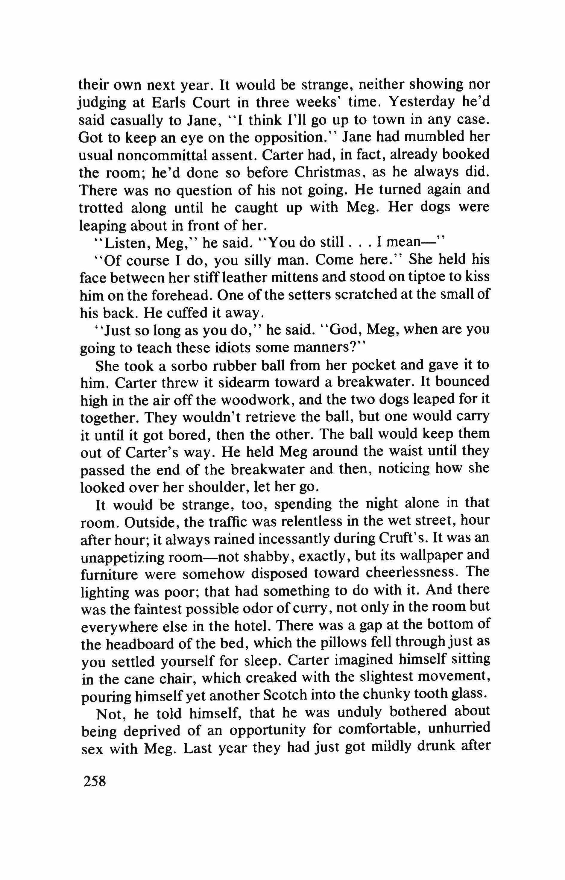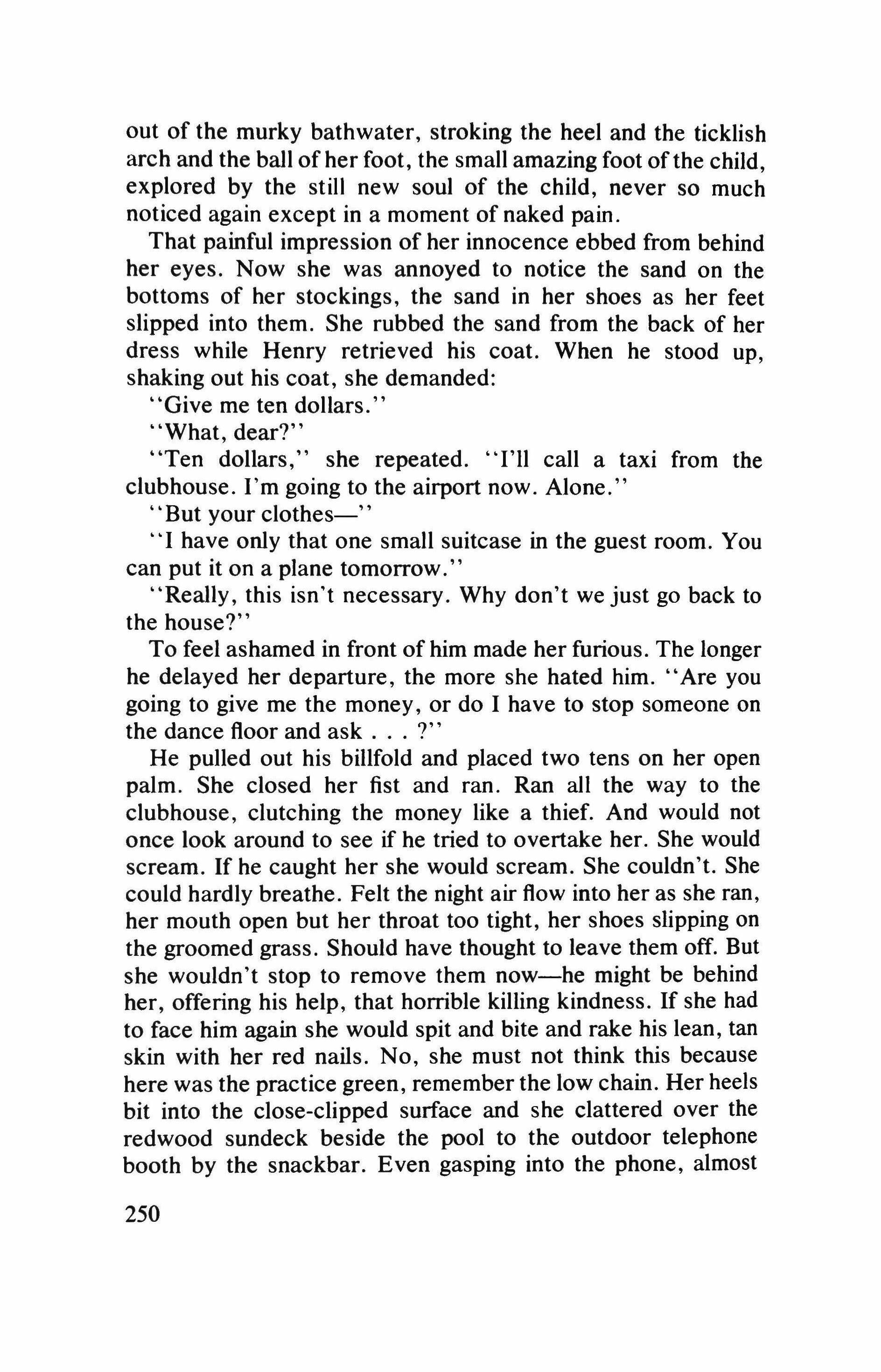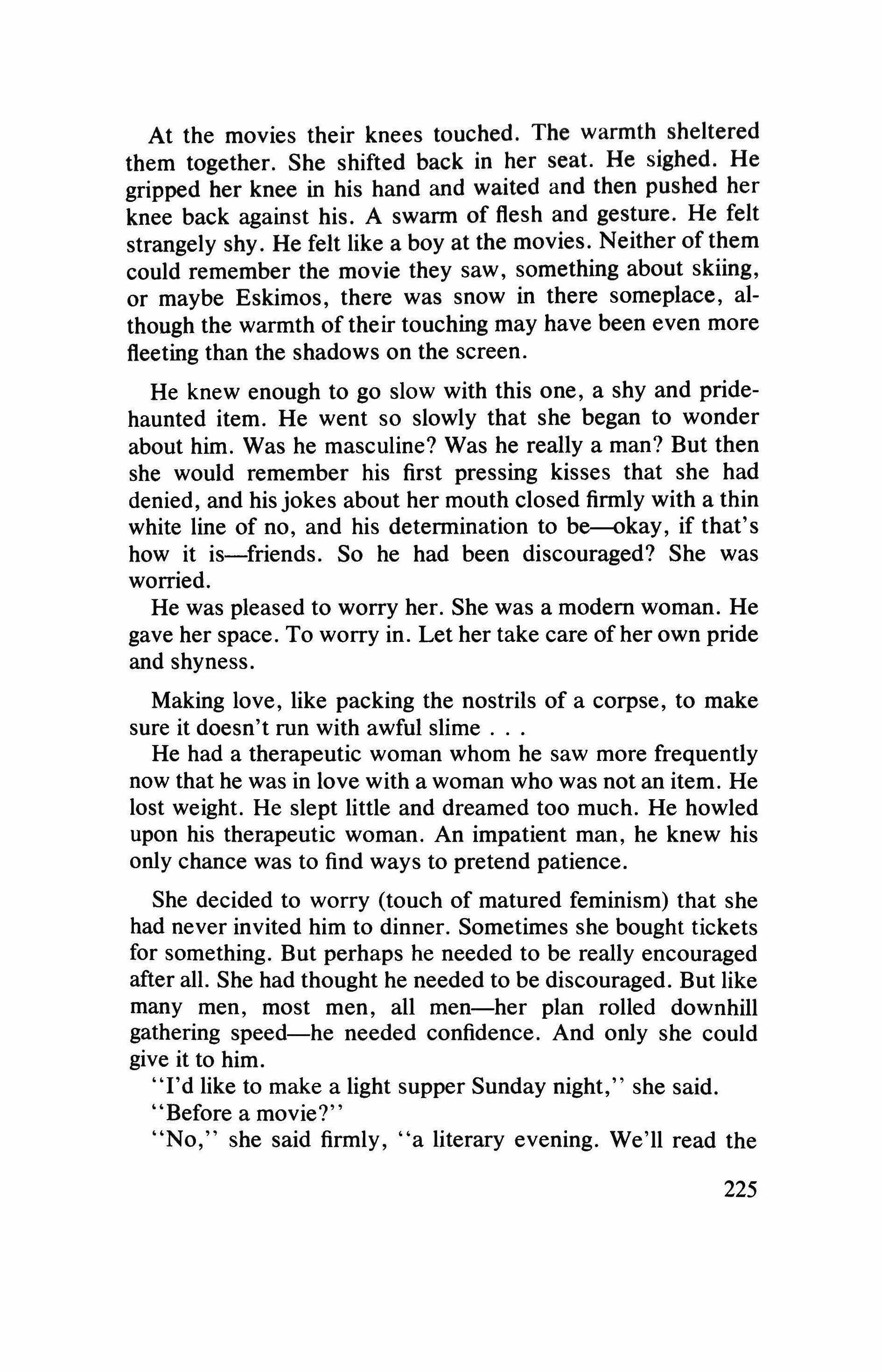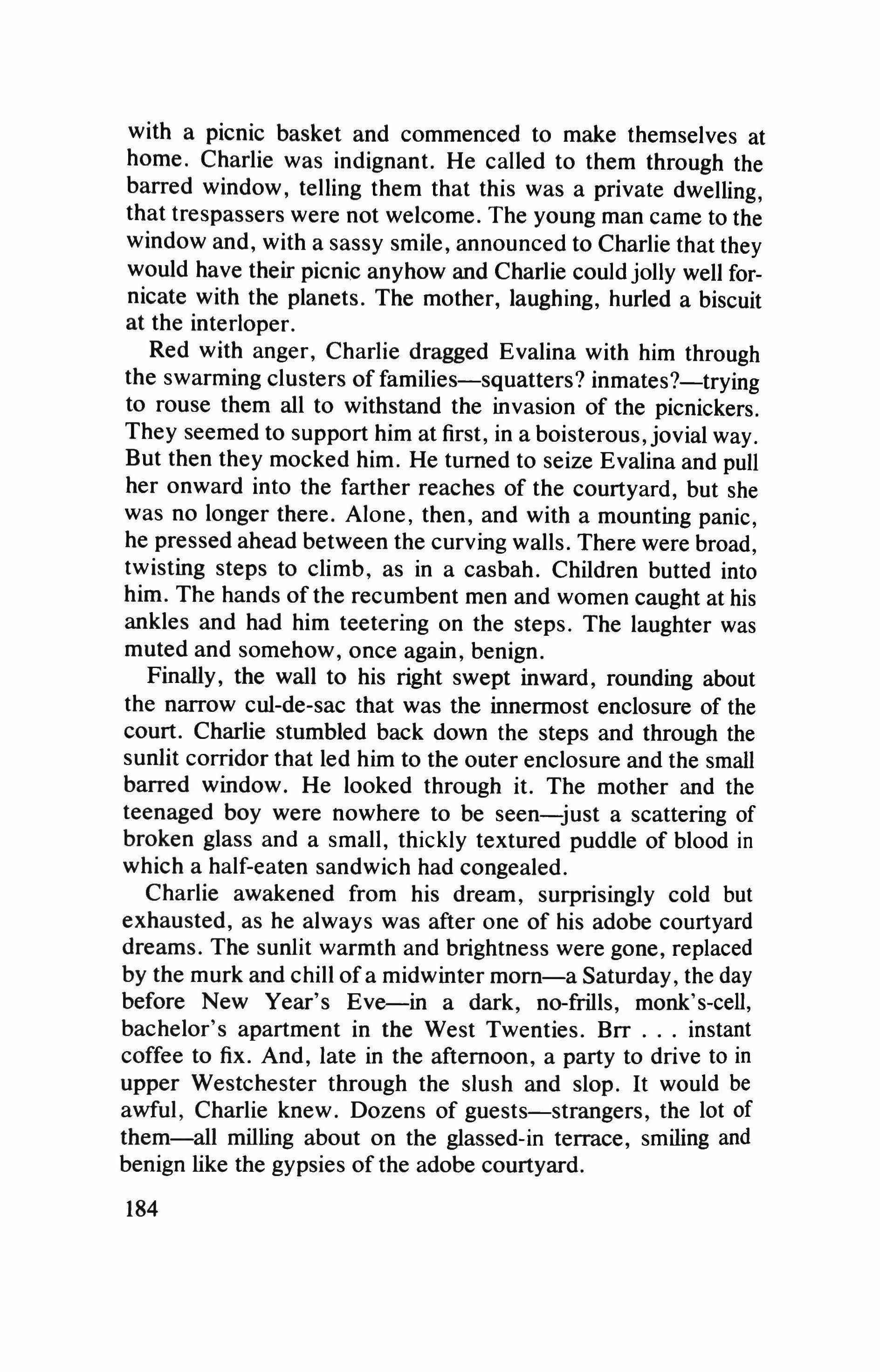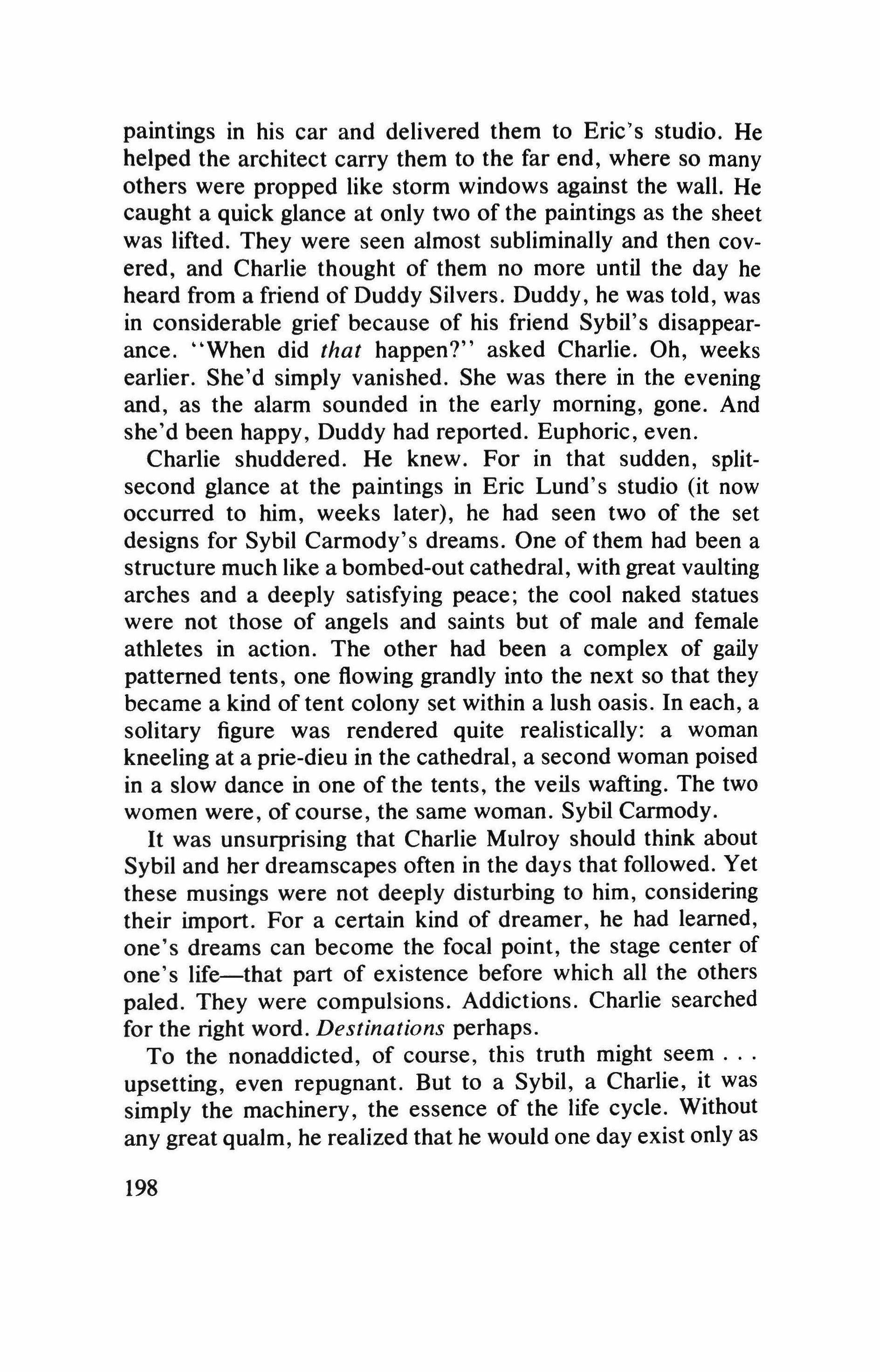It long ago occurred to me that my little circle in Paris brought no children to the world. We were a barren lot. O'Grady, my editor, was a misogynist and a solitary; Anacreon, the sculptor, impotent in everything but his art. The promiscuous Gabriel cohabited with members of his own sex only. I recall Harry and Irene, who decided to marry as if they had discovered a new perversion. They began an argument on their wedding day (I was Harry's troubled best man) that continued throughout their marriage, yet they never divorced. Irene is, in fact, that same unhappy and childless wife who, through a syndicated newspaper column, offers motherly advice to millions.