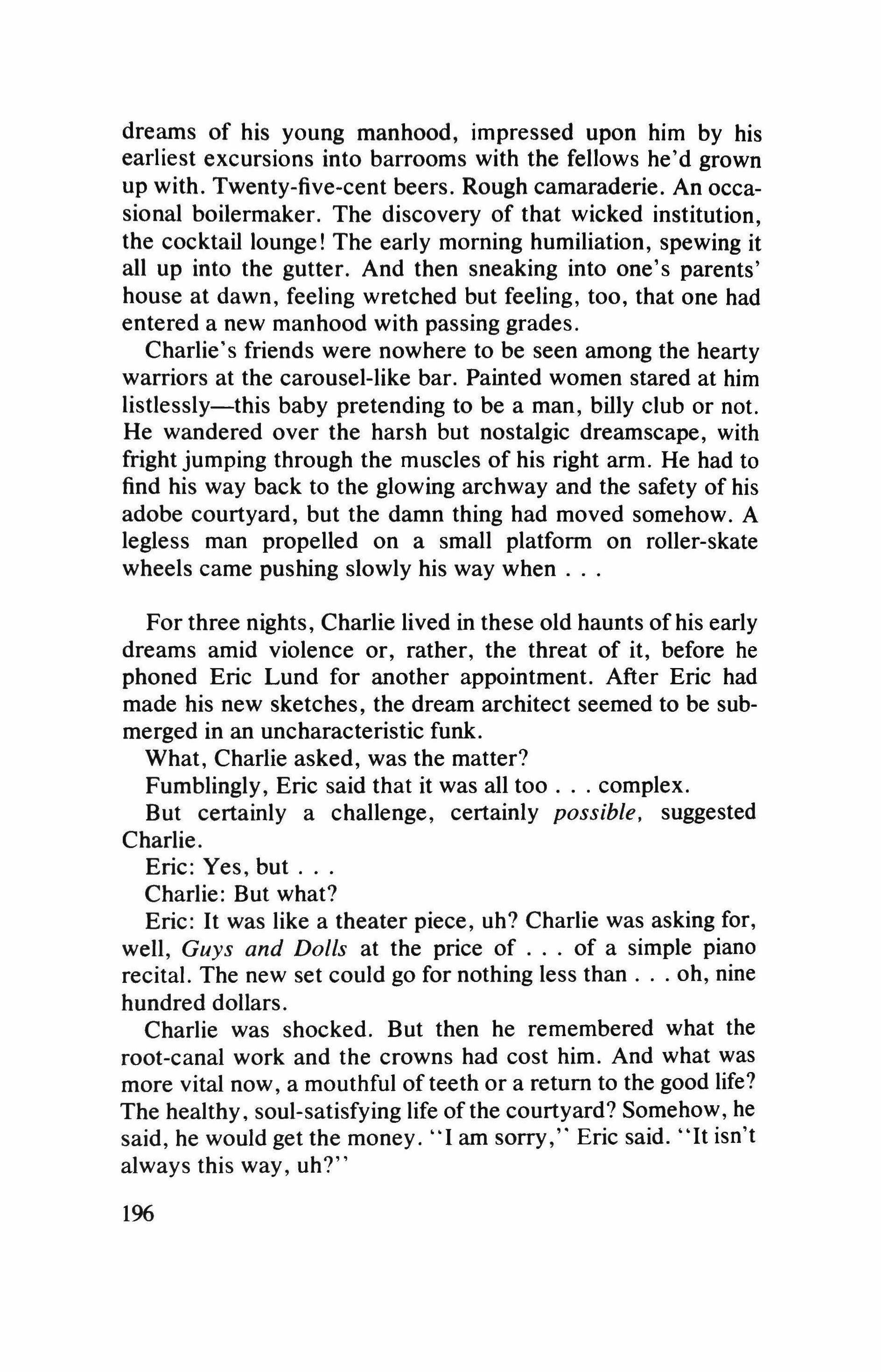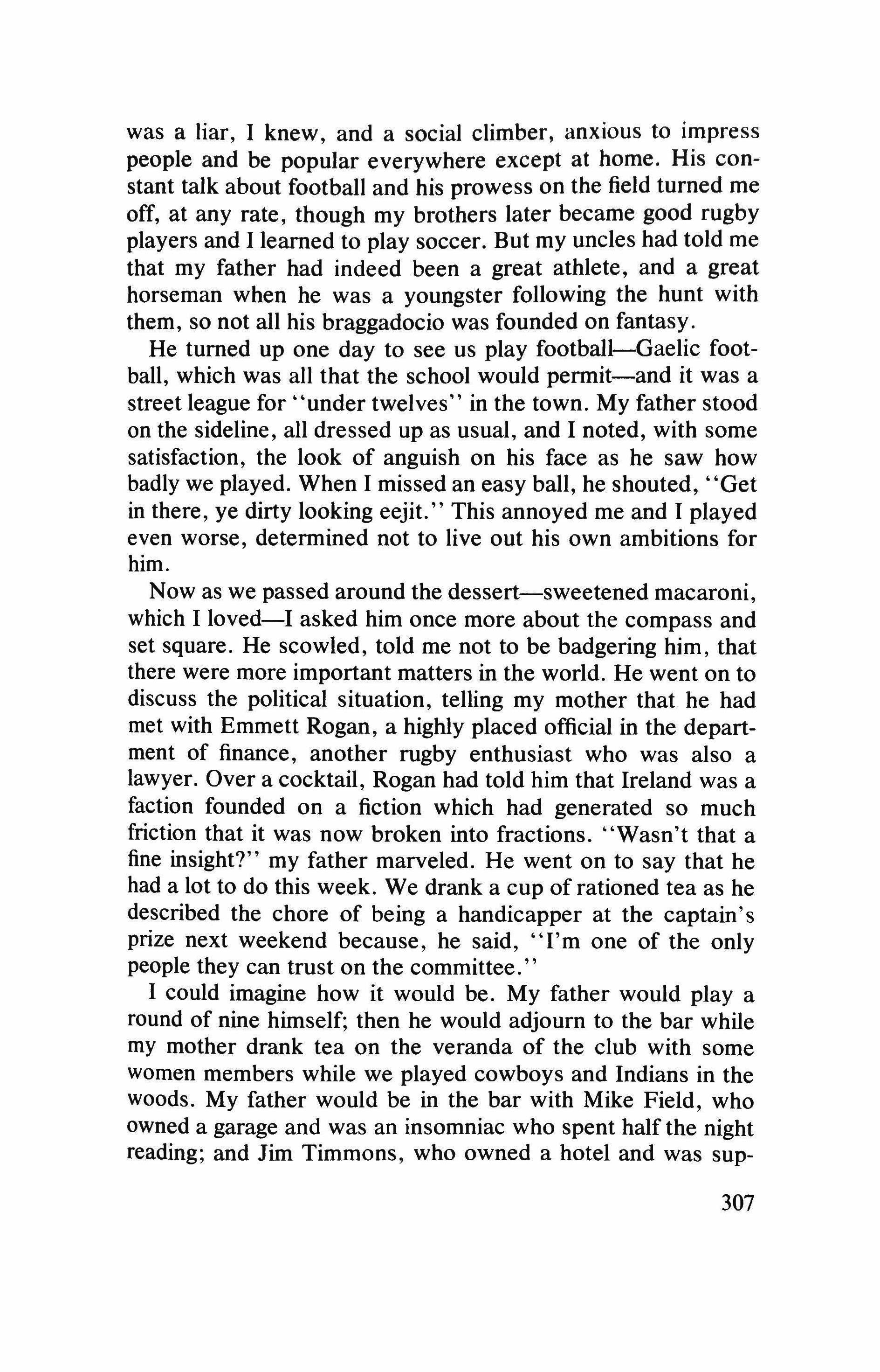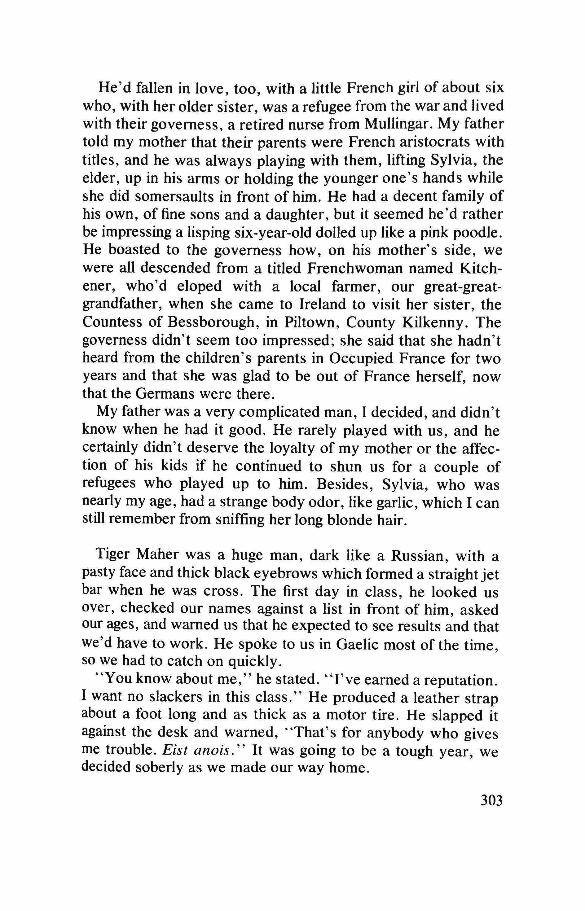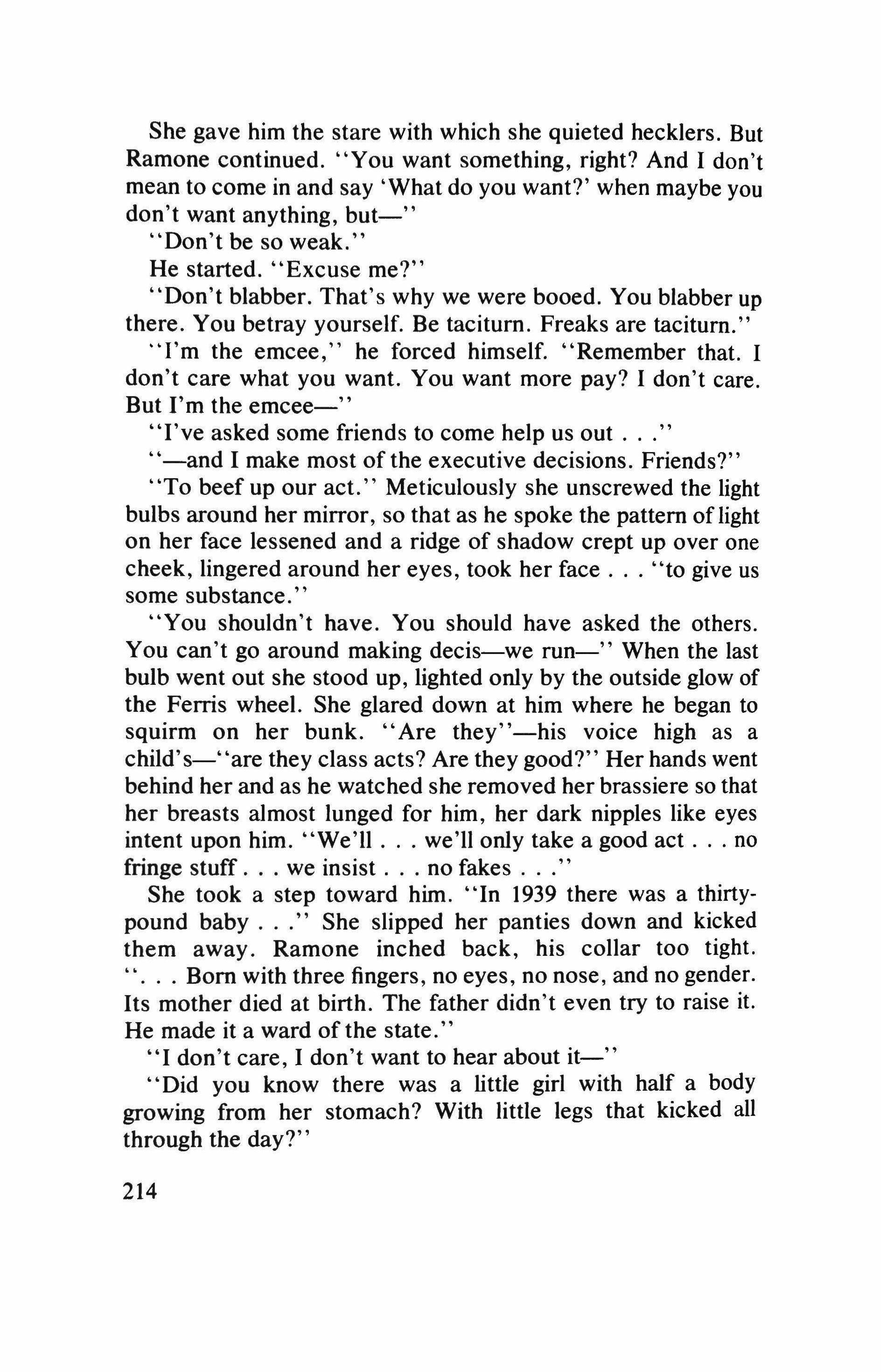 It long ago occurred to me that my little circle in Paris brought no children to the world. We were a barren lot. O'Grady, my editor, was a misogynist and a solitary; Anacreon, the sculptor, impotent in everything but his art. The promiscuous Gabriel cohabited with members of his own sex only. I recall Harry and Irene, who decided to marry as if they had discovered a new perversion. They began an argument on their wedding day (I was Harry's troubled best man) that continued throughout their marriage, yet they never divorced. Irene is, in fact, that same unhappy and childless wife who, through a syndicated newspaper column, offers motherly advice to millions.