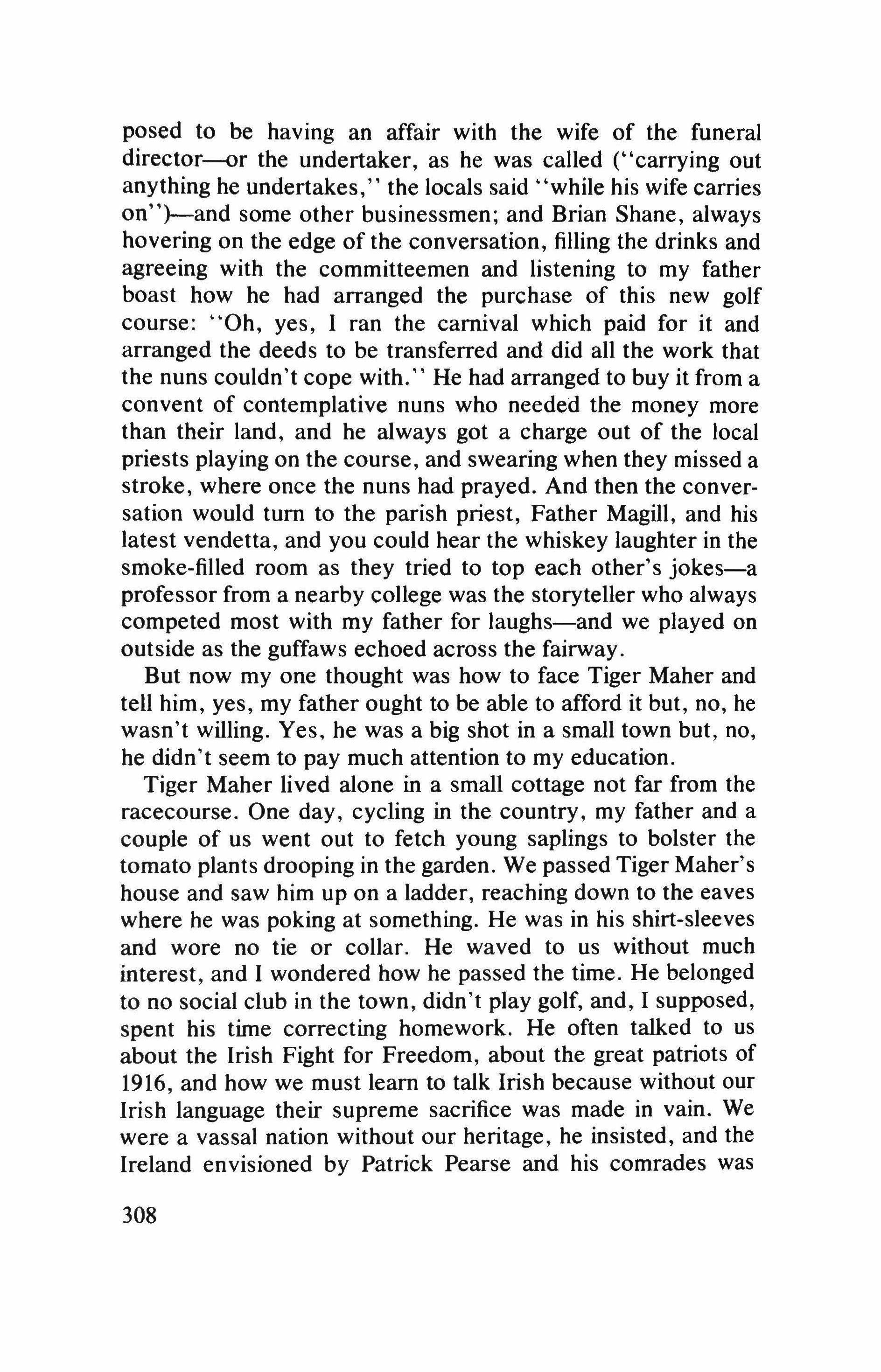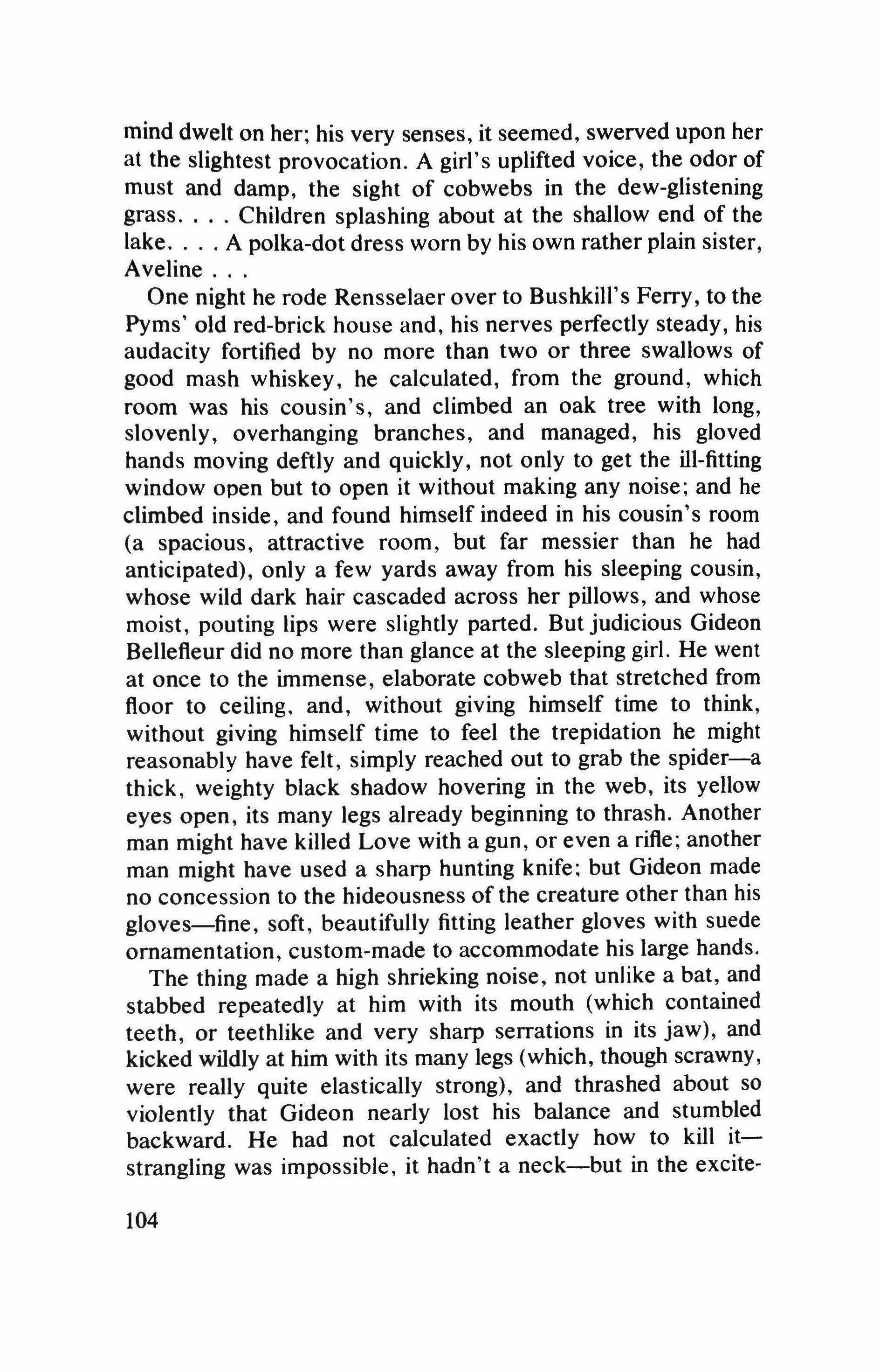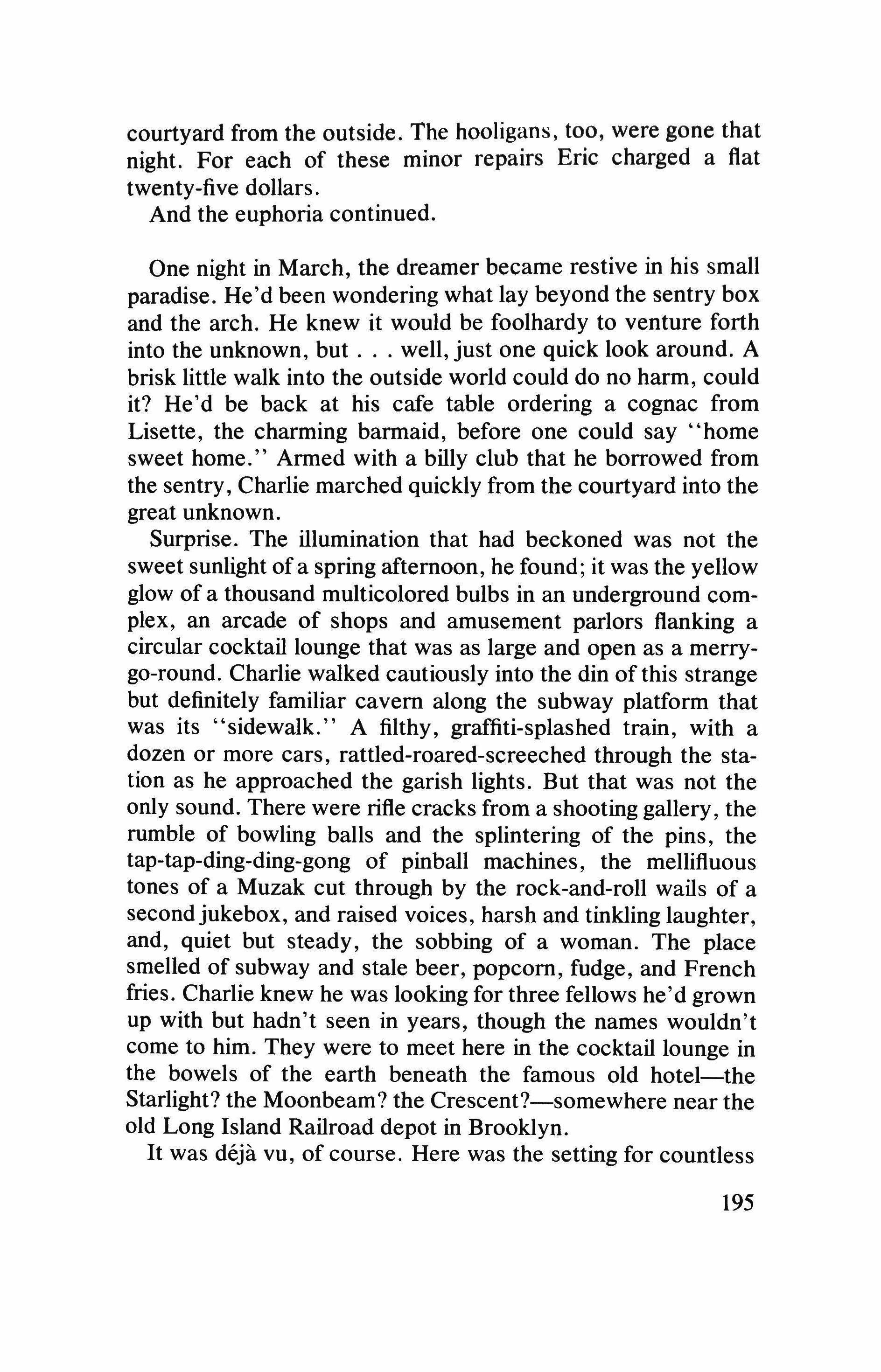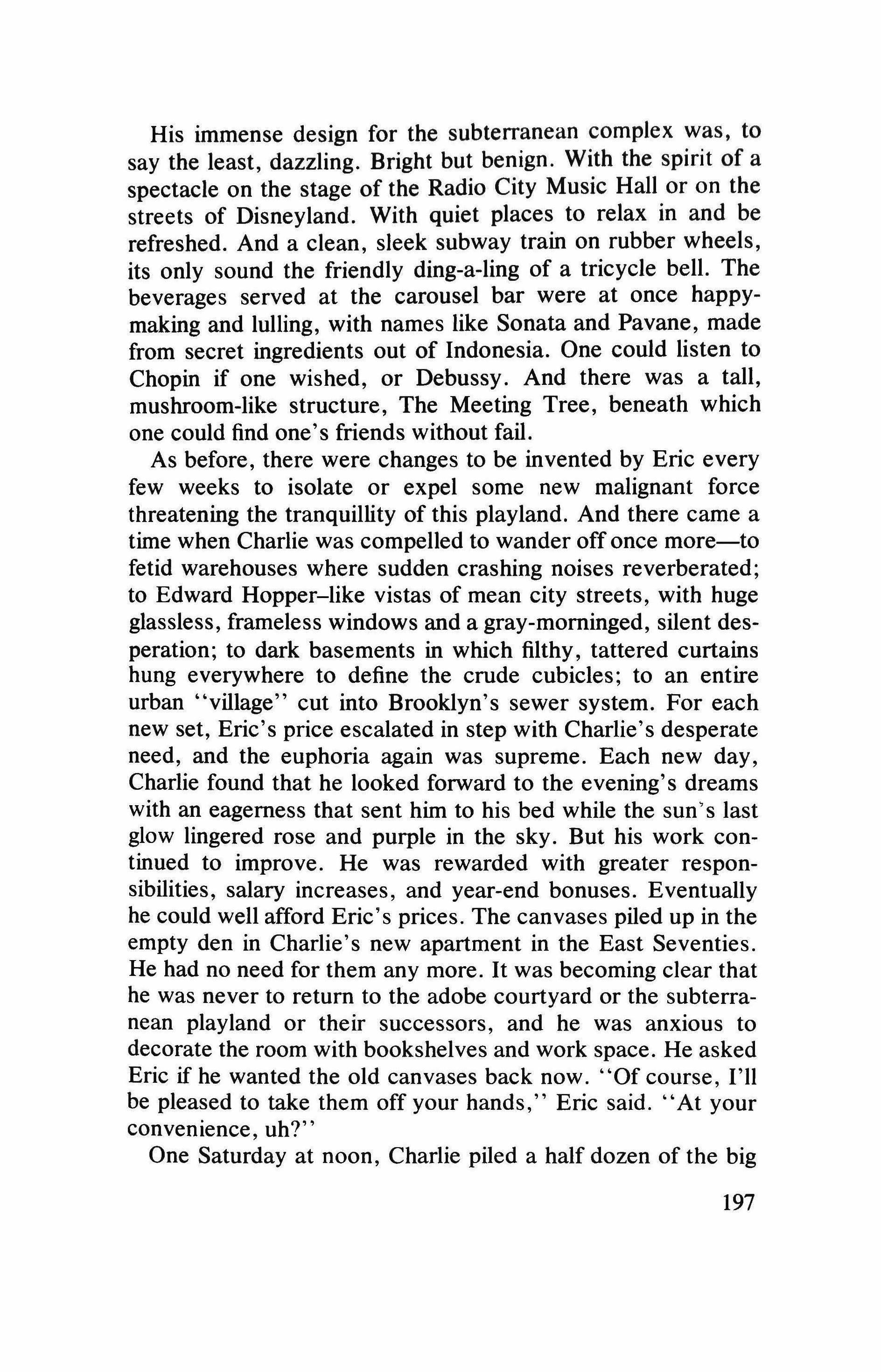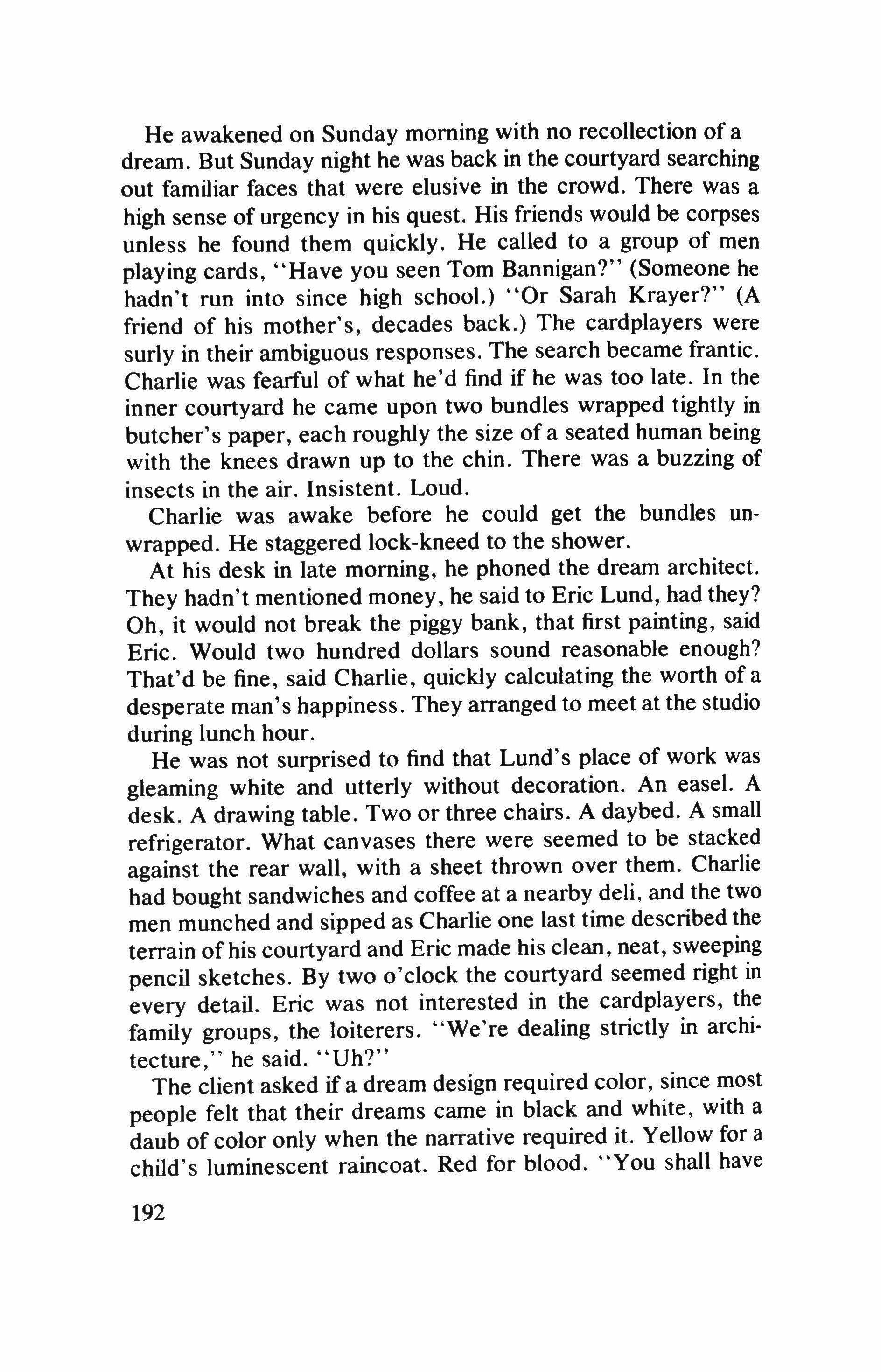 It long ago occurred to me that my little circle in Paris brought no children to the world. We were a barren lot. O'Grady, my editor, was a misogynist and a solitary; Anacreon, the sculptor, impotent in everything but his art. The promiscuous Gabriel cohabited with members of his own sex only. I recall Harry and Irene, who decided to marry as if they had discovered a new perversion. They began an argument on their wedding day (I was Harry's troubled best man) that continued throughout their marriage, yet they never divorced. Irene is, in fact, that same unhappy and childless wife who, through a syndicated newspaper column, offers motherly advice to millions.