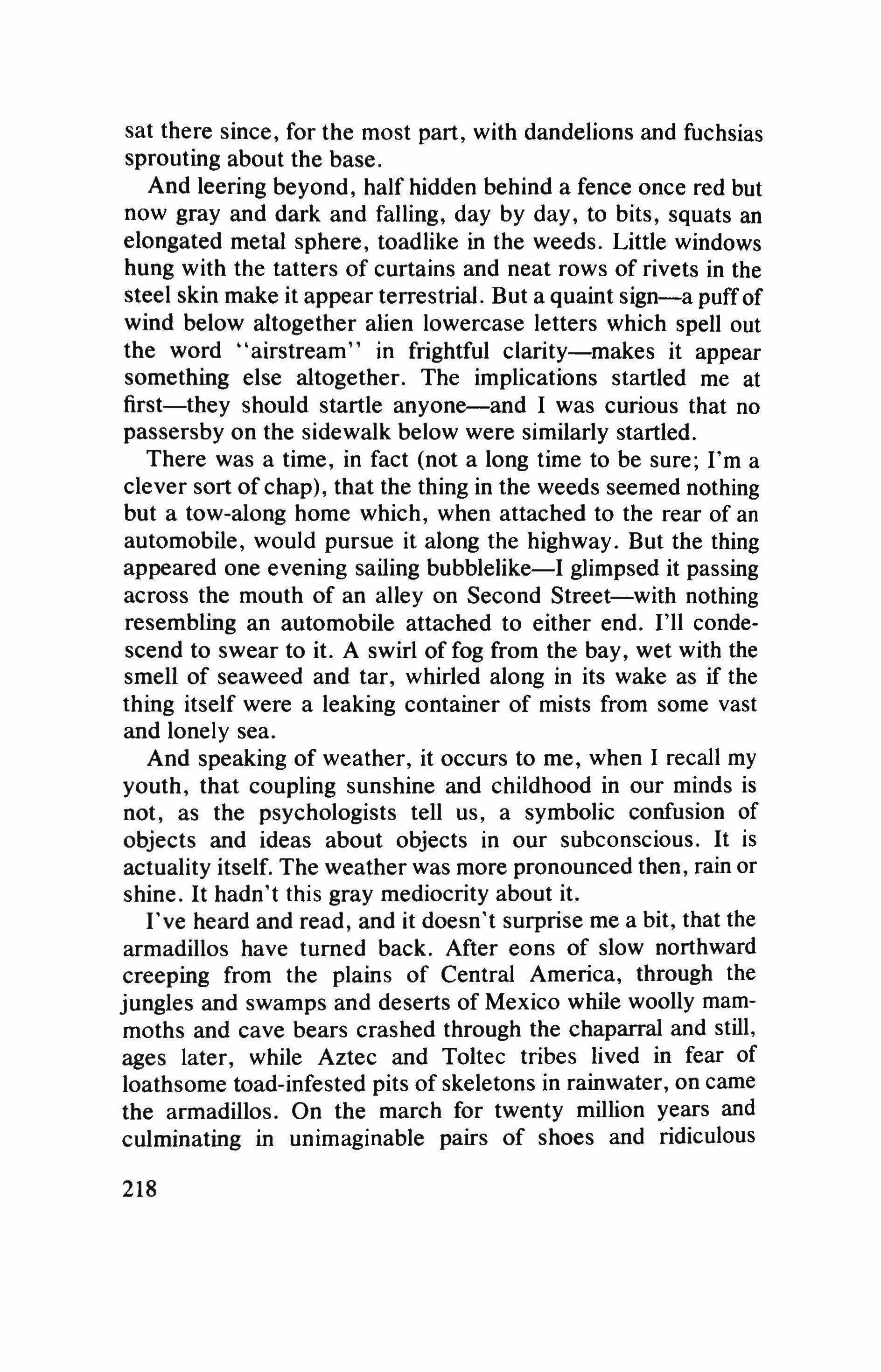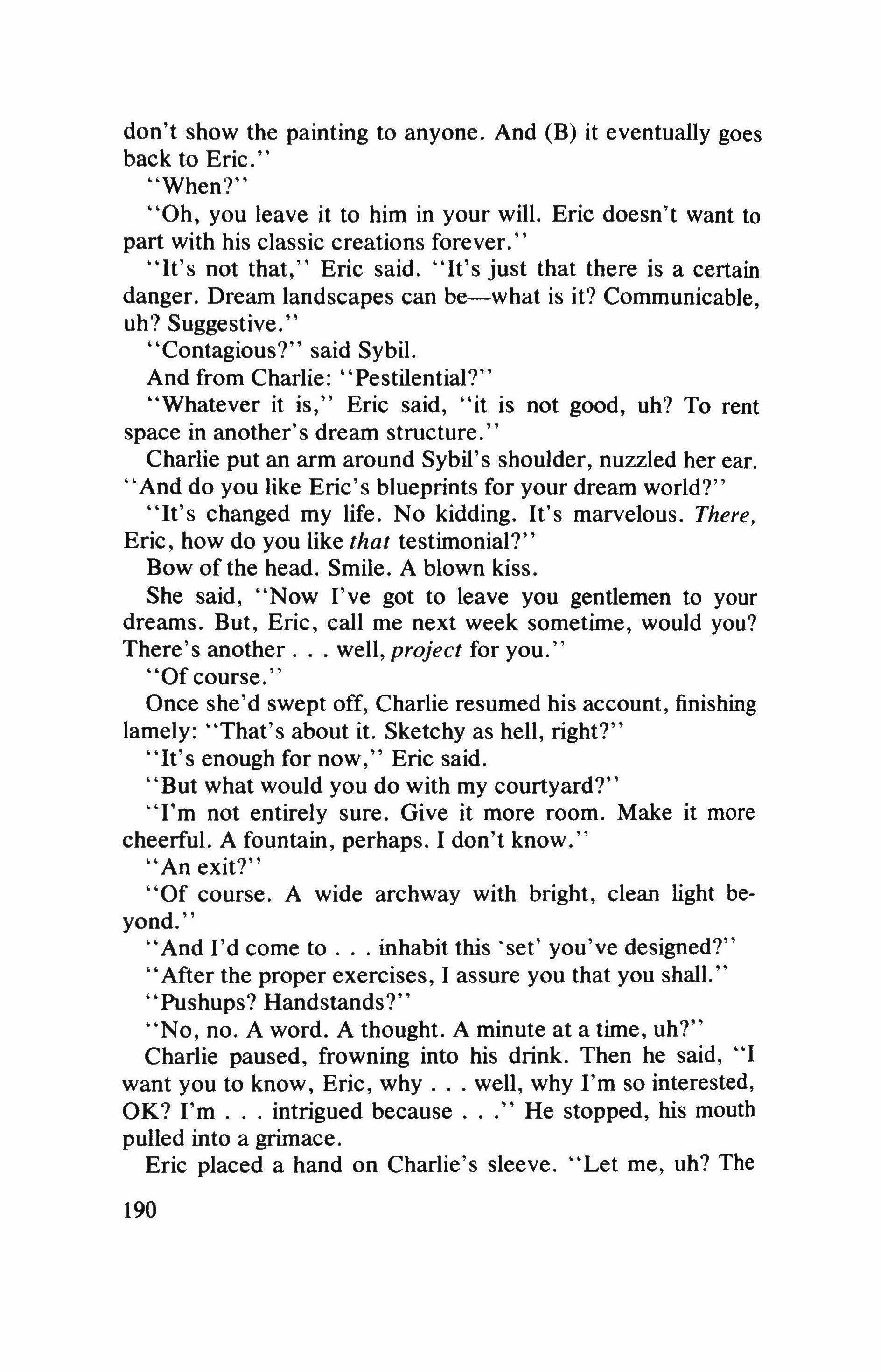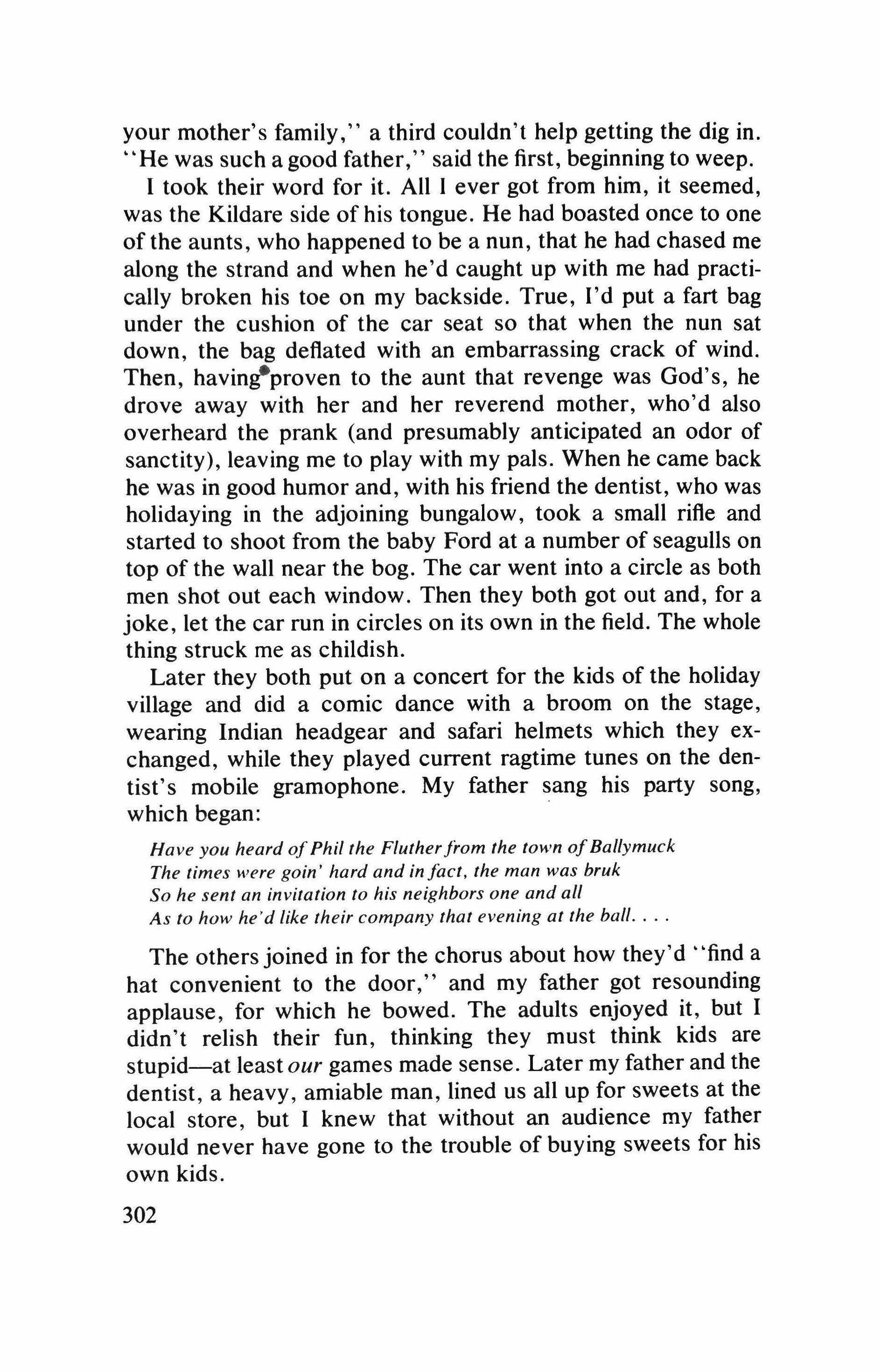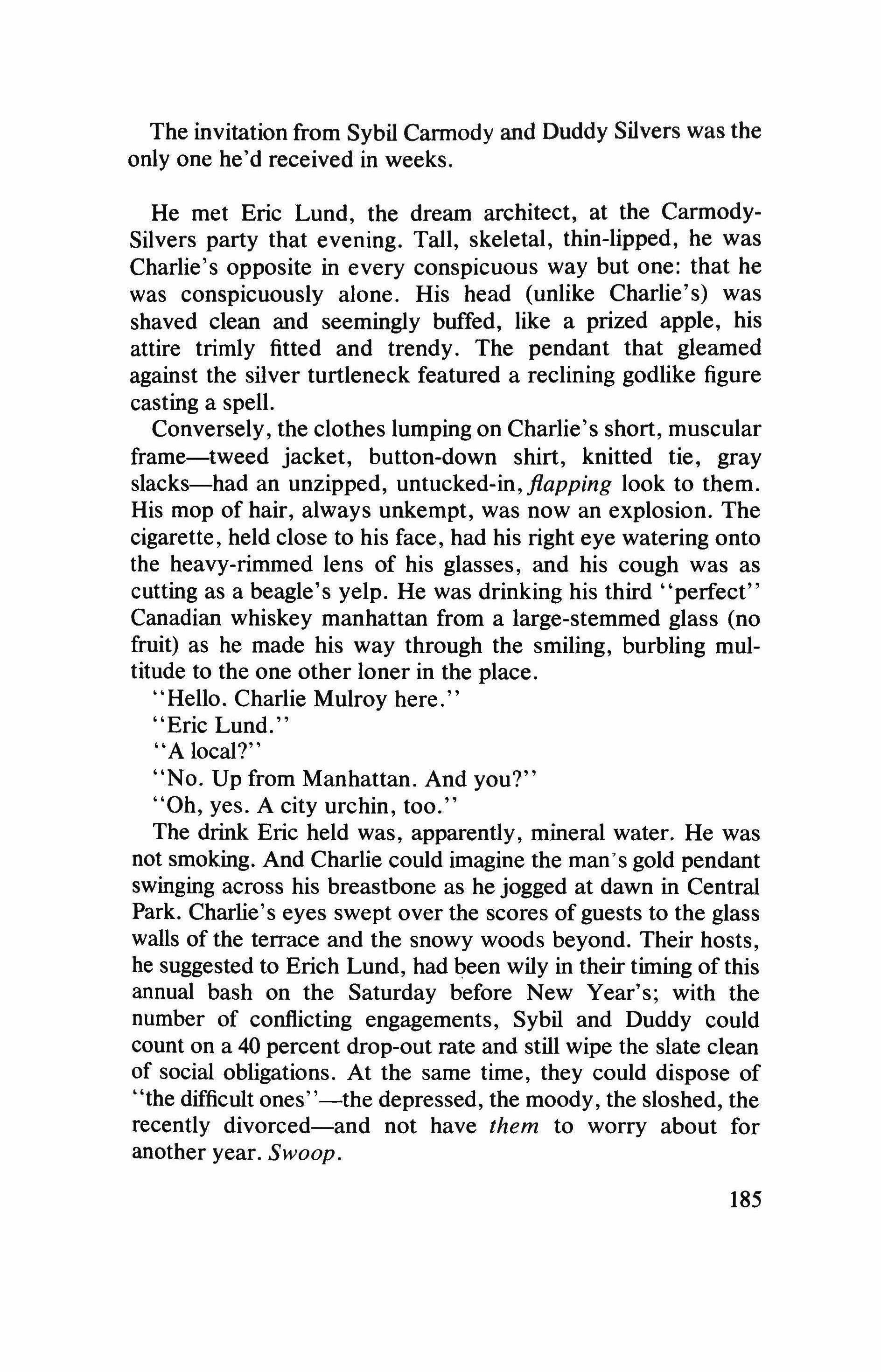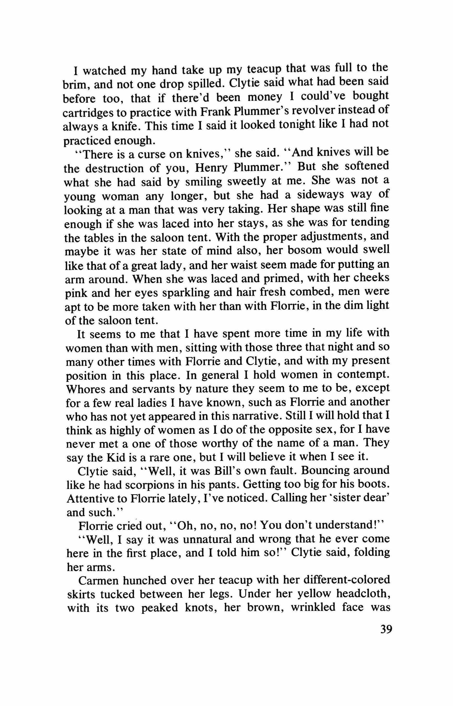 It long ago occurred to me that my little circle in Paris brought no children to the world. We were a barren lot. O'Grady, my editor, was a misogynist and a solitary; Anacreon, the sculptor, impotent in everything but his art. The promiscuous Gabriel cohabited with members of his own sex only. I recall Harry and Irene, who decided to marry as if they had discovered a new perversion. They began an argument on their wedding day (I was Harry's troubled best man) that continued throughout their marriage, yet they never divorced. Irene is, in fact, that same unhappy and childless wife who, through a syndicated newspaper column, offers motherly advice to millions.