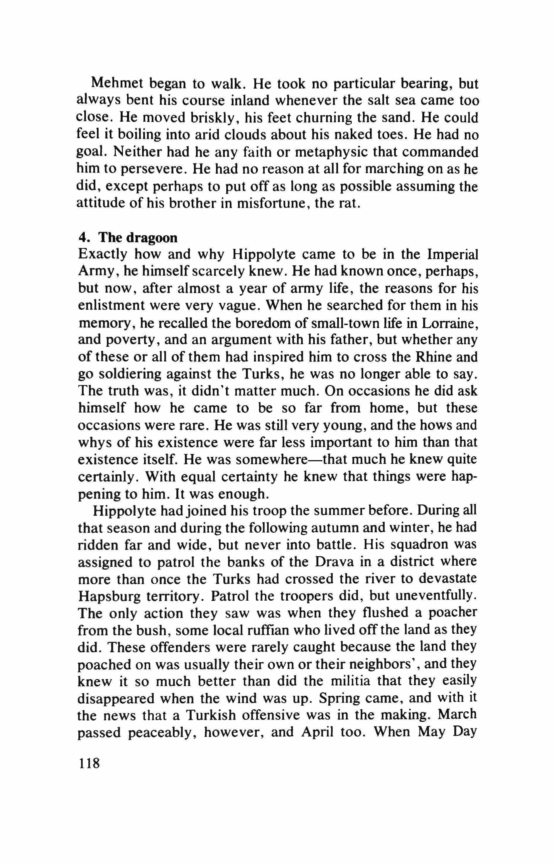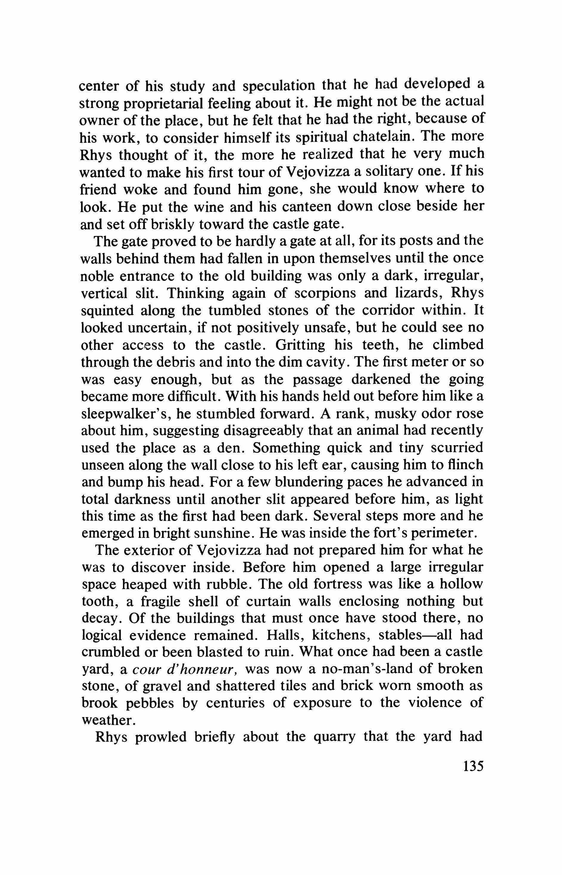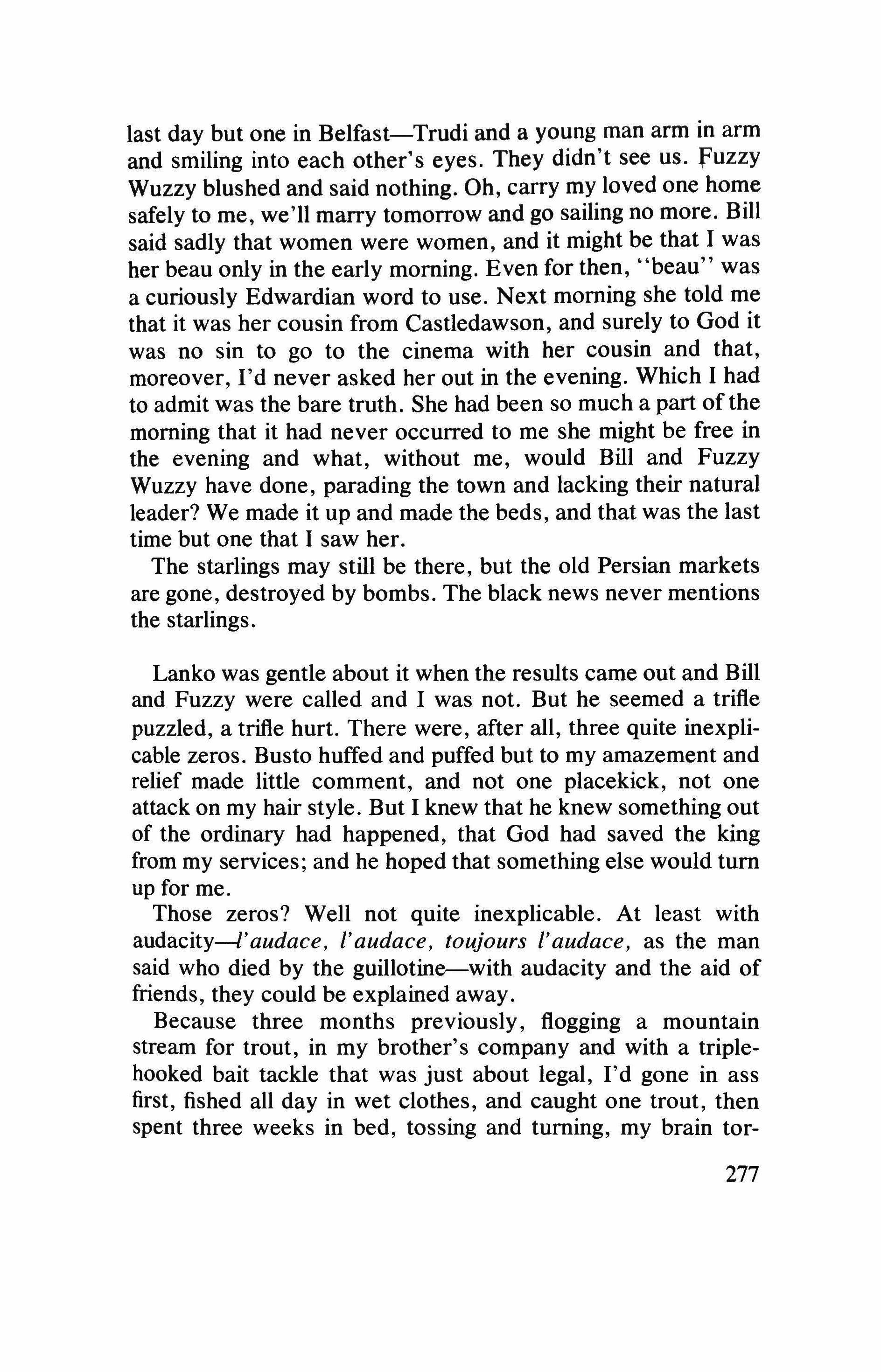 I pretend to nap. It is an opportunity to allow the tape machine a respite, and to offer the Professor's wife a piece of the afternoon alone with her husband. (I never nap; sleep is elusive enough at night.) The window volets are open wide. A slight breeze stirs the leaves of the linden, a fly is trapped inside my light fixture-and through these somnolent summer sounds I hear my guests talking quietly in the room below.
