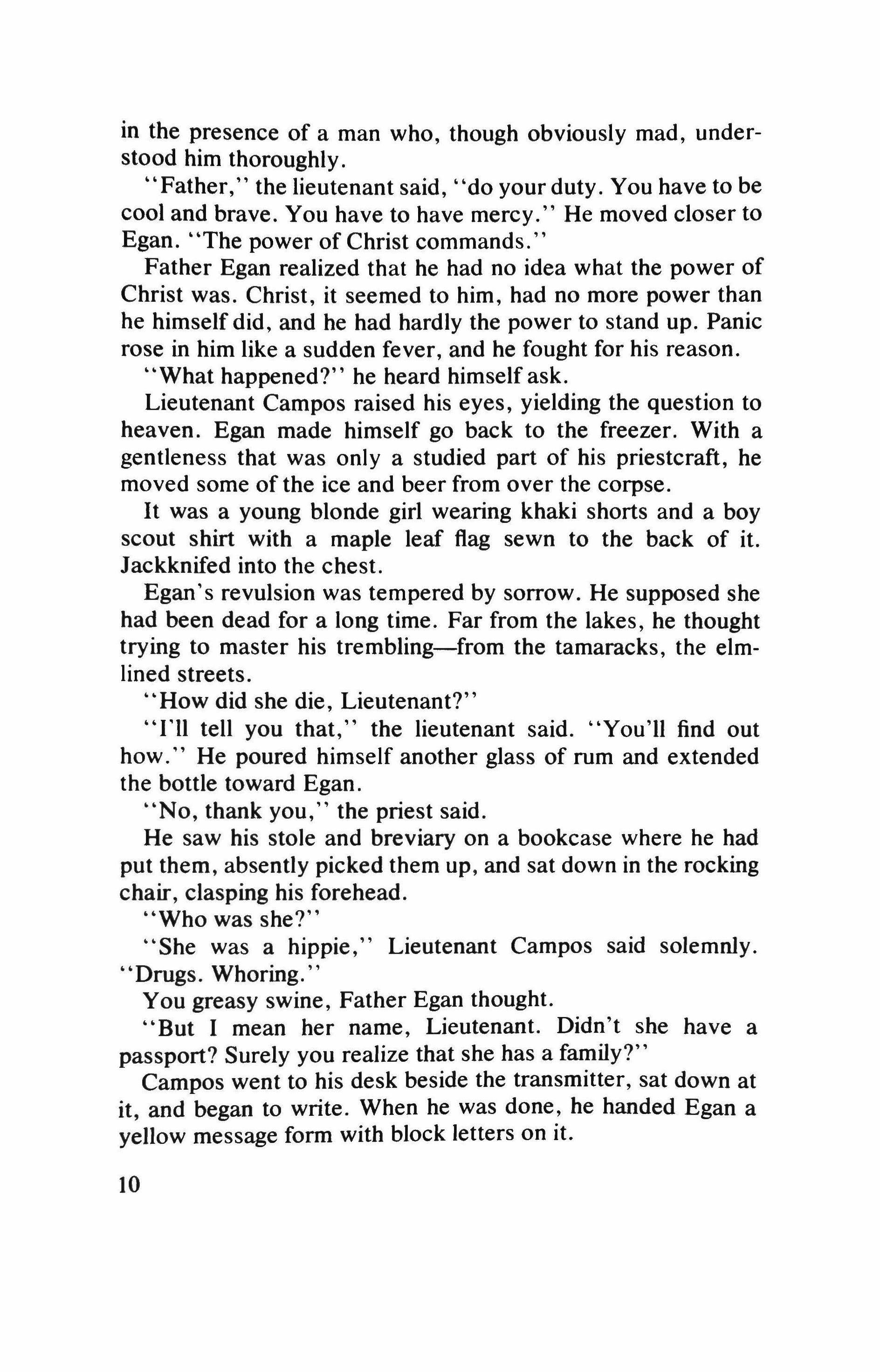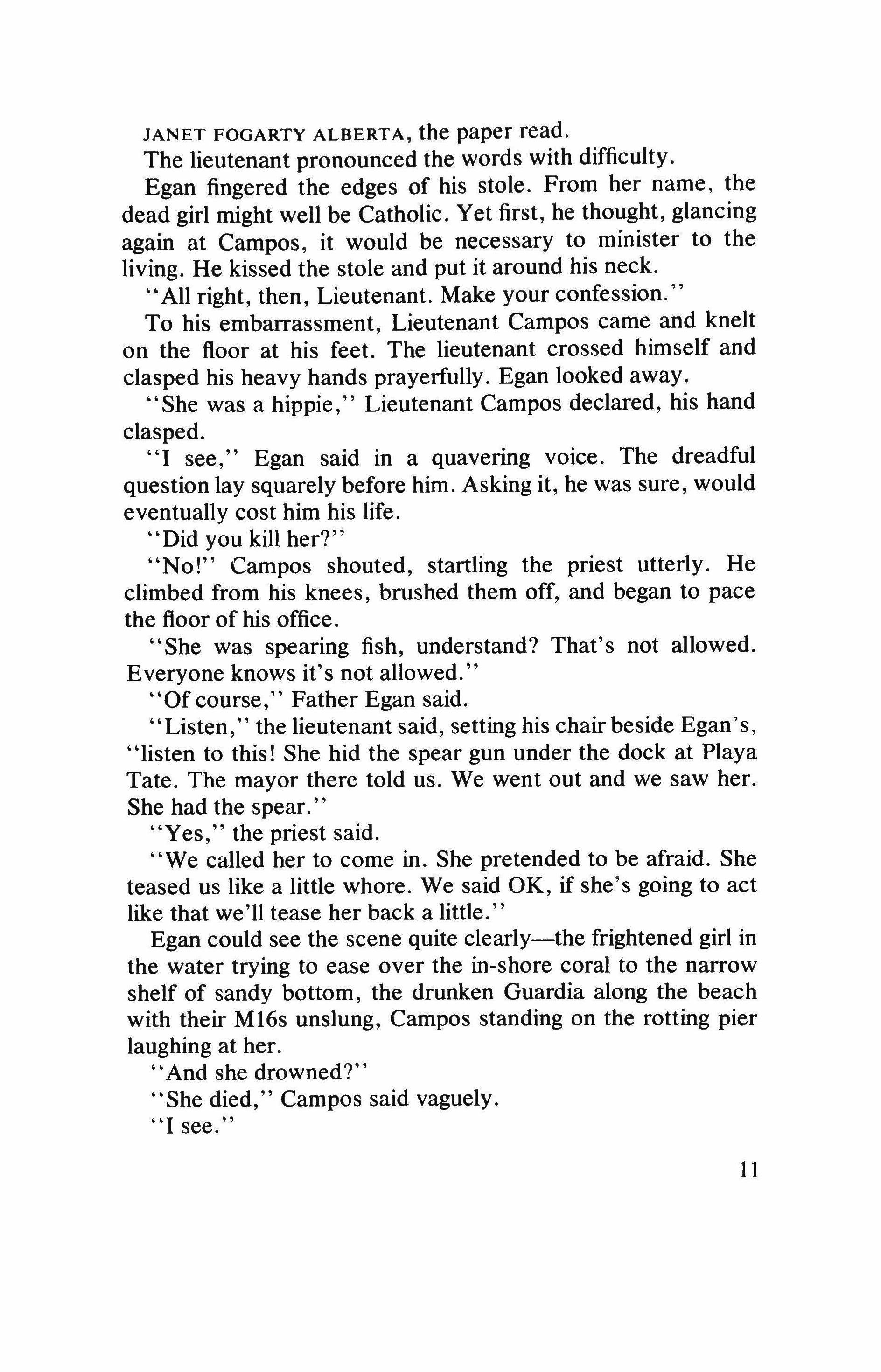 "Holy father," Lieutenant Campos said. He crossed himself and kissed his fingers as though Egan were an object of veneration. "Bless me, father," he said in Spanish. "Bless me, for I have sinned."