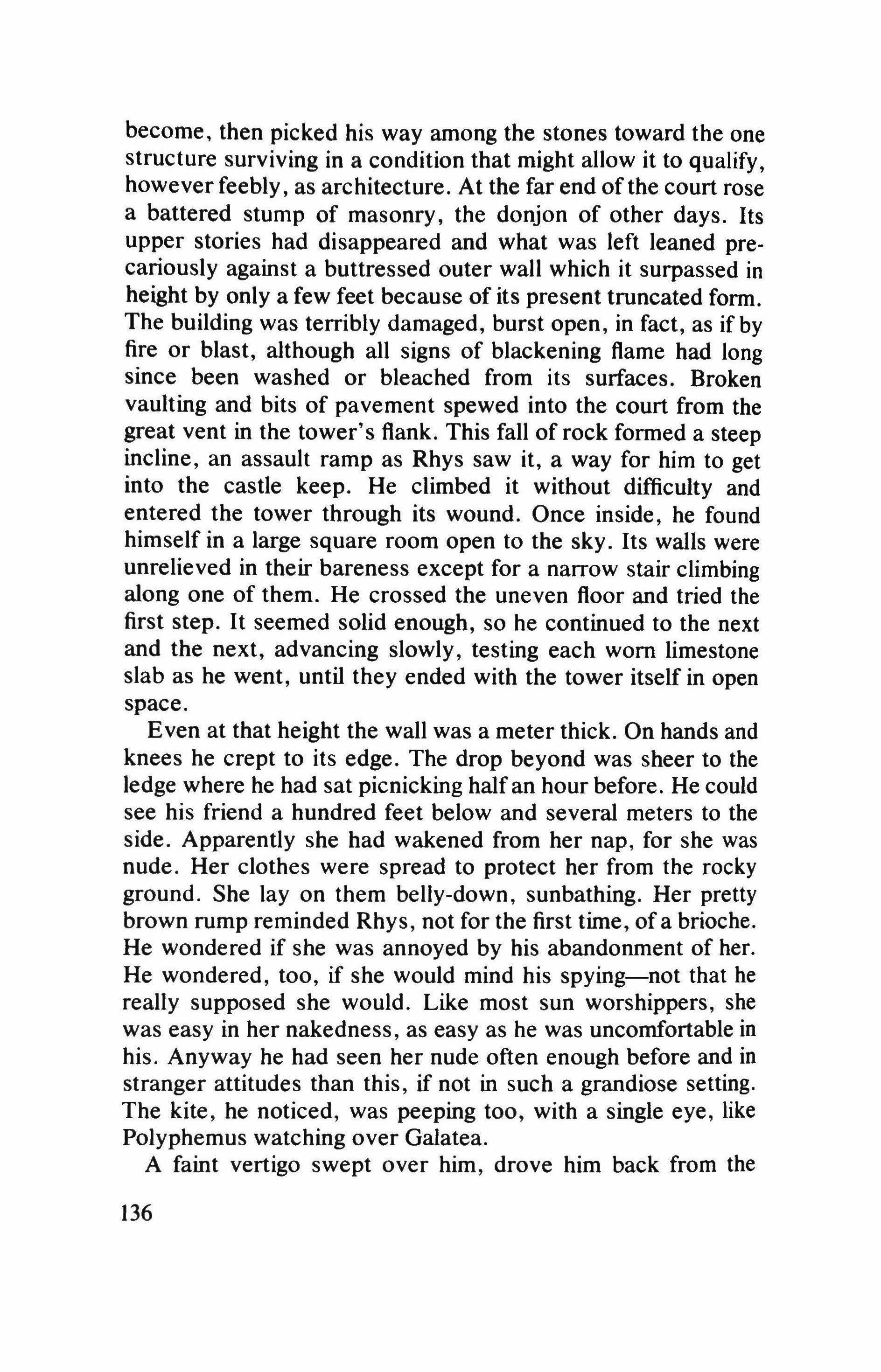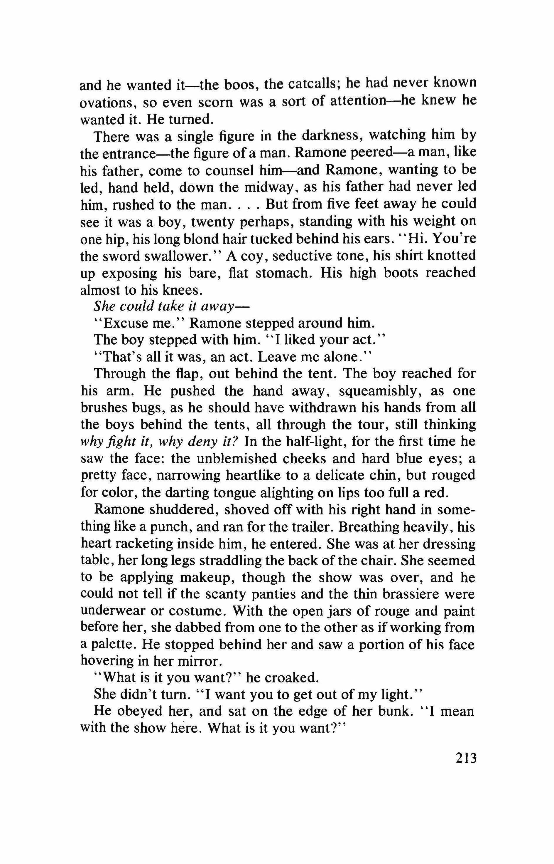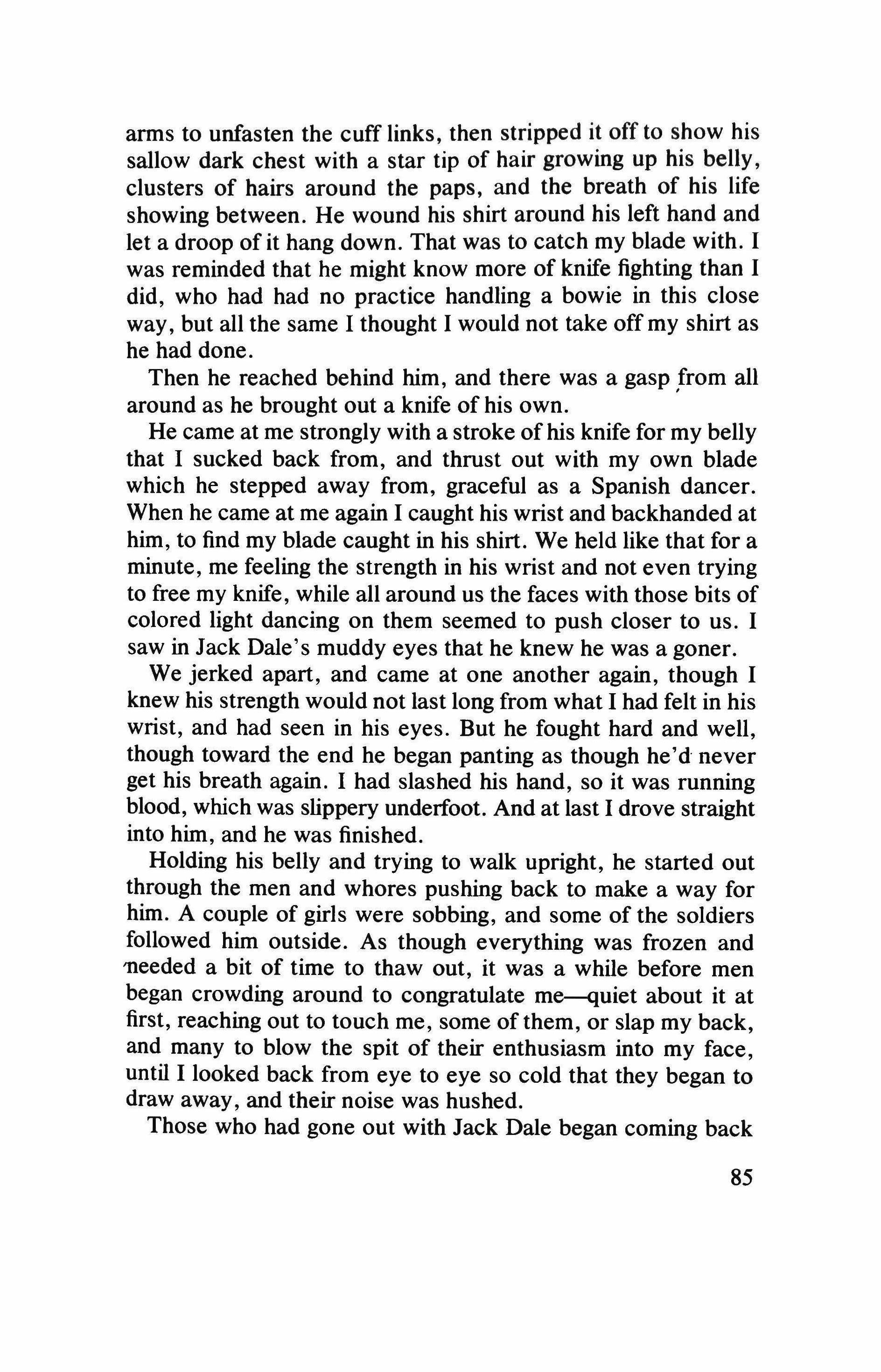 Yet the horrible word brought to his recollection a desperate, sodden night. He had been in town, in Morazon, and he had gotten tight. Something had happened in the bar of the Gran Atlantico Hotel. He remembered the lights of the bar and the lights of the street outside-a boy in a death's-head motorcycle cap, a European-looking boy with greasy long hair falling to his shoulders who shouted at him scornfully, "Maricon! Tu es maricon!"