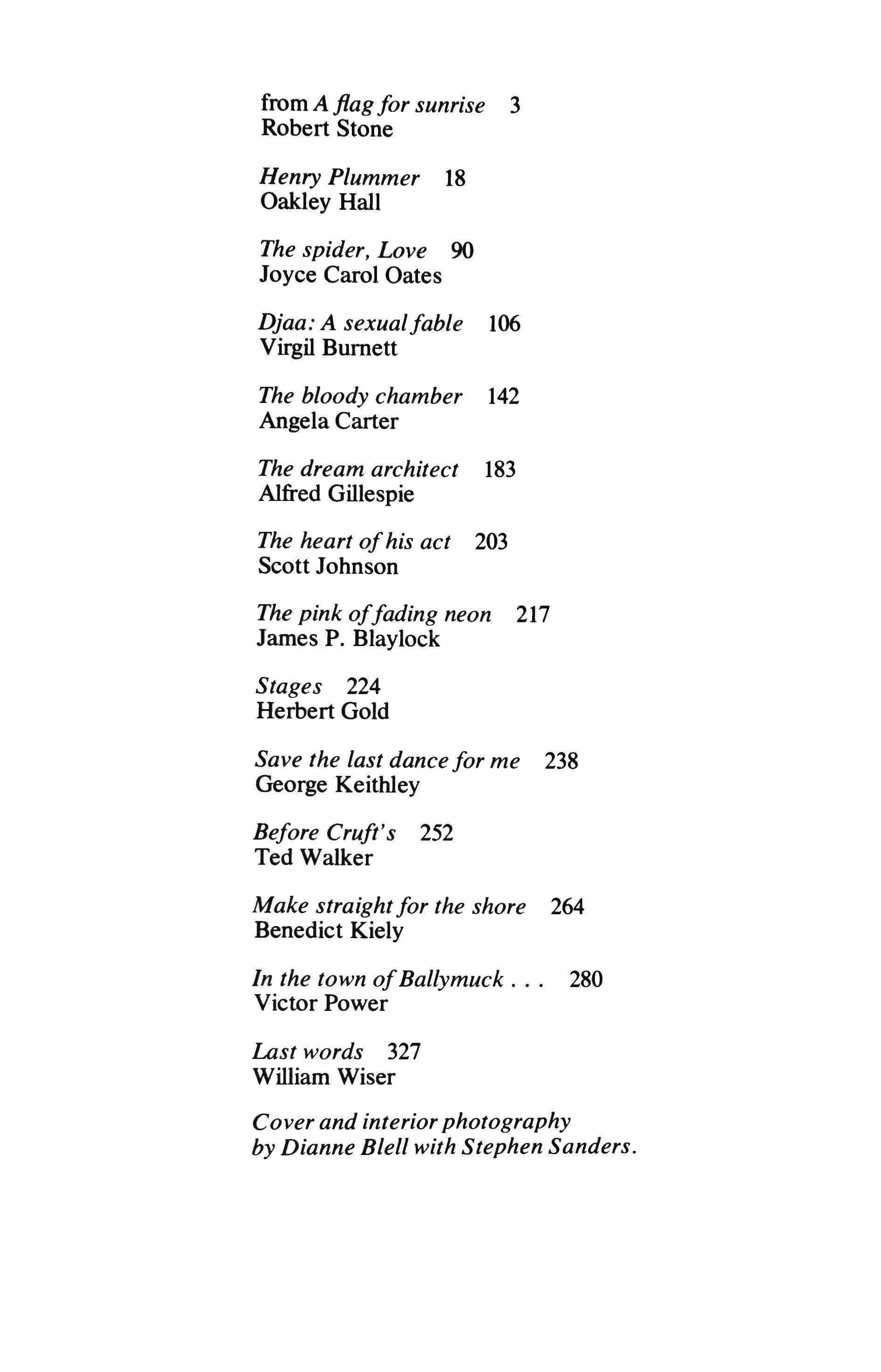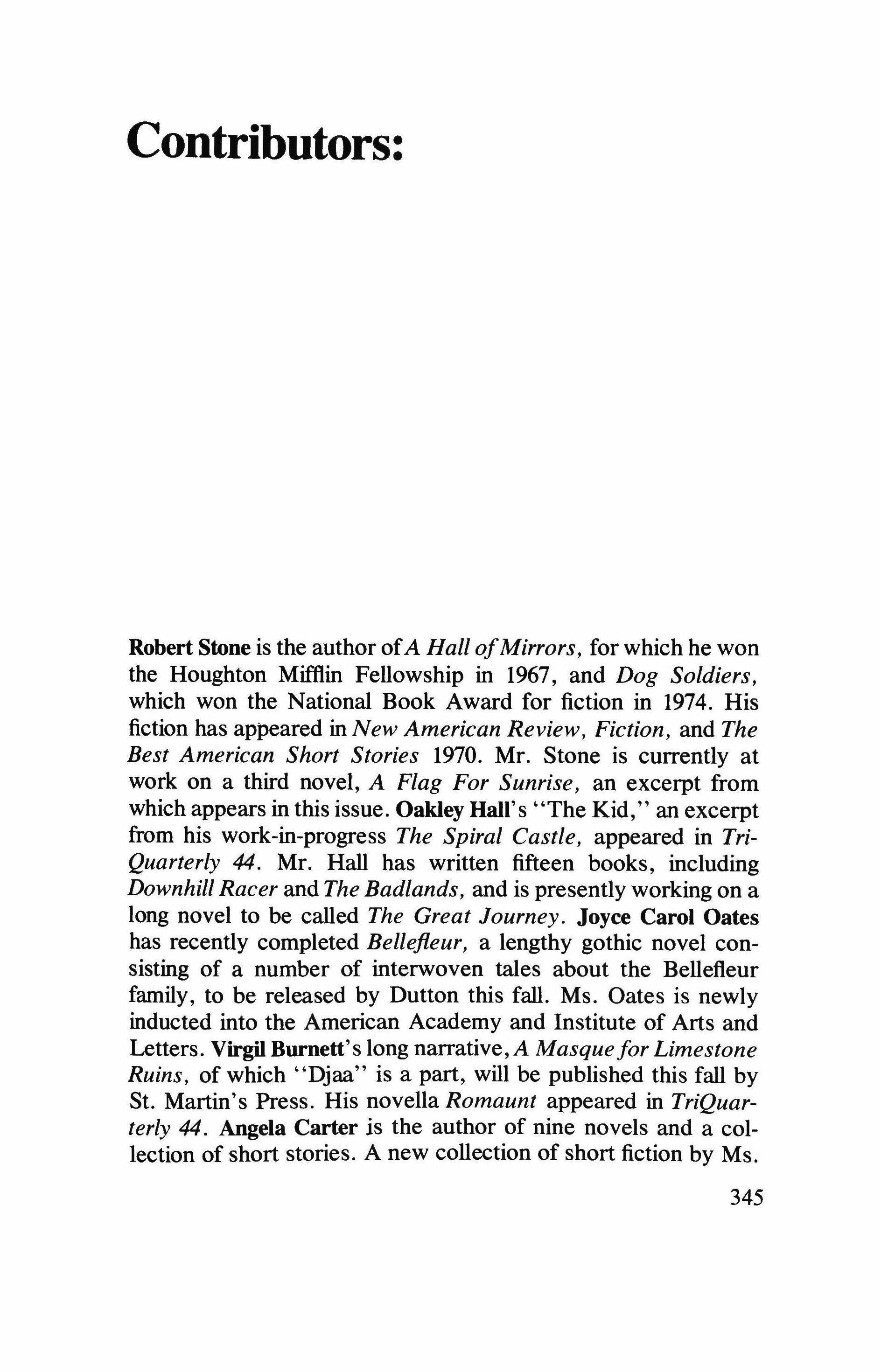 Robert Stone is the author ofA Hall ofMirrors for which he won the Houghton Mifflin Fellowship in 1967, and Dog Soldiers, which won the National Book Award for fiction in 1974. His fiction has appeared in New American Review, Fiction, and The Best American Short Stories 1970. Mr. Stone is currently at work on a third novel, A Flag For Sunrise, an excerpt from which appears in this issue. Oakley Hall's "The Kid," an excerpt from his work-in-progress The Spiral Castle, appeared in TriQuarterly 44. Mr. Hall has written fifteen books, including Downhill Racer and The Badlands, and is presently working on a long novel to be called The Great Journey. Joyce Carol Oates has recently completed Bellefleur, a lengthy gothic novel consisting of a number of interwoven tales about the Bellefteur family, to be released by Dutton this fall. Ms. Oates is newly inducted into the American Academy and Institute of Arts and Letters. Virgil Burnett's long narrative, A Masquefor Limestone Ruins, of which "Djaa" is a part, will be published this fall by St. Martin's Press. His novella Romaunt appeared in TriQuarterLy 44. Angela Carter is the author of nine novels and a collection of short stories. A new collection of short fiction by Ms. 345