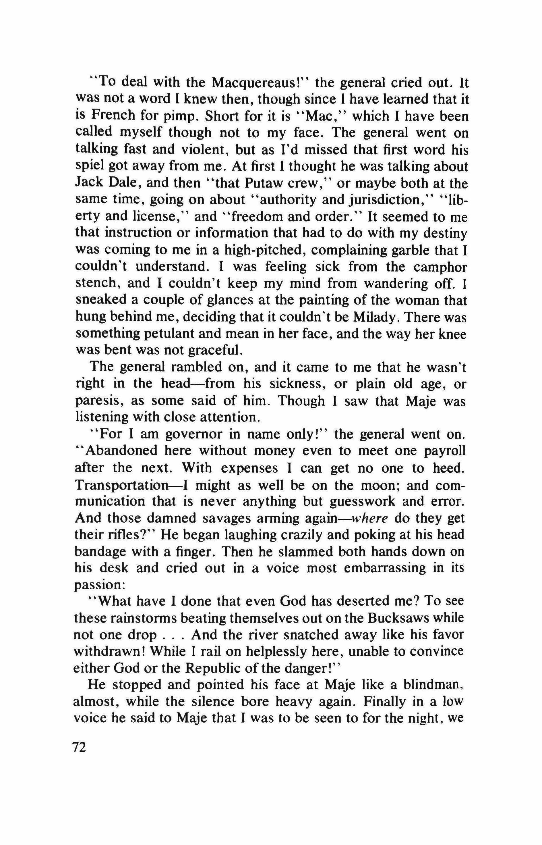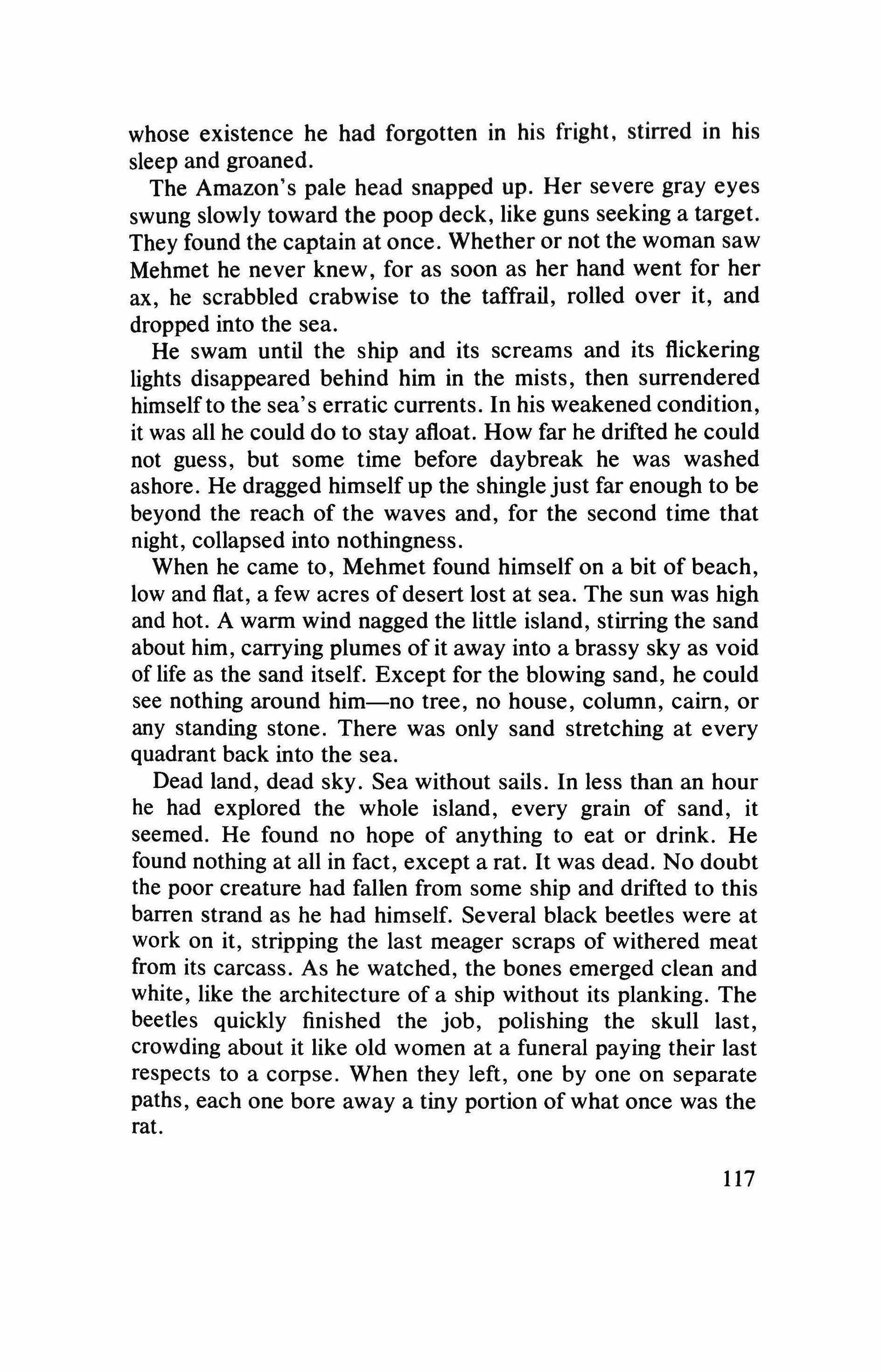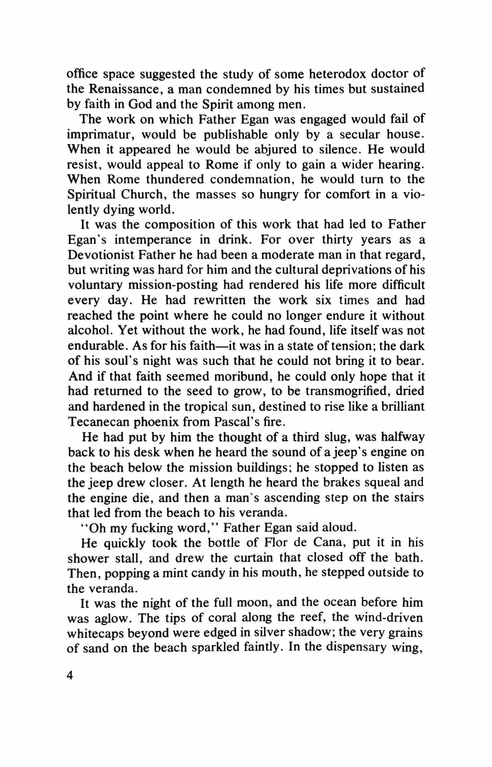 It was the composition of this work that had led to Father Egan's intemperance in drink. For over thirty years as a Devotionist Father he had been a moderate man in that regard, but writing was hard for him and the cultural deprivations of his voluntary mission-posting had rendered his life more difficult every day. He had rewritten the work six times and had reached the point where he could no longer endure it without alcohol. Yet without the work, he had found, life itself was not endurable. As for his faith-it was in a state oftension; the dark of his soul's night was such that he could not bring it to bear. And if that faith seemed moribund, he could only hope that it had returned to the seed to grow, to be transmogrified, dried and hardened in the tropical sun, destined to rise like a brilliant Tecanecan phoenix from Pascal's fire.