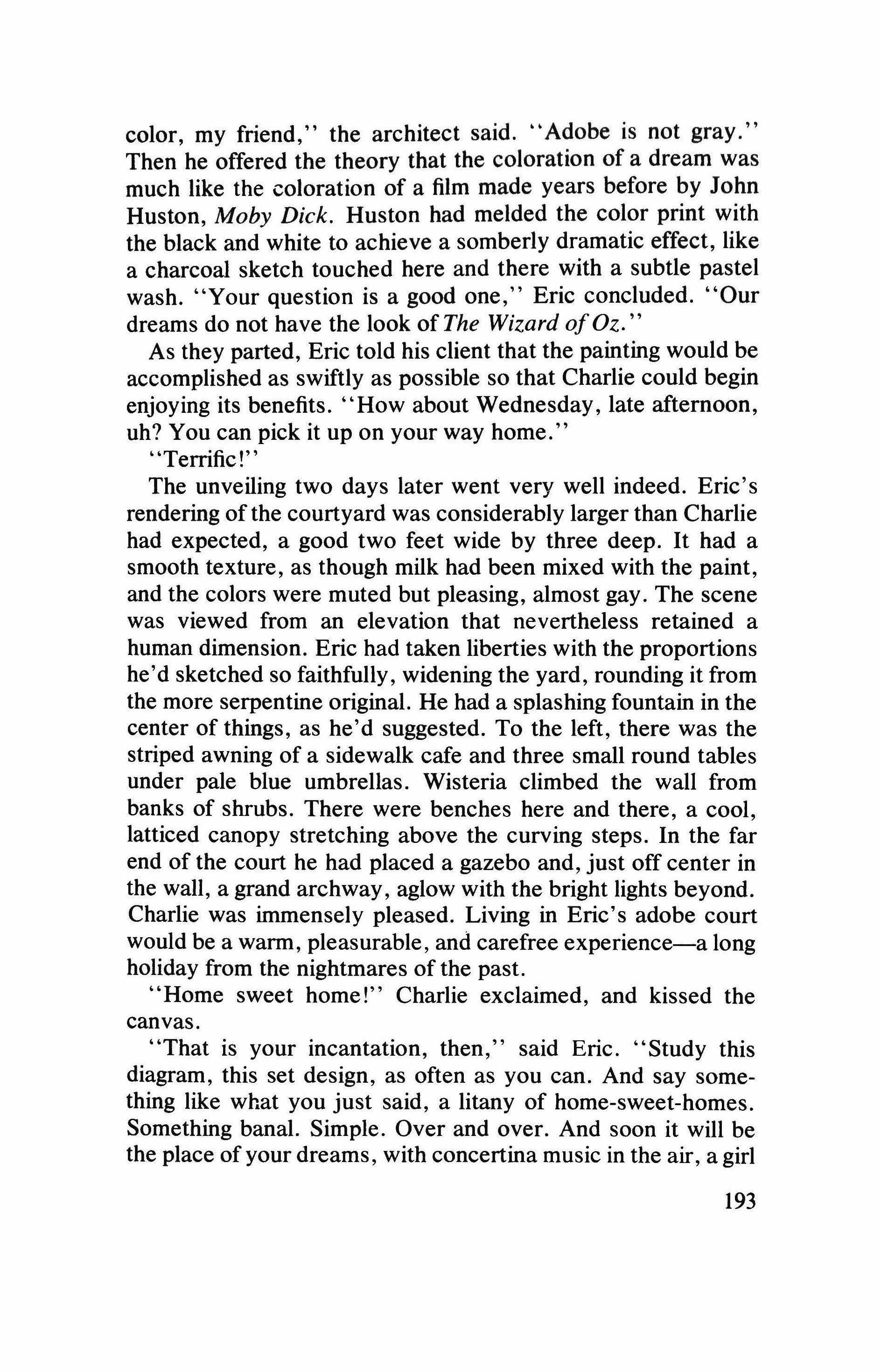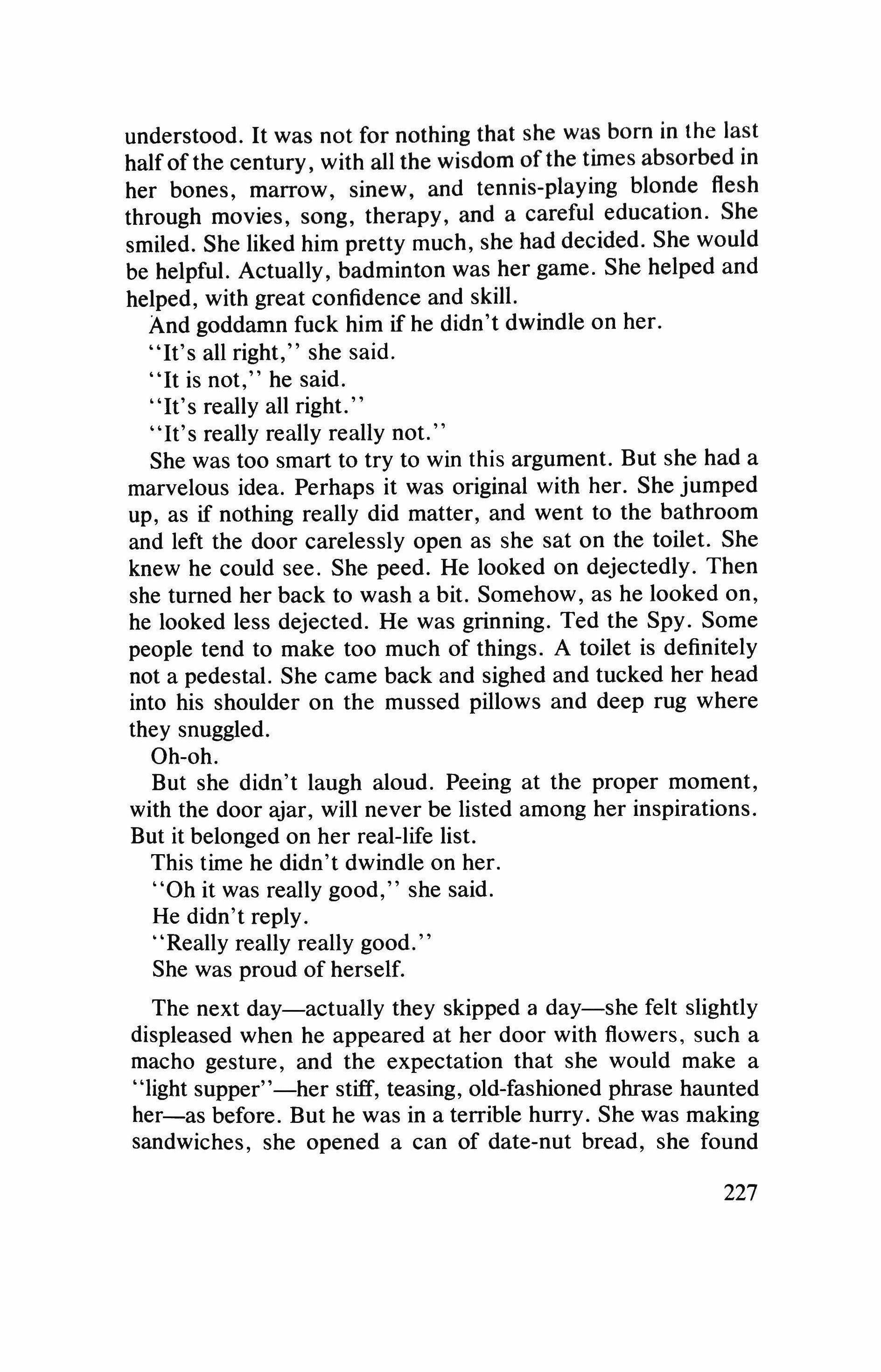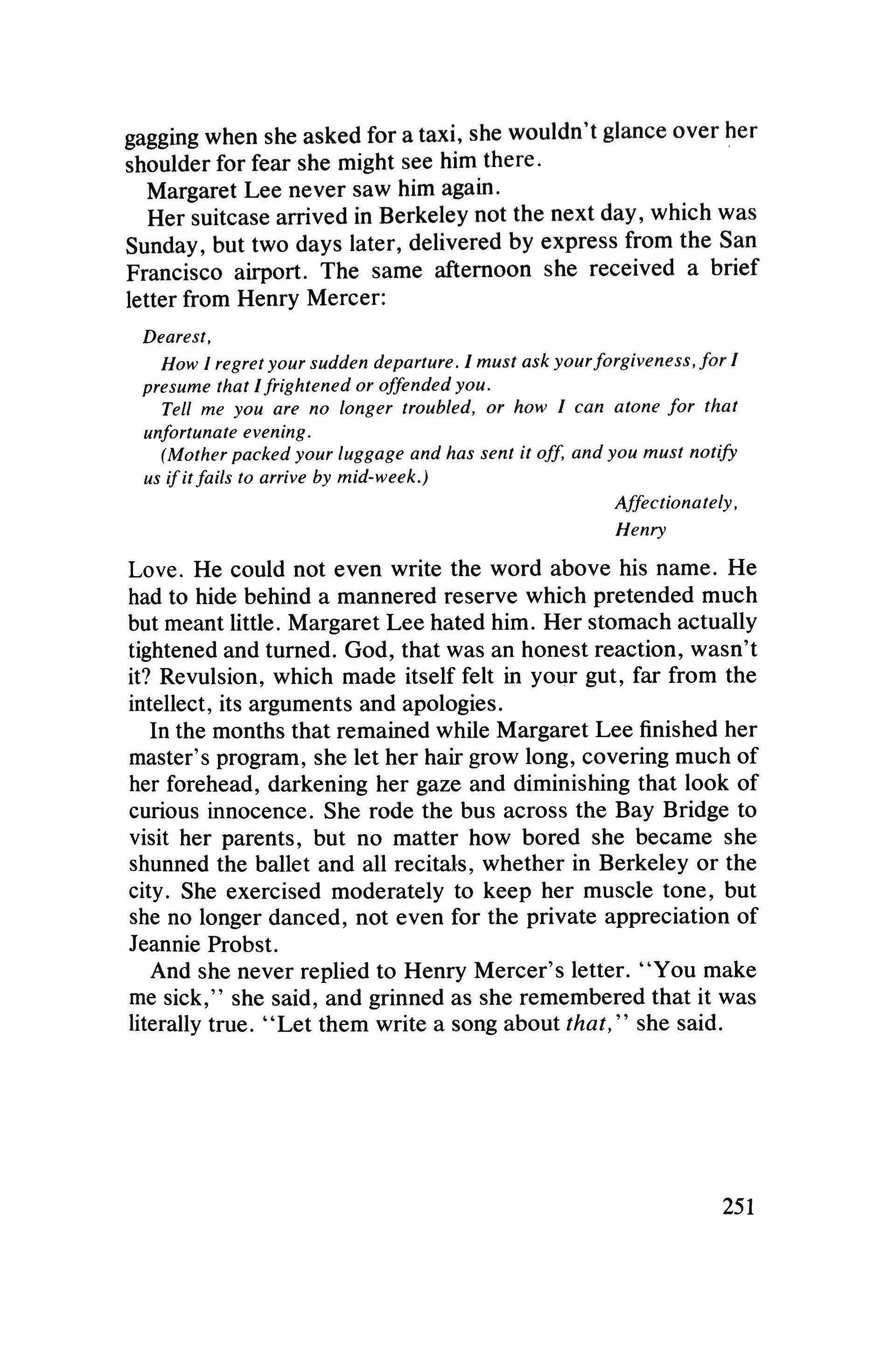 The notion to leave this house to an unborn babeeverything I have, as little as it is-is the last foolish wish in a lifetime of foolish wishes. It is true, as Miss Stein once informed me, that I am at home in a world of four corners. My imagination stops short of the stars. My own life produced neither art nor progeny, and now I allow myself the sentimental indulgence of letting go.