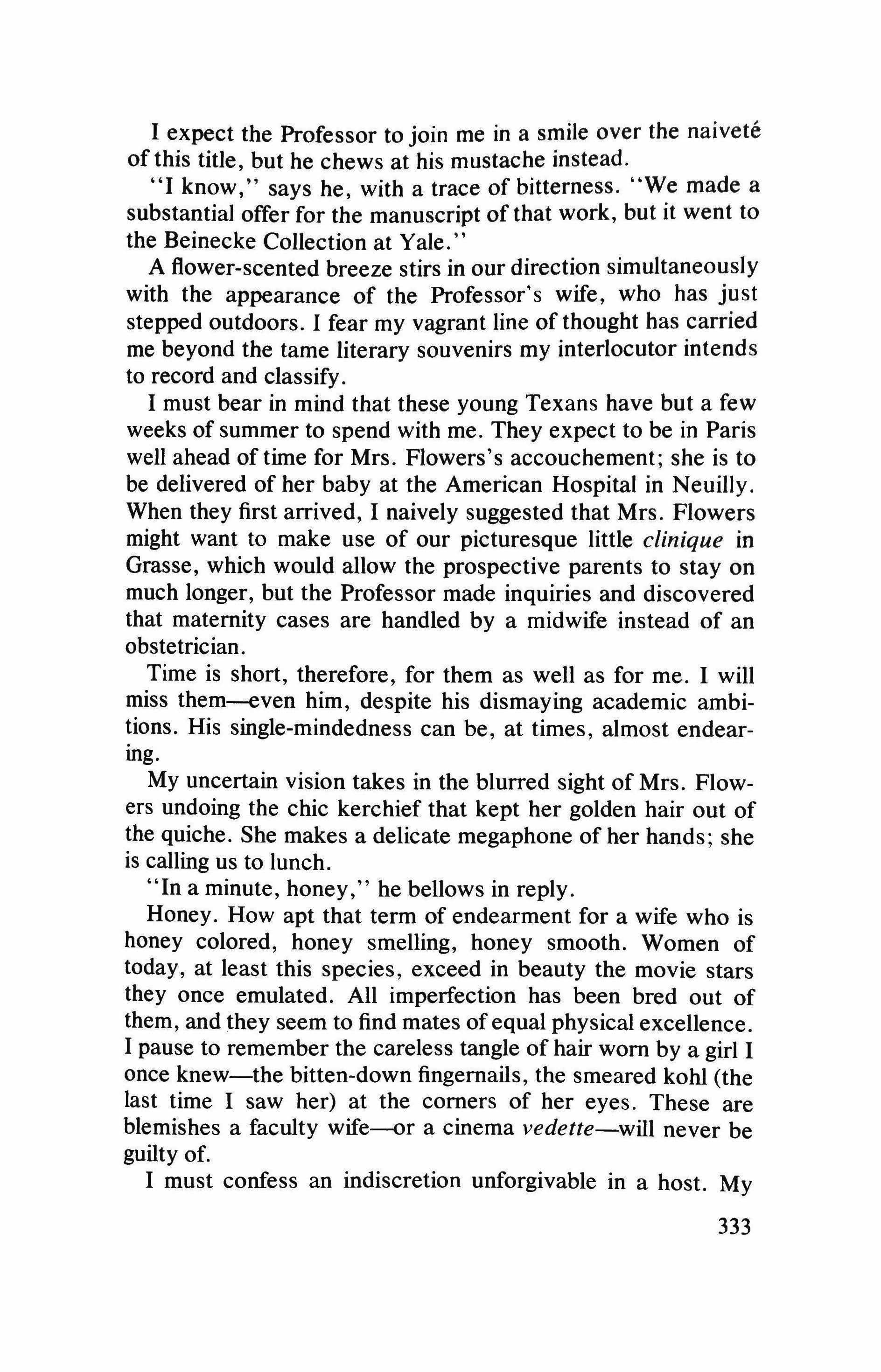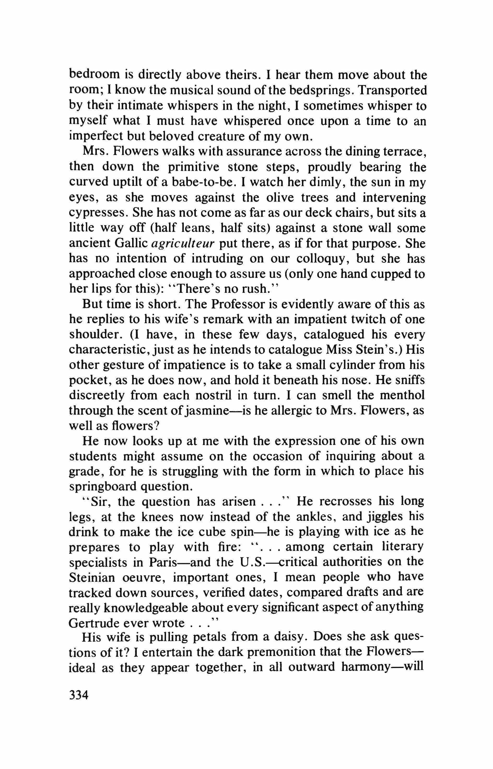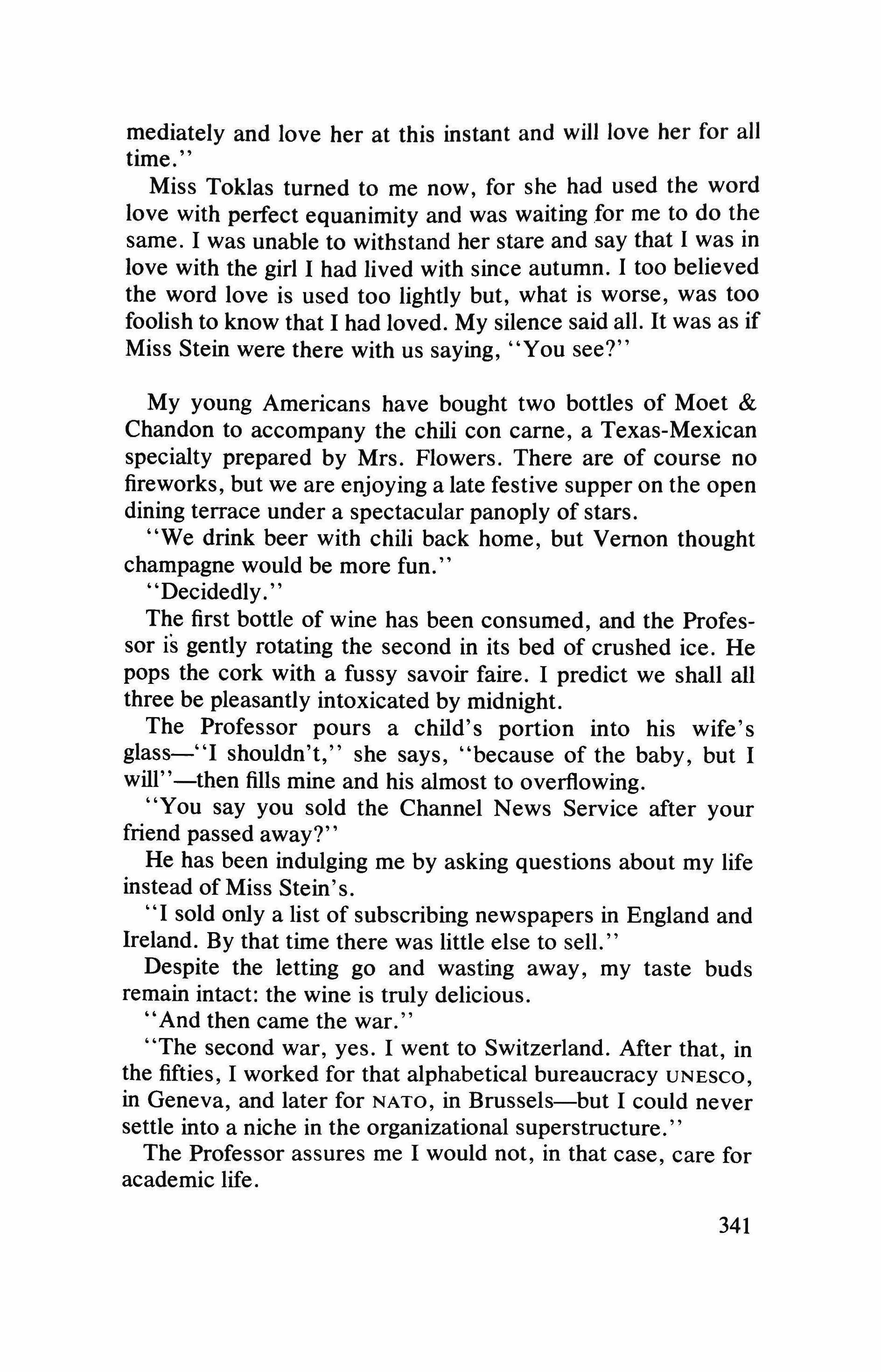 I wave the money away. His university library is welcome to bury the French translation of Miss Stein's detective novel in its archives, gratis. As he pours more wine, I am tempted to believe the champagne flows for ulterior reasons, but must try to think better of him than that. The tape recorder has been put away; he pursues no indelicate inquiry about Miss Stein. I will assume he has truly taken a holiday from his sabbatical task.