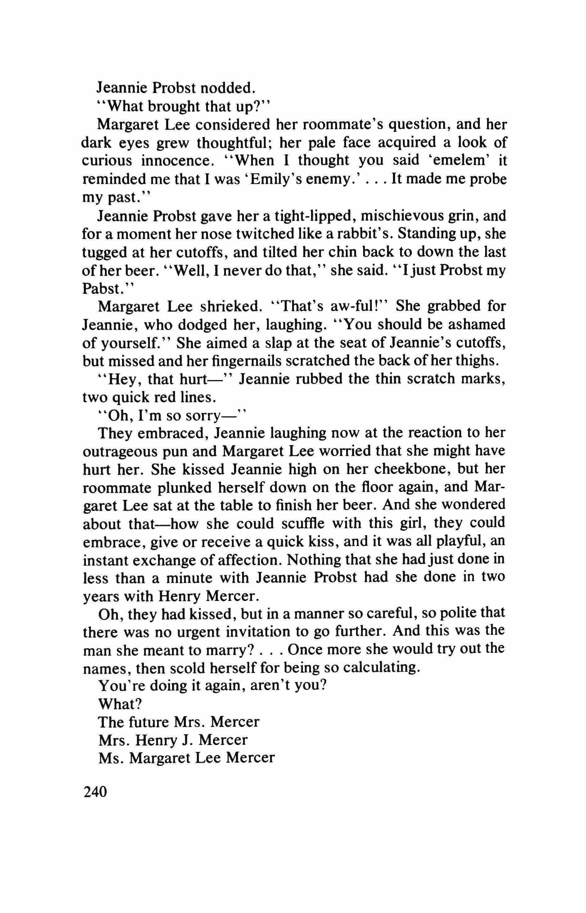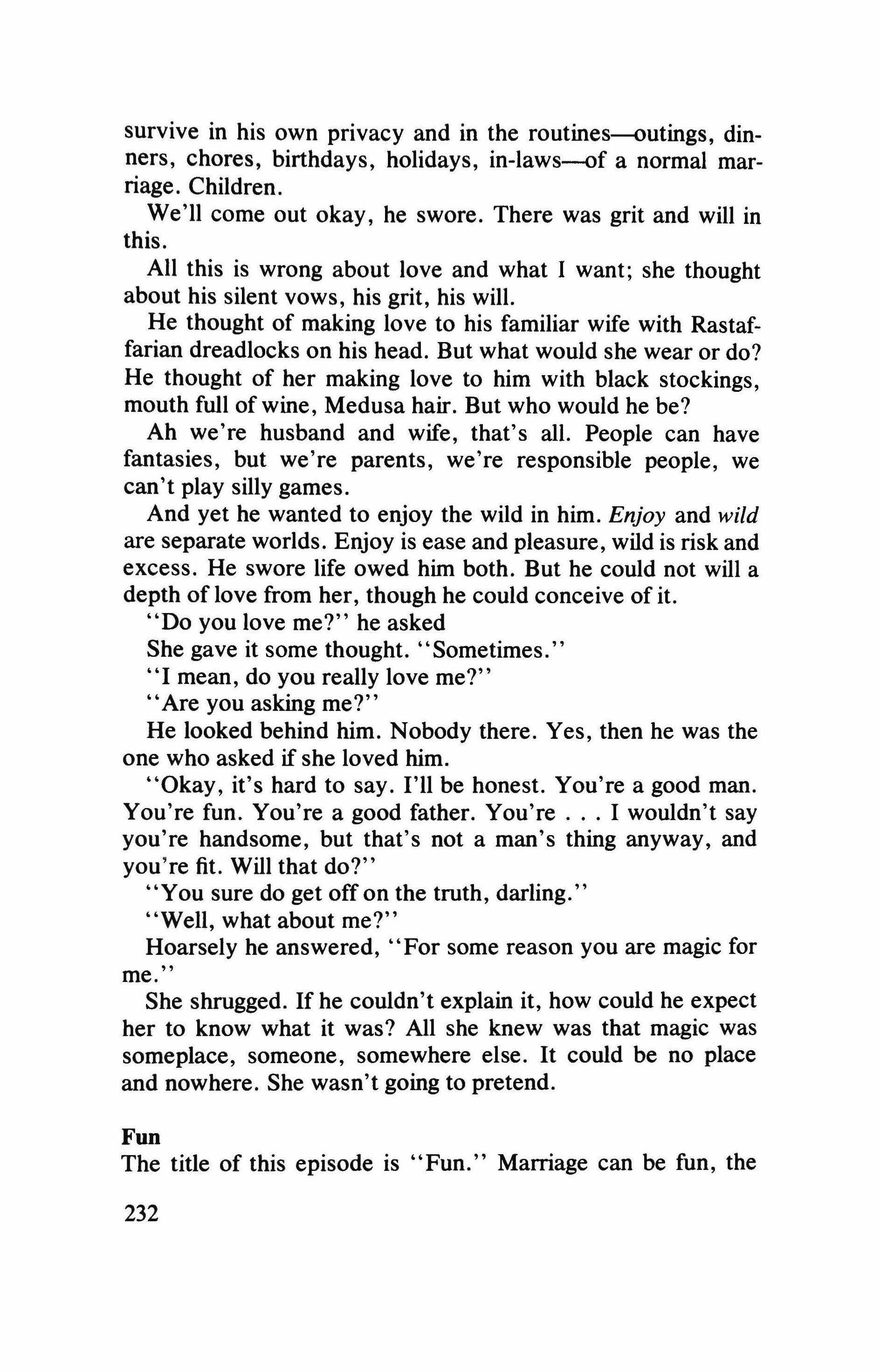 "Did you ever go back to the United States?" he asks, while she, on the strength of the wine, ventures to inquire, Or want to get married?"