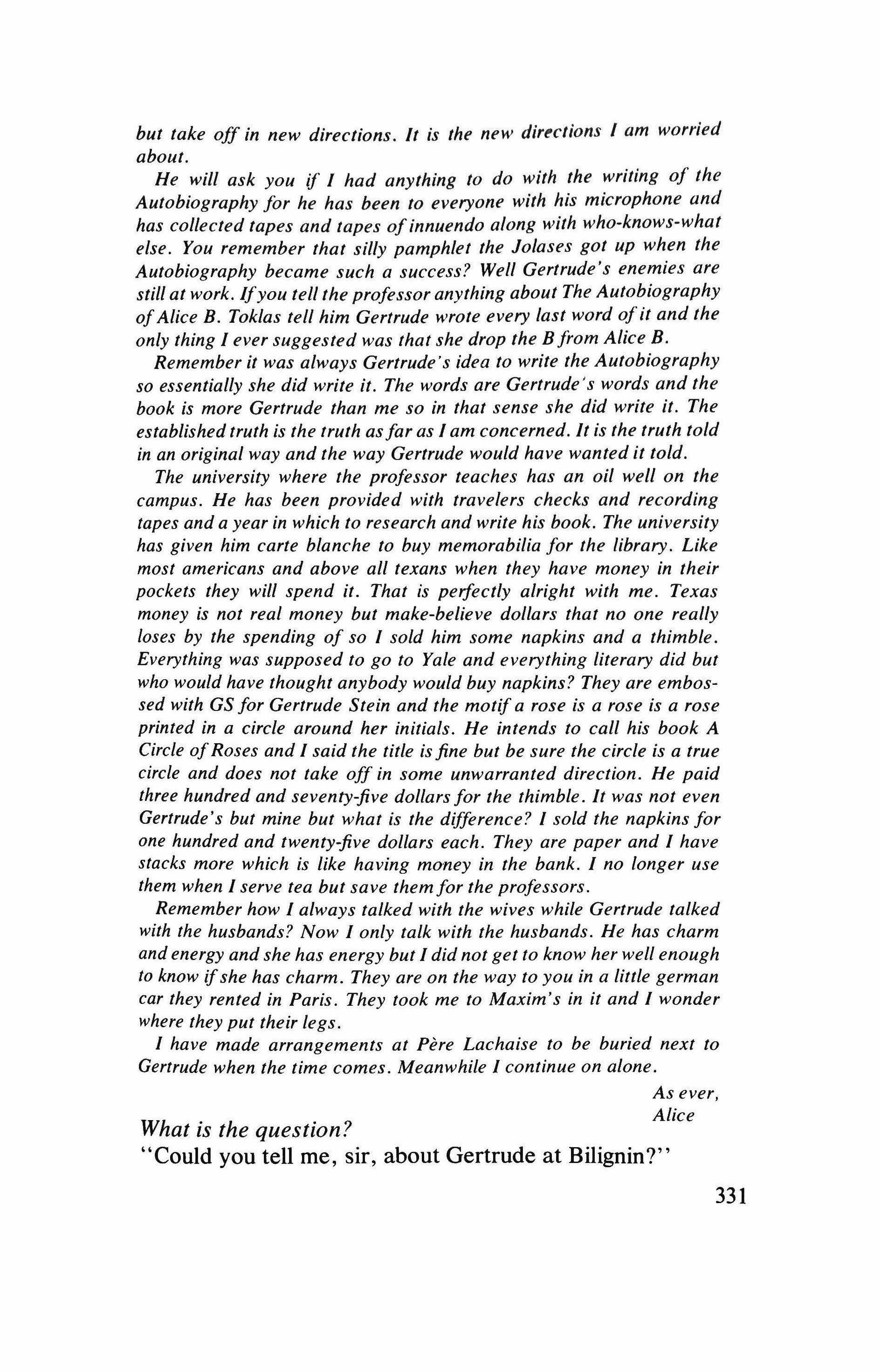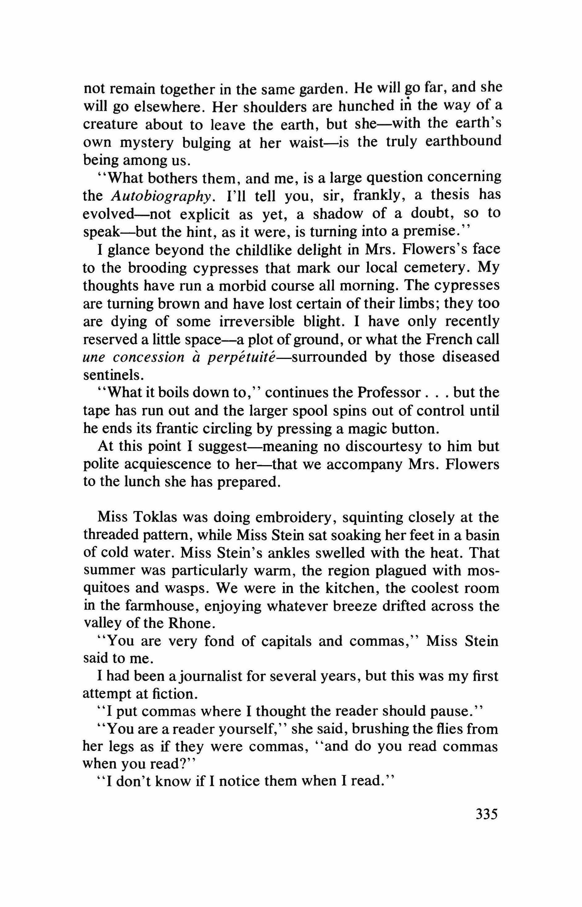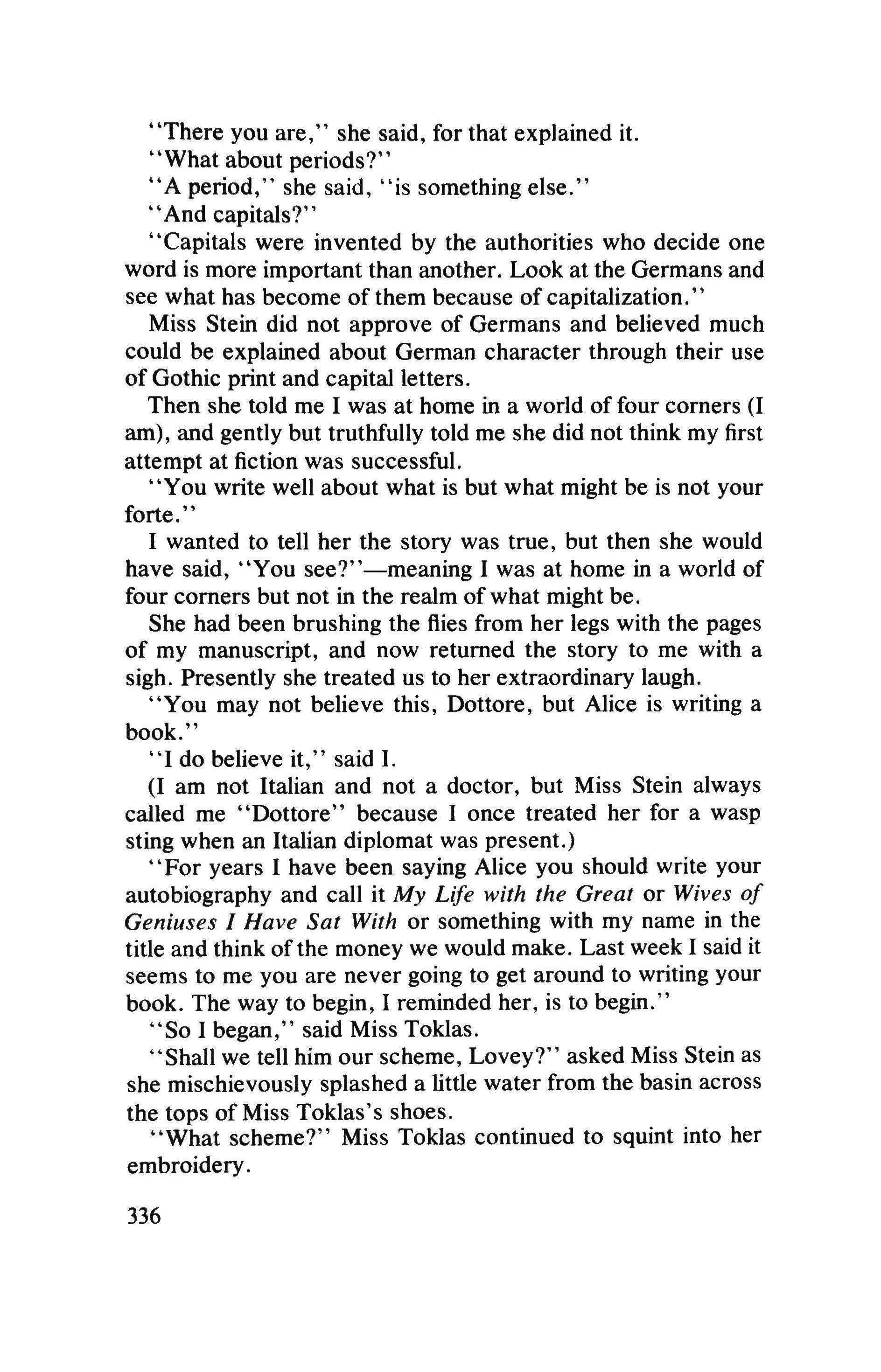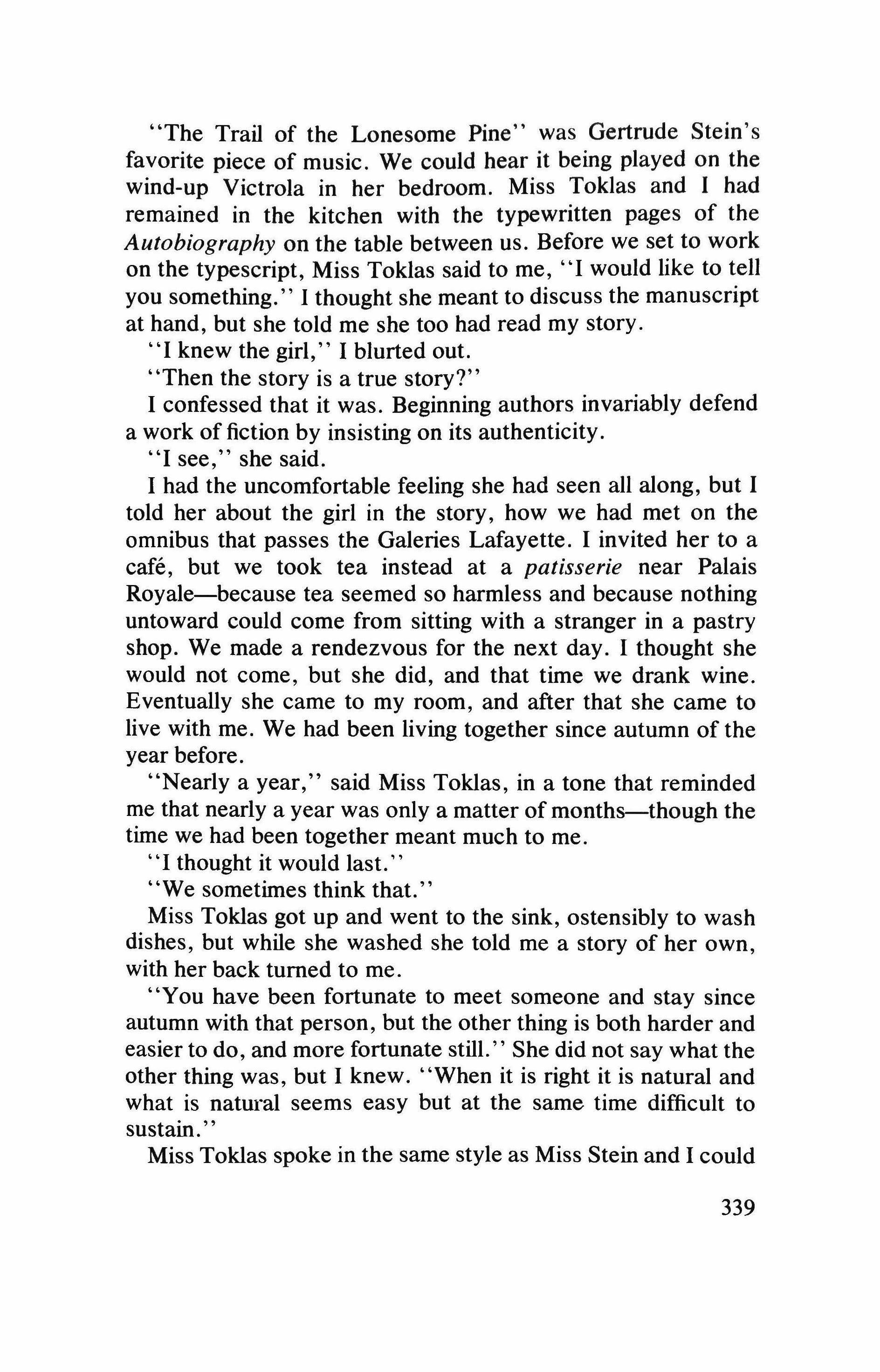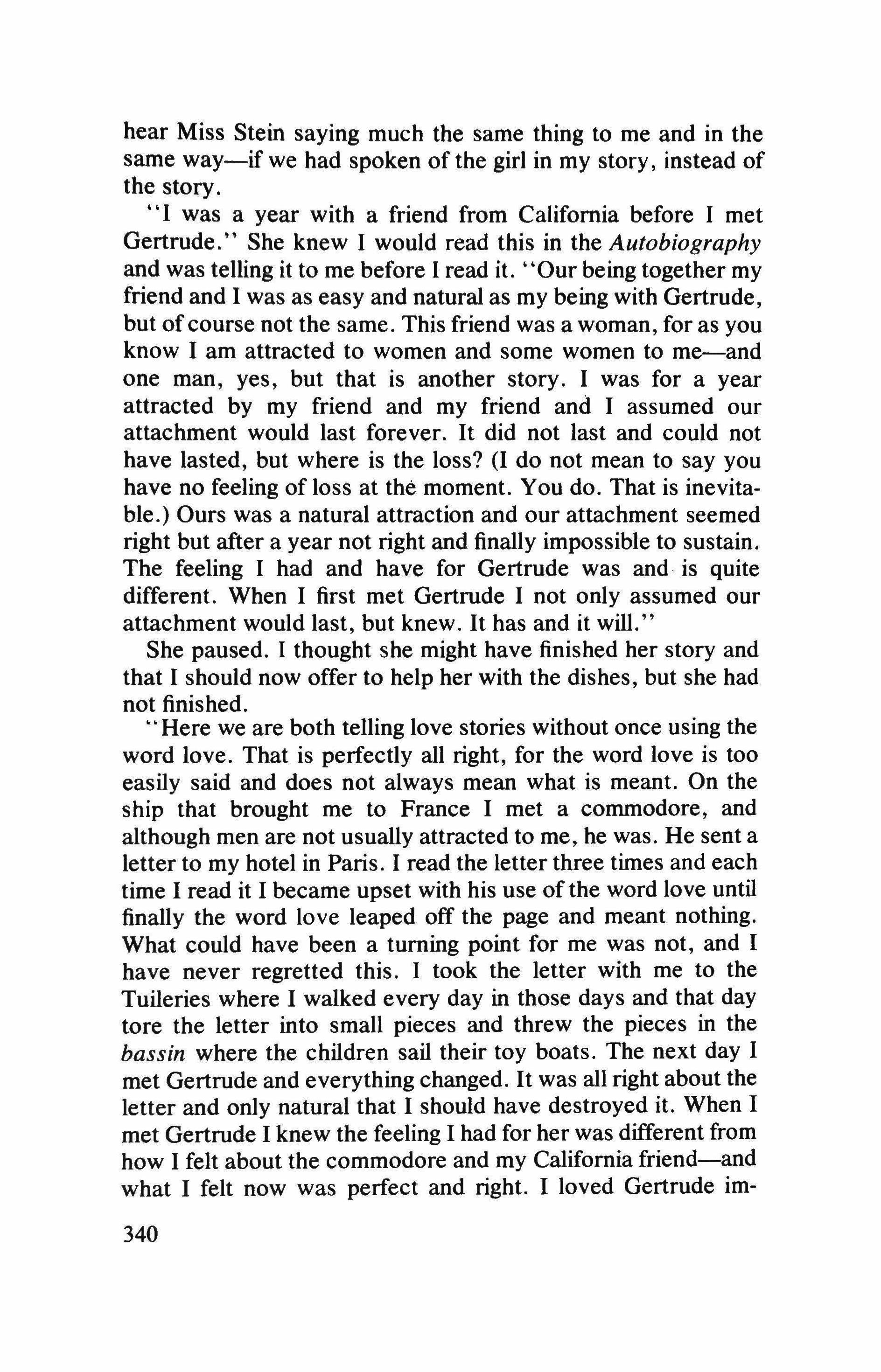 Here we are both telling love stories without once using the word love. That is perfectly all right, for the word love is too easily said and does not always mean what is meant. On the ship that brought me to France 1 met a commodore, and although men are not usually attracted to me, he was. He sent a letter to my hotel in Paris. 1 read the letter three times and each time 1 read it 1 became upset with his use of the word love until finally the word love leaped off the page and meant nothing. What could have been a turning point for me was not, and 1 have never regretted this. I took the letter with me to the Tuileries where 1 walked every day in those days and that day tore the letter into small pieces and threw the pieces in the bassin where the children sail their toy boats. The next day 1 met Gertrude and everything changed. It was all right about the letter and only natural that 1 should have destroyed it. When 1 met Gertrude 1 knew the feeling 1 had for her was different from how 1 felt about the commodore and my California friend-and what 1 felt now was perfect and right. 1 loved Gertrude im-