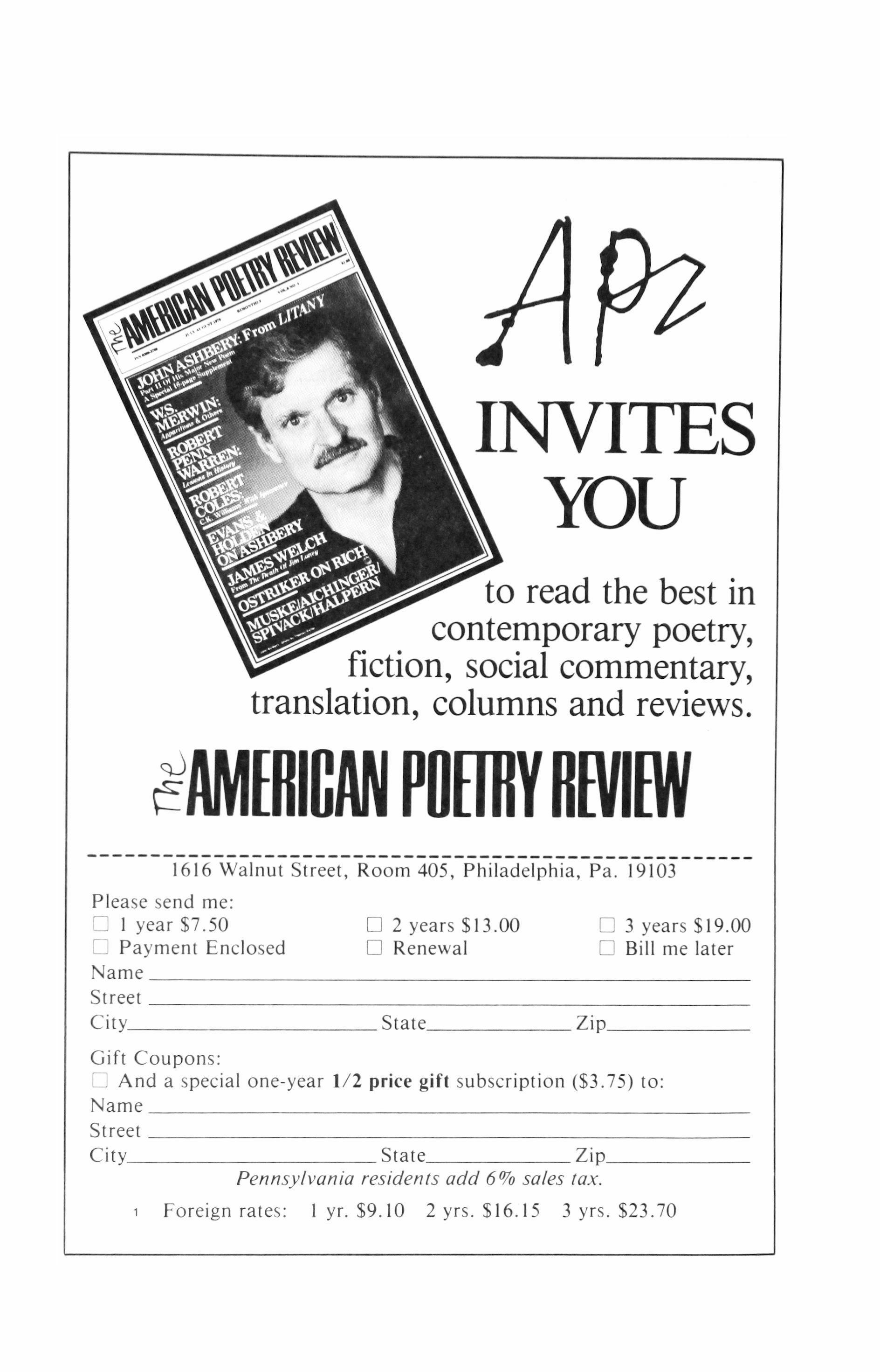 Subscription rates: One year $12.00; two years $20.00; three years $30.00. Foreign subscriptions $1.00 per year additional. Single copies usually $5.95. Back issue prices on request. Contributions, correspondence, and subscriptions should be addressed to TriQuarterly, 1735 Benson Avenue, Northwestern University, Evanston, Illinois 60201. The editors invite submissions, but queries are strongly suggested. No manuscripts will be returned unless accompanied by a stamped, self-addressed envelope. All manuscripts accepted for publication become the property of TriQuarterly, unless otherwise indicated. Copyright © 1980 by TriQuarterly. All rights reserved. The views expressed in this magazine are to be attributed to the writers, not the editors or sponsors. Printed in the United States of America. Claims for missing numbers will be honored only within the four-month period after month of issue.