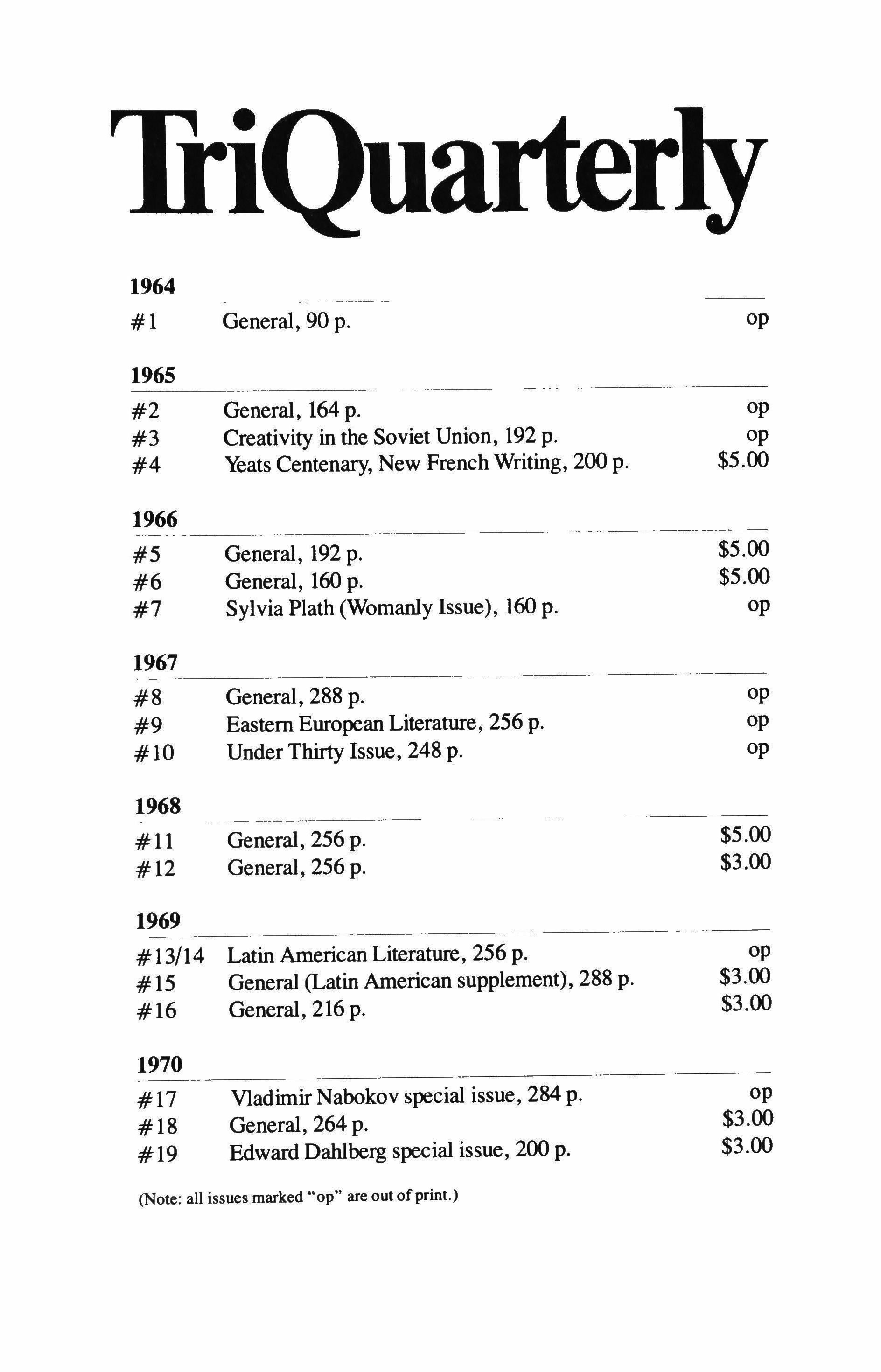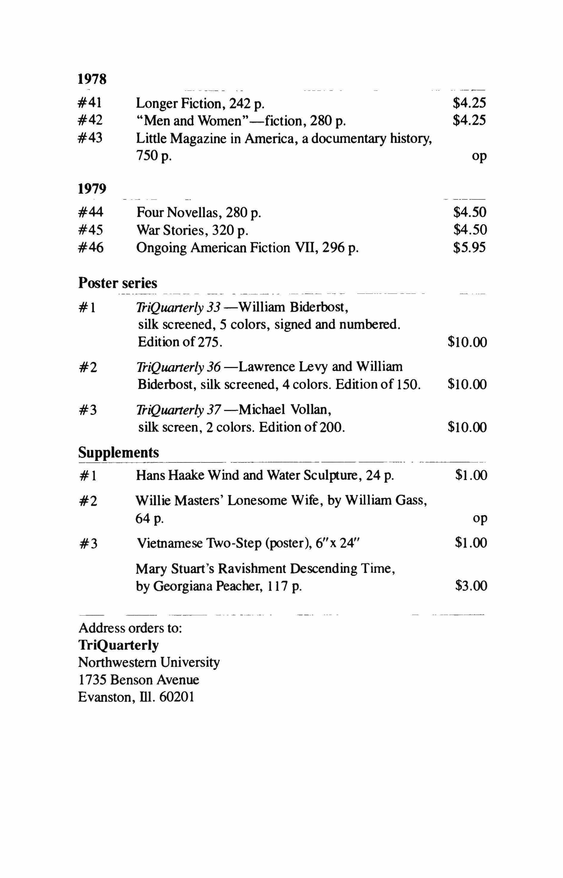 Address orders to: TriQuarterly Northwestern University 1735 Benson Avenue Evanston, ID. 60201