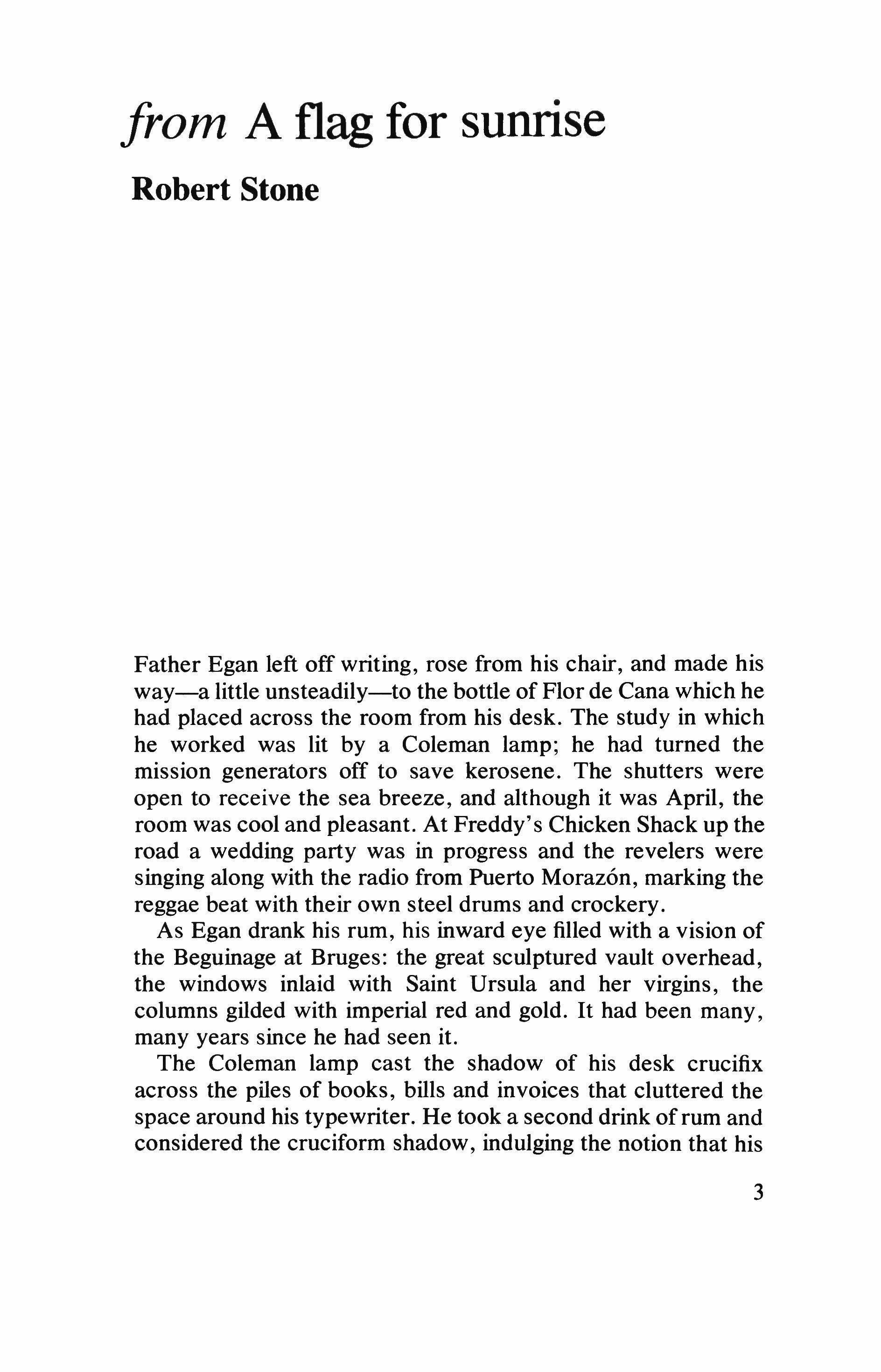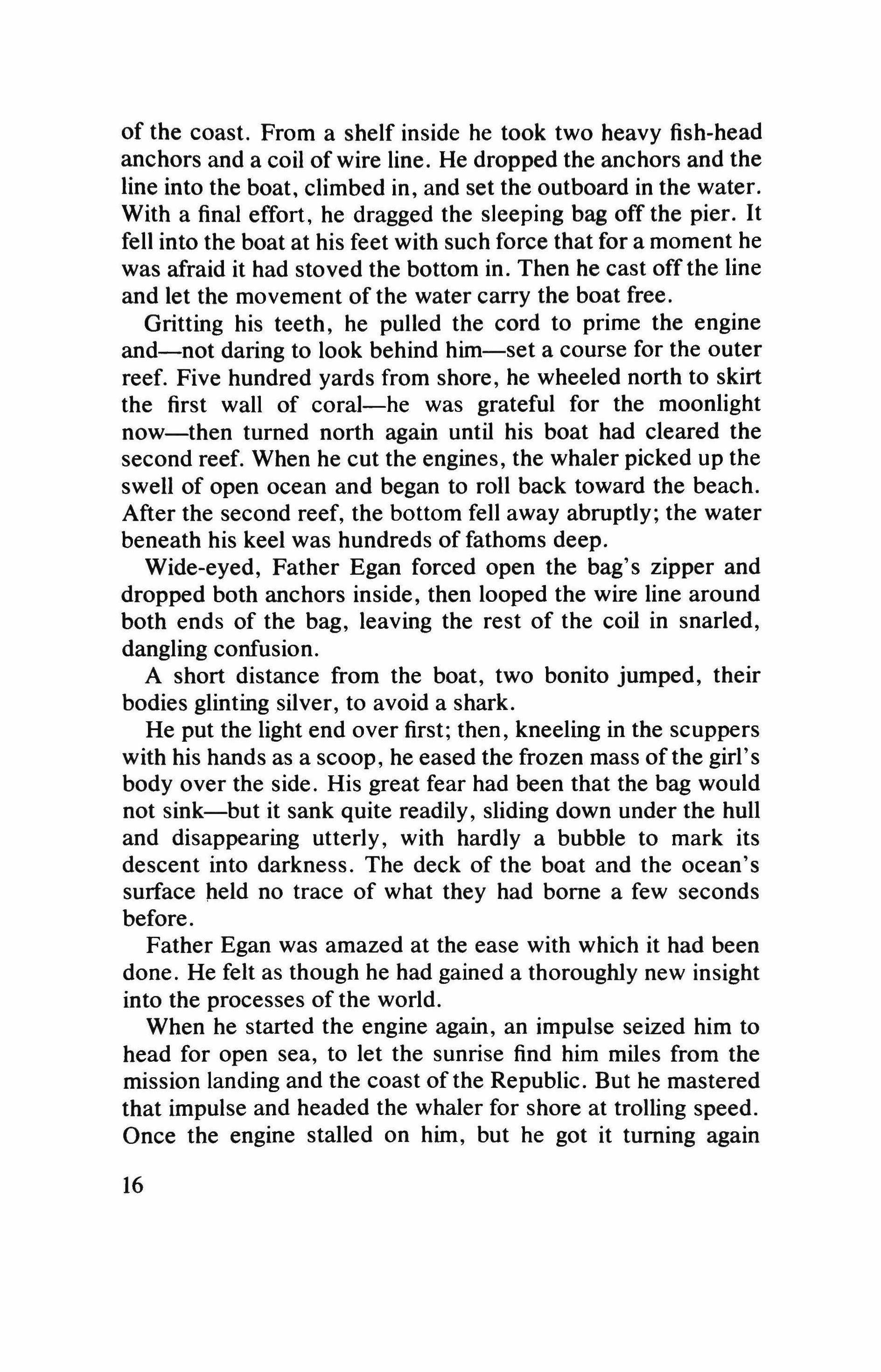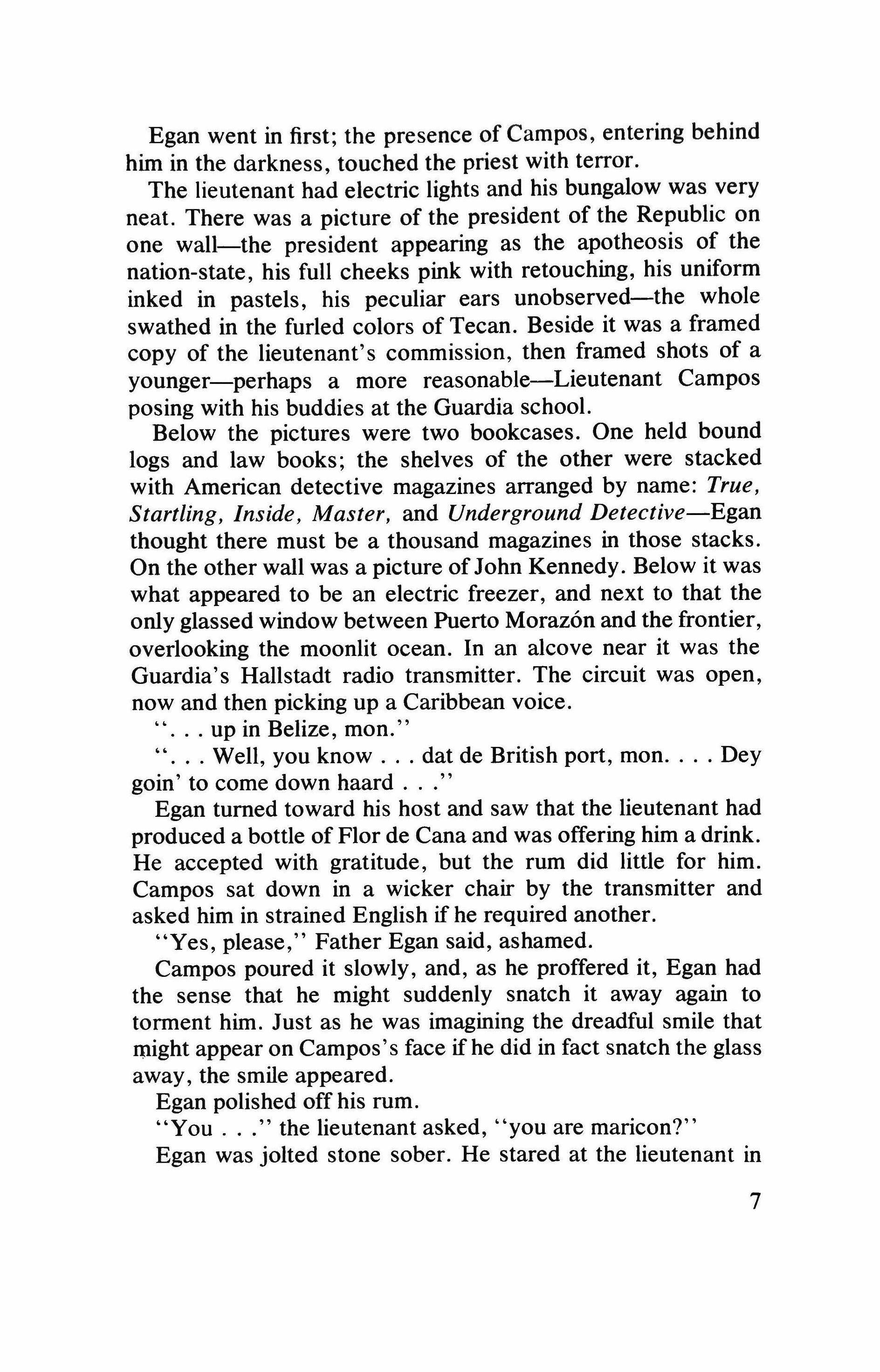 Father Egan left off writing, rose from his chair, and made his way-a little unsteadily-to the bottle of Flor de Cana which he had placed across the room from his desk. The study in which he worked was lit by a Coleman lamp; he had turned the mission generators off to save kerosene. The shutters were open to receive the sea breeze, and although it was April, the room was cool and pleasant. At Freddy's Chicken Shack up the road a wedding party was in progress and the revelers were singing along with the radio from Puerto Morazon, marking the reggae beat with their own steel drums and crockery.