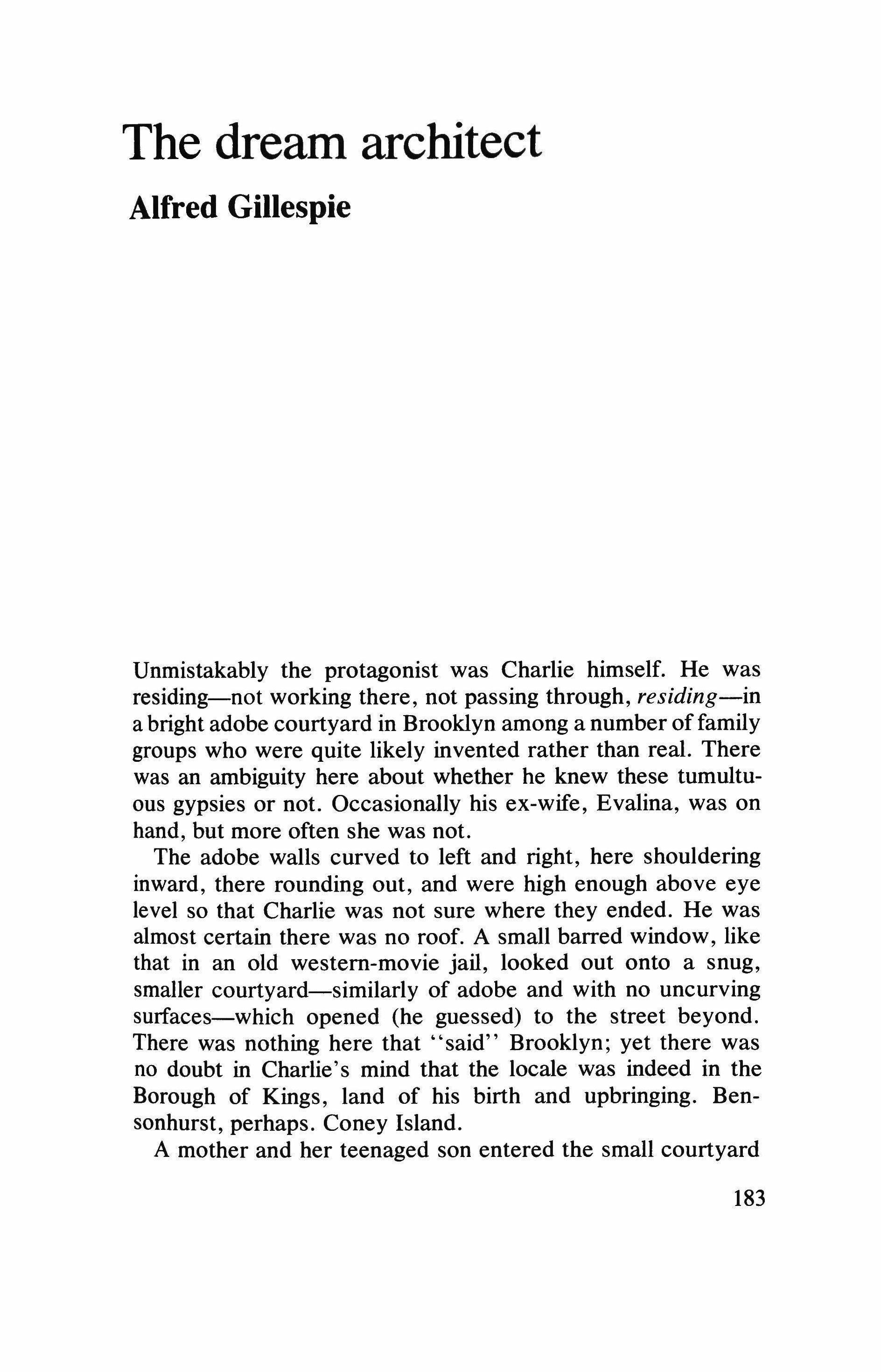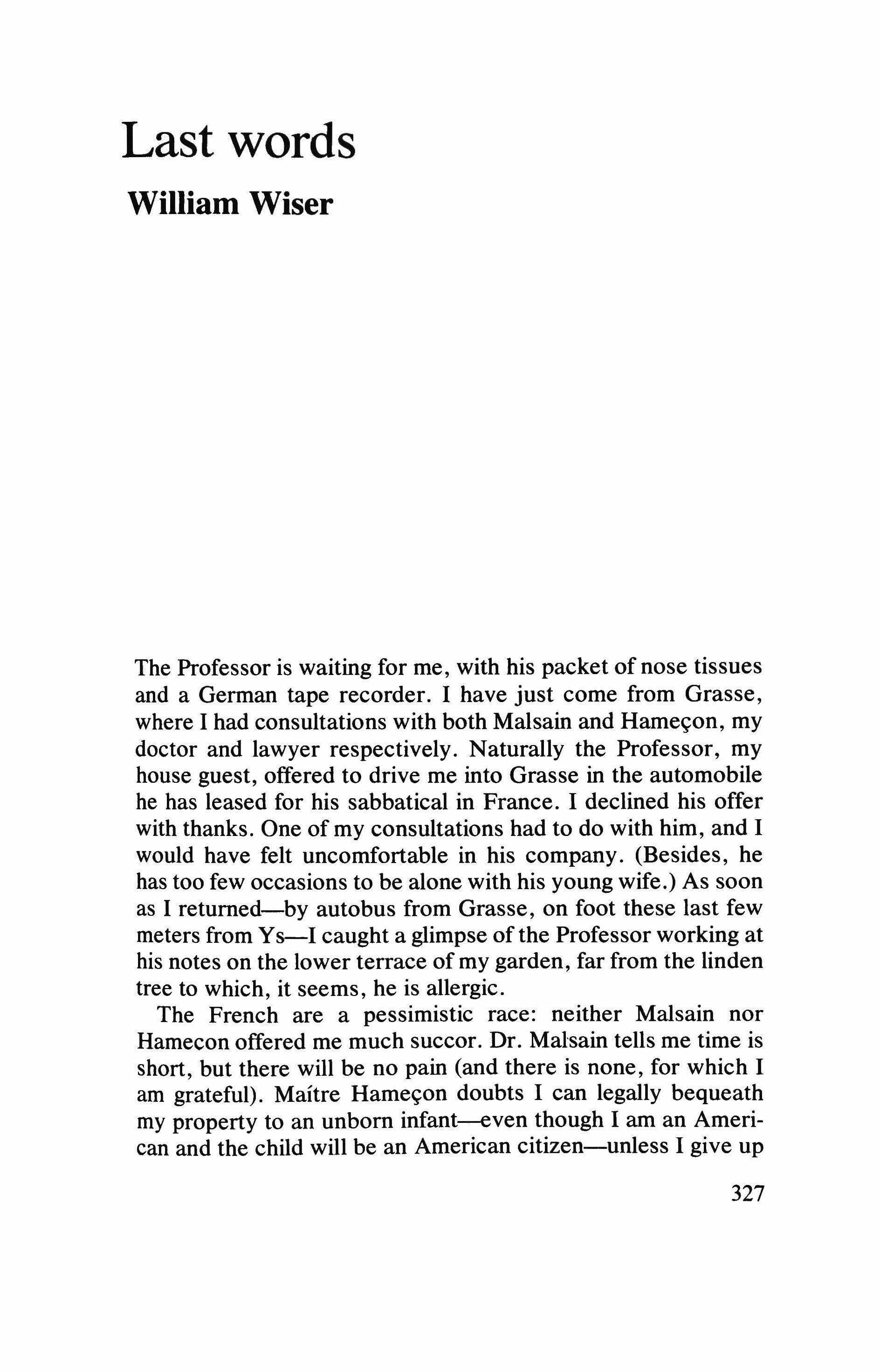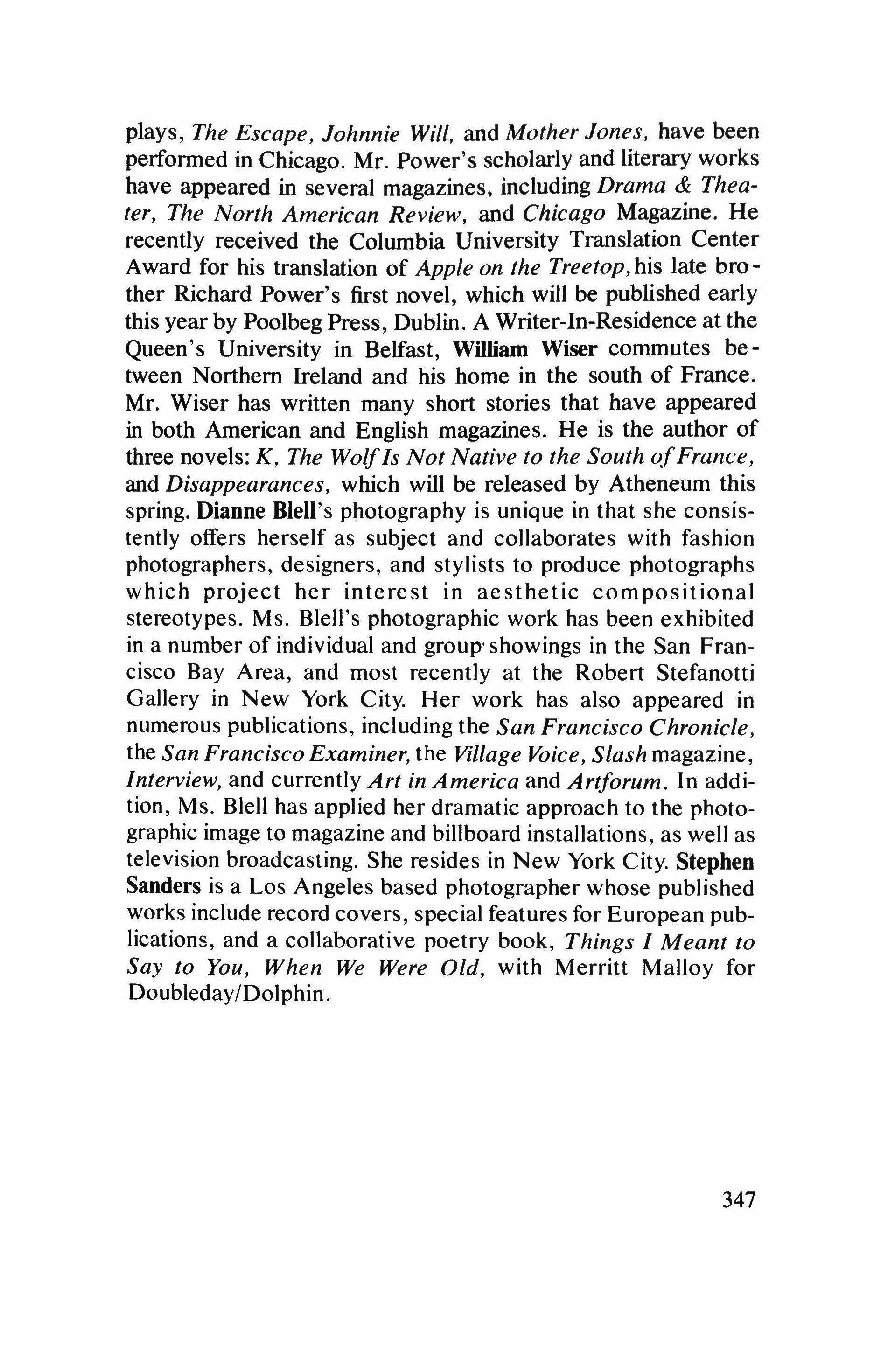 plays, The Escape, Johnnie Will, and Mother Jones, have been performed in Chicago. Mr. Power's scholarly and literary works have appeared in several magazines, including Drama & Theater, The North American Review, and Chicago Magazine. He recently received the Columbia University Translation Center Award for his translation of Apple on the Treetop,his late brother Richard Power's first novel, which will be published early this year by Poolbeg Press, Dublin. A Writer-In-Residence at the Queen's University in Belfast, William Wiser commutes between Northern Ireland and his home in the south of France. Mr. Wiser has written many short stories that have appeared in both American and English magazines. He is the author of three novels: K, The WolfIs Not Native to the South ofFrance, and Disappearances, which will be released by Atheneum this spring. Dianne Bleil's photography is unique in that she consistently offers herself as subject and collaborates with fashion photographers, designers, and stylists to produce photographs which project her interest in aesthetic compositional stereotypes. Ms. Bleil's photographic work has been exhibited in a number of individual and group' showings in the San Francisco Bay Area, and most recently at the Robert Stefanotti Gallery in New York City. Her work has also appeared in numerous publications, including the San Francisco Chronicle, the San Francisco Examiner, the Village Voice, Slash magazine, Interview, and currently Art in America and Artforum. In addition, Ms. Bleil has applied her dramatic approach to the photographic image to magazine and billboard installations, as well as television broadcasting. She resides in New York City. Stephen Sanders is a Los Angeles based photographer whose published works include record covers, special features for European publications, and a collaborative poetry book, Things I Meant to Say to You, When We Were Old, with Merritt Malloy for Doubleday/Dolphin.