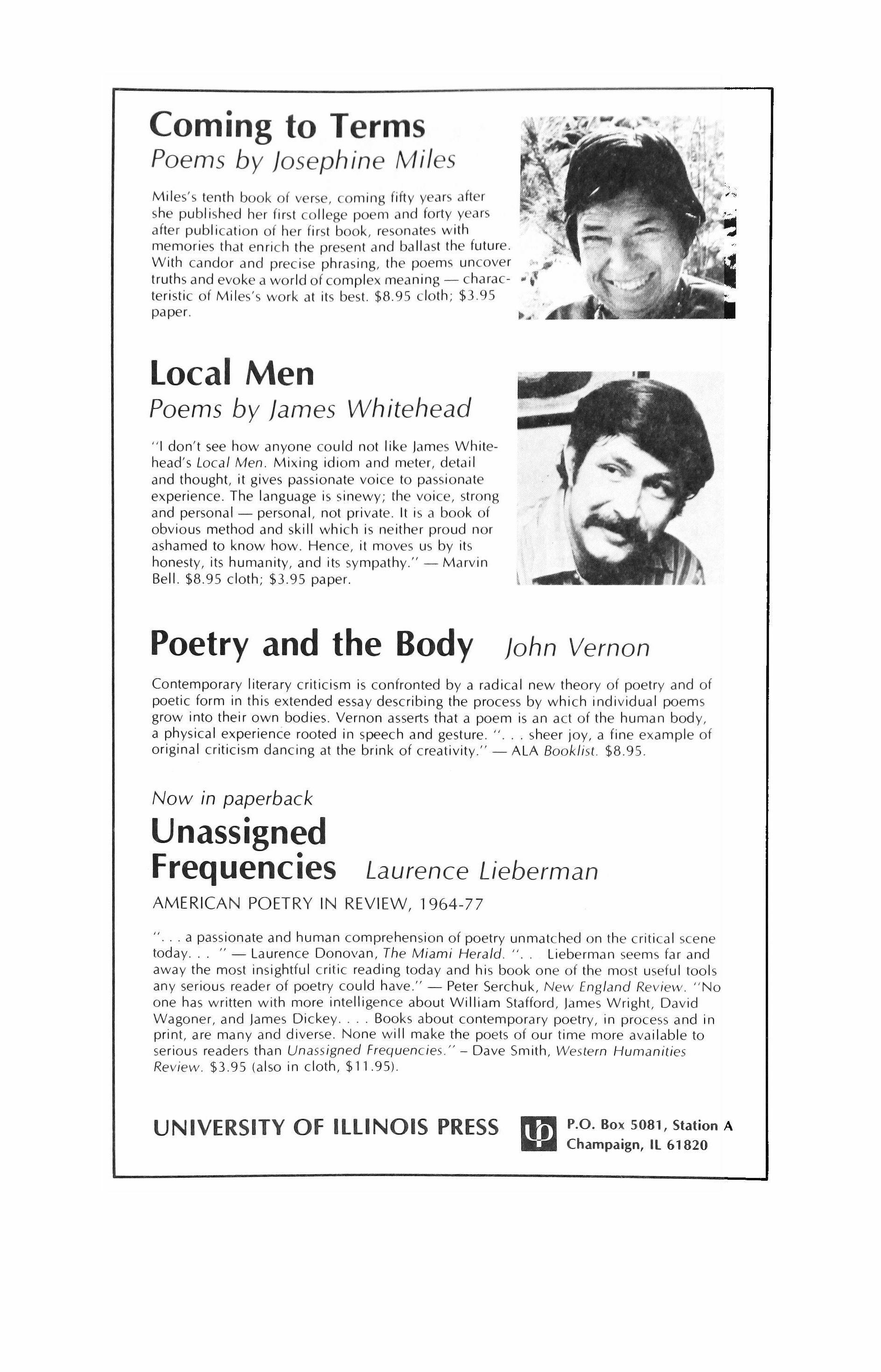 "I don't see how anyone could not like James Whitehead's Local Men. Mixing idiom and meter, detail and thought, it gives passionate voice to passionate experience. The language is sinewy; the VOice, strong and personal - personal, not private. It is a book of obvious method and skill which IS neither proud nor ashamed to know how. Hence, it moves us by its honesty, its humanity, and its sympathy." - Marvin Bell. $8.95 cloth; $3.95 paper