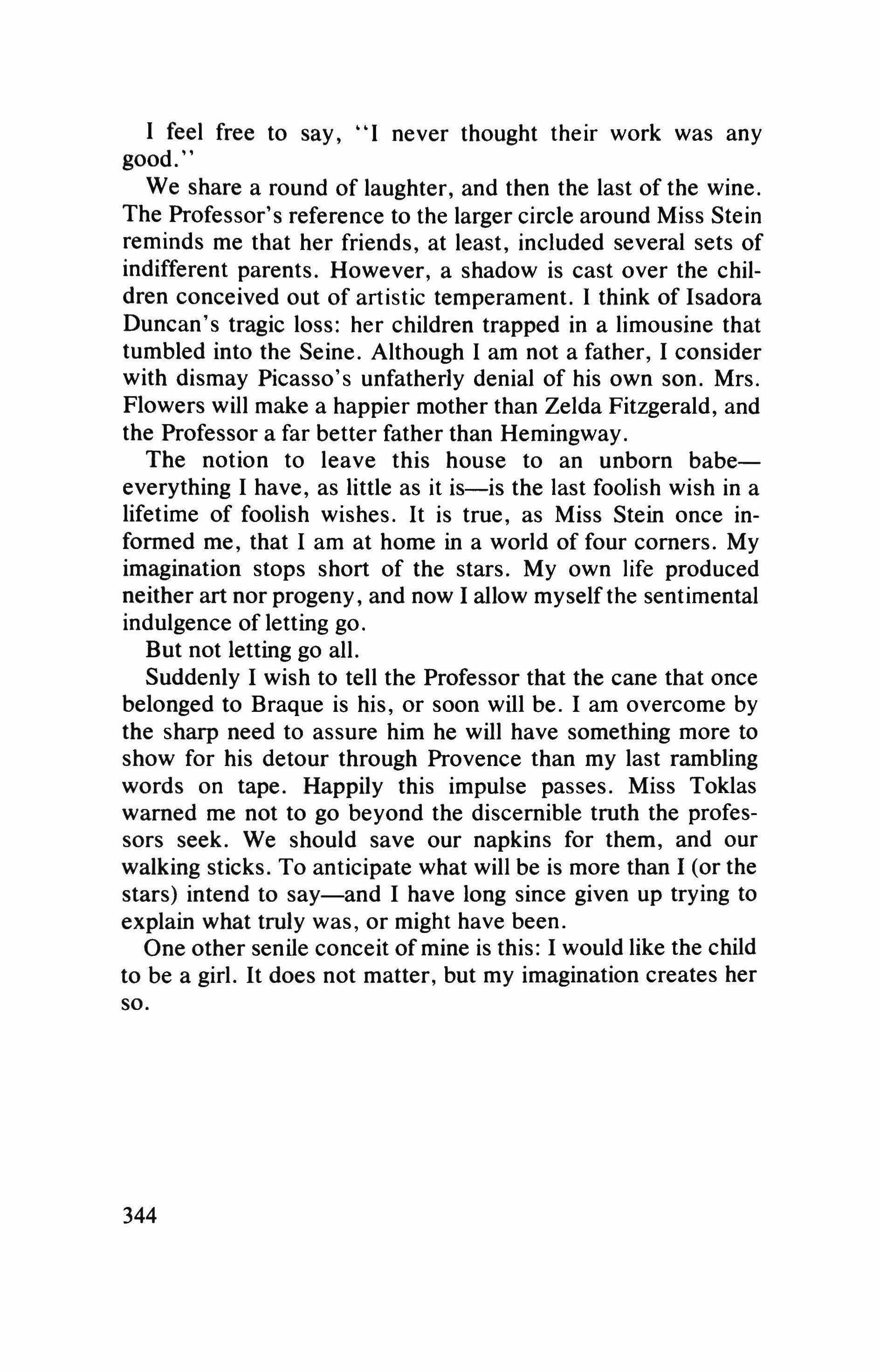 Suddenly I wish to tell the Professor that the cane that once belonged to Braque is his, or soon will be. I am overcome by the sharp need to assure him he will have something more to show for his detour through Provence than my last rambling words on tape. Happily this impulse passes. Miss Toklas warned me not to go beyond the discernible truth the professors seek. We should save our napkins for them, and our walking sticks. To anticipate what will be is more than I (or the stars) intend to say-and I have long since given up trying to explain what truly was, or might have been.