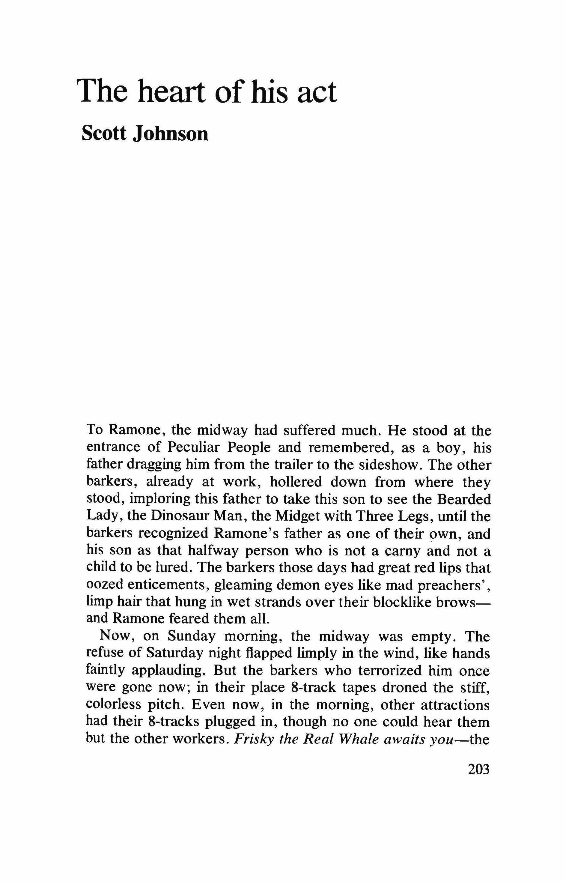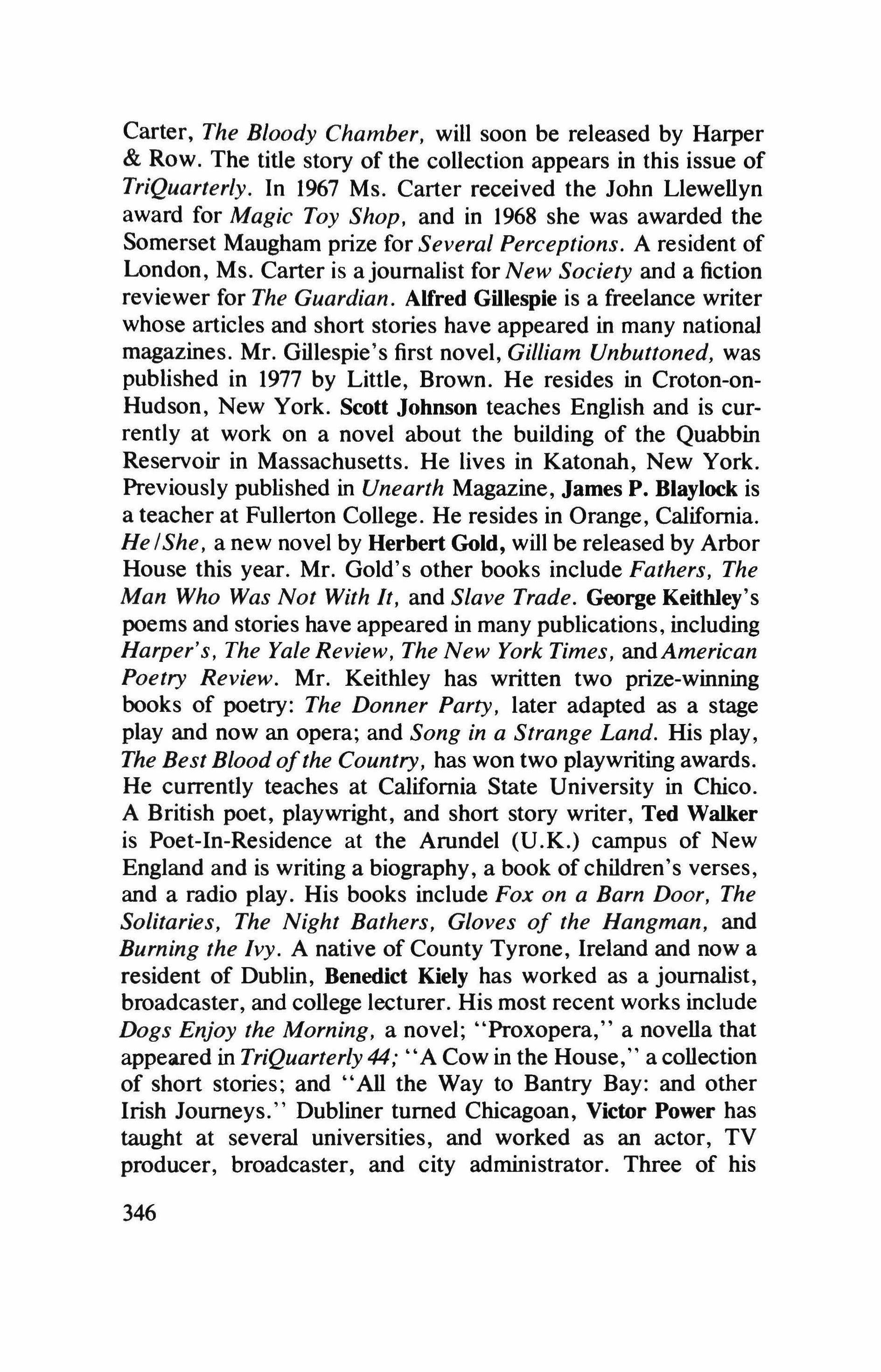 Carter, The Bloody Chamber, will soon be released by Harper & Row. The title story of the collection appears in this issue of TriQuarterly. In 1967 Ms. Carter received the John Llewellyn award for Magic Toy Shop, and in 1968 she was awarded the Somerset Maugham prize for Several Perceptions. A resident of London, Ms. Carter is a journalist for New Society and a fiction reviewer for The Guardian. Alfred Gillespie is a freelance writer whose articles and short stories have appeared in many national magazines. Mr. Gillespie's first novel, Gilliam Unbuttoned, was published in 1977 by Little, Brown. He resides in Croton-onHudson, New York. Scott Johnson teaches English and is currently at work on a novel about the building of the Quabbin Reservoir in Massachusetts. He lives in Katonah, New York. Previously published in Unearth Magazine, James P. Blaylock is a teacher at Fullerton College. He resides in Orange, California. He /She, a new novel by Herbert Gold, will be released by Arbor House this year. Mr. Gold's other books include Fathers, The Man Who Was Not With It, and Slave Trade. George Keithley's poems and stories have appeared in many publications, including Harper's, The Yale Review, The New York Times, andAmerican Poetry Review. Mr. Keithley has written two prize-winning books of poetry: The Donner Party, later adapted as a stage play and now an opera; and Song in a Strange Land. His play, The Best Blood ofthe Country, has won two playwriting awards. He currently teaches at California State University in Chico. A British poet, playwright, and short story writer, Ted Walker is Poet-In-Residence at the Arundel (U.K.) campus of New England and is writing a biography, a book of children's verses, and a radio play. His books include Fox on a Barn Door, The Solitaries, The Night Bathers, Gloves of the Hangman, and Burning the Ivy. A native of County Tyrone, Ireland and now a resident of Dublin, Benedict Kiely has worked as a journalist, broadcaster, and college lecturer. His most recent works include Dogs Enjoy the Morning, a novel; "Proxopera," a novella that appeared in TriQuarterly 44; "A Cow in the House," a collection of short stories; and "All the Way to Bantry Bay: and other Irish Journeys." Dubliner turned Chicagoan, Victor Power has taught at several universities, and worked as an actor, TV producer, broadcaster, and city administrator. Three of his