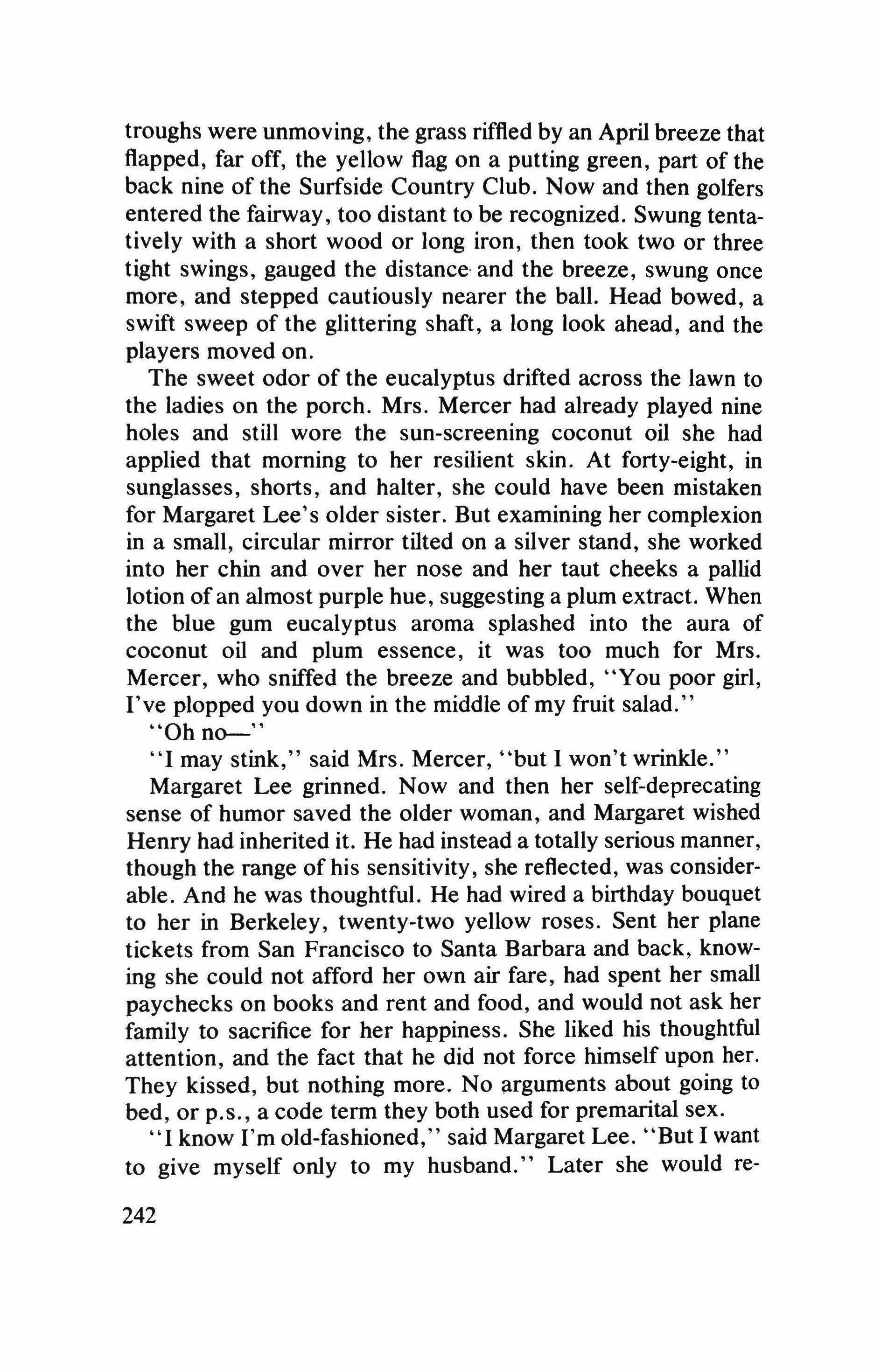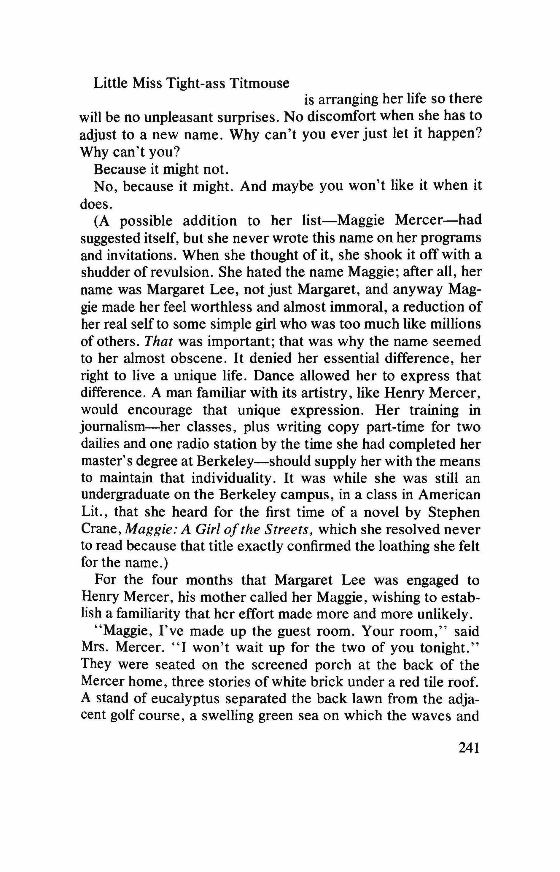 This evening we are to celebrate the Fourth of July together: three displaced Americans inhabiting different shells-or should I say four? The fetus has manifested life. I can hear Mrs. Flowers say, "Feel," then the familiar tune the bedsprings play, but not the comment of the father-to-be.