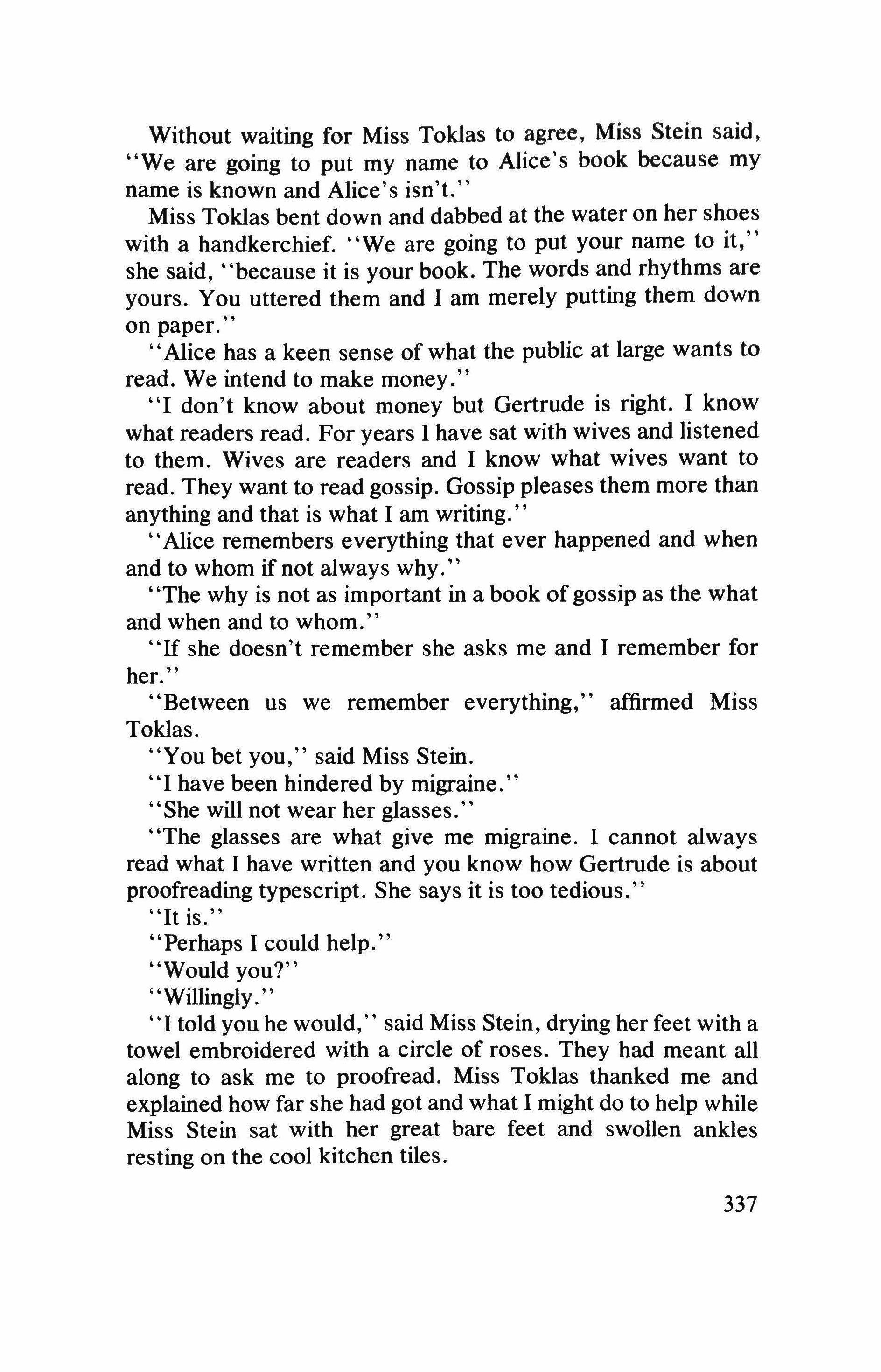 I told you he would," said Miss Stein, drying her feet with a towel embroidered with a circle of roses. They had meant all along to ask me to proofread. Miss Toklas thanked me and explained how far she had got and what I might do to help while Miss Stein sat with her great bare feet and swollen ankles resting on the cool kitchen tiles.