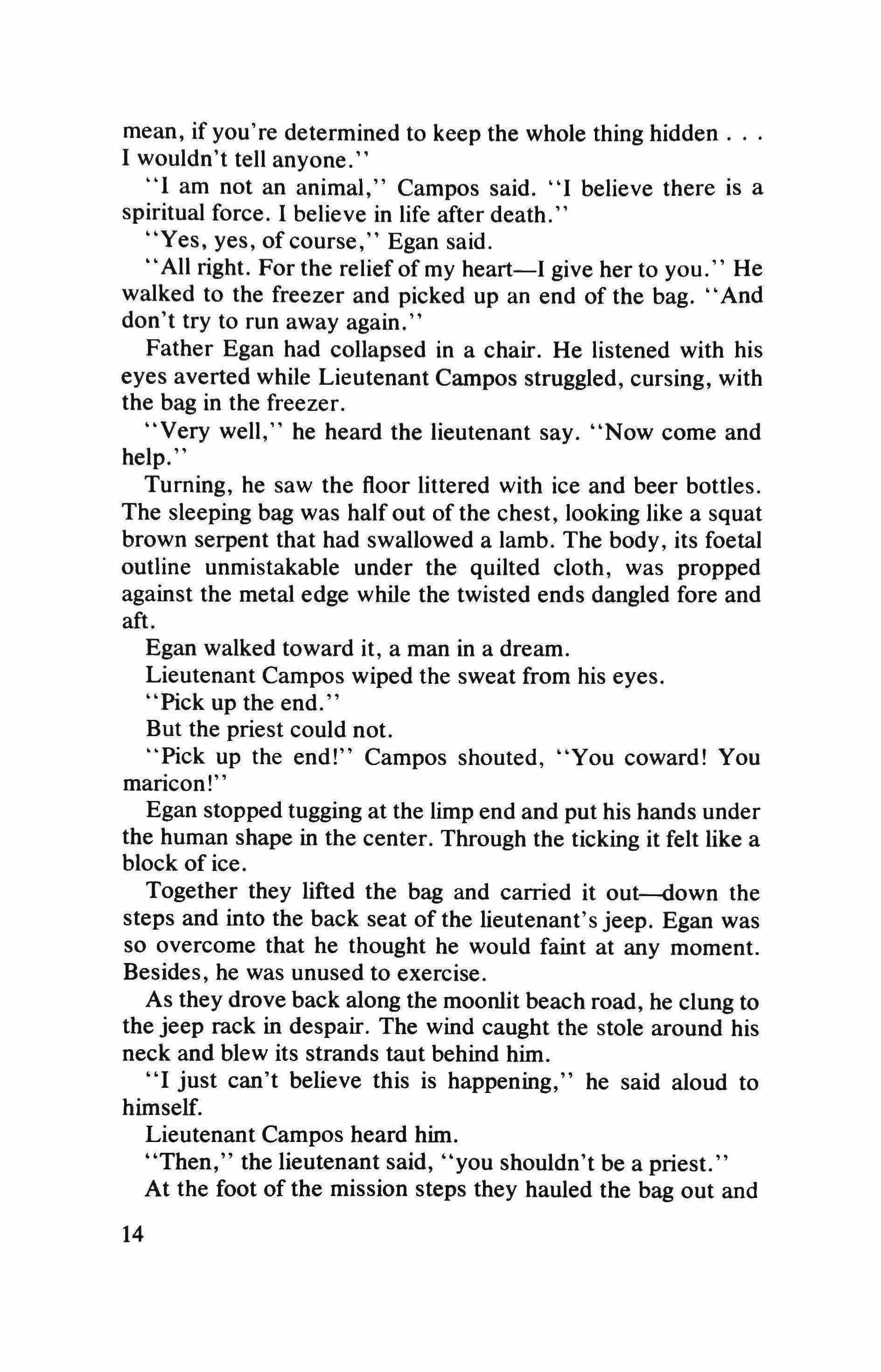 Lieutenant Campos was standing up, staring at Egan with a dreadful intensity. He walked to the freezer by the window and lifted its top door open. With a slight raising of his chin, he signaled Father Egan to draw near. The priest advanced slowly, his eyes fixed on Campos's face. The lieutenant looked down into the open freezer with an expression of stoic grief.